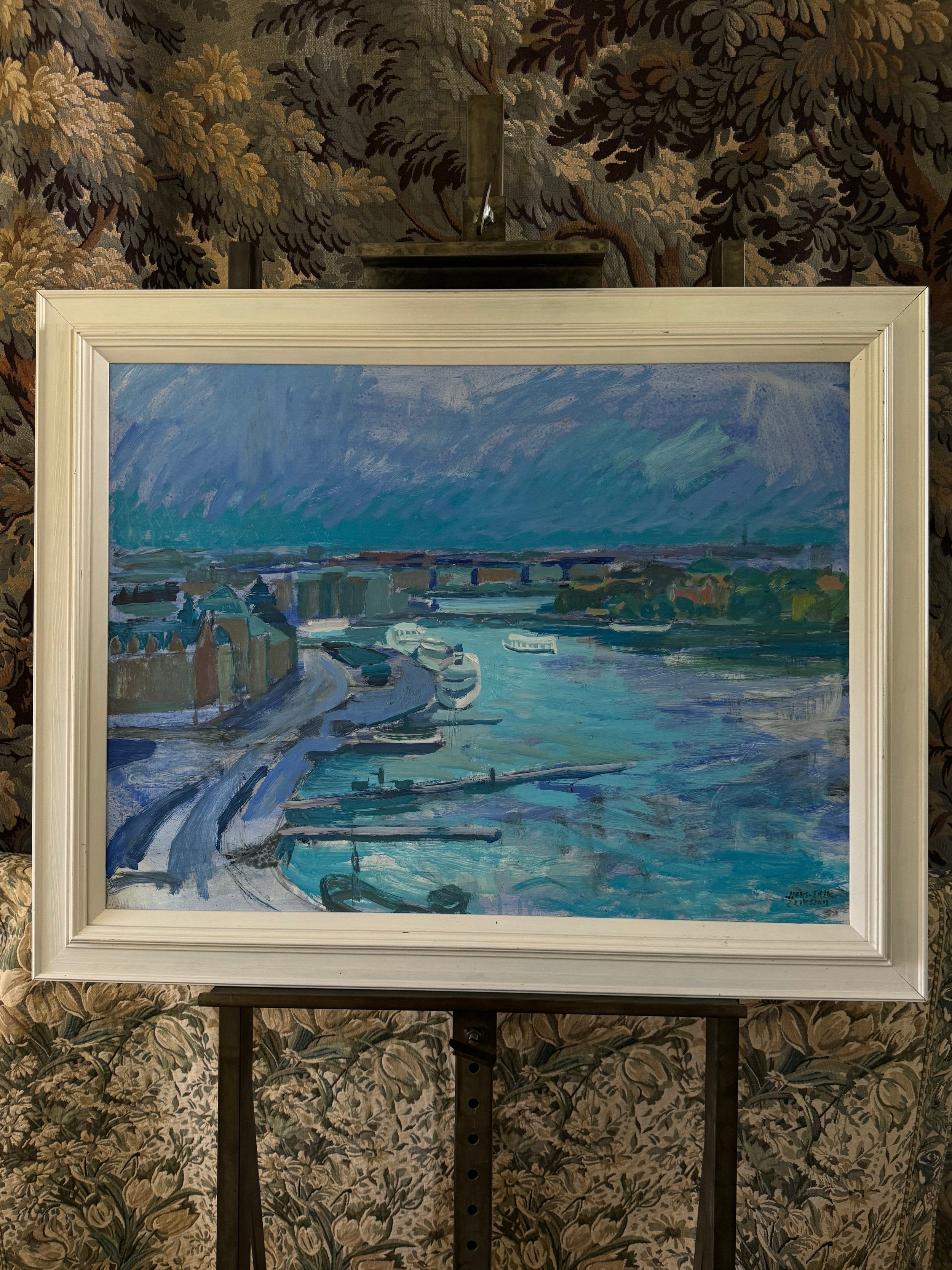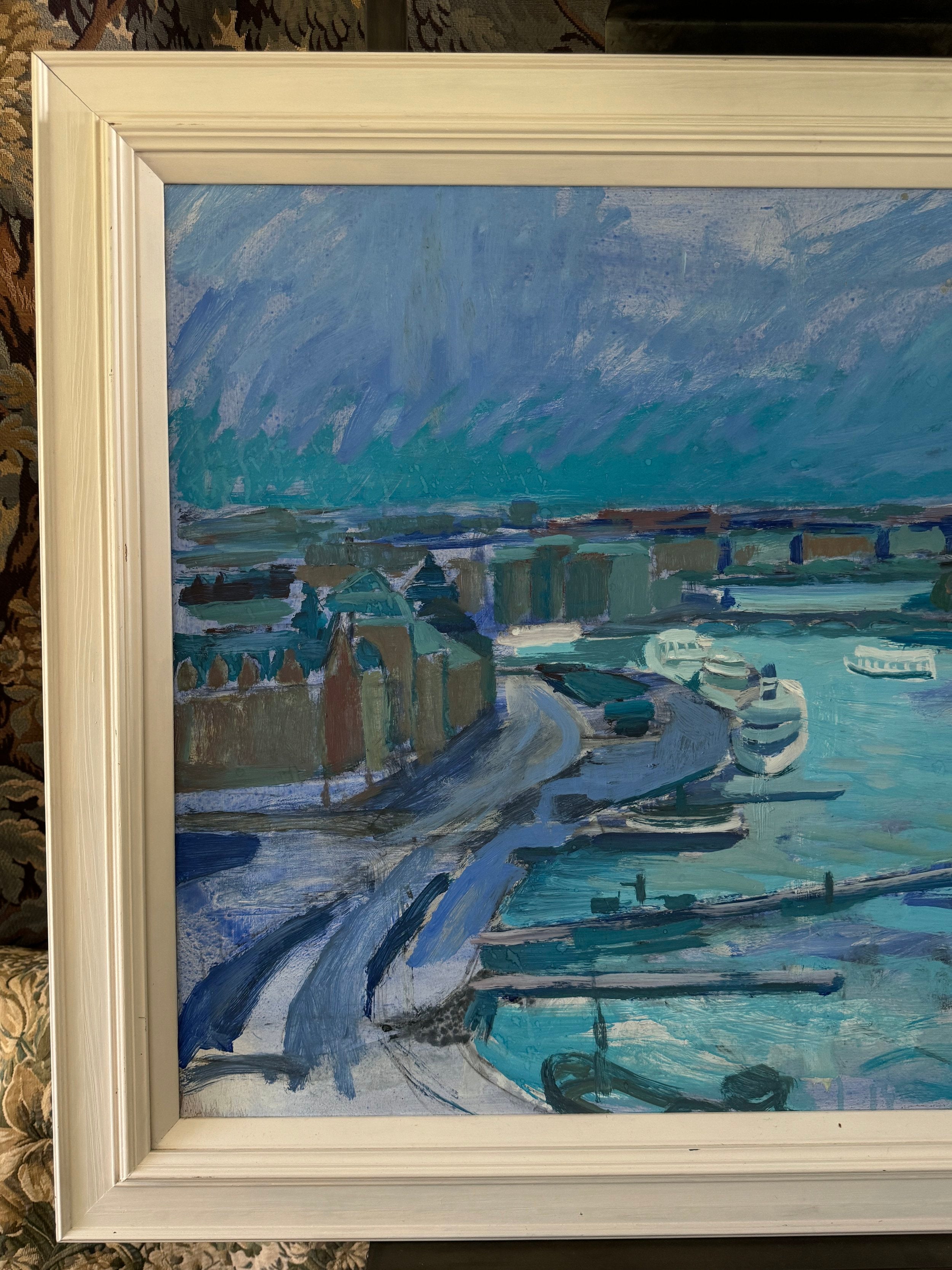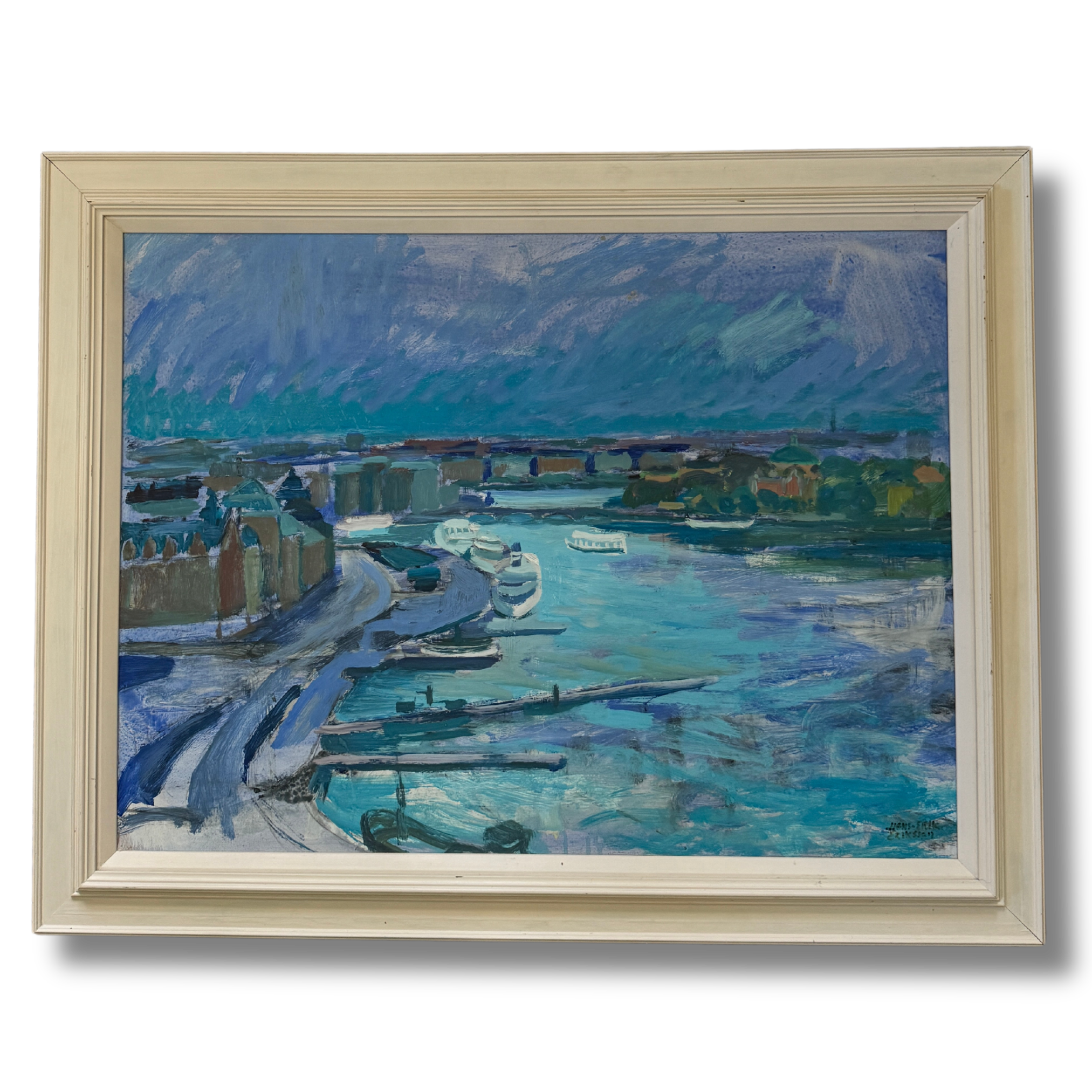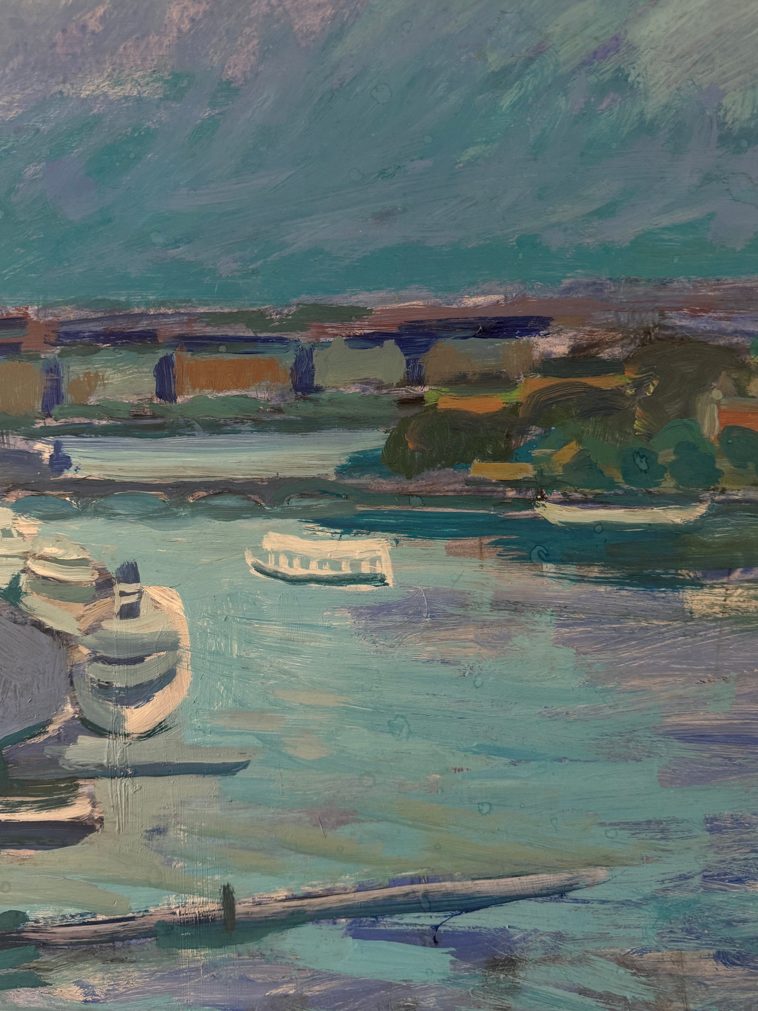 This Swedish oil on board painting captures a serene riverside cityscape with a rich, impressionistic approach. The artist employs a vibrant palette dominated by cool blues and greens, evoking a fresh, tranquil atmosphere. The composition draws the viewer's eye across a curved shoreline, dotted with boats and framed by historical architecture, set against a sky that hints at changing weather. The loose, expressive brushwork suggests movement in both the water and the sky, creating a dynamic yet peaceful scene that feels both timeless and immediate. The ceruleans, violets, blues and purples!