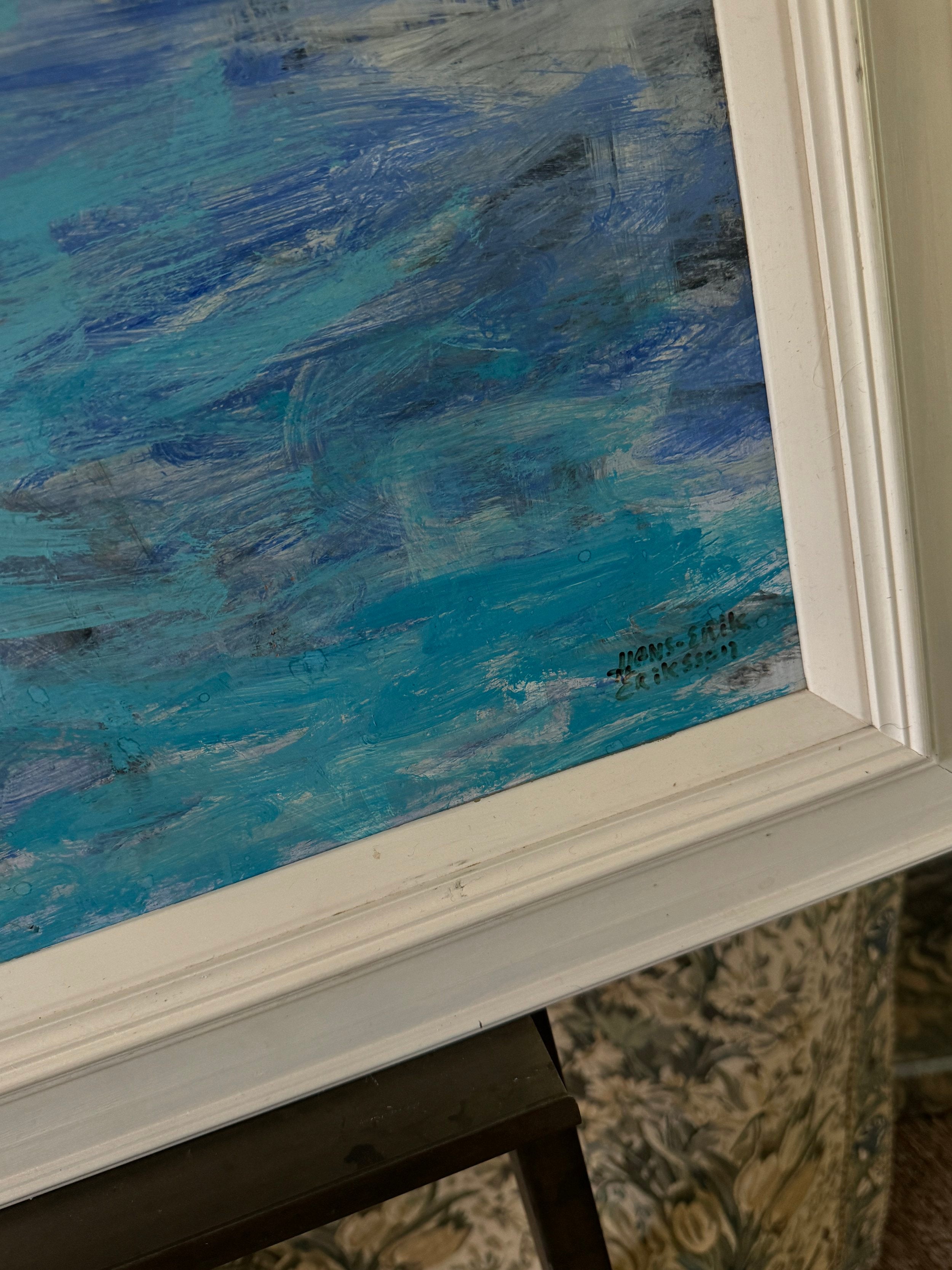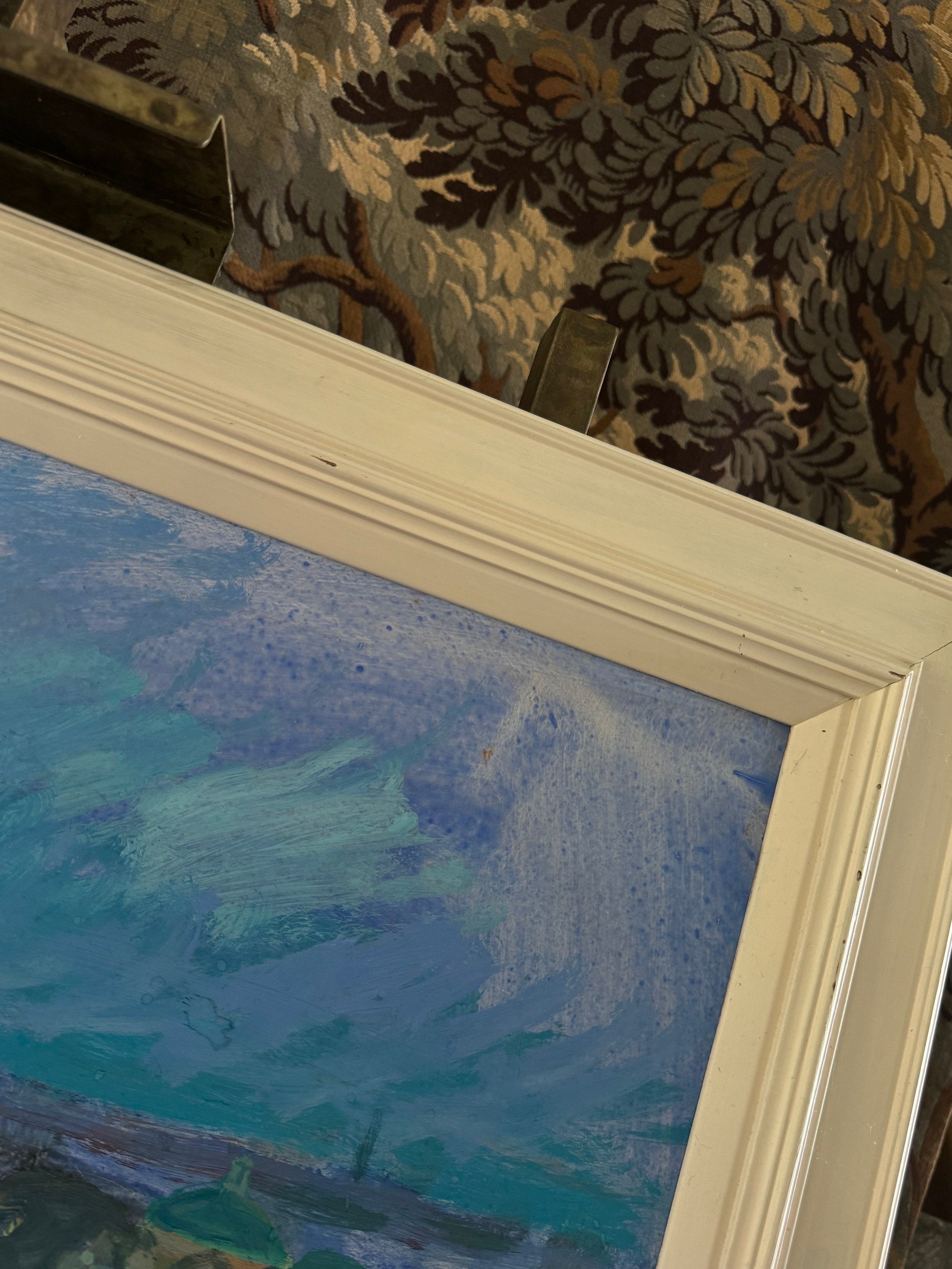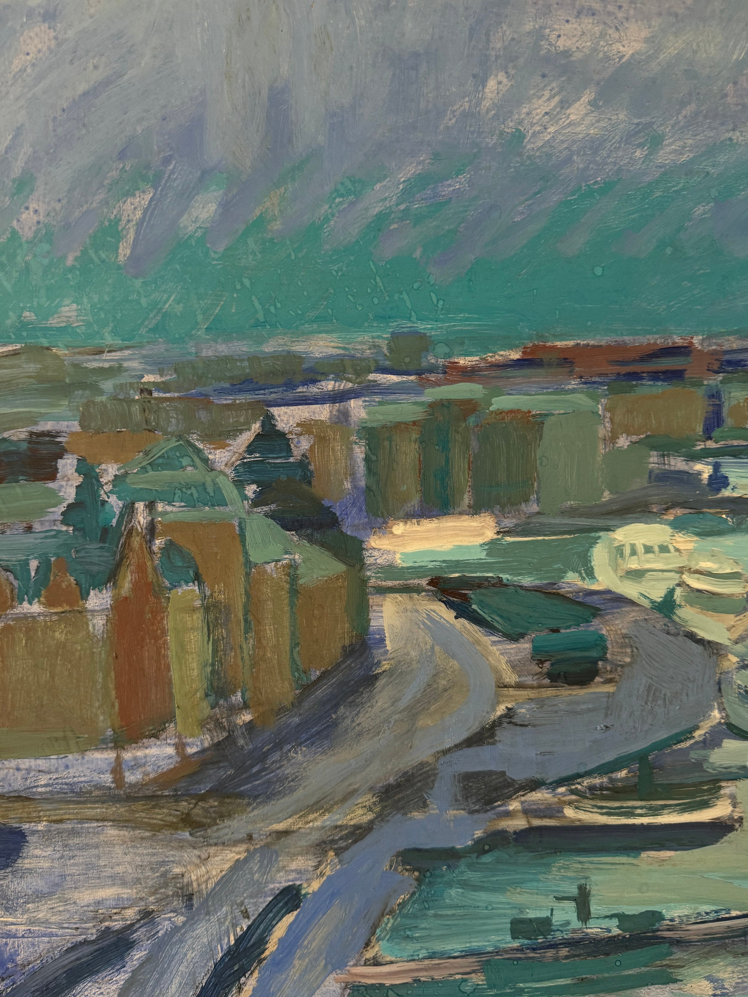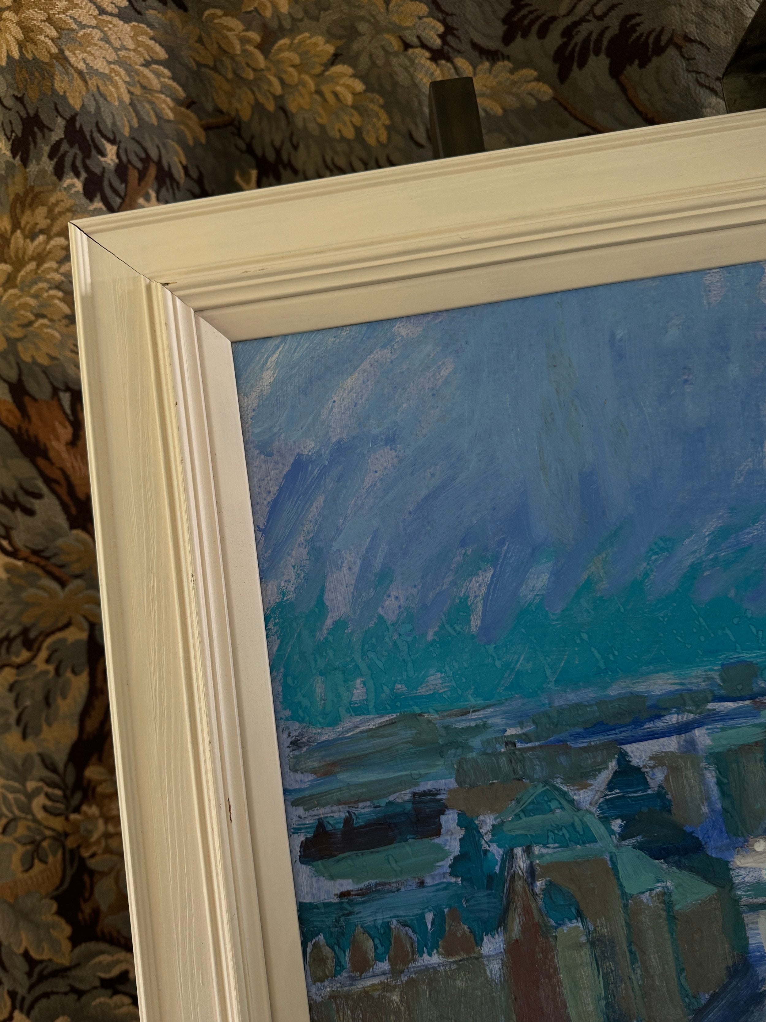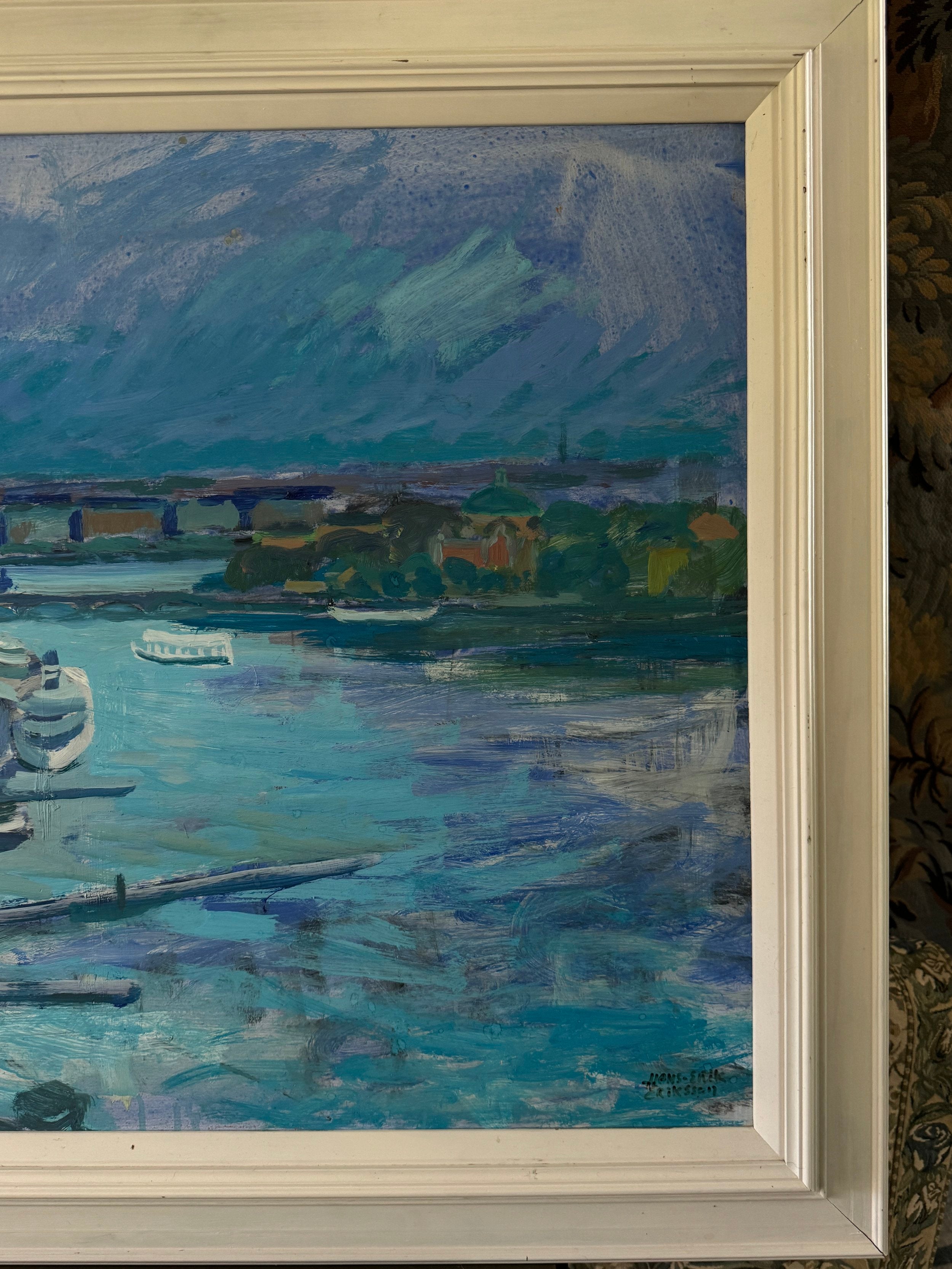 This Swedish oil on board painting captures a serene riverside cityscape with a rich, impressionistic approach. The artist employs a vibrant palette dominated by cool blues and greens, evoking a fresh, tranquil atmosphere. The composition draws the viewer's eye across a curved shoreline, dotted with boats and framed by historical architecture, set against a sky that hints at changing weather. The loose, expressive brushwork suggests movement in both the water and the sky, creating a dynamic yet peaceful scene that feels both timeless and immediate. The ceruleans, violets, blues and purples!