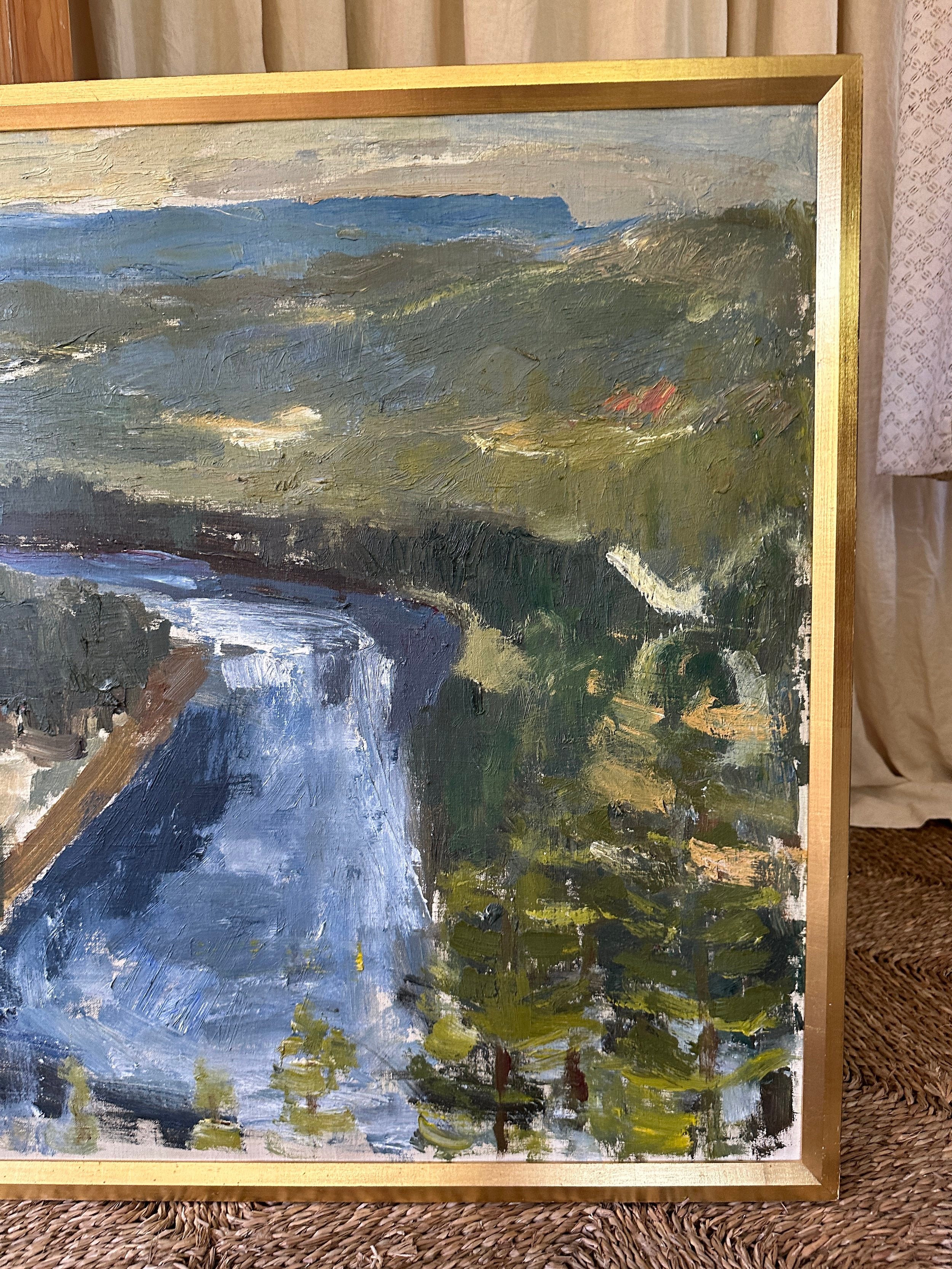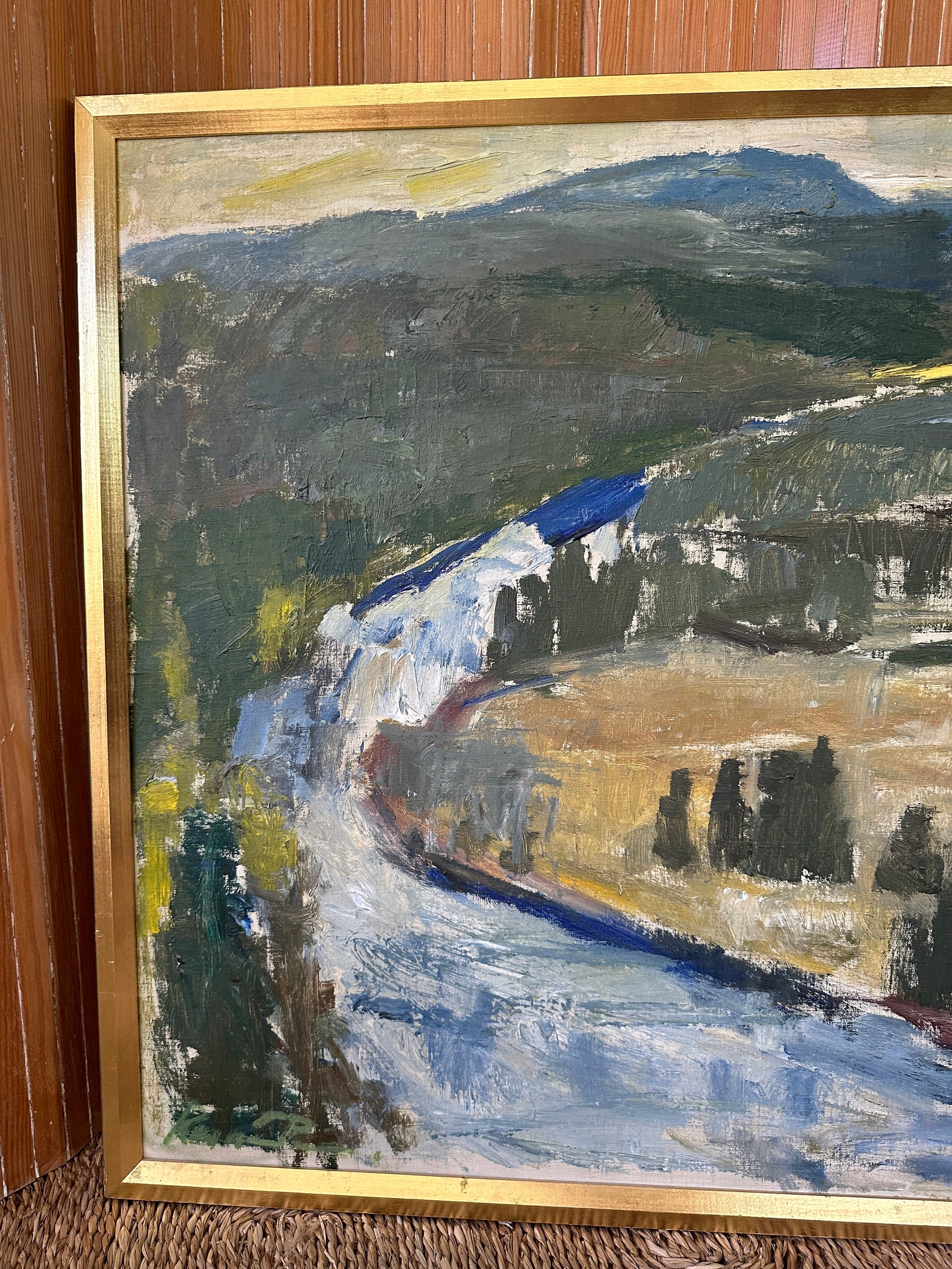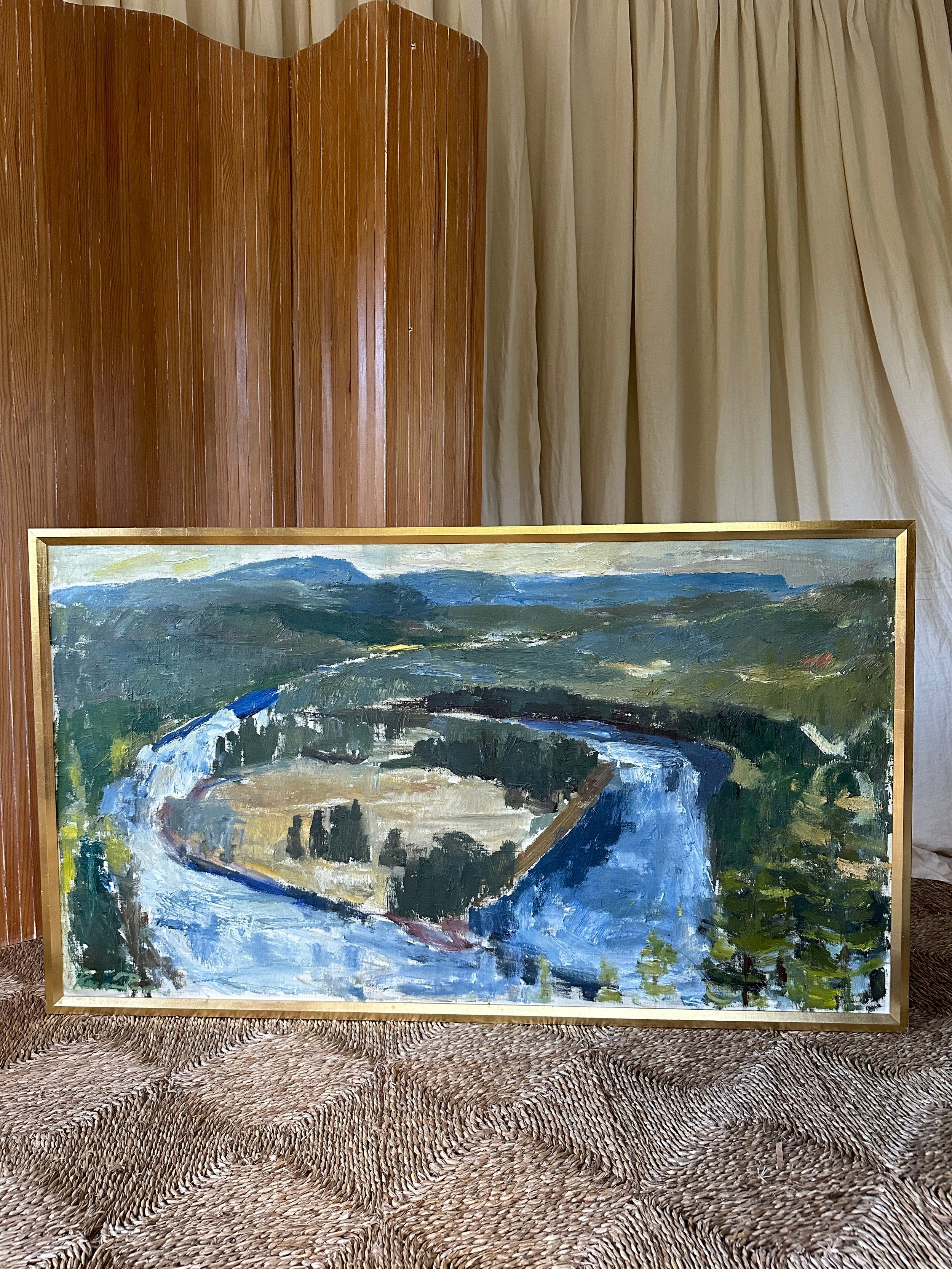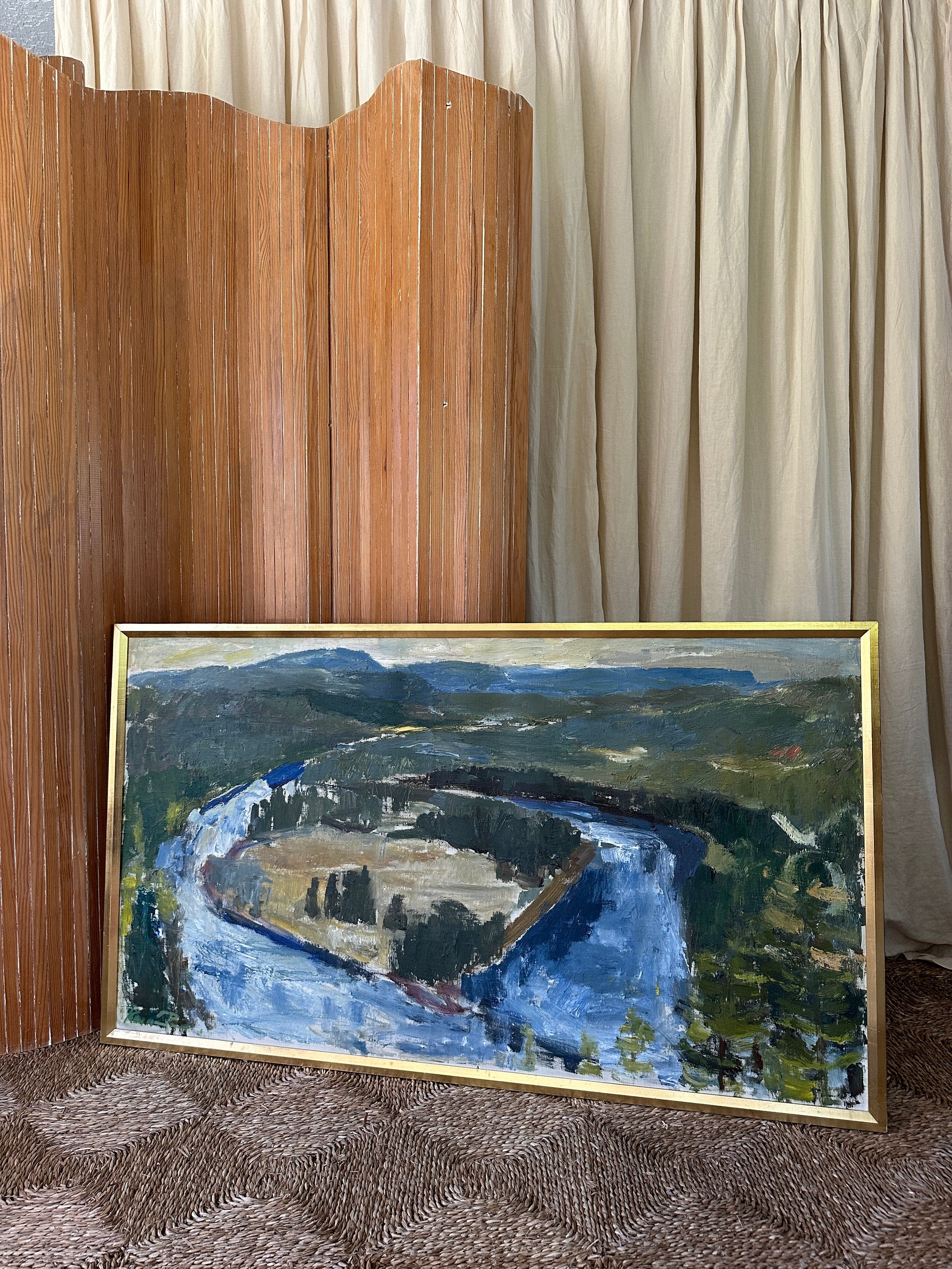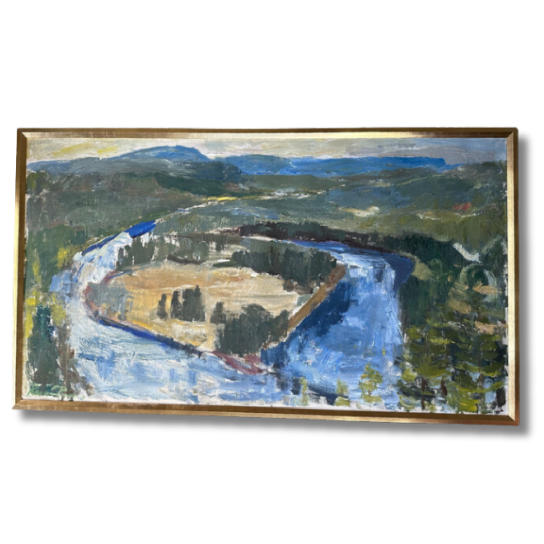 A sweeping large-scale oil on canvas landscape, capturing the dynamic curves of a river carving its way through rolling forested hills. The artist uses bold, expressive brushwork and a vibrant palette of blues, greens, and earthy ochres to convey both the vastness of nature and the immediacy of paint on canvas. There is a striking tension between the fluidity of the river and the solidity of the land, resulting in a composition that feels both grounded and alive with movement. A powerful statement piece from midcentury Sweden that celebrates the grandeur of the natural world.