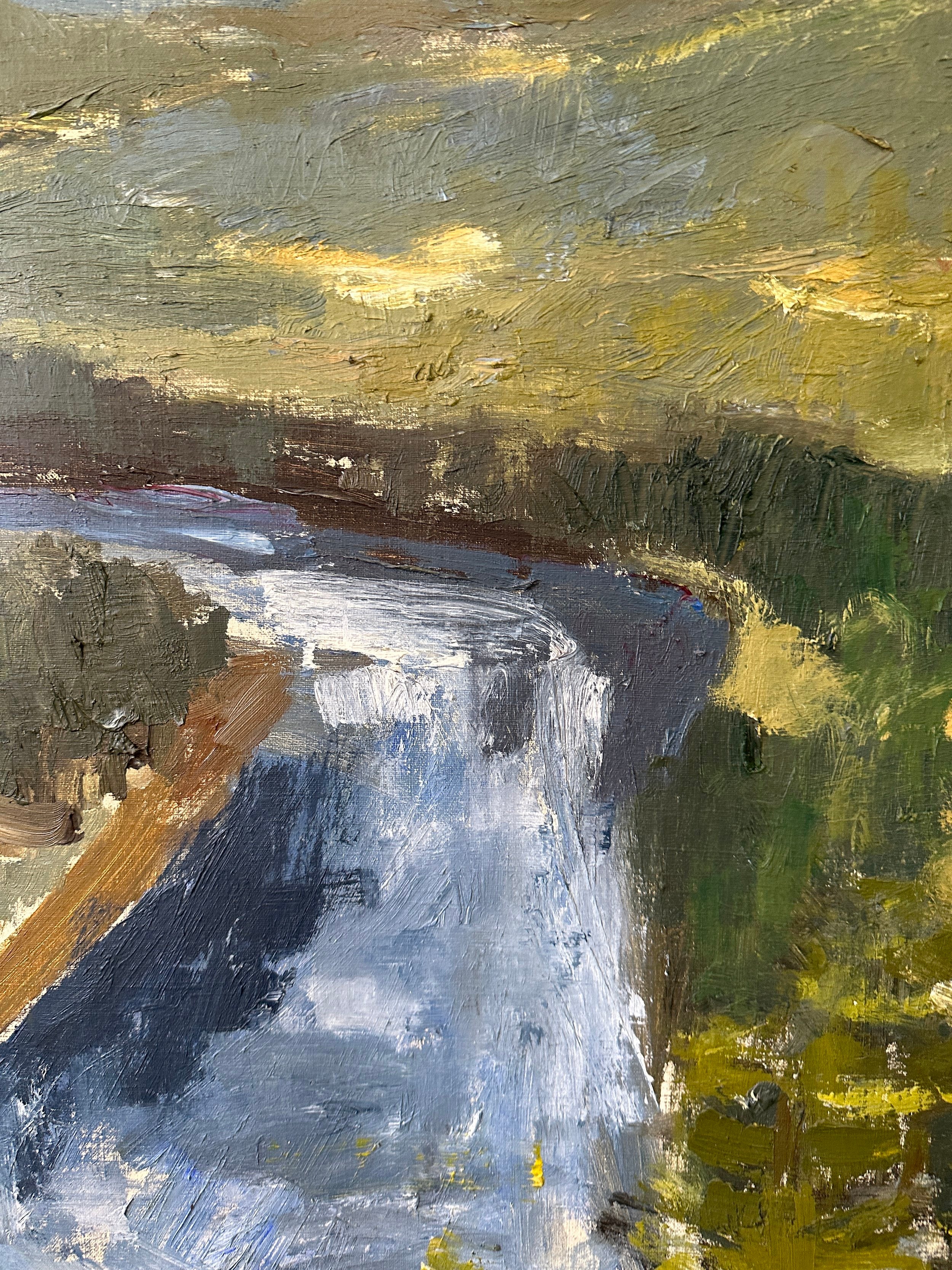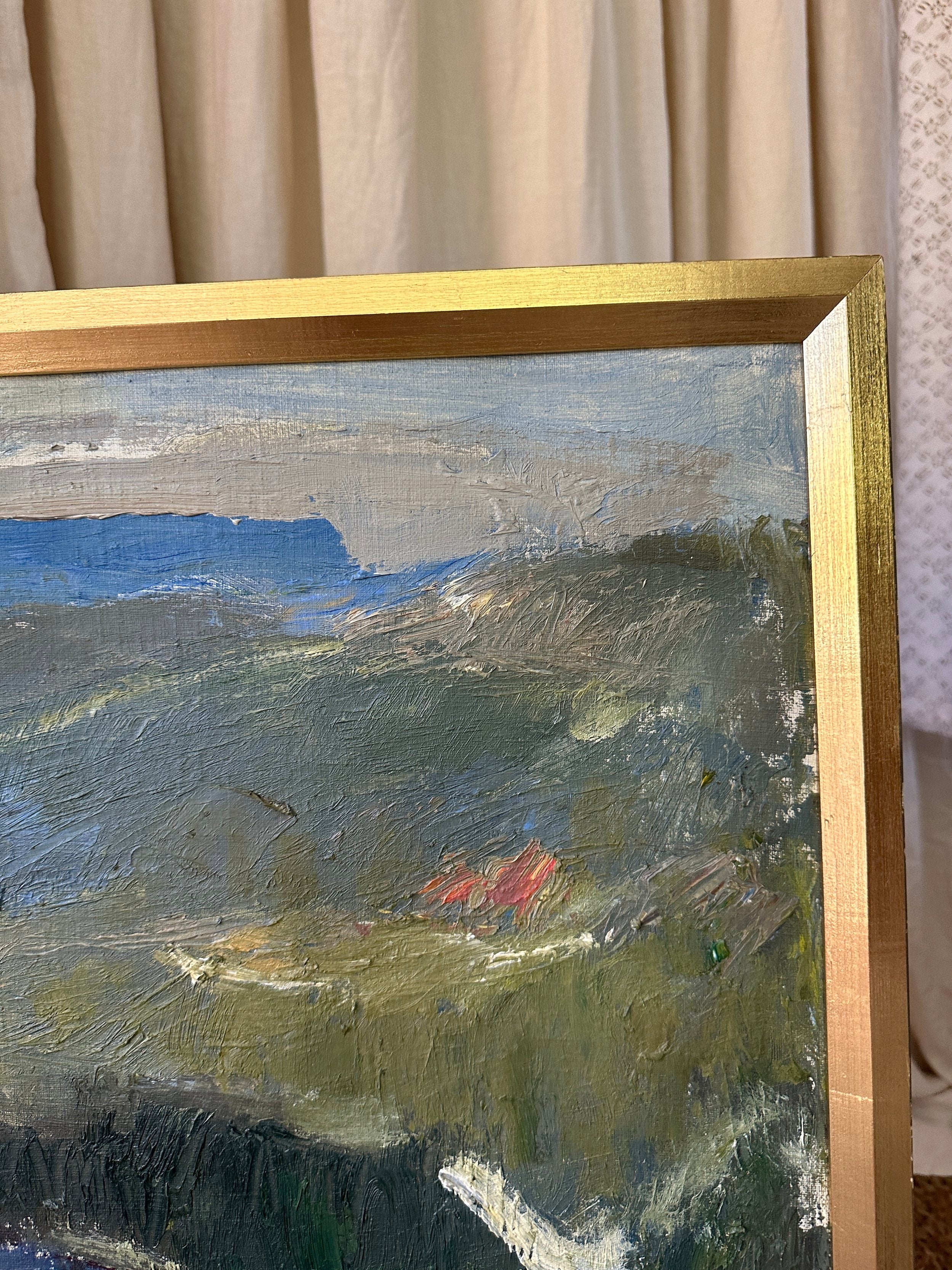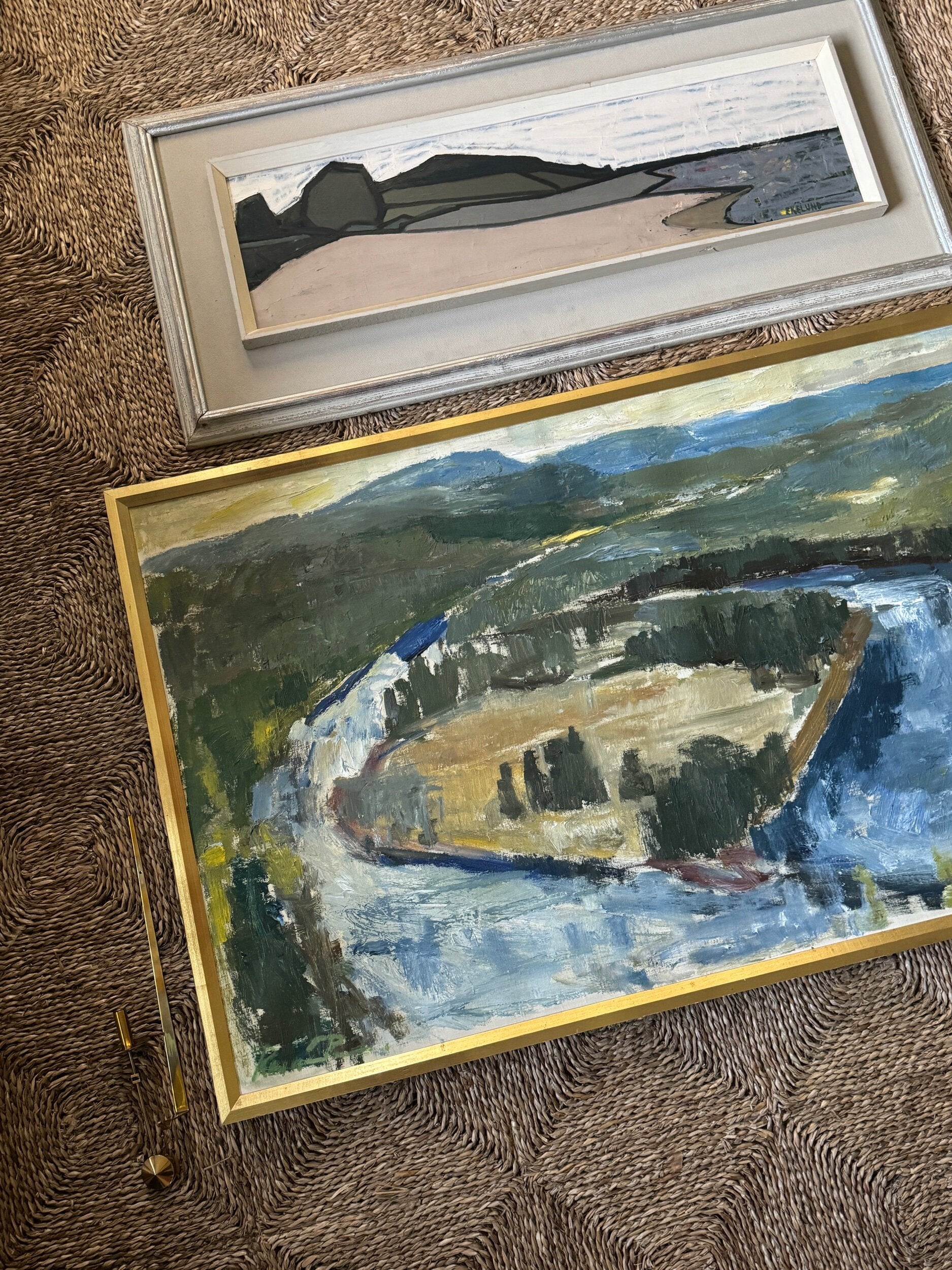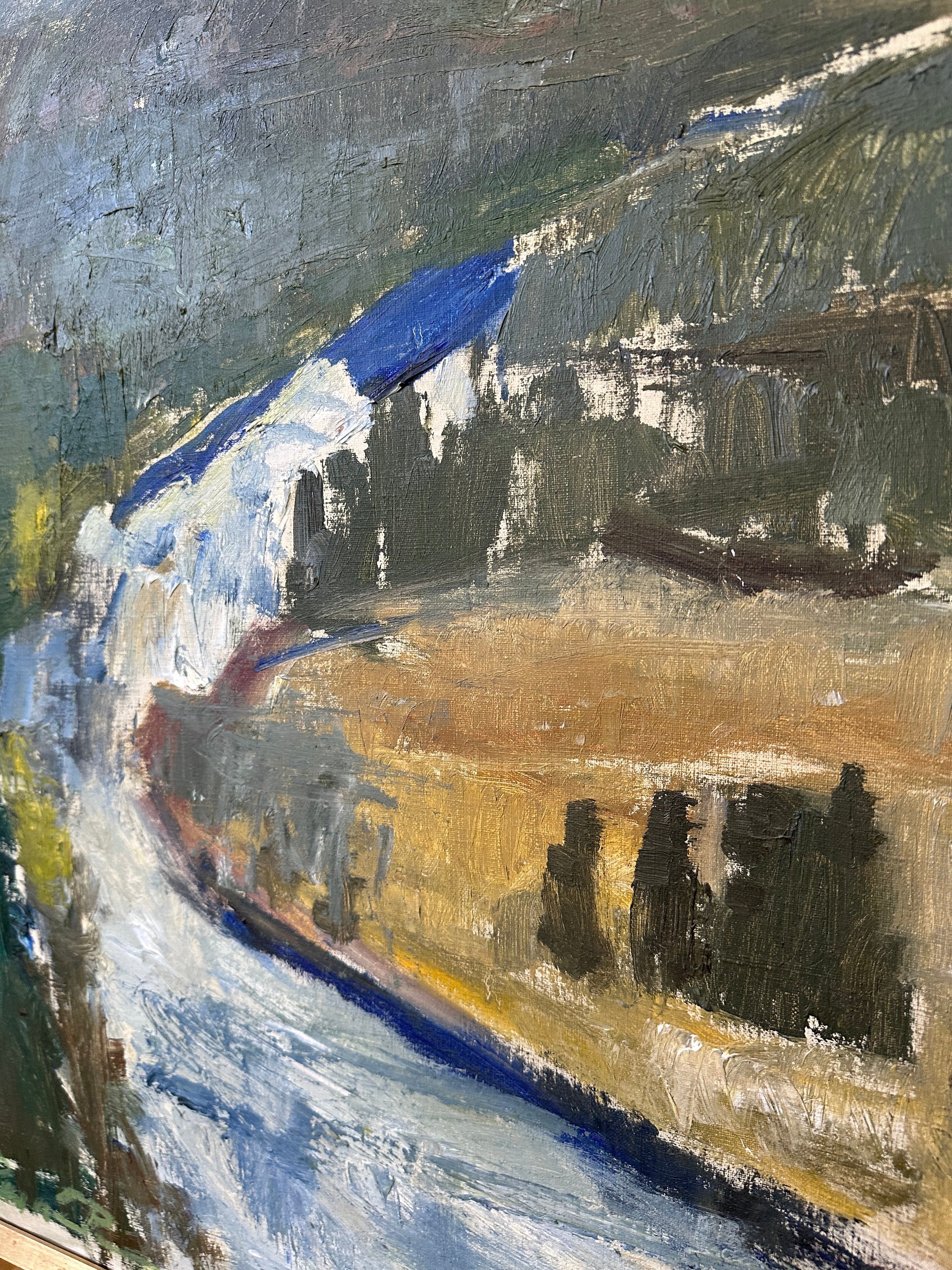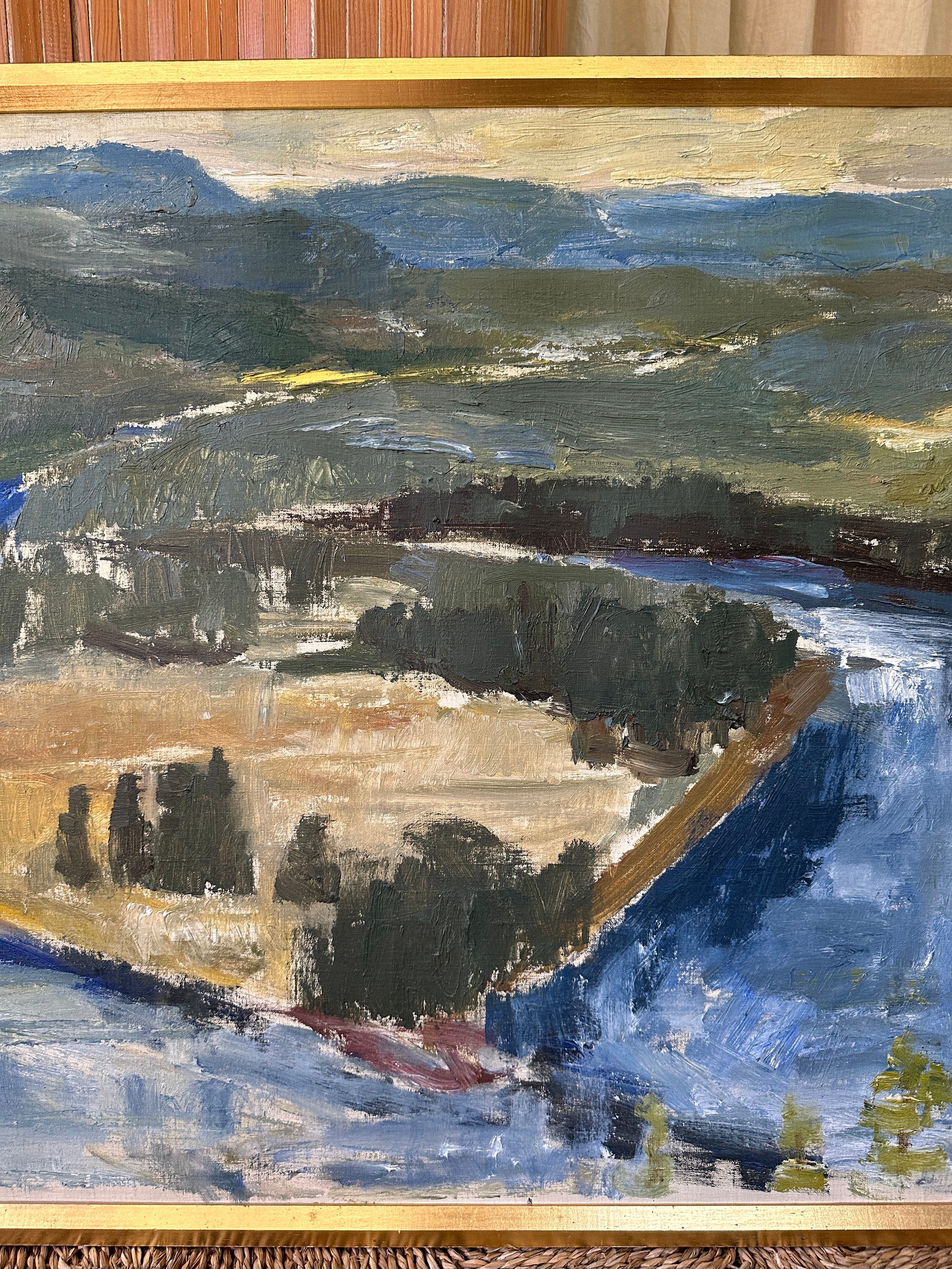 A sweeping large-scale oil on canvas landscape, capturing the dynamic curves of a river carving its way through rolling forested hills. The artist uses bold, expressive brushwork and a vibrant palette of blues, greens, and earthy ochres to convey both the vastness of nature and the immediacy of paint on canvas. There is a striking tension between the fluidity of the river and the solidity of the land, resulting in a composition that feels both grounded and alive with movement. A powerful statement piece from midcentury Sweden that celebrates the grandeur of the natural world.