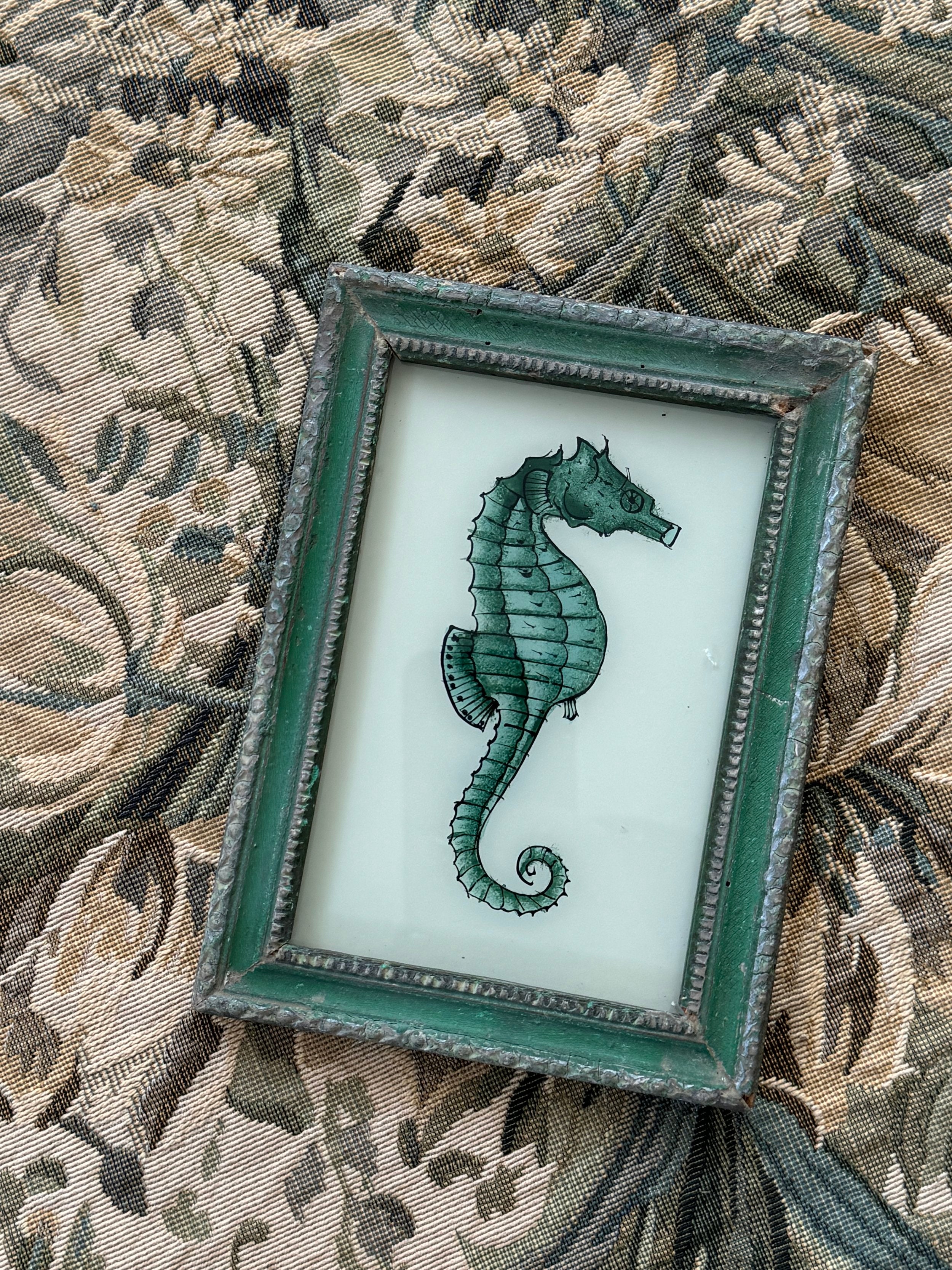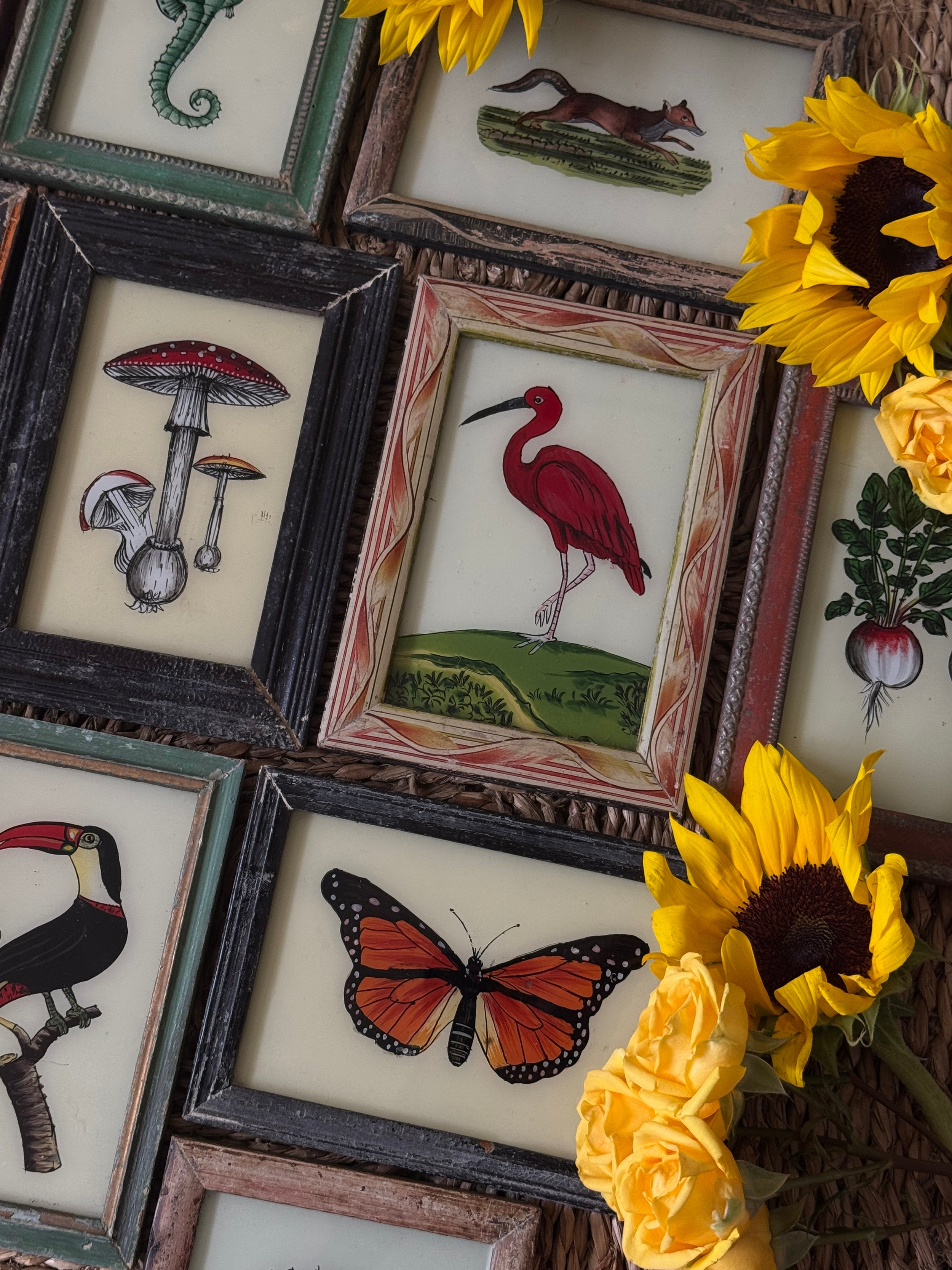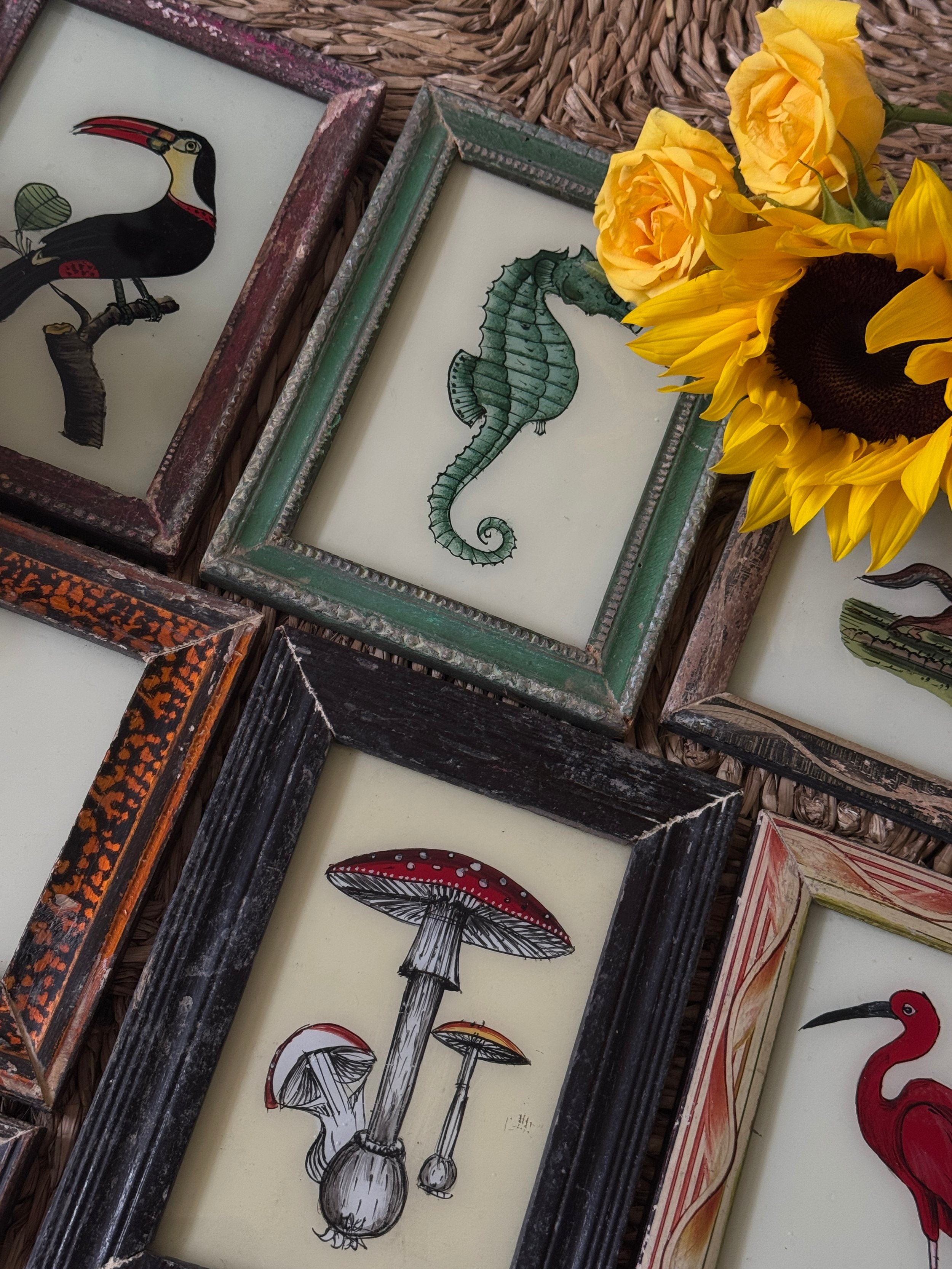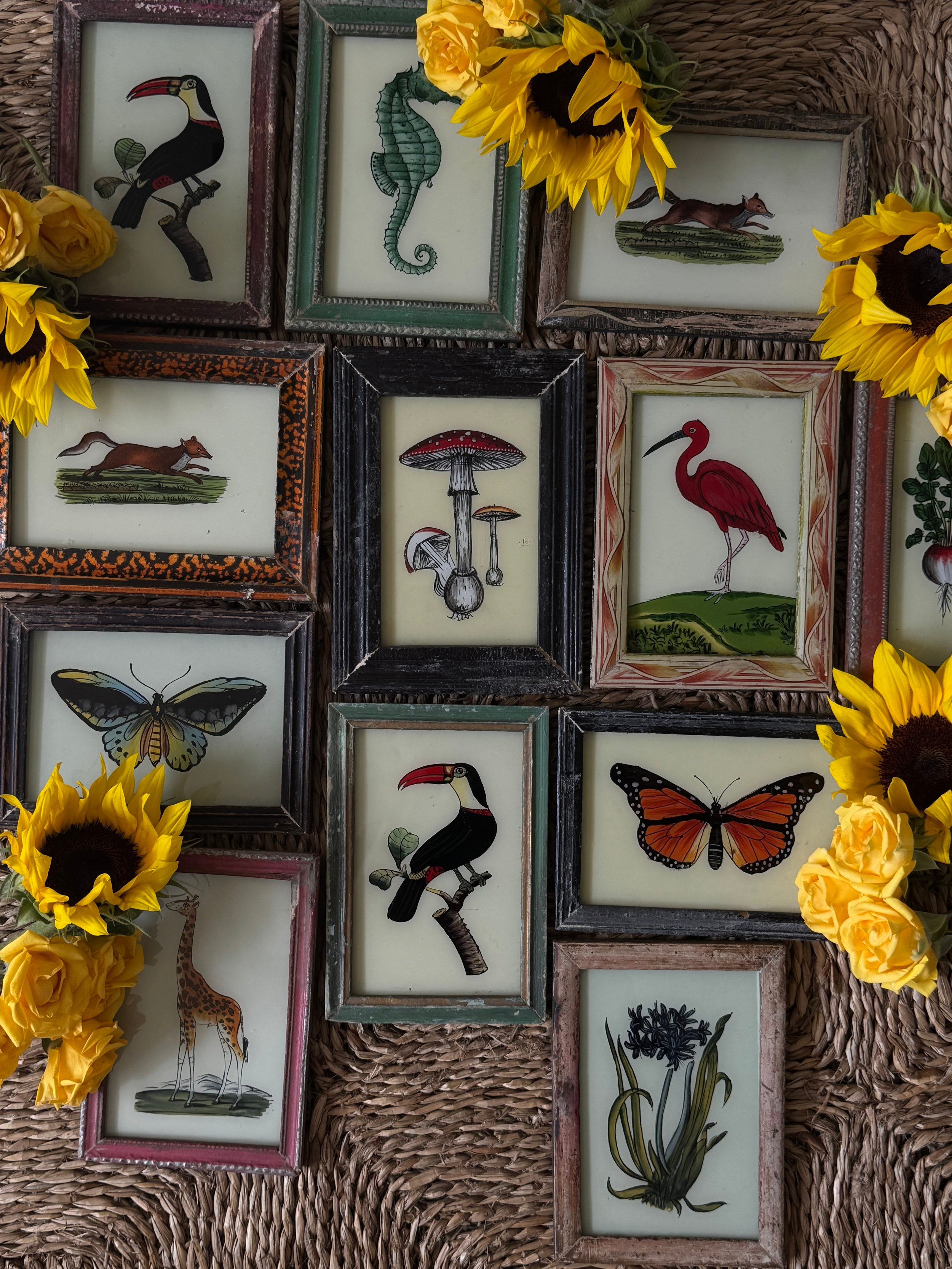 These beautiful and hardy pieces are some of our favourites for good reason. They are hand-painted on the reverse side directly onto the glass and placed into vintage frames in India. We love to pop them in places that don't normally allow art, like damp or dark areas of the house.