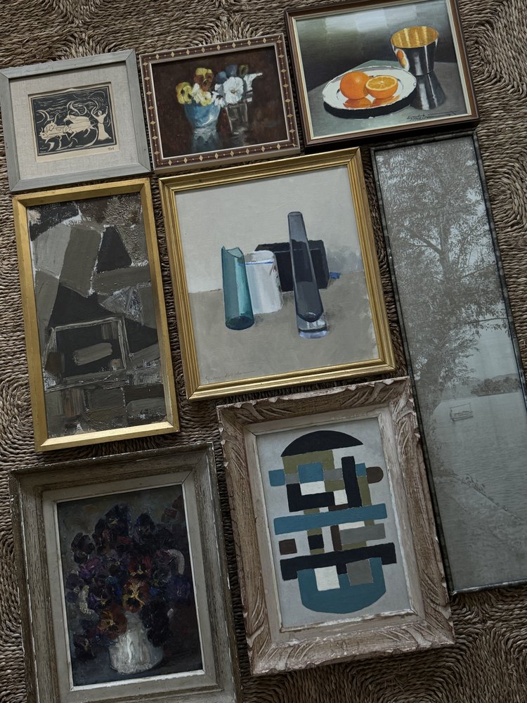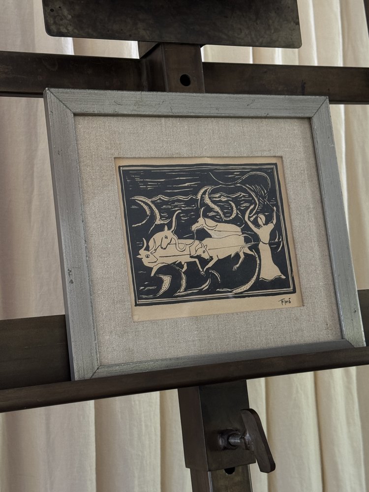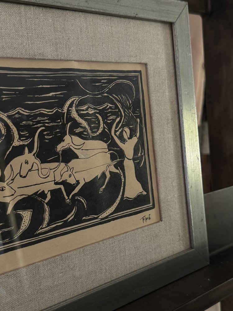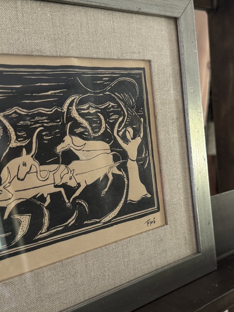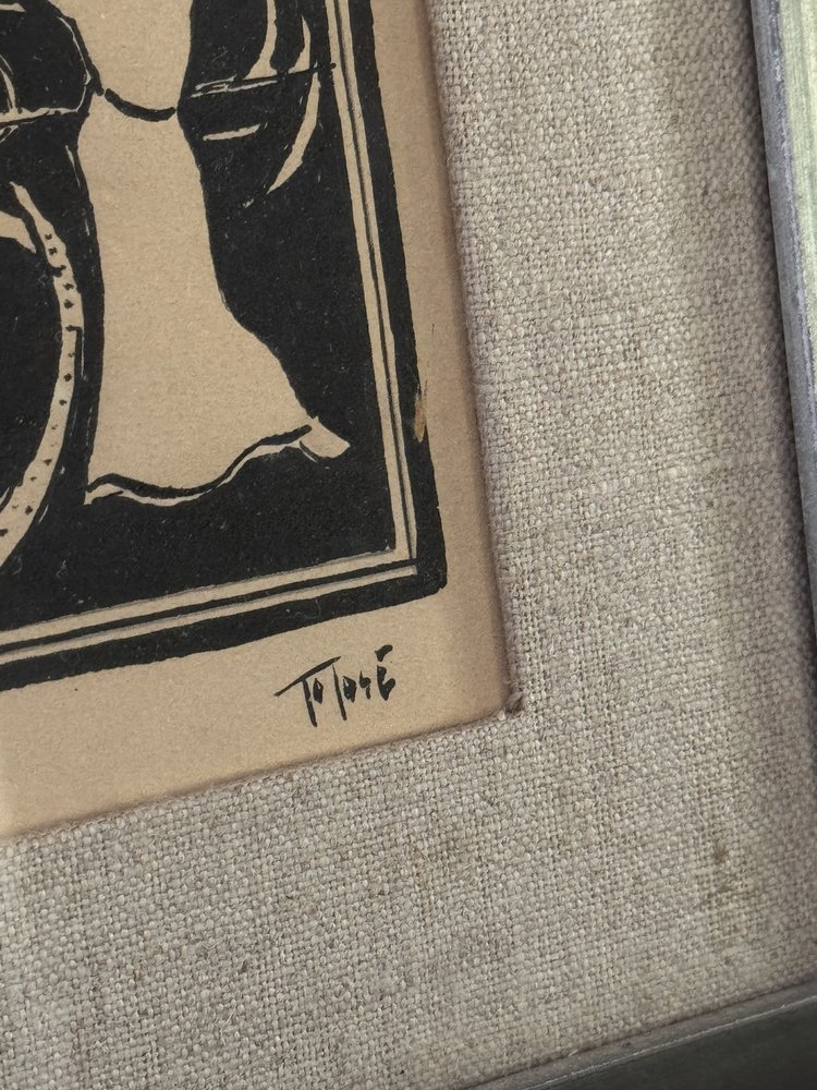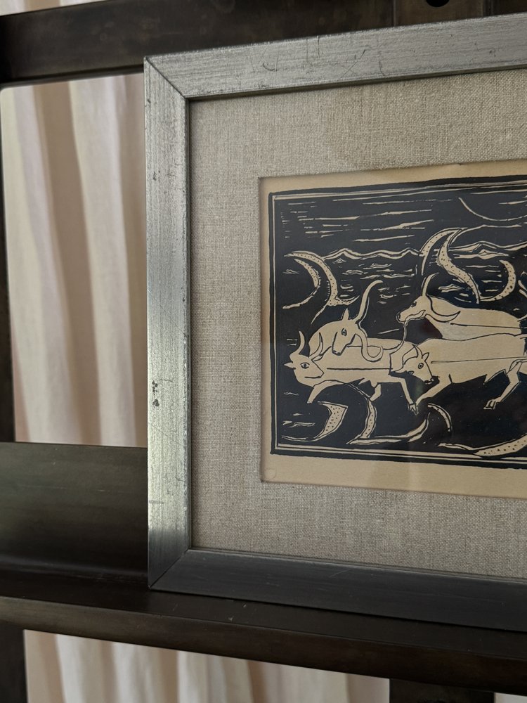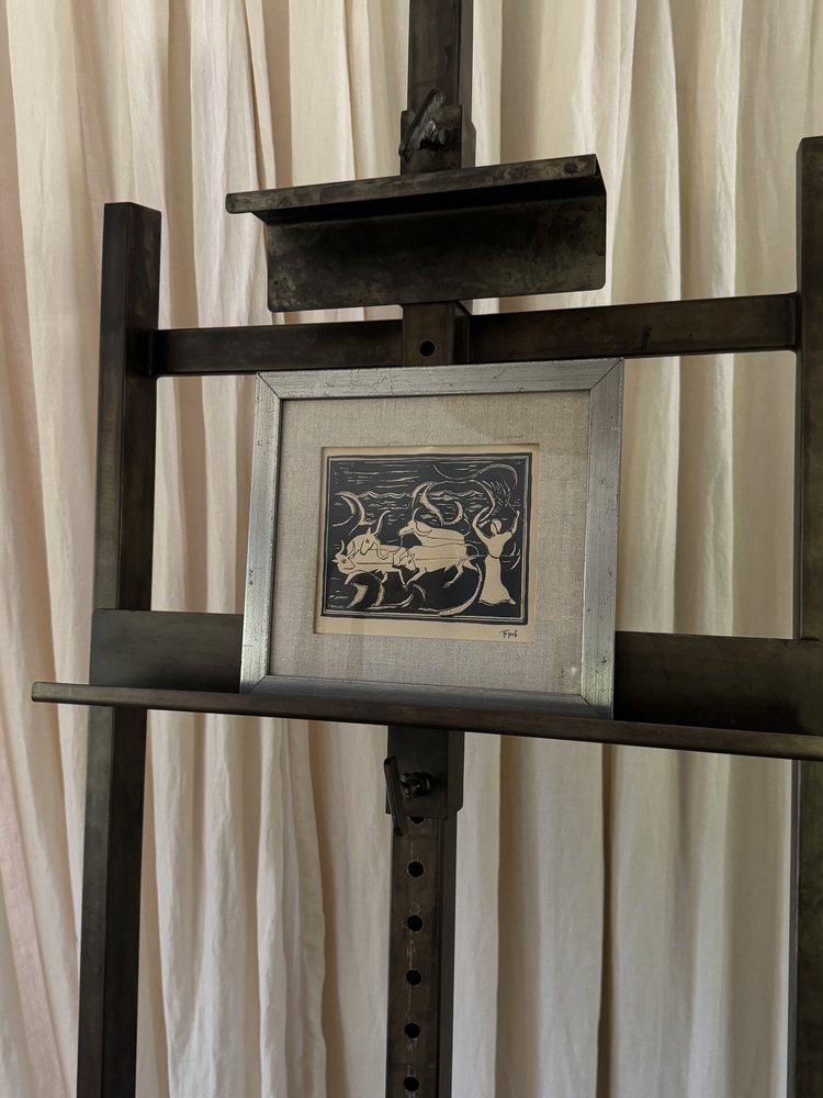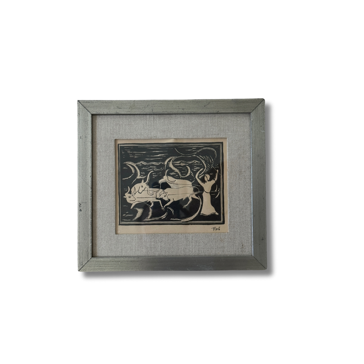 This midcentury Swedish ink drawing captures a surreal narrative with its intricate, monochromatic line work. The scene alludes to Greek mythology, with flowing forms and otherworldly figures creating a sense of movement and mystery. Framed in a distressed metal border and set against a linen mat, the artwork maintains a sophisticated yet understated presence. The combination of bold strokes and subtle detailing speaks to the artist’s mastery of form and symbolism, making this piece an ideal choice for collectors who appreciate minimalist aesthetics with a deeper, evocative storytelling layer.