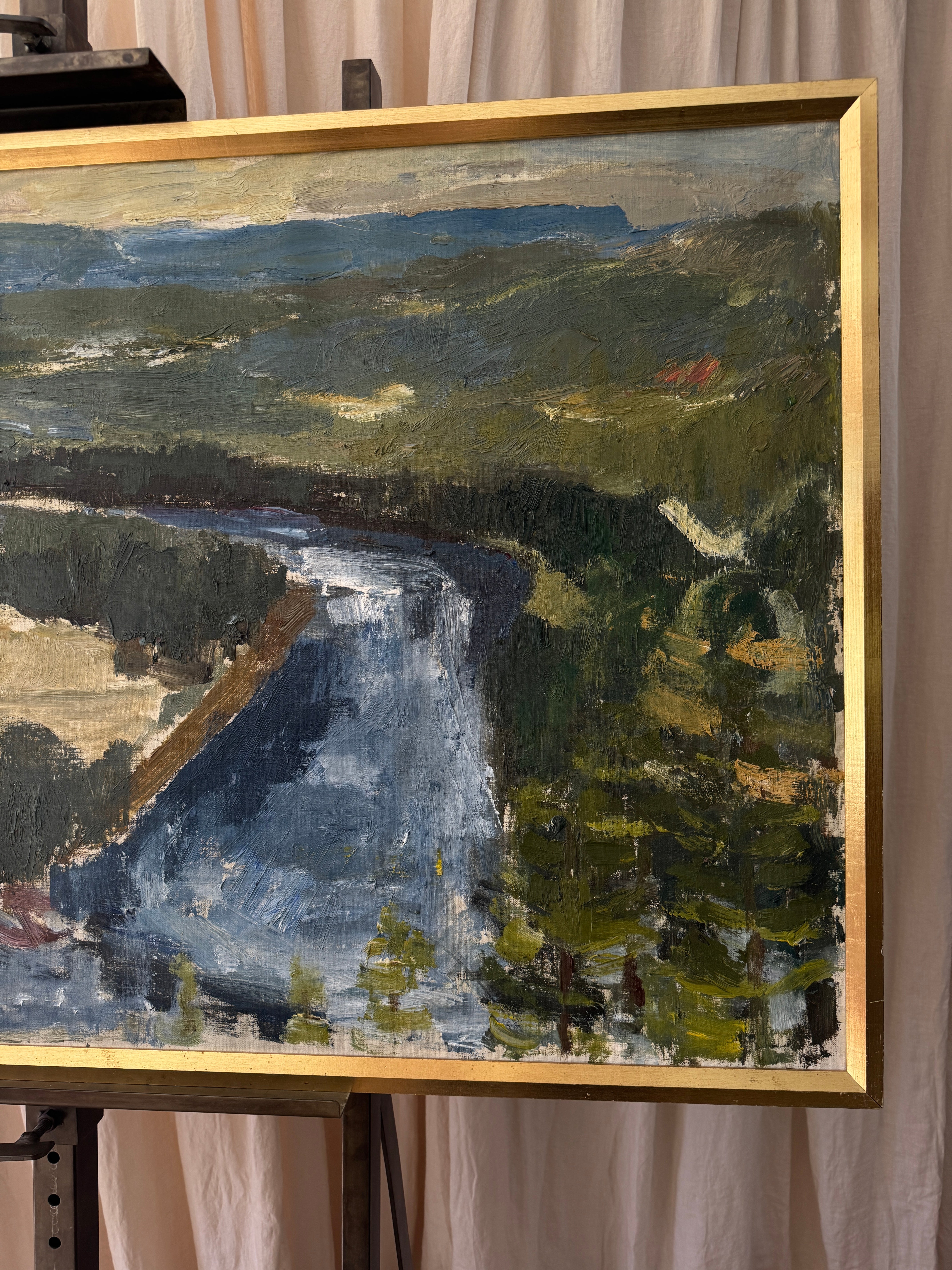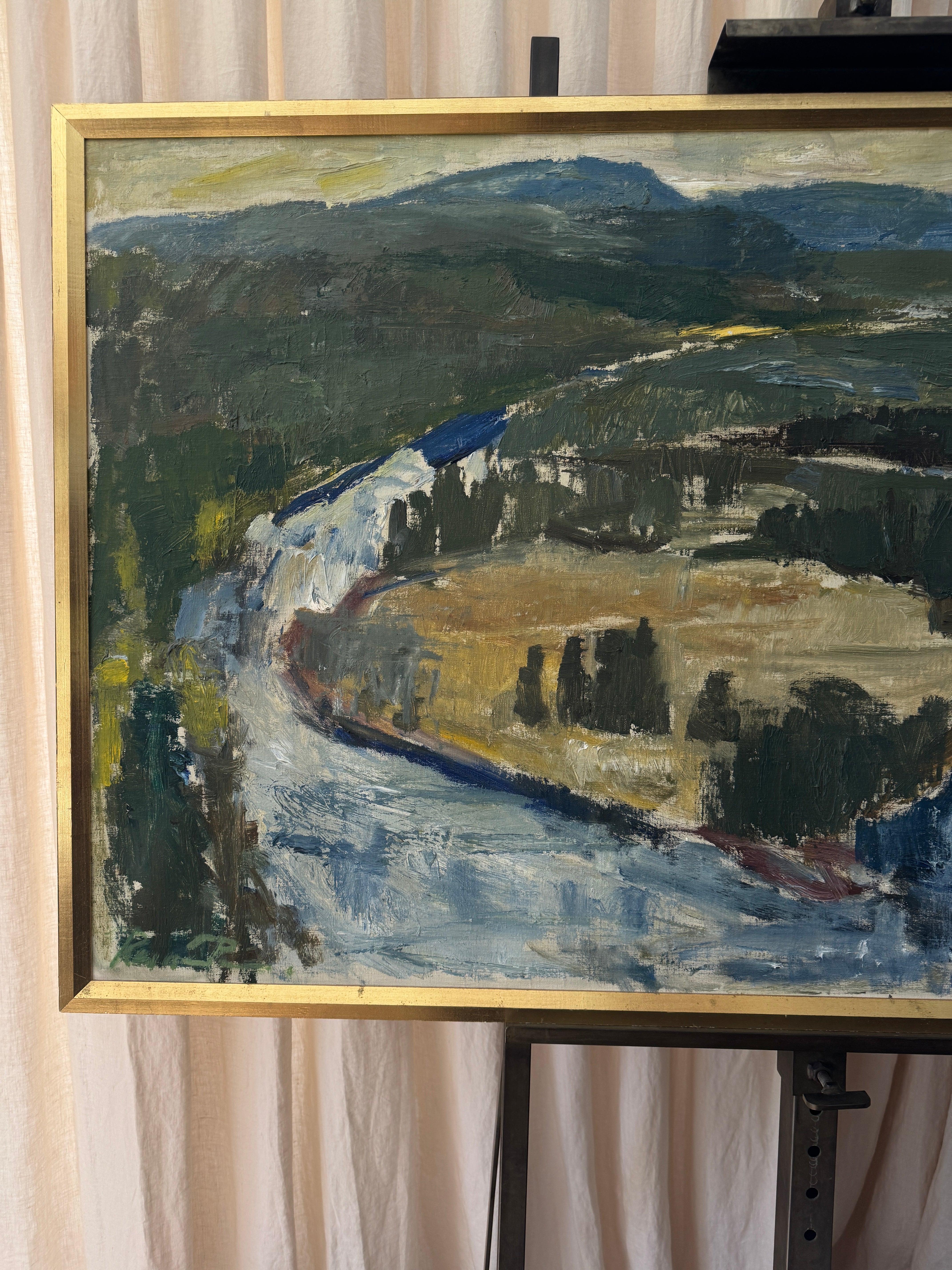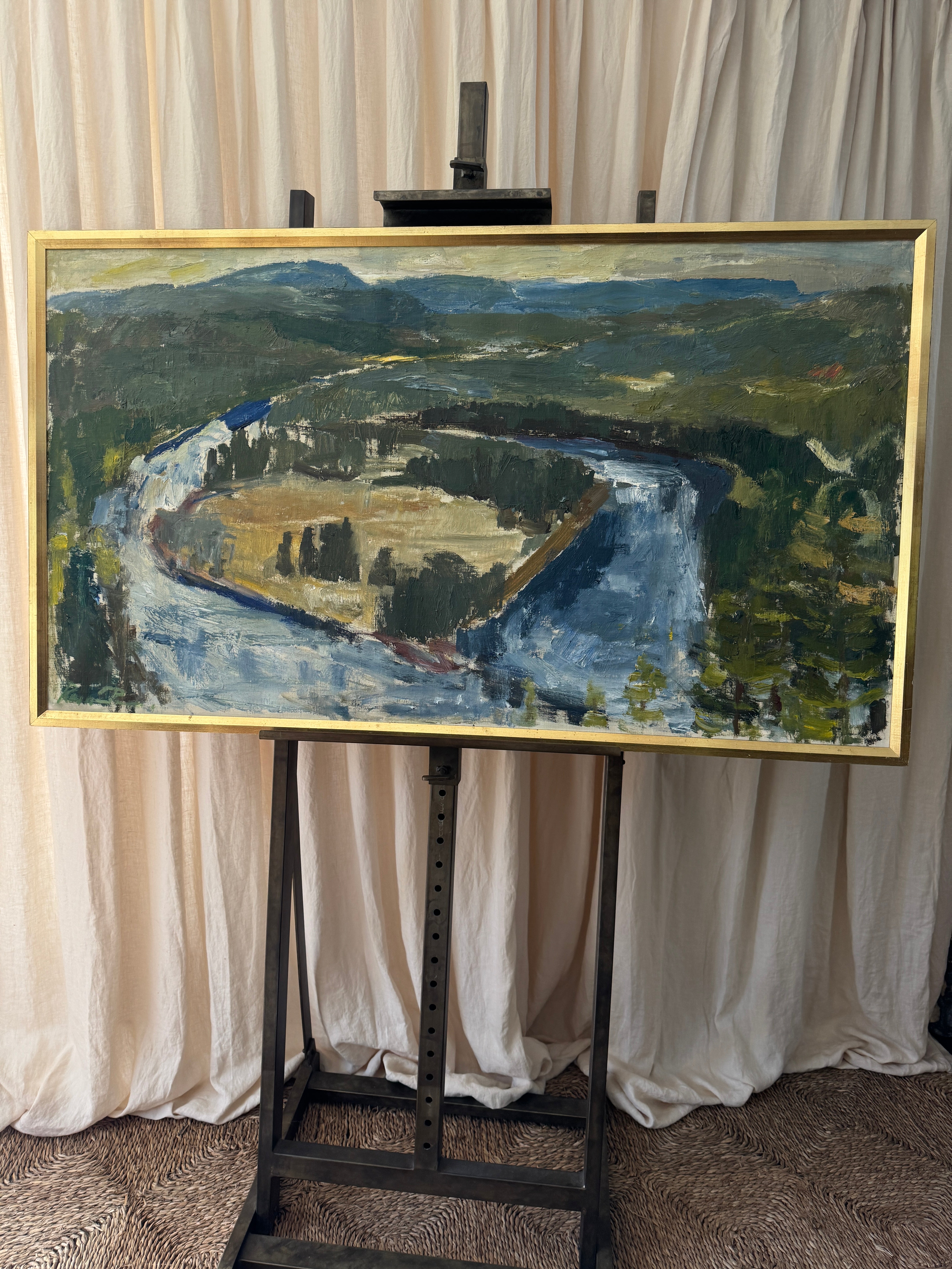 A sweeping large-scale oil on canvas landscape, capturing the dynamic curves of a river carving its way through rolling forested hills. The artist uses bold, expressive brushwork and a vibrant palette of blues, greens, and earthy ochres to convey both the vastness of nature and the immediacy of paint on canvas. There is a striking tension between the fluidity of the river and the solidity of the land, resulting in a composition that feels both grounded and alive with movement. A powerful statement piece from midcentury Sweden that celebrates the grandeur of the natural world.