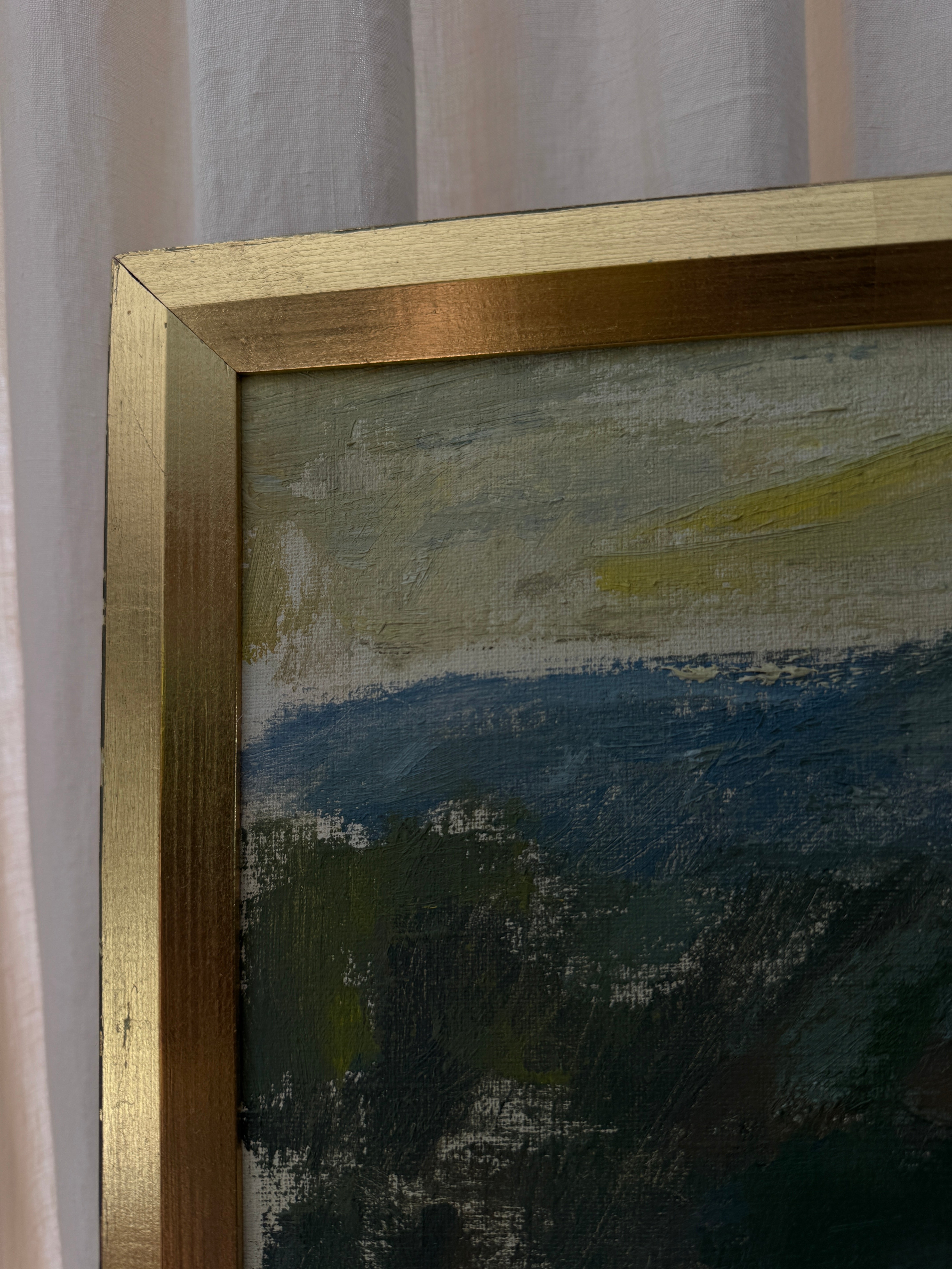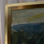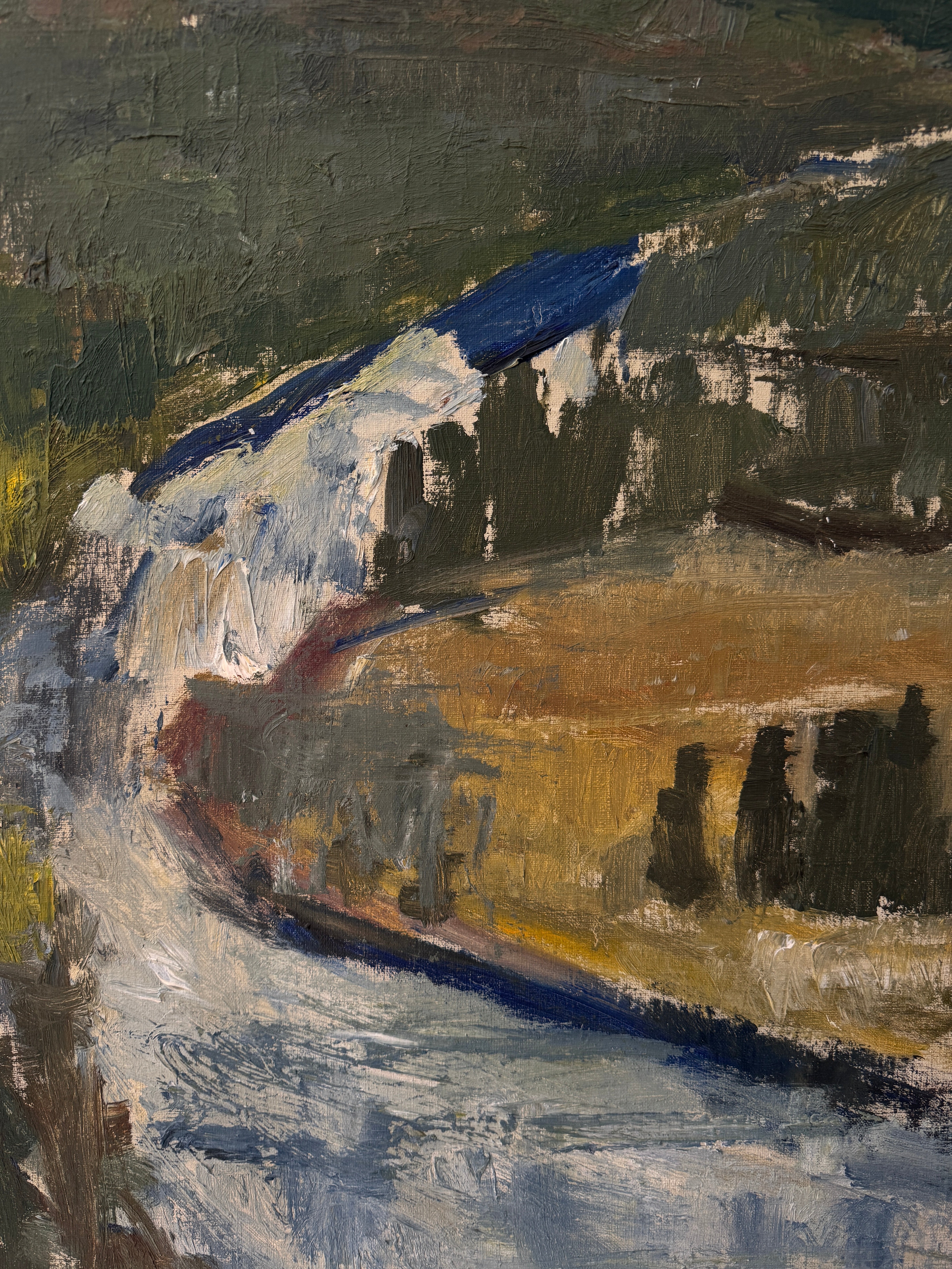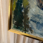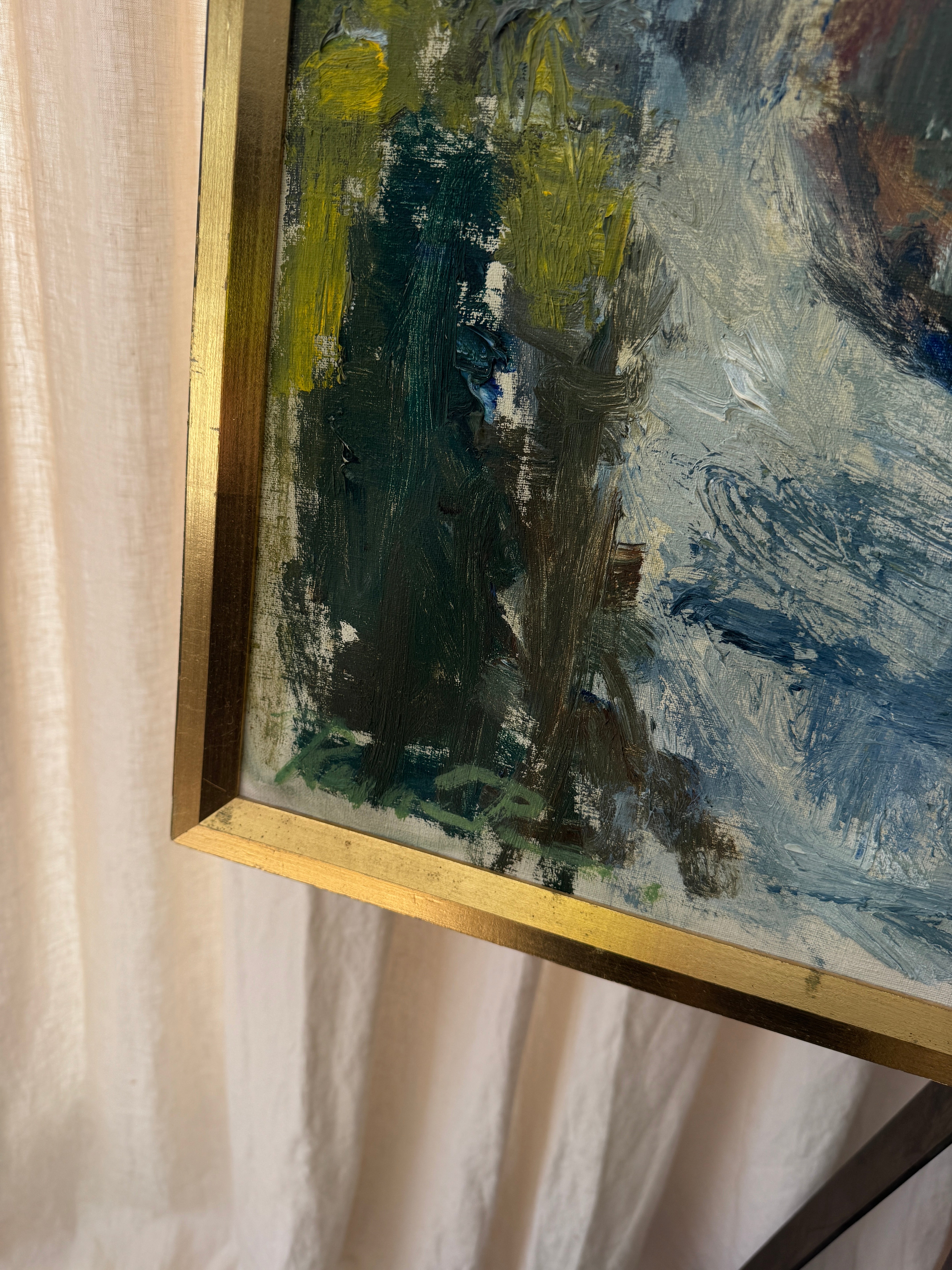A sweeping large-scale oil on canvas landscape, capturing the dynamic curves of a river carving its way through rolling forested hills. The artist uses bold, expressive brushwork and a vibrant palette of blues, greens, and earthy ochres to convey both the vastness of nature and the immediacy of paint on canvas. There is a striking tension between the fluidity of the river and the solidity of the land, resulting in a composition that feels both grounded and alive with movement. A powerful statement piece from midcentury Sweden that celebrates the grandeur of the natural world.