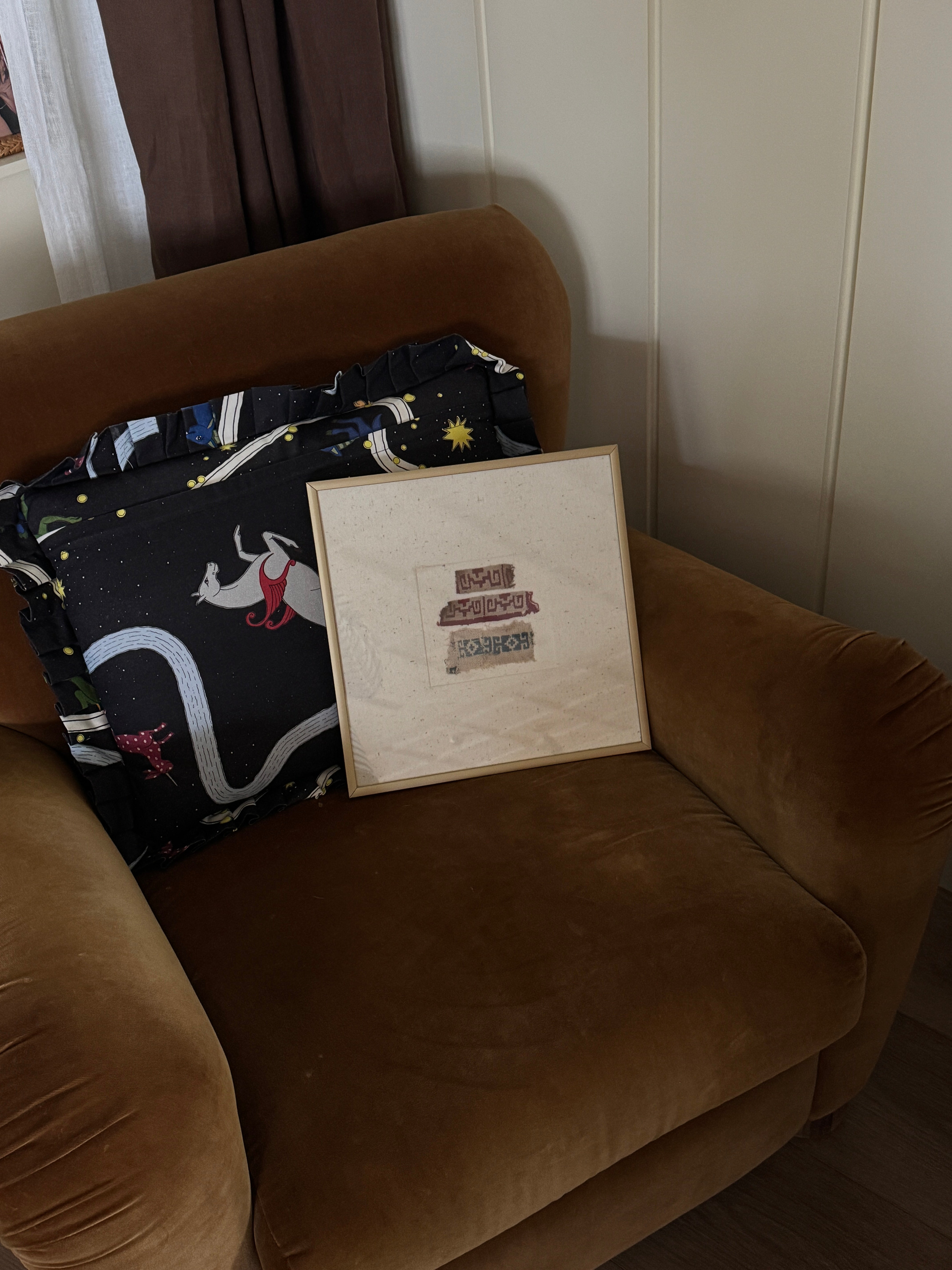 These are pre-Inca pieces. Gold metal-framed behind glass on linen. Each of the five pieces in named after the Quechuan words for 1-5.