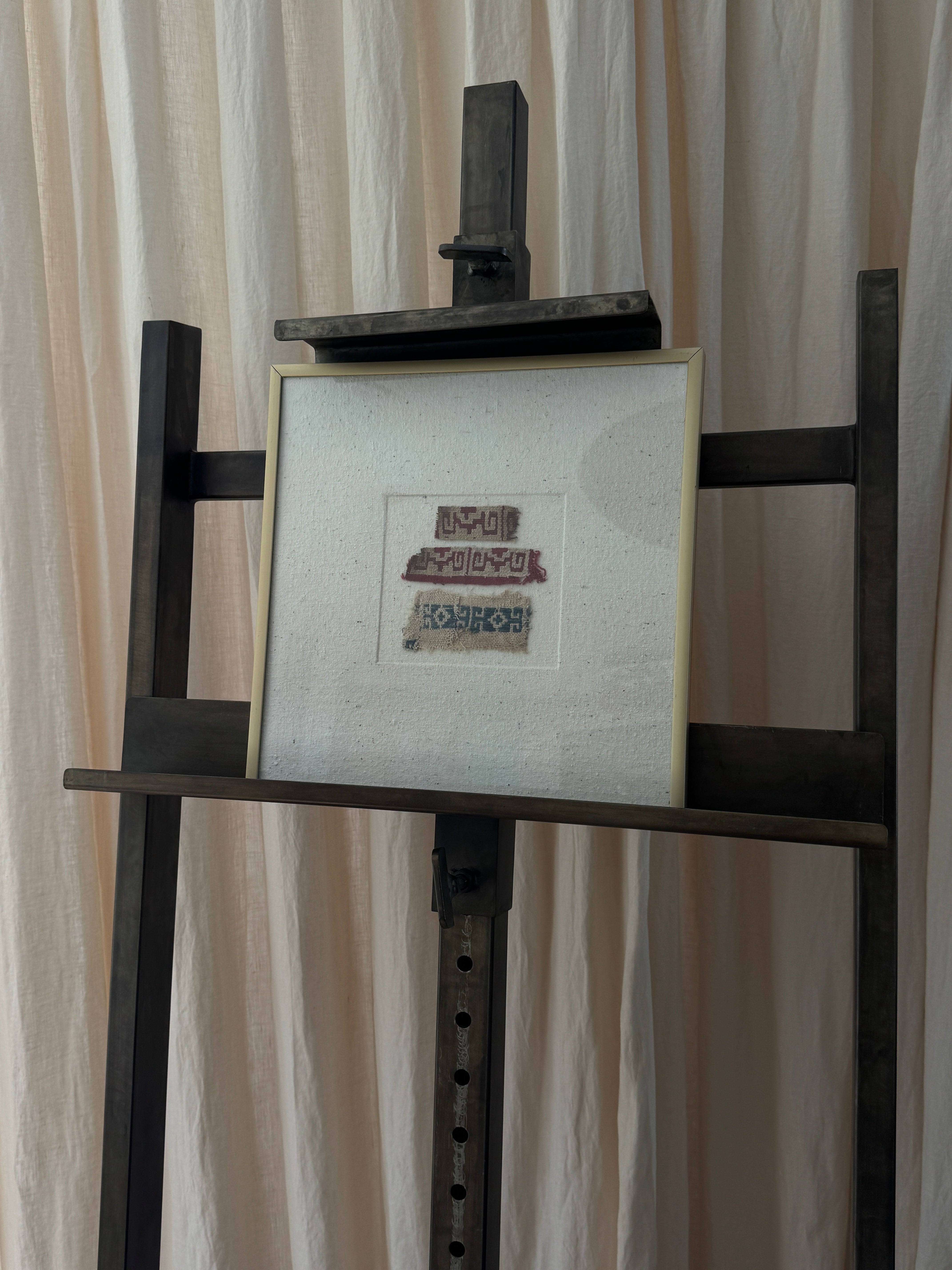 These are pre-Inca pieces. Gold framed behind glass on linen. Each of the five pieces in named after the Quechuan words for 1-5.