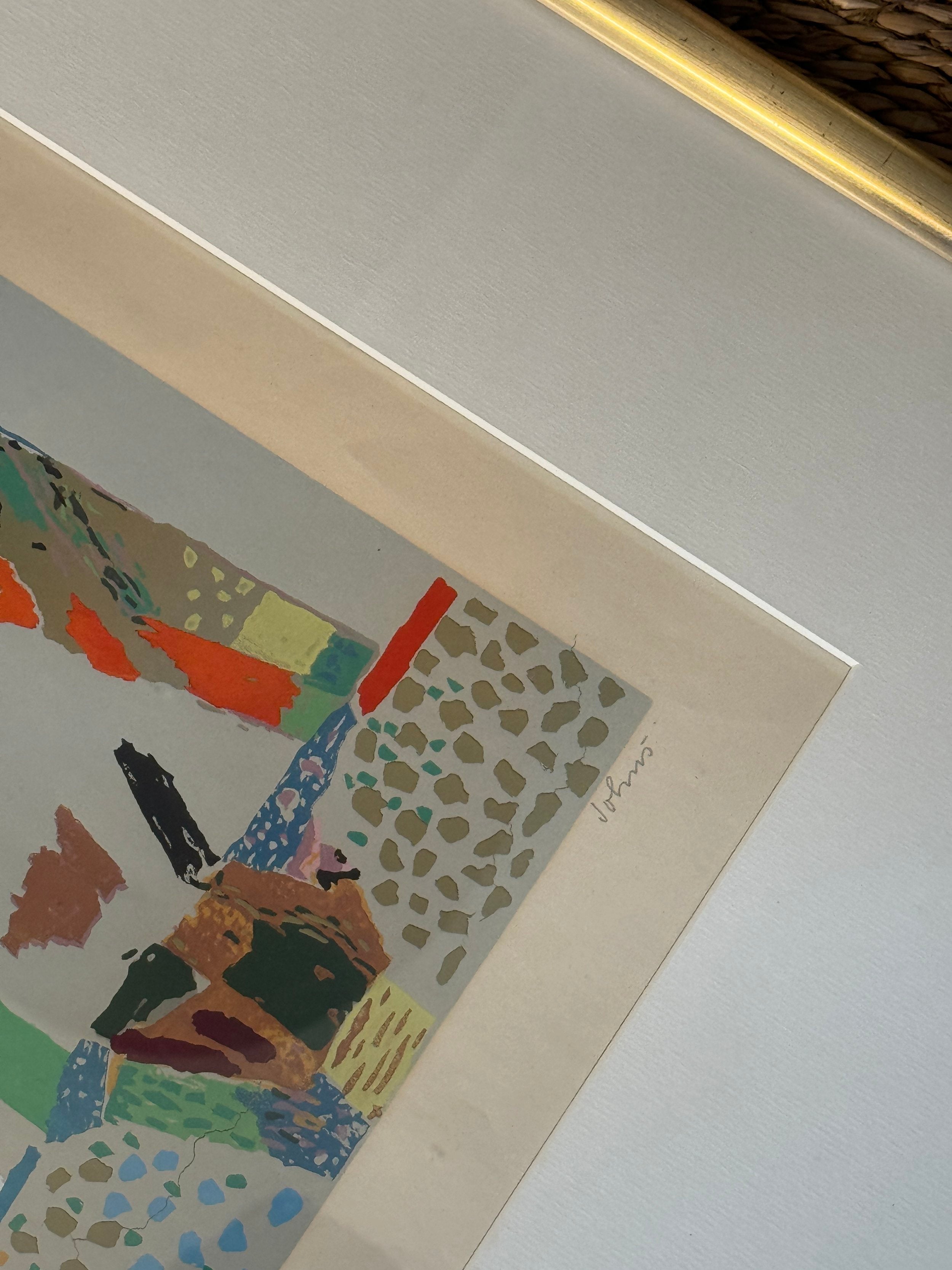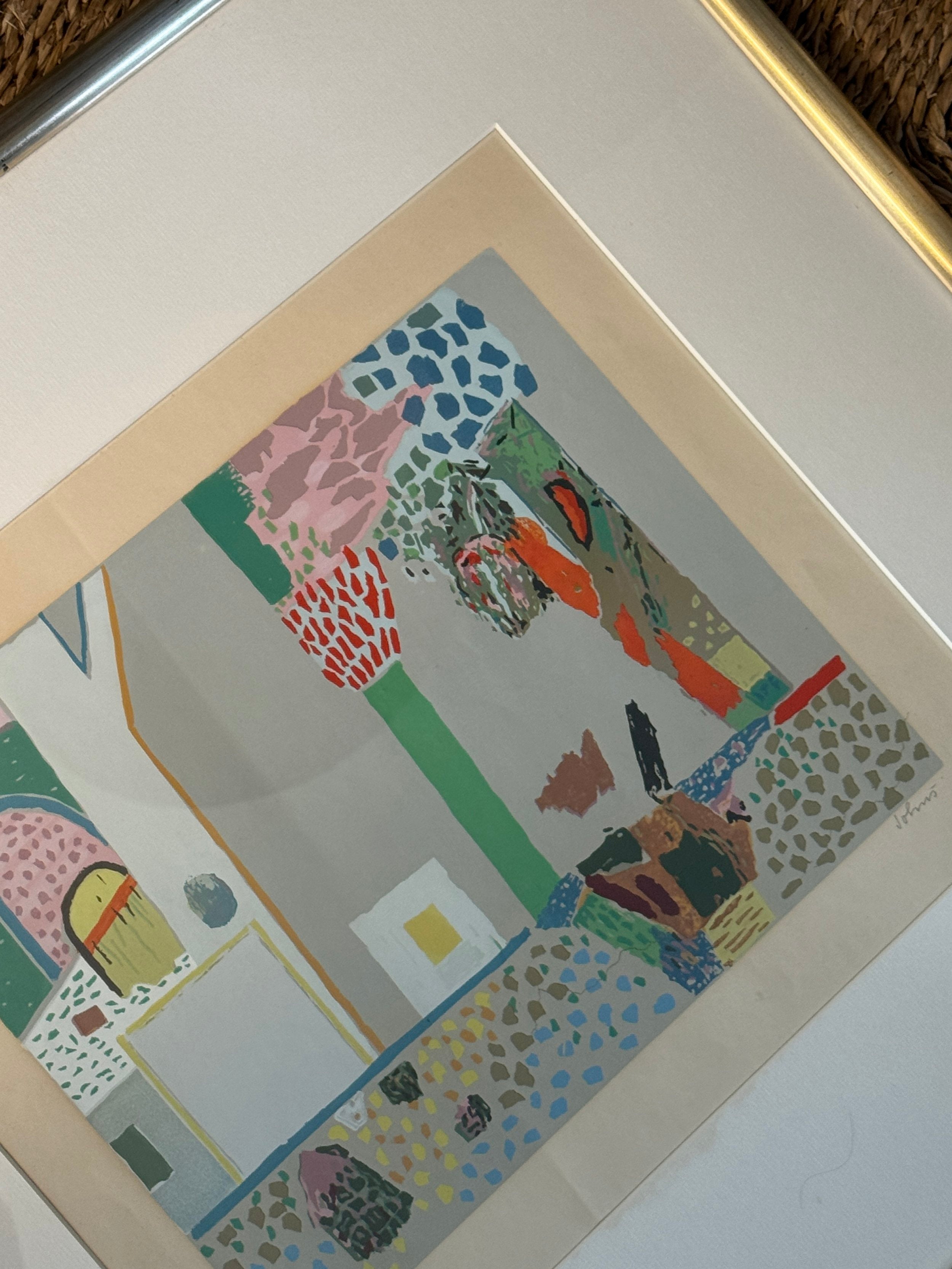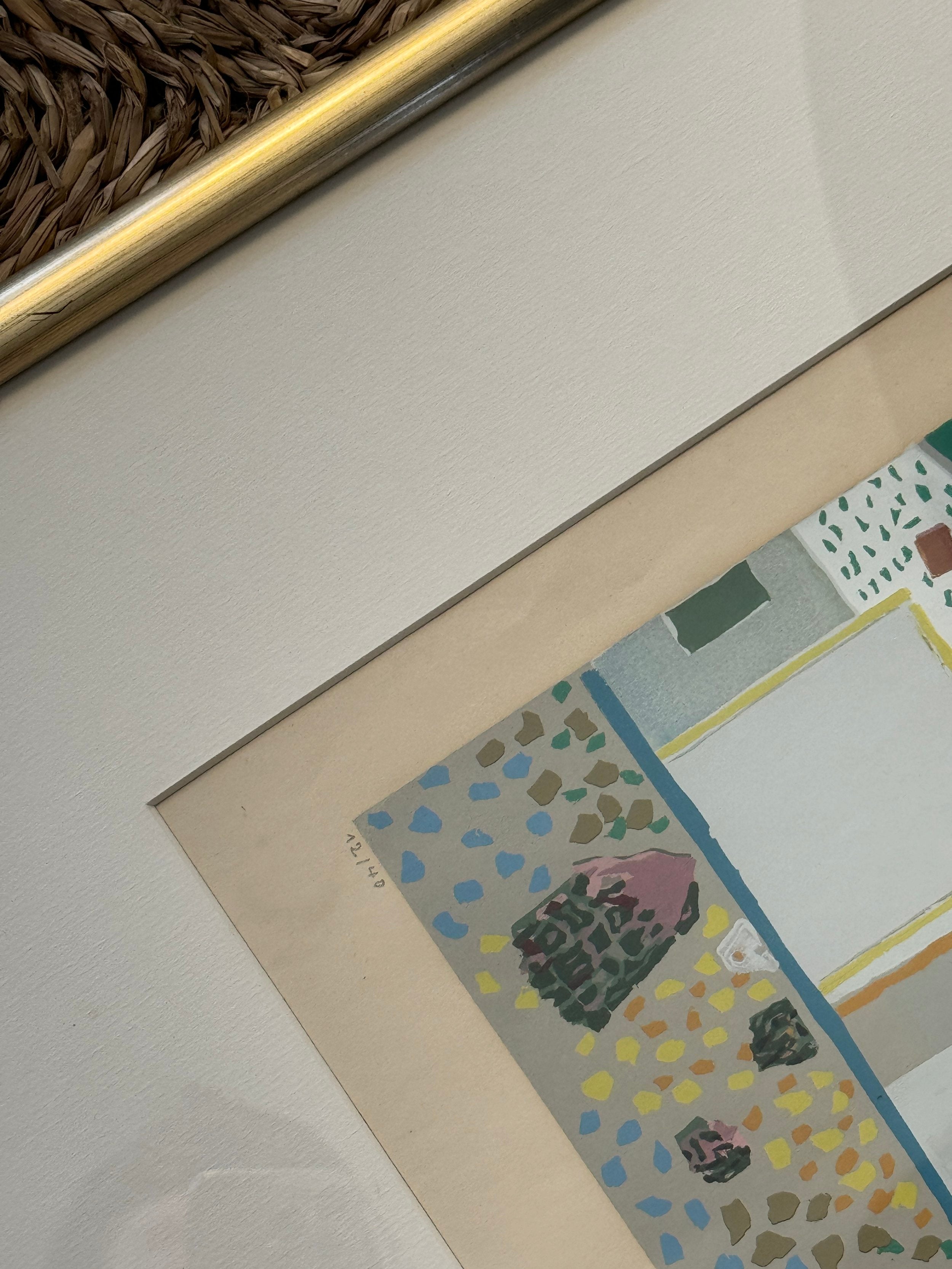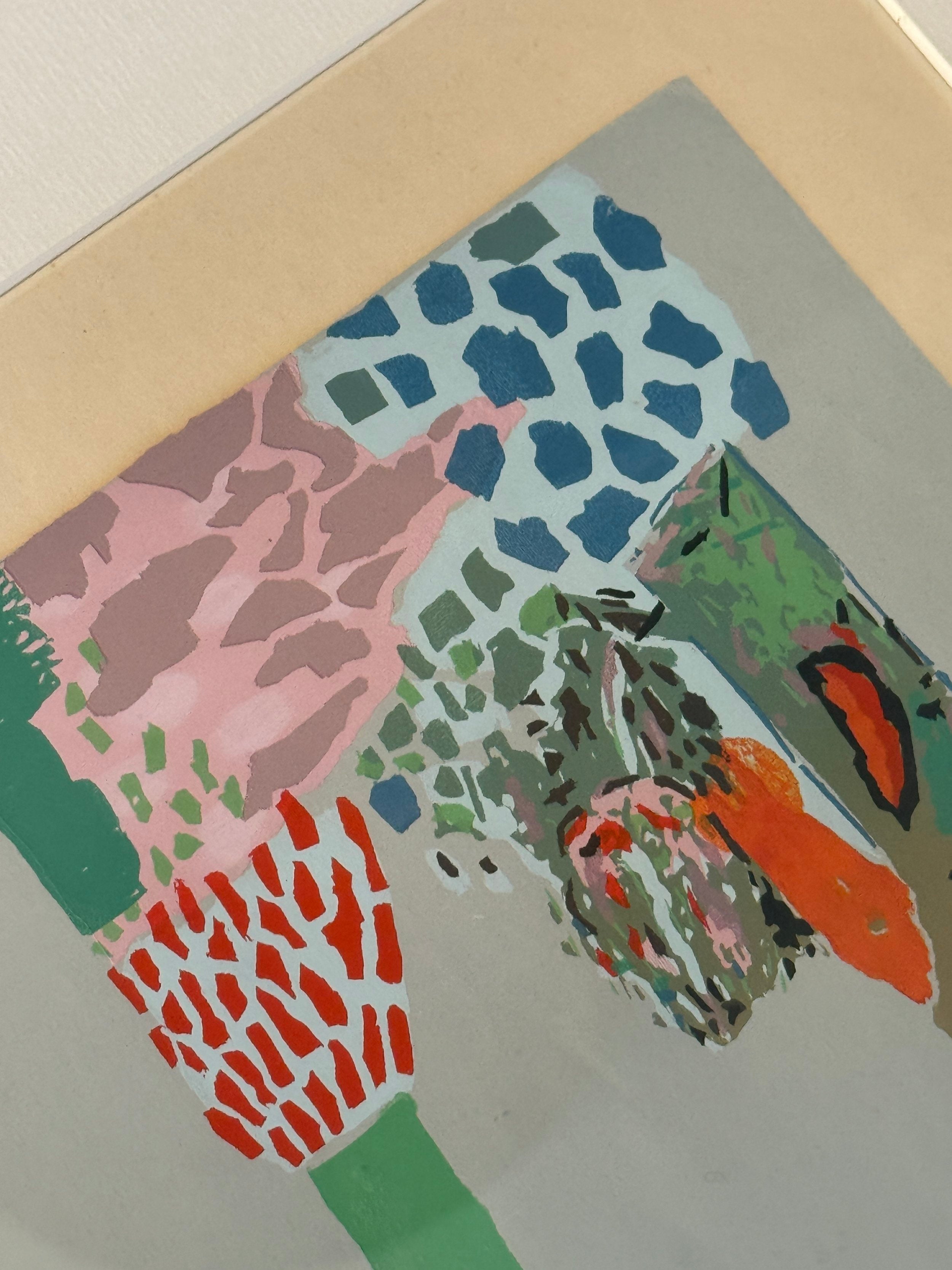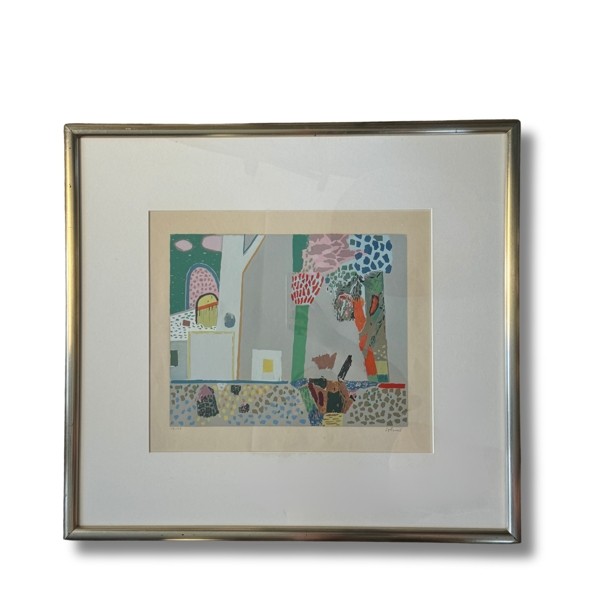 This one of two German midcentury abstract screenprints is a rare, signed, and numbered modernist treasure behind glass in the original frame. Limited to just 40 copies each, these compositions showcase the artist’s mastery of color and form, featuring layered geometric and organic shapes in a palette of soft pastels and earthy tones. Measuring approximately 26 x 38 cm (unframed) and elegantly set behind passe-partout and glass within their understated frames (approx. 58 x 63 cm), they bring a sense of curated sophistication to any space. Perfect for collectors of midcentury abstraction or those seeking statement art that bridges modern design with timeless elegance, these pieces invite a playful yet serene energy into your interior.