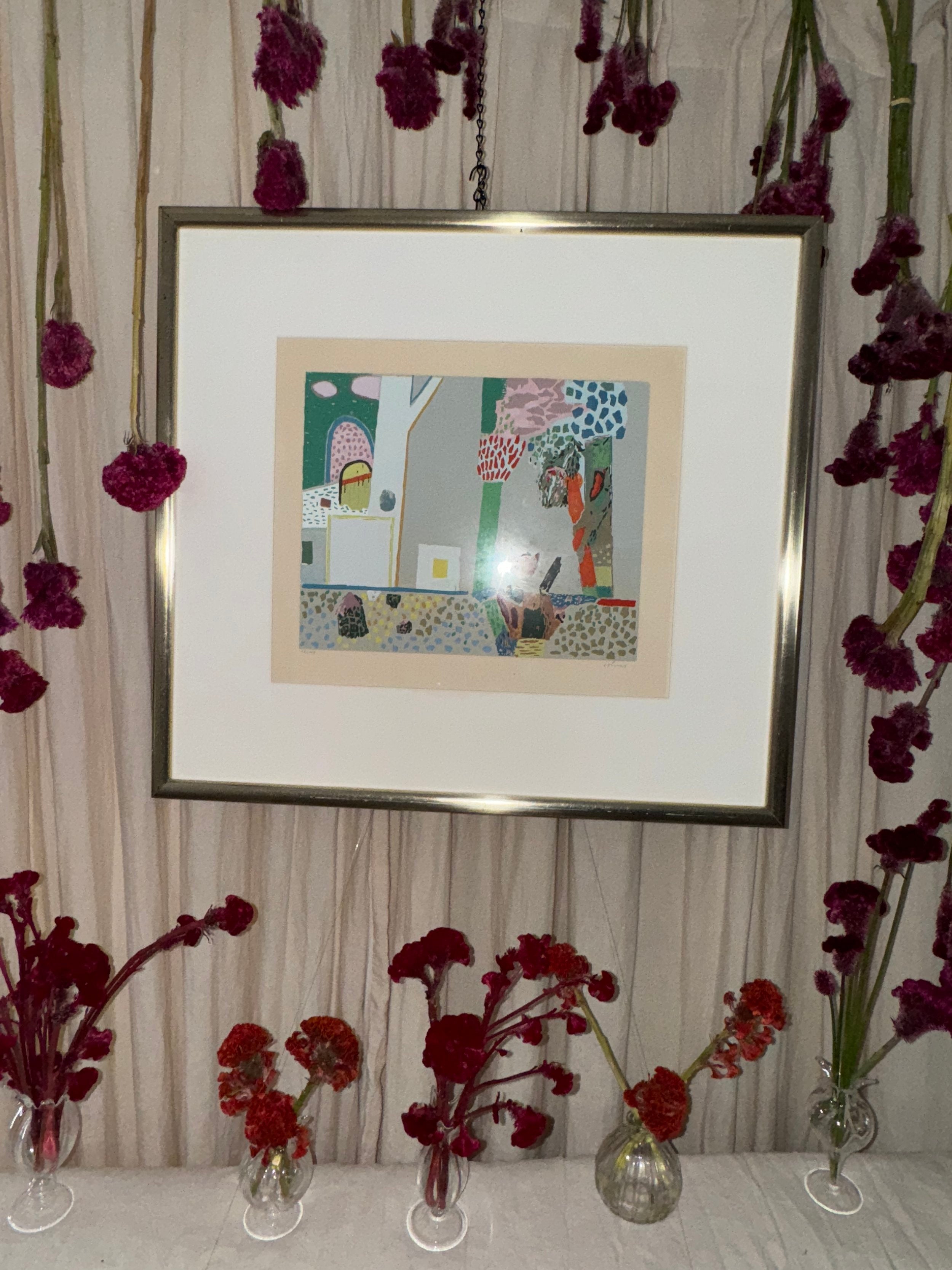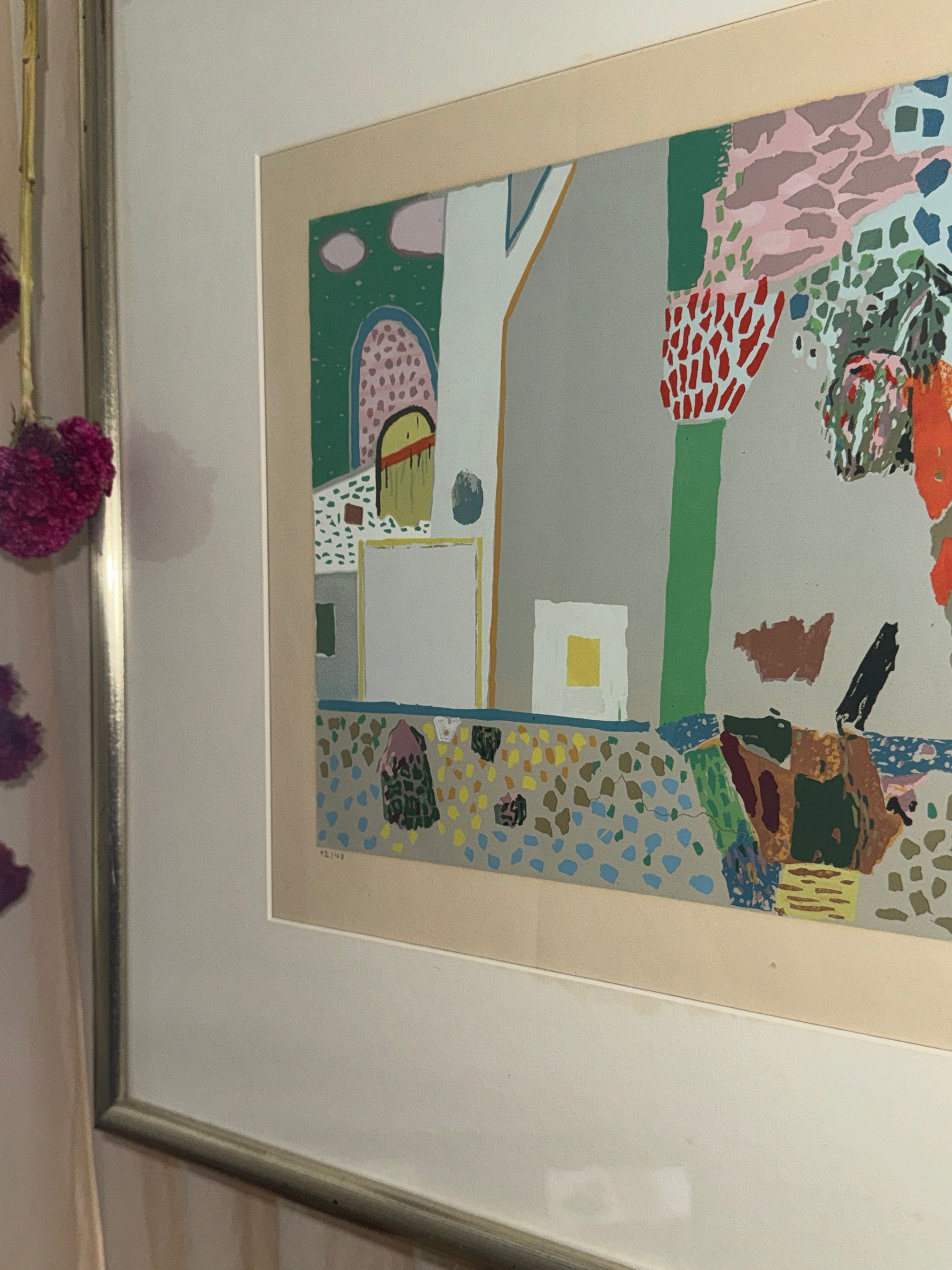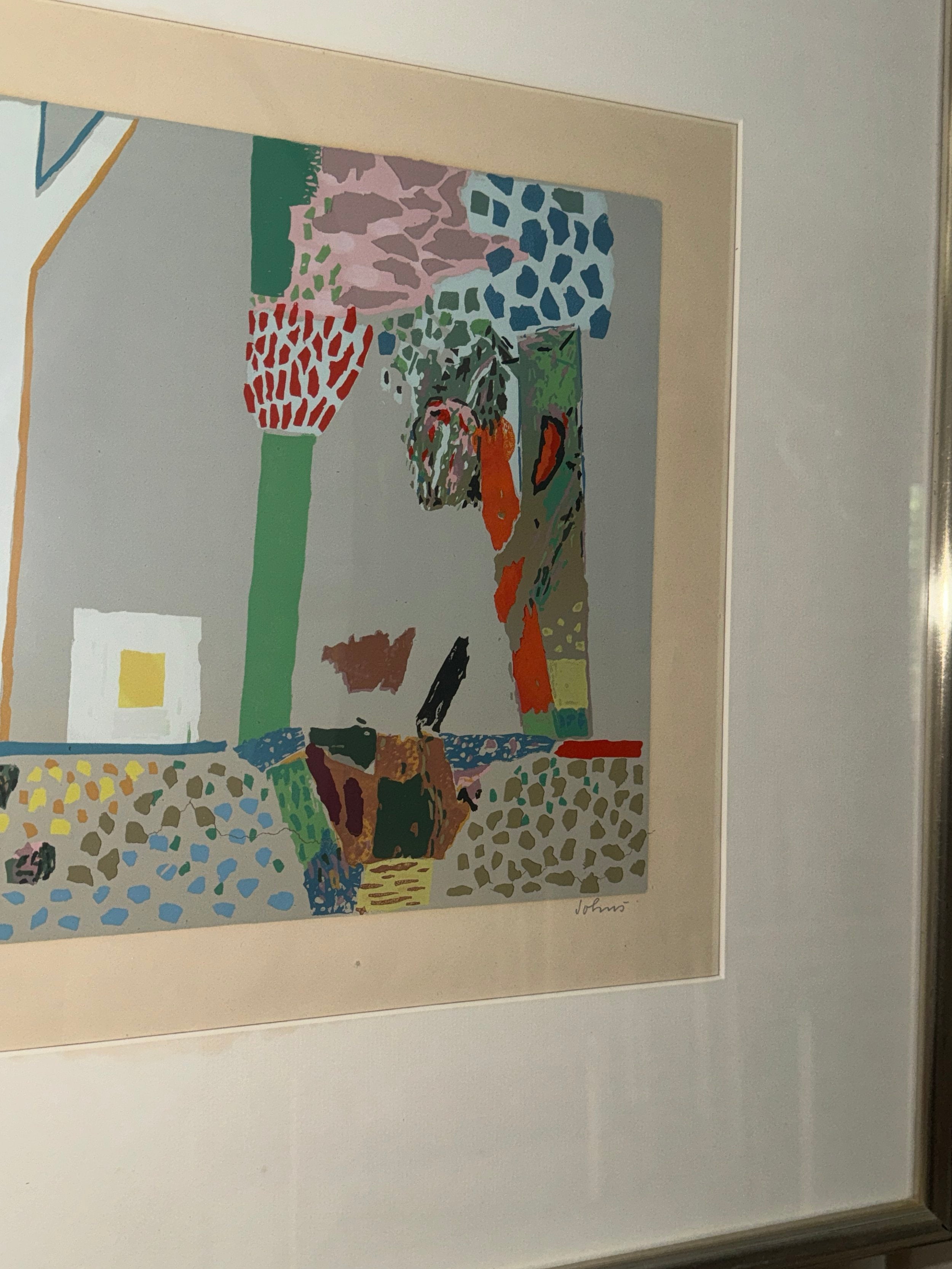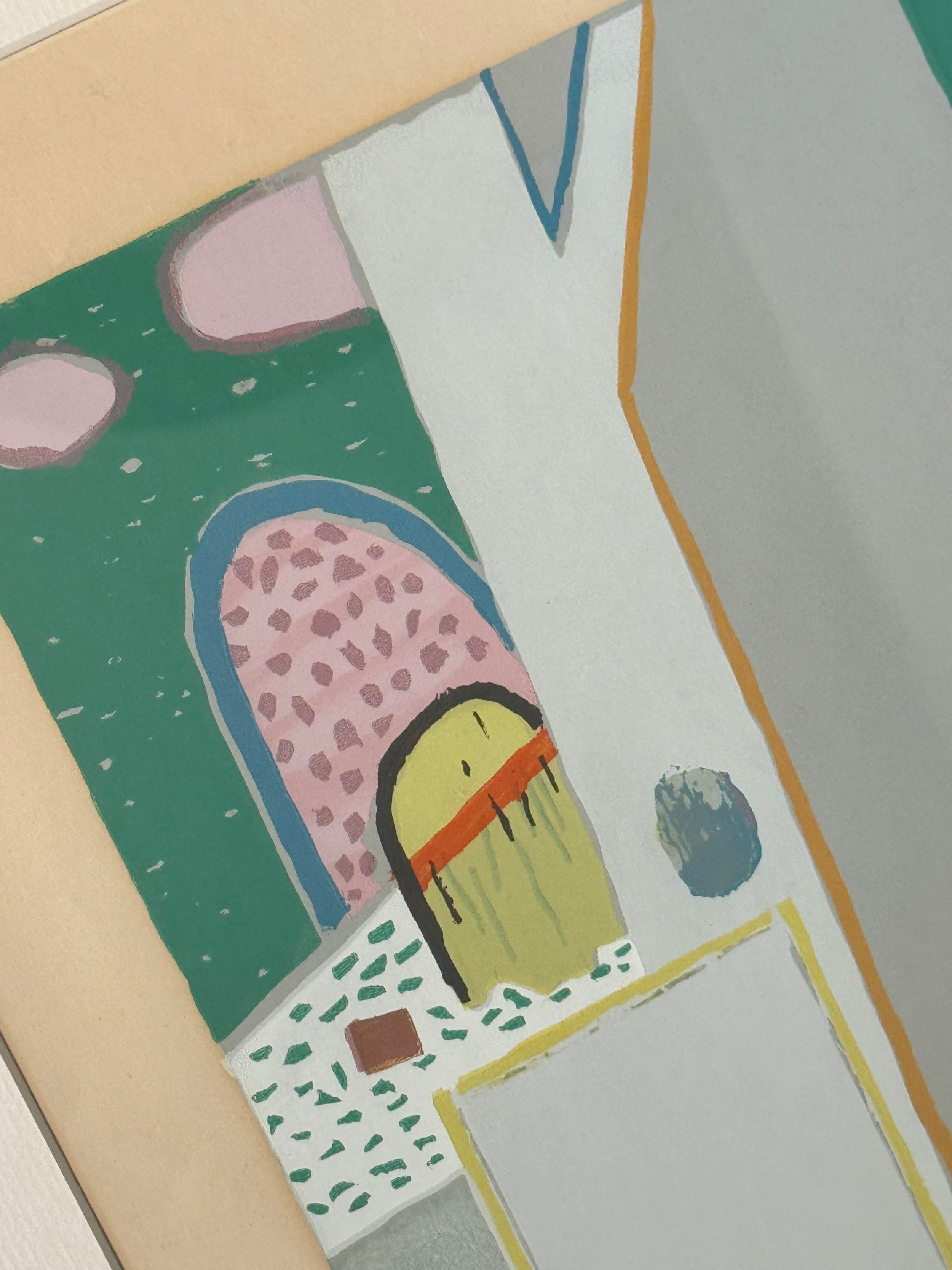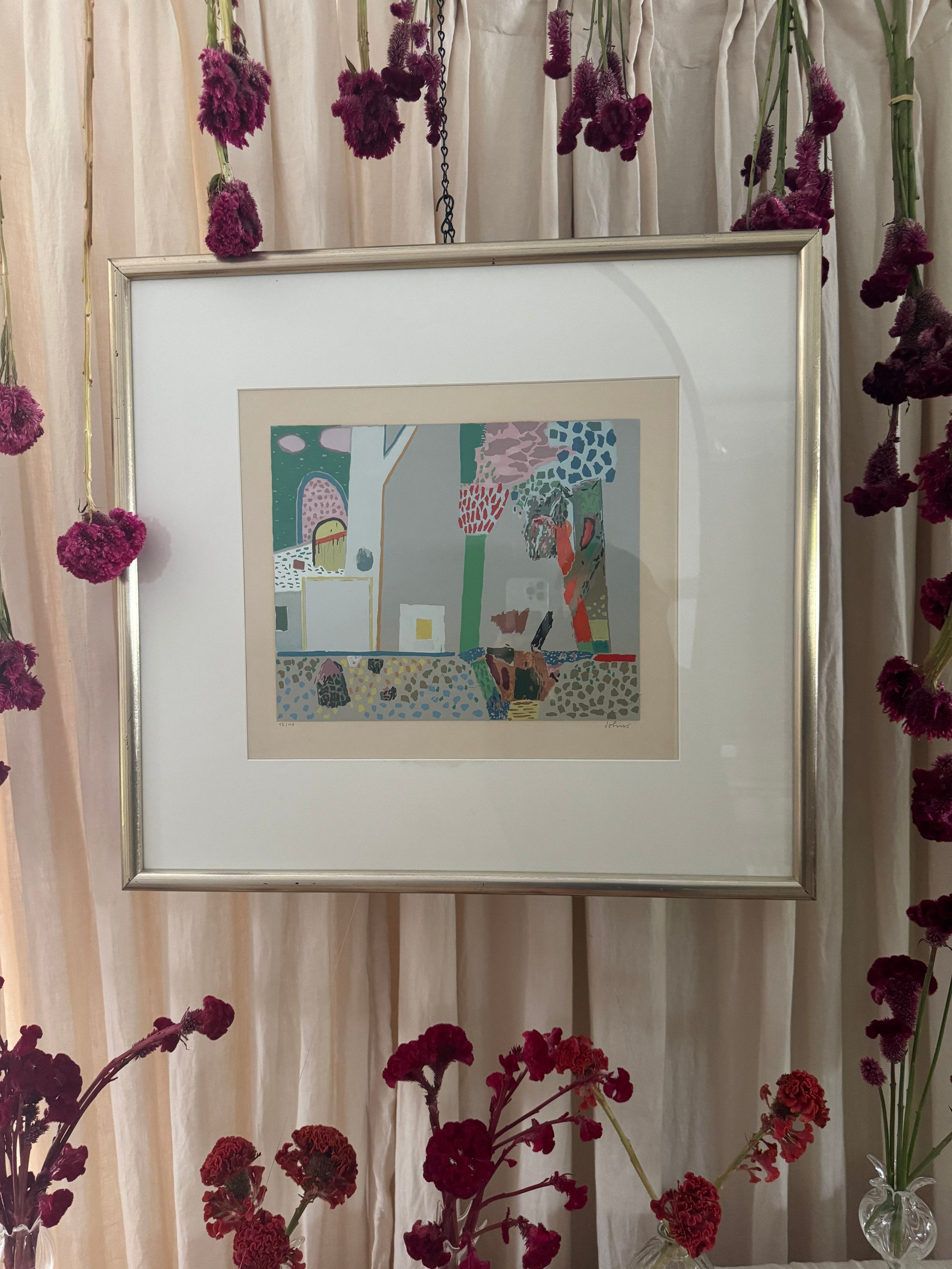 This one of two German midcentury abstract screenprints is a rare, signed, and numbered modernist treasure behind glass in the original frame. Limited to just 40 copies each, these compositions showcase the artist’s mastery of color and form, featuring layered geometric and organic shapes in a palette of soft pastels and earthy tones. Measuring approximately 26 x 38 cm (unframed) and elegantly set behind passe-partout and glass within their understated frames (approx. 58 x 63 cm), they bring a sense of curated sophistication to any space. Perfect for collectors of midcentury abstraction or those seeking statement art that bridges modern design with timeless elegance, these pieces invite a playful yet serene energy into your interior.