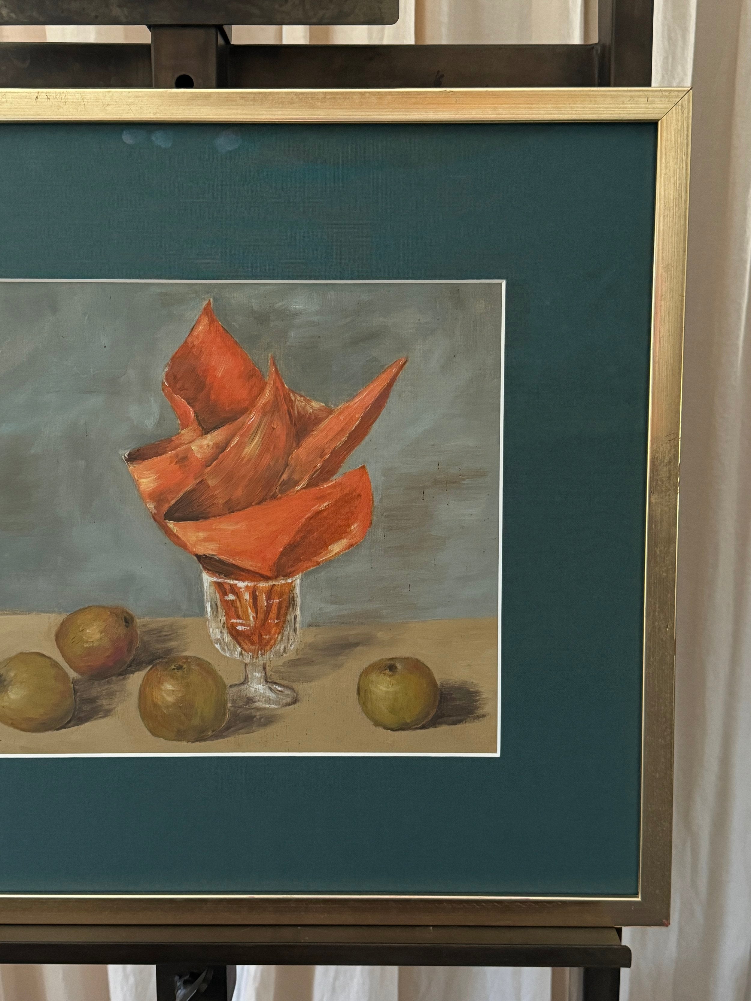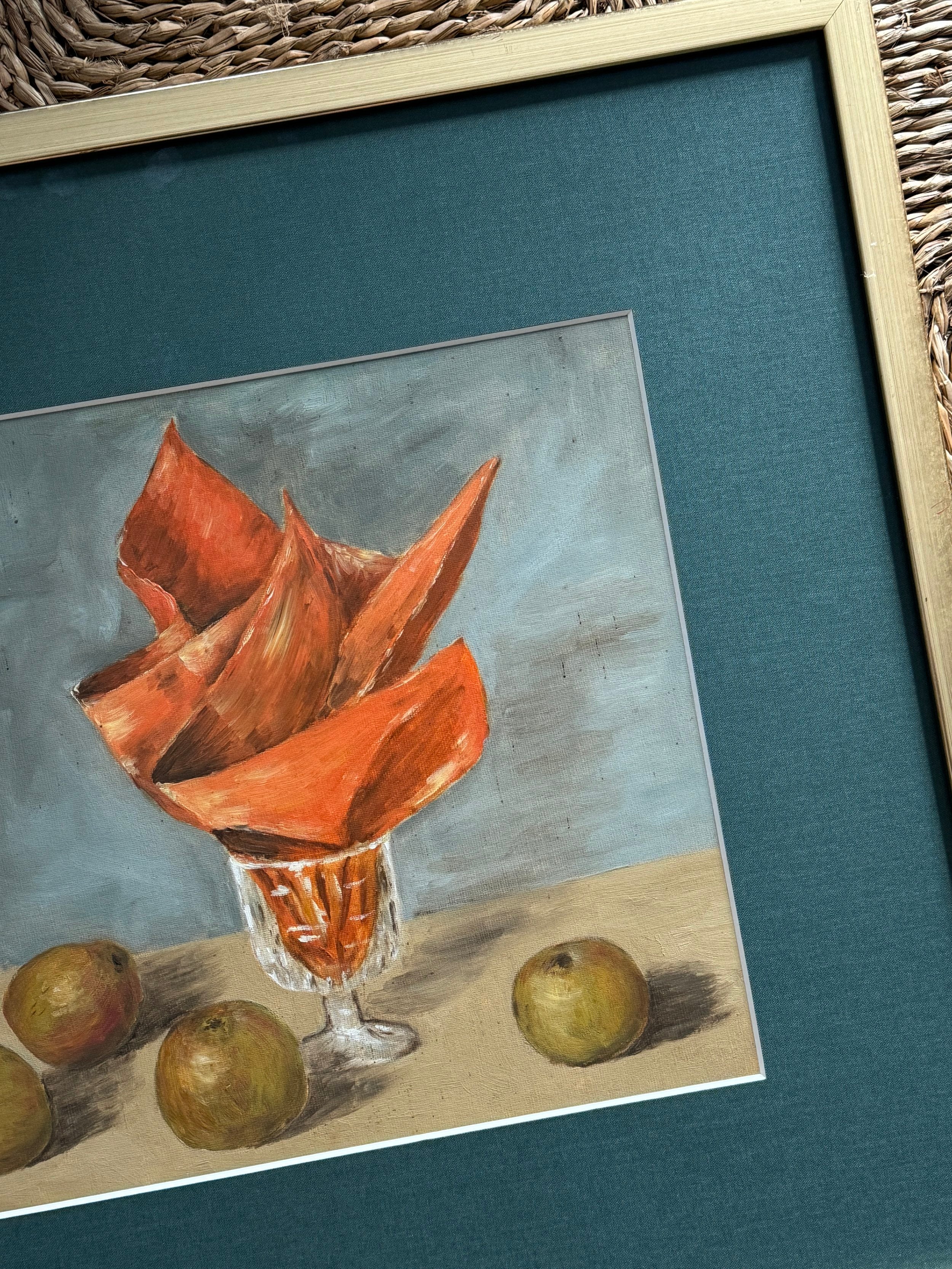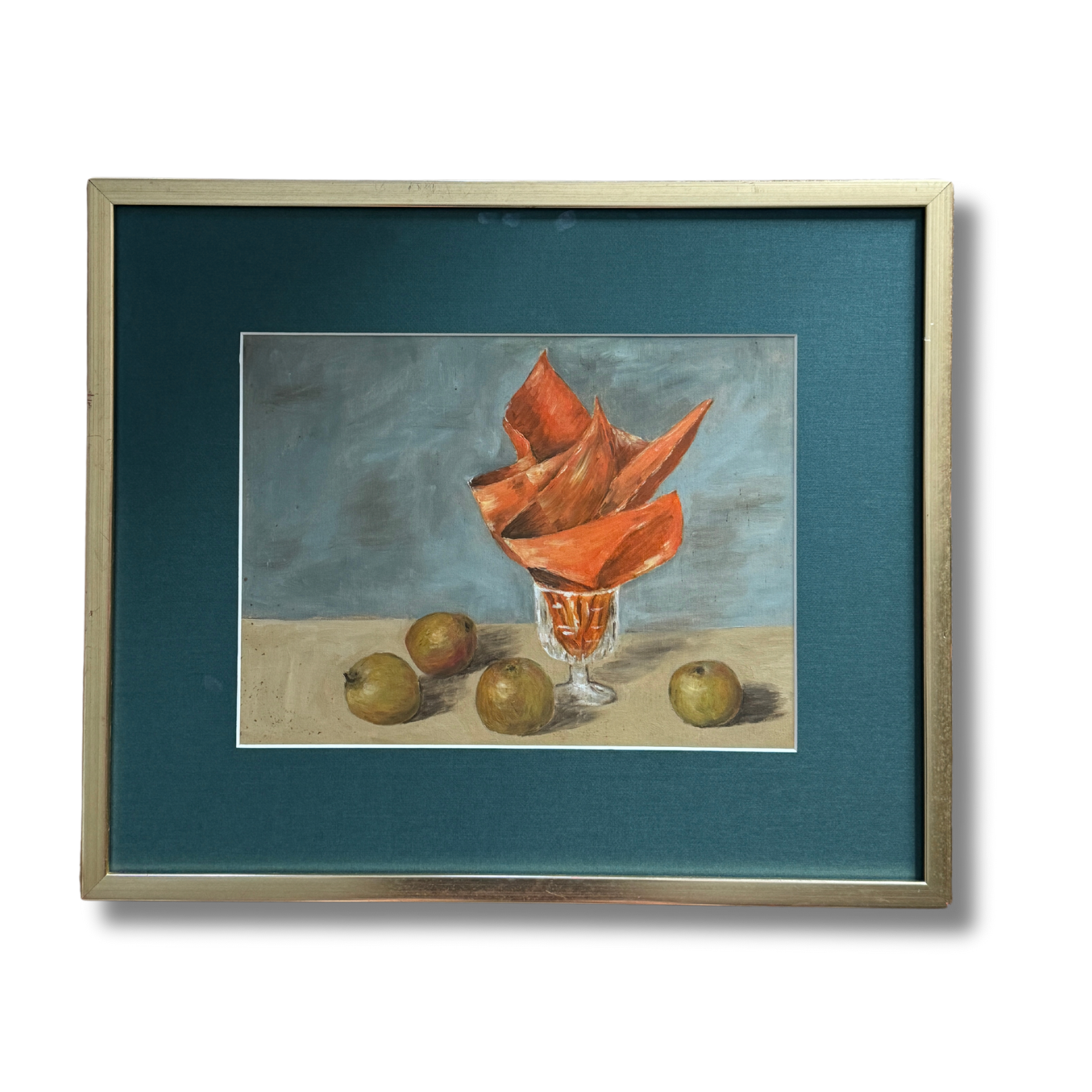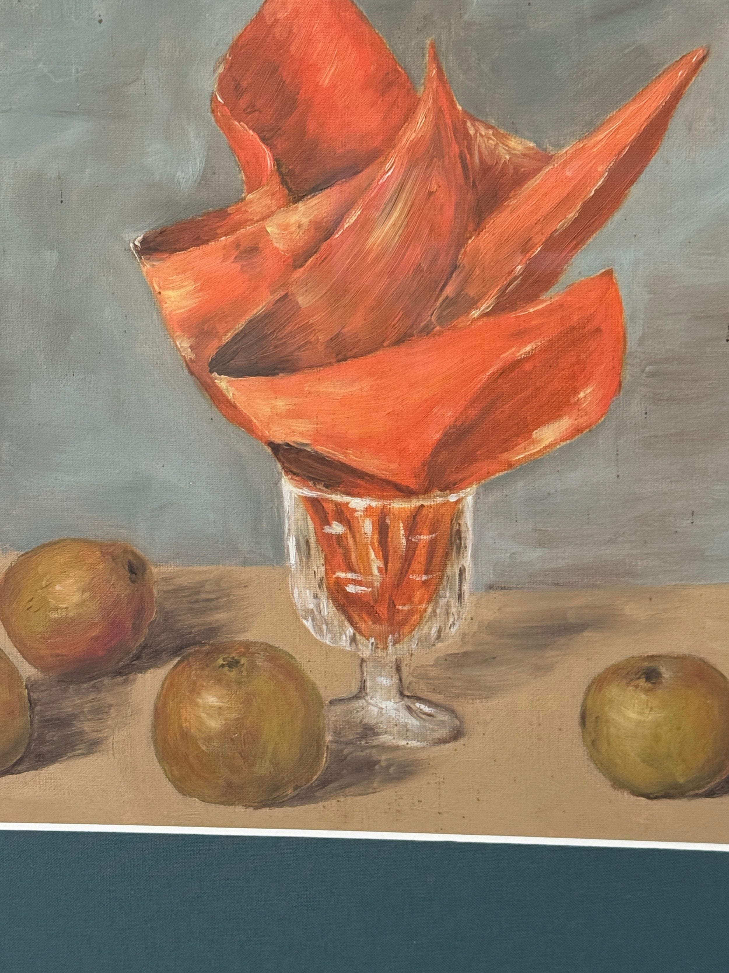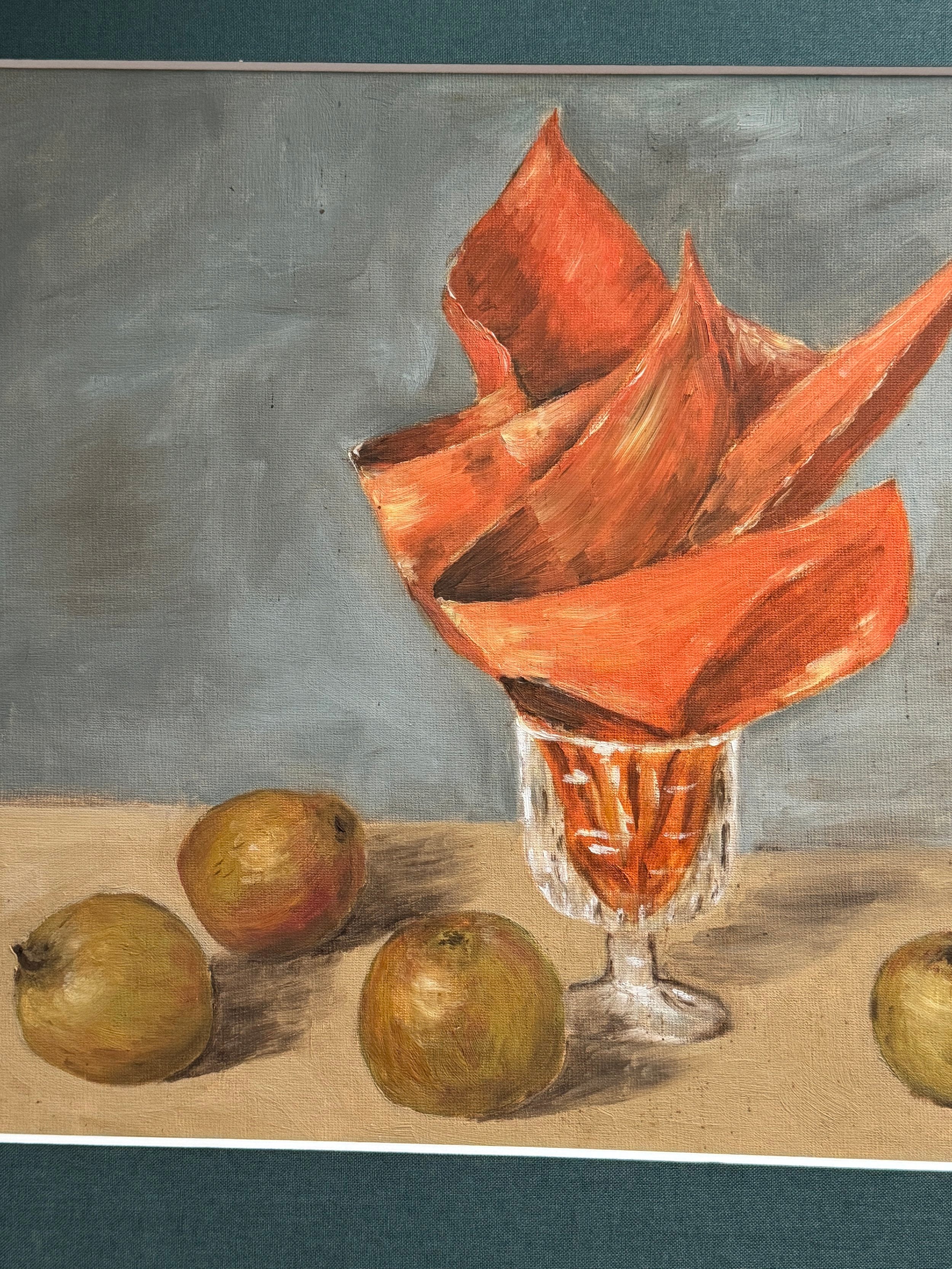 This French still life presents an intriguing balance between simplicity and boldness. And the colours! The crisp, angular folds of a vibrant orange napkin are dramatically poised in a glass, contrasting the softer, organic shapes of the apples scattered below. The composition feels modern in its abstraction, while the muted background enhances the vibrancy of the central elements without competing for attention. There's an elegance to how the light subtly highlights the textures—from the sheen of the glass to the matte finish of the fruit. It’s a study in contrasts, a playful arrangement that invites quiet contemplation of everyday objects presented in an unexpected way. It is an oil on board behind glass, with an updated blue linen mount and museum glass.