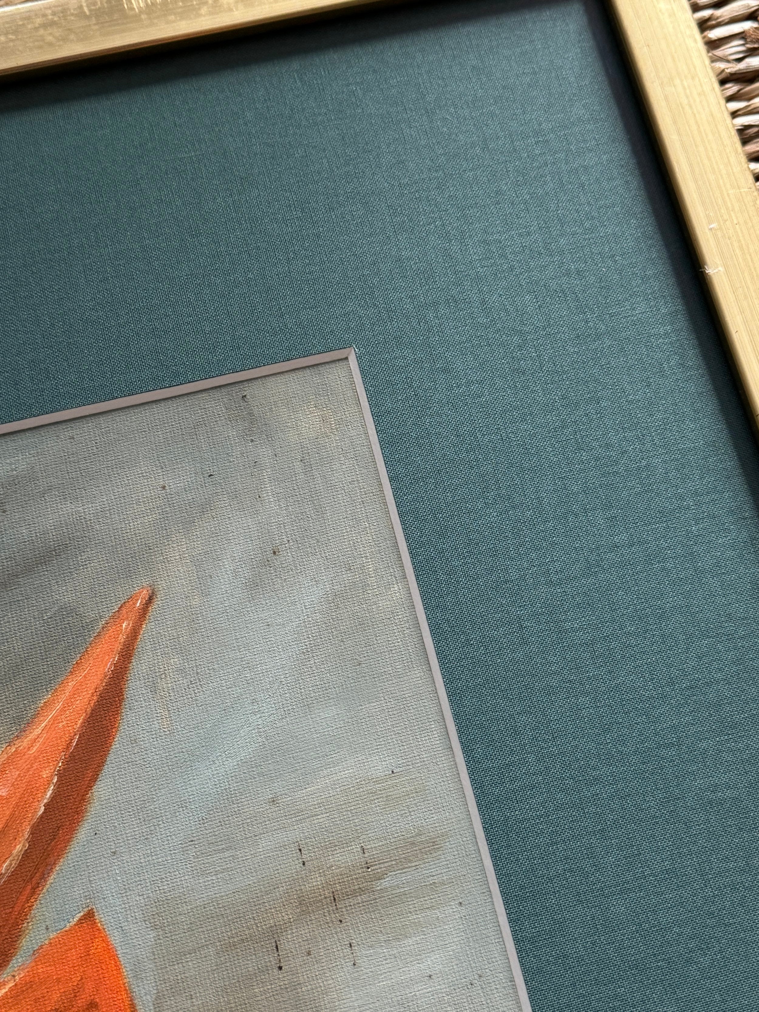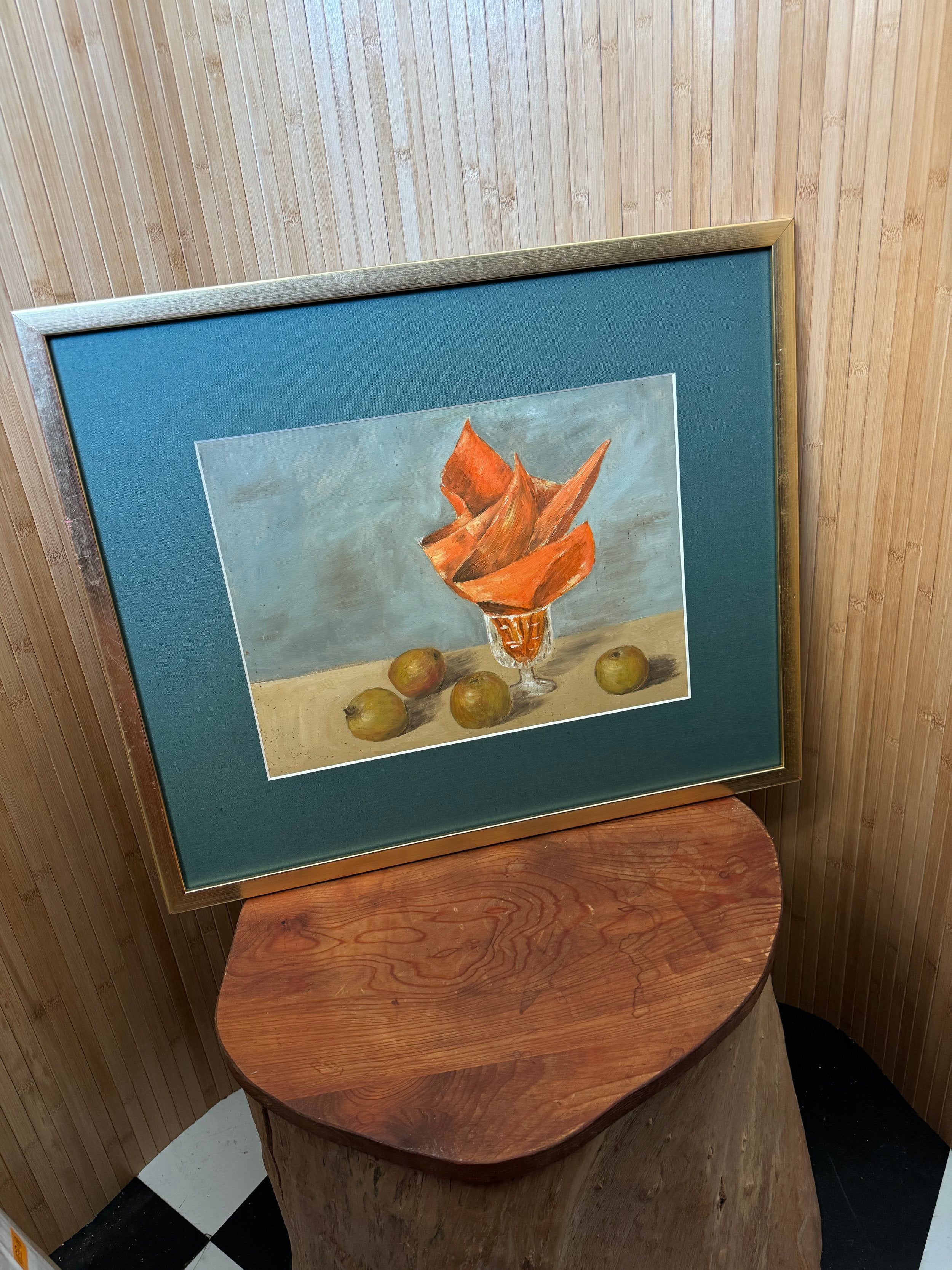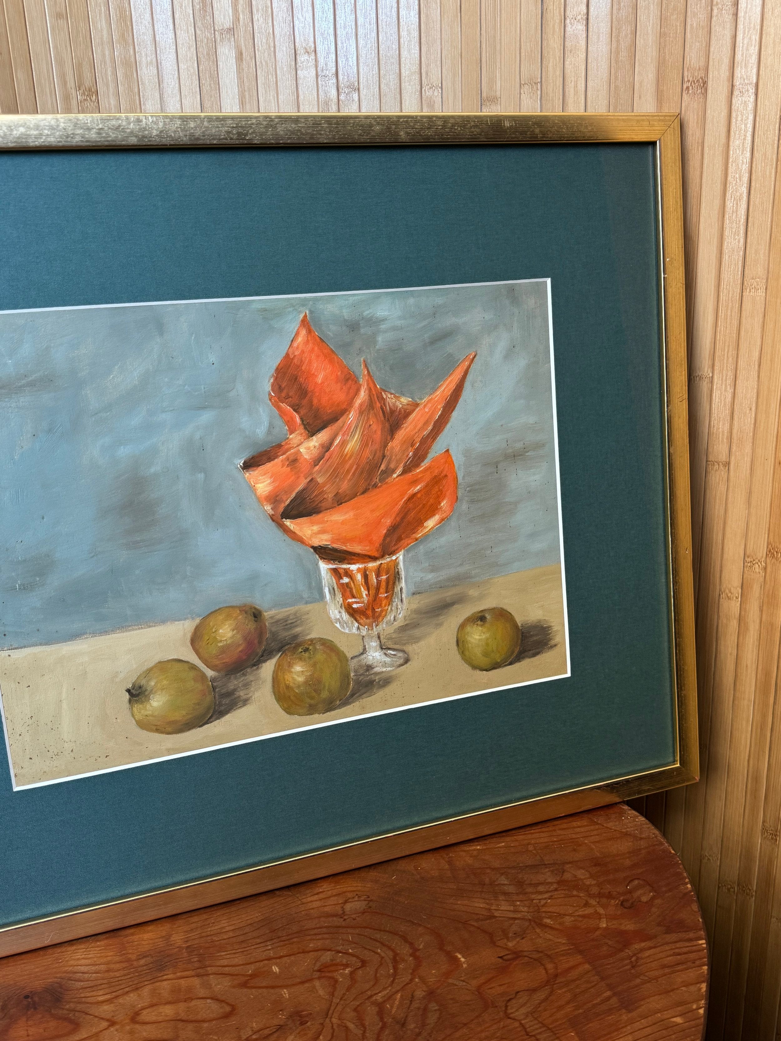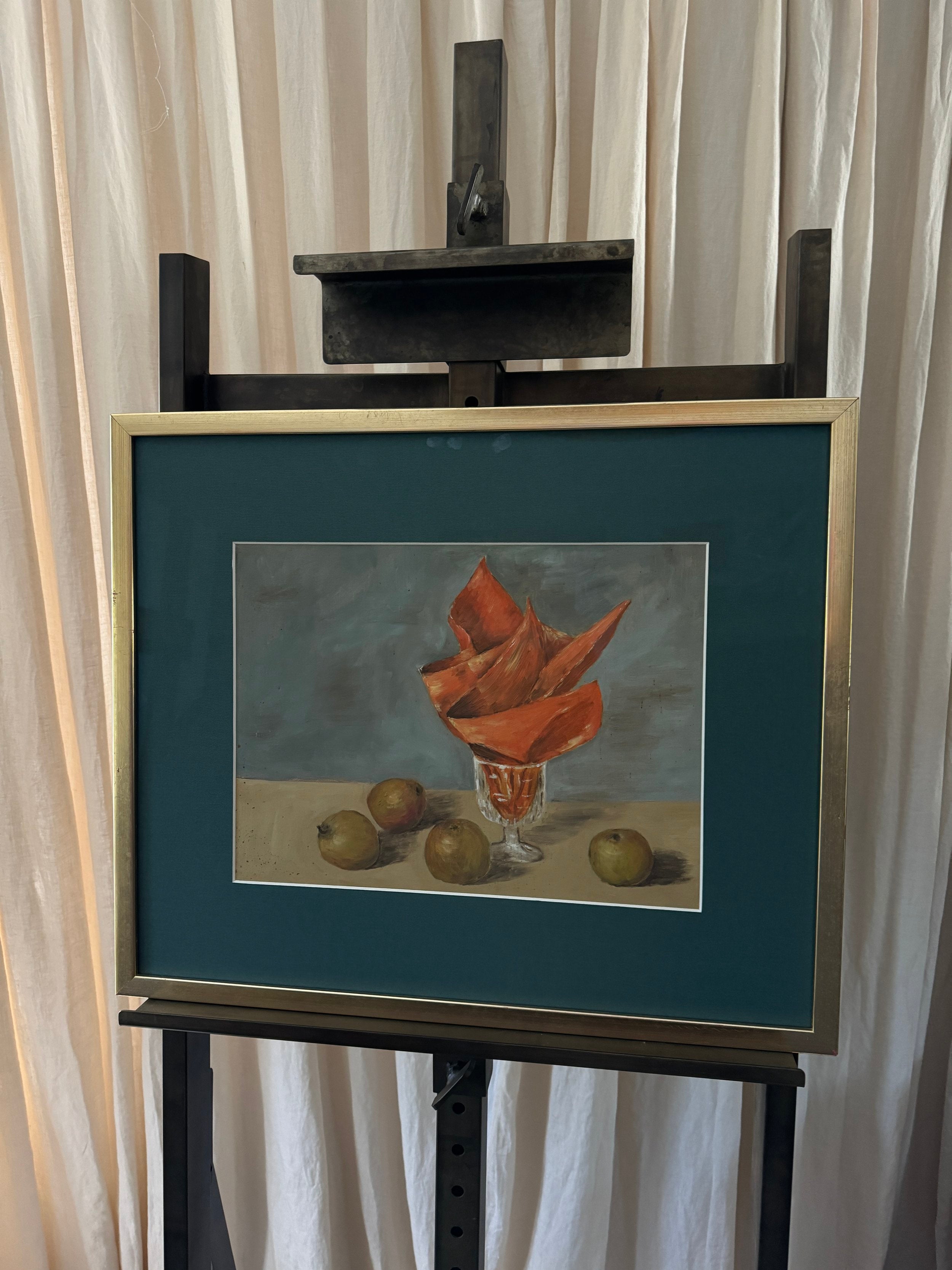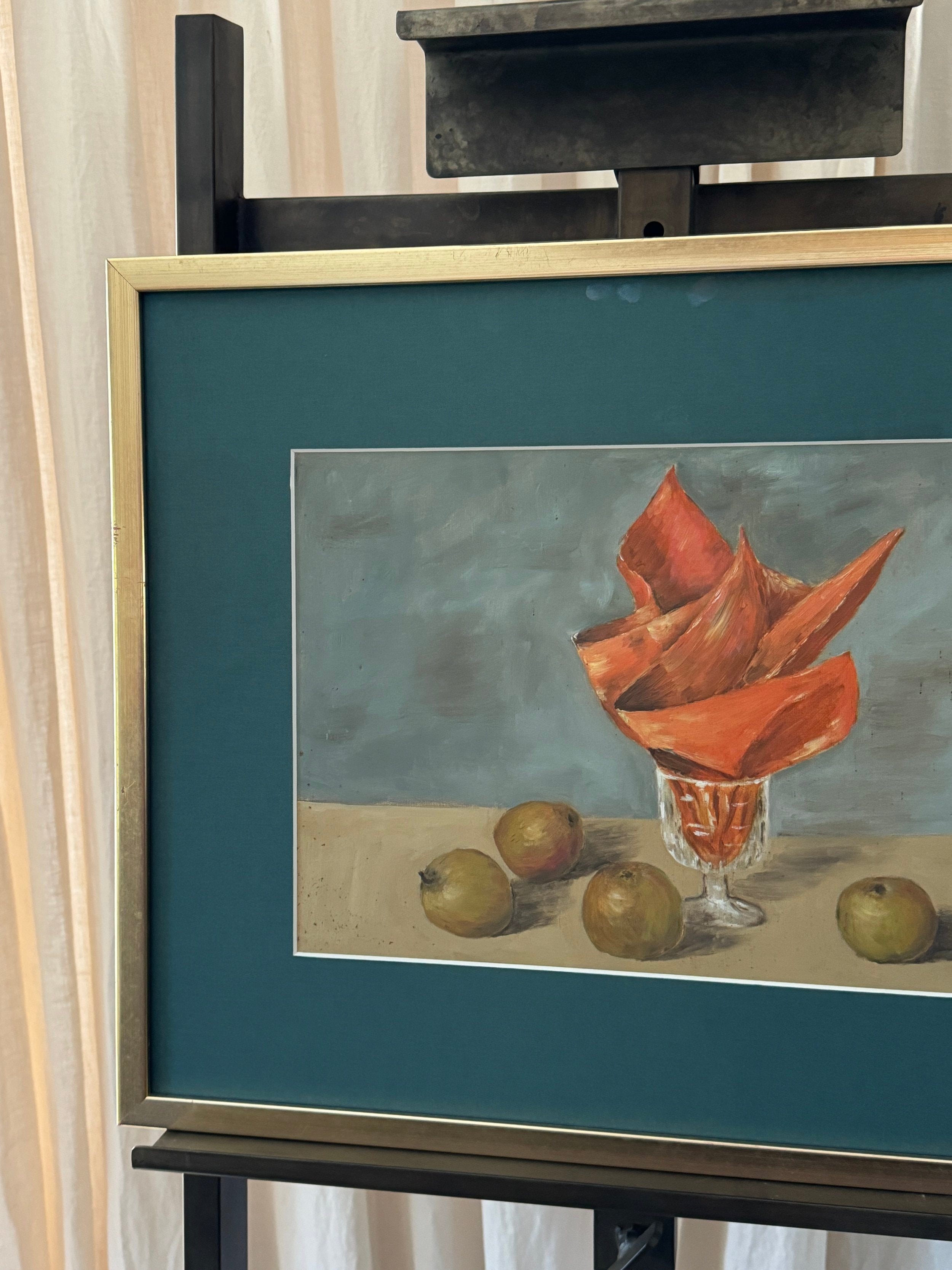 This French still life presents an intriguing balance between simplicity and boldness. And the colours! The crisp, angular folds of a vibrant orange napkin are dramatically poised in a glass, contrasting the softer, organic shapes of the apples scattered below. The composition feels modern in its abstraction, while the muted background enhances the vibrancy of the central elements without competing for attention. There's an elegance to how the light subtly highlights the textures—from the sheen of the glass to the matte finish of the fruit. It’s a study in contrasts, a playful arrangement that invites quiet contemplation of everyday objects presented in an unexpected way. It is an oil on board behind glass, with an updated blue linen mount and museum glass.