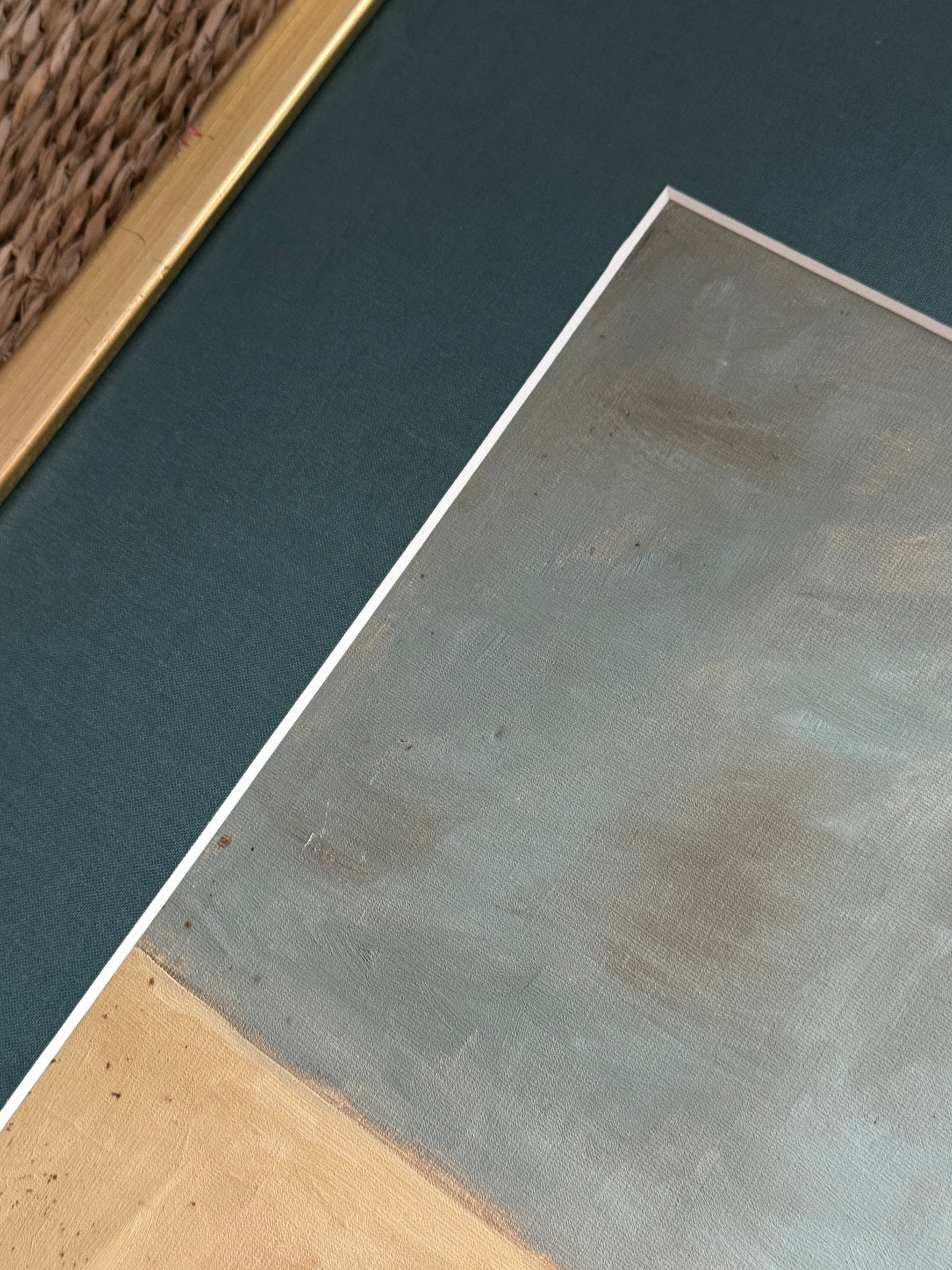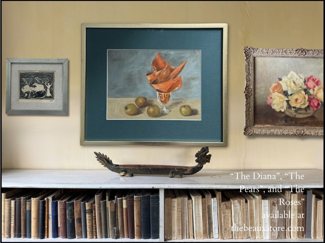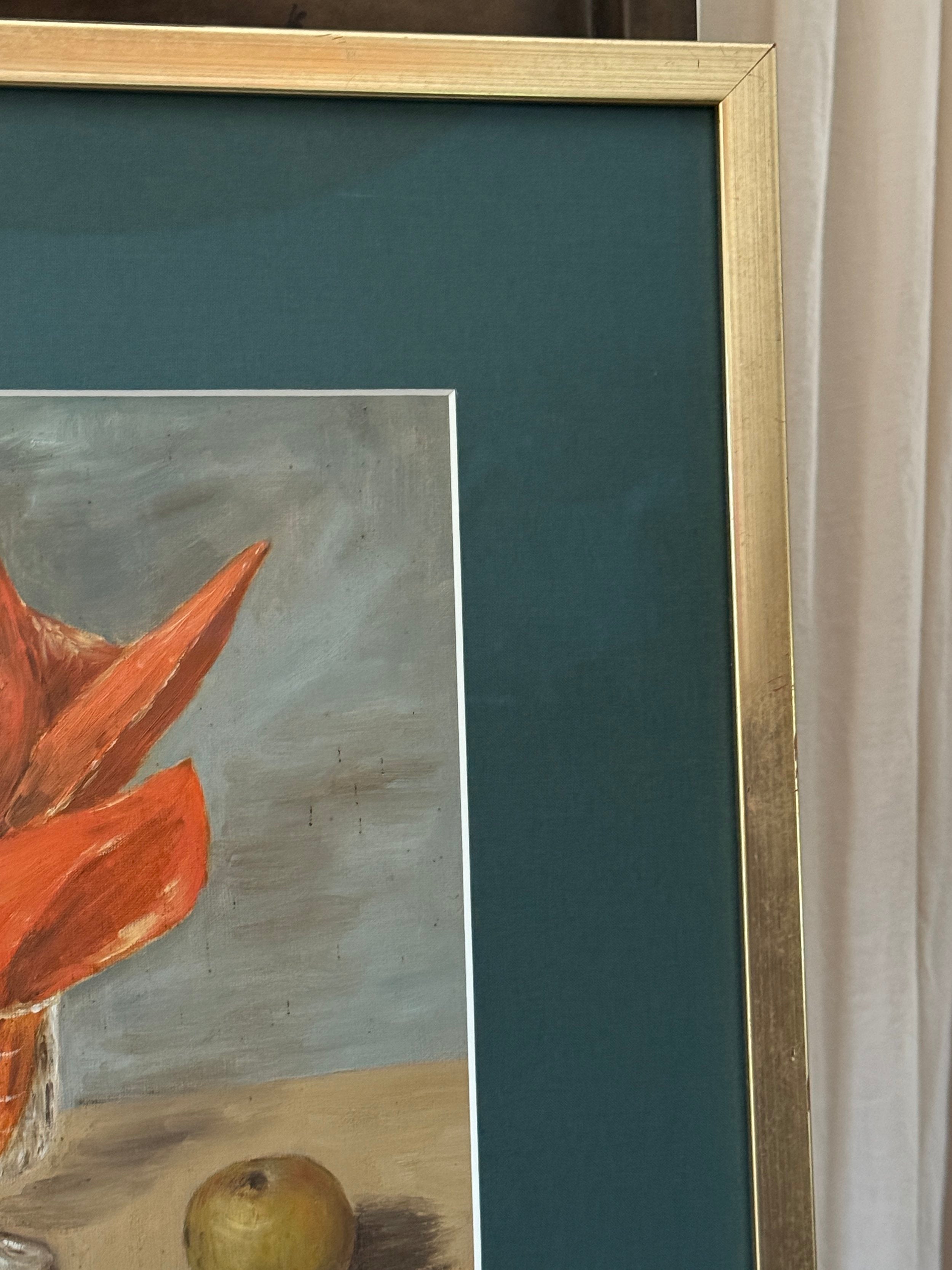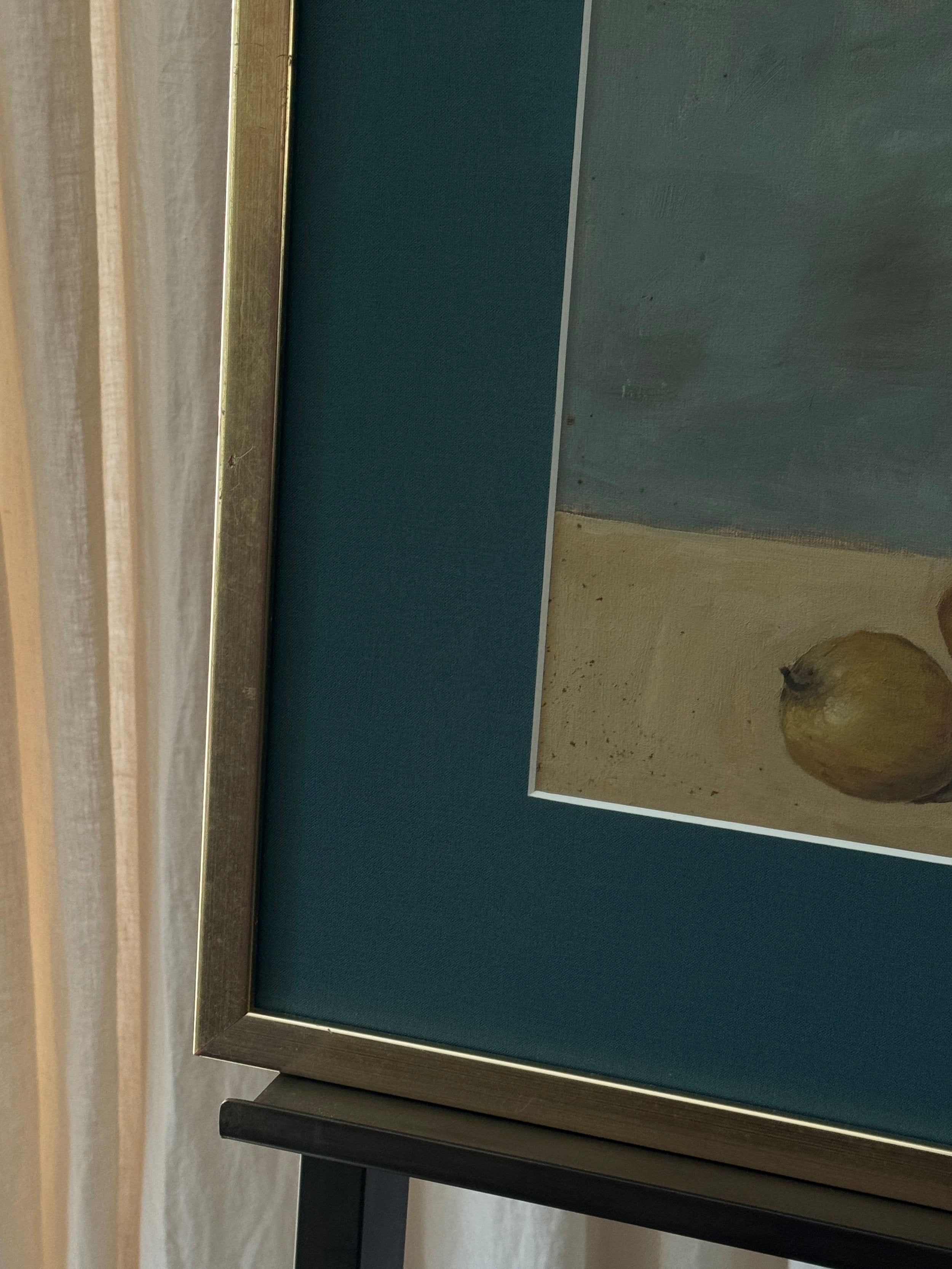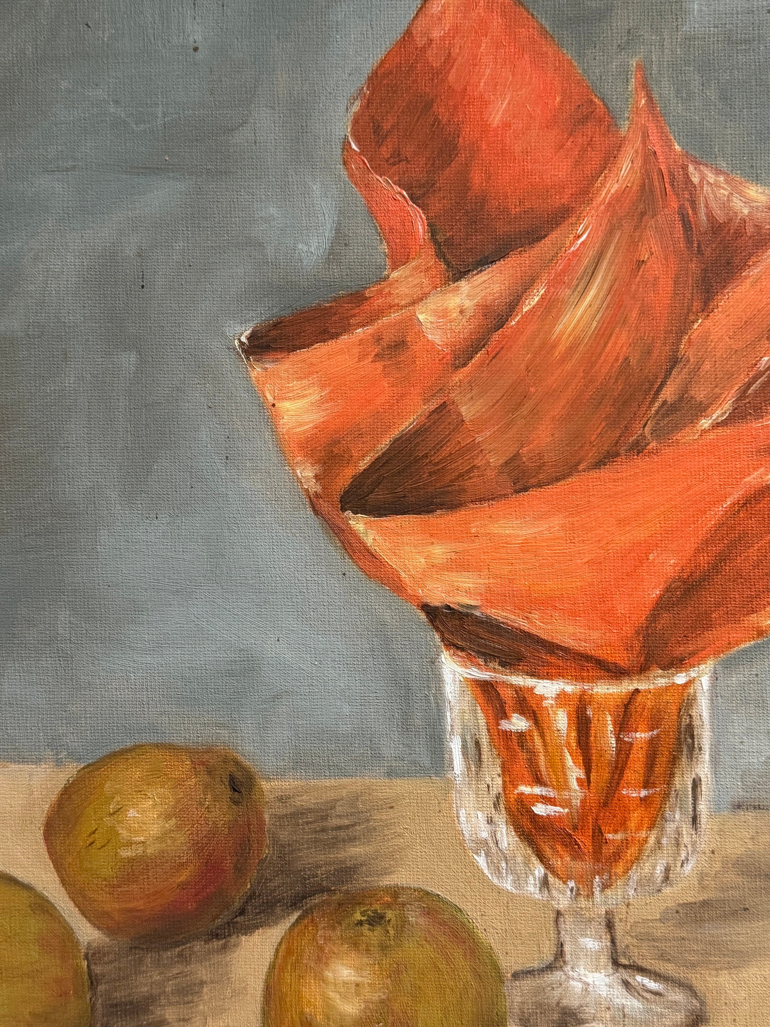 This French still life presents an intriguing balance between simplicity and boldness. And the colours! The crisp, angular folds of a vibrant orange napkin are dramatically poised in a glass, contrasting the softer, organic shapes of the apples scattered below. The composition feels modern in its abstraction, while the muted background enhances the vibrancy of the central elements without competing for attention. There's an elegance to how the light subtly highlights the textures—from the sheen of the glass to the matte finish of the fruit. It’s a study in contrasts, a playful arrangement that invites quiet contemplation of everyday objects presented in an unexpected way. It is an oil on board behind glass, with an updated blue linen mount and museum glass.