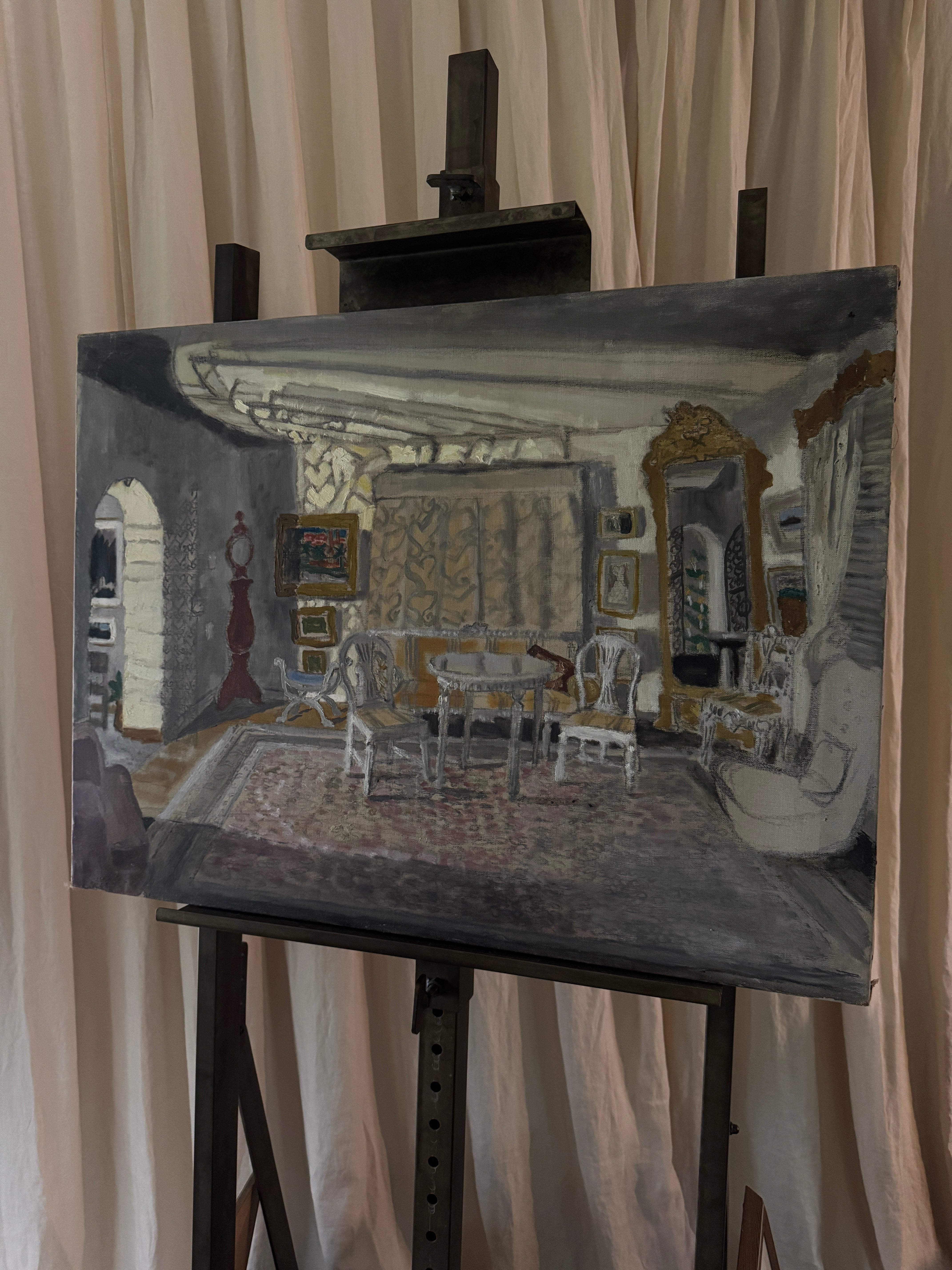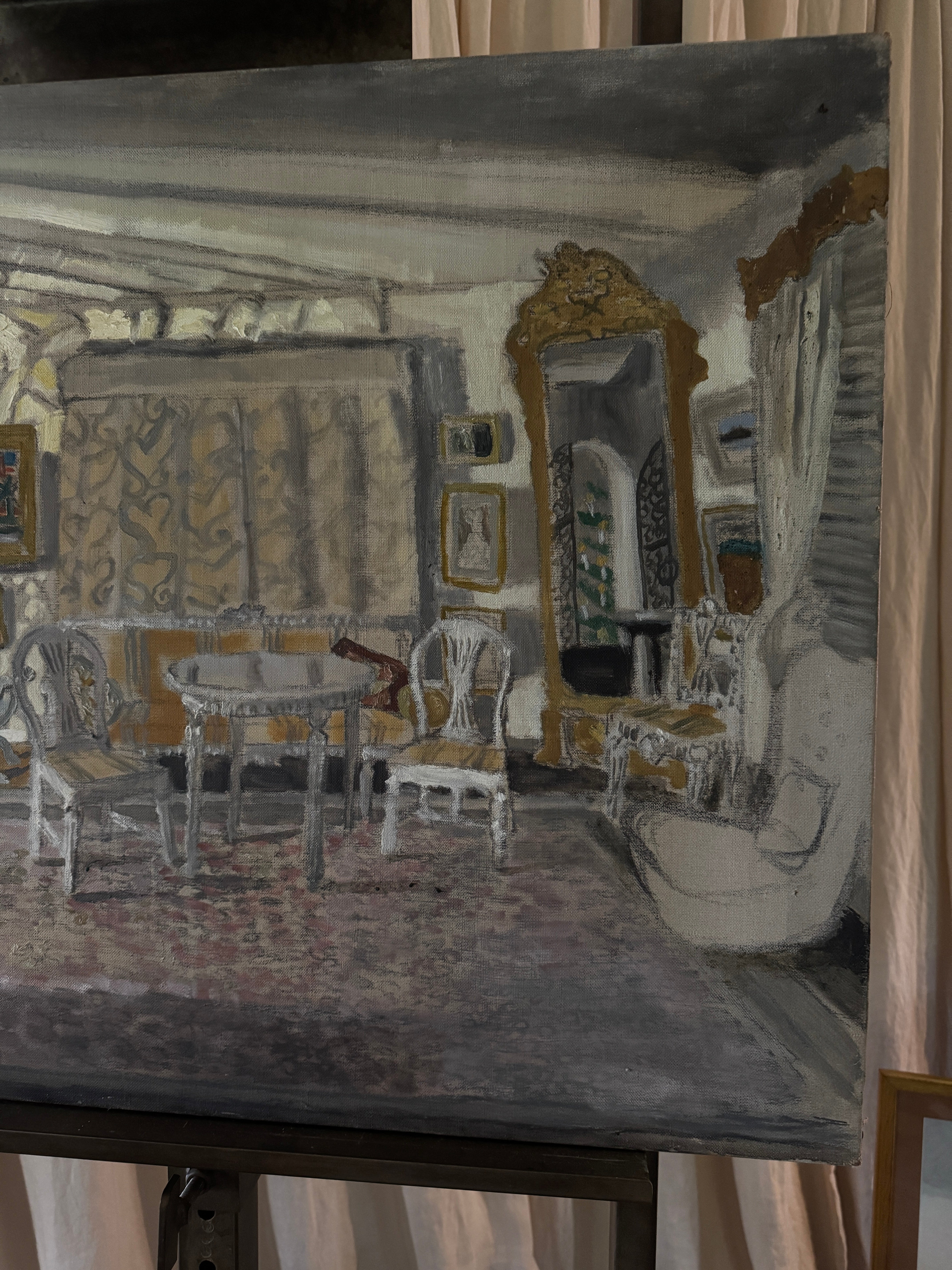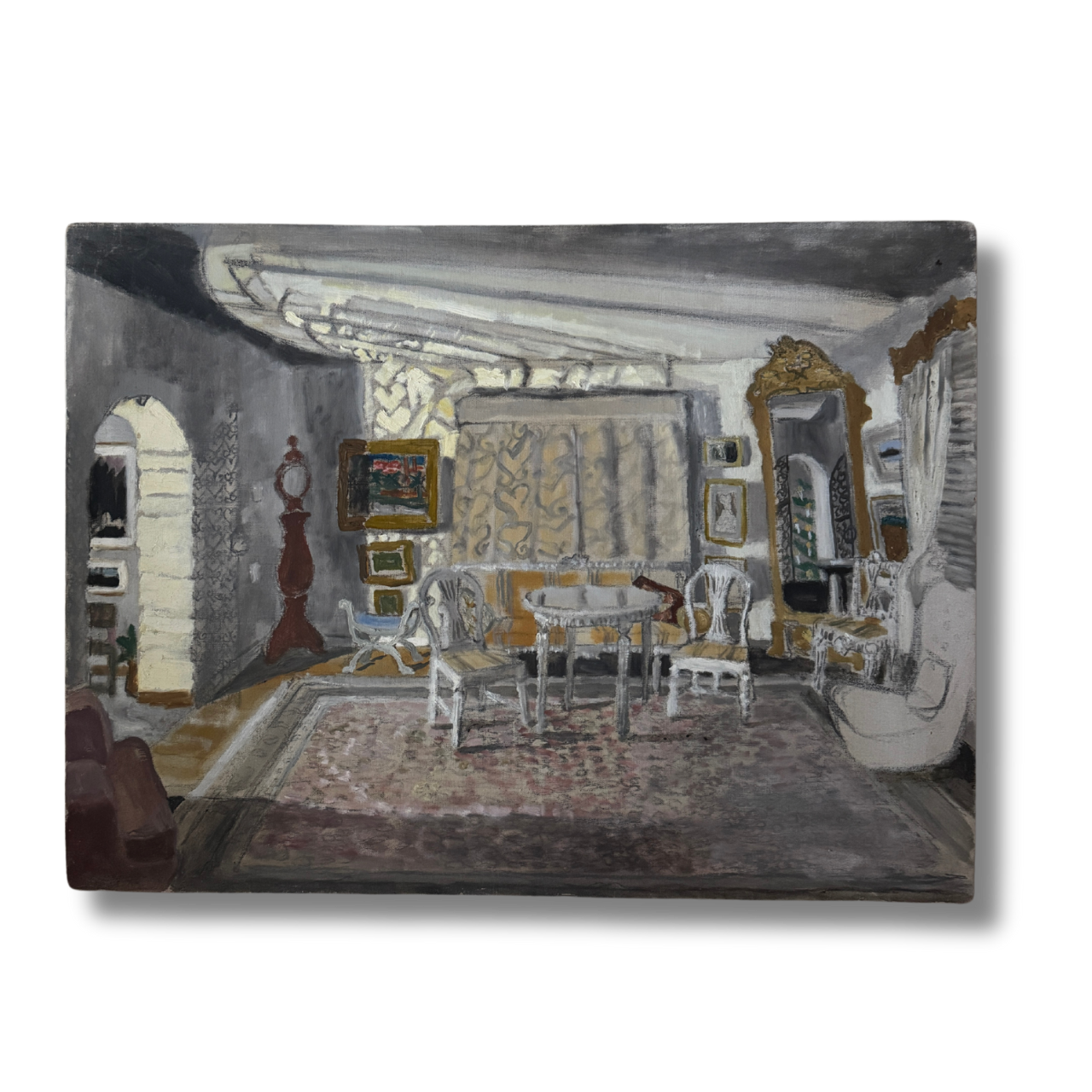 A stunning Gustavian interior, reminiscent of the early evening hours or after a lovely holiday soiree. This midcentury painting captures a richly decorated salon in all its eccentric glory: scalloped chairs, layered rugs, mirrored arches, and gilt frames arranged with a collector’s eye. There is a lit Christmas tree in the back right room, and the ceiling shadows are exquisite. The brushwork is fine and deliberate, allowing the artistry of the piece to shine. It comes unframed and it is a midcentury Swedish oil on canvas.
