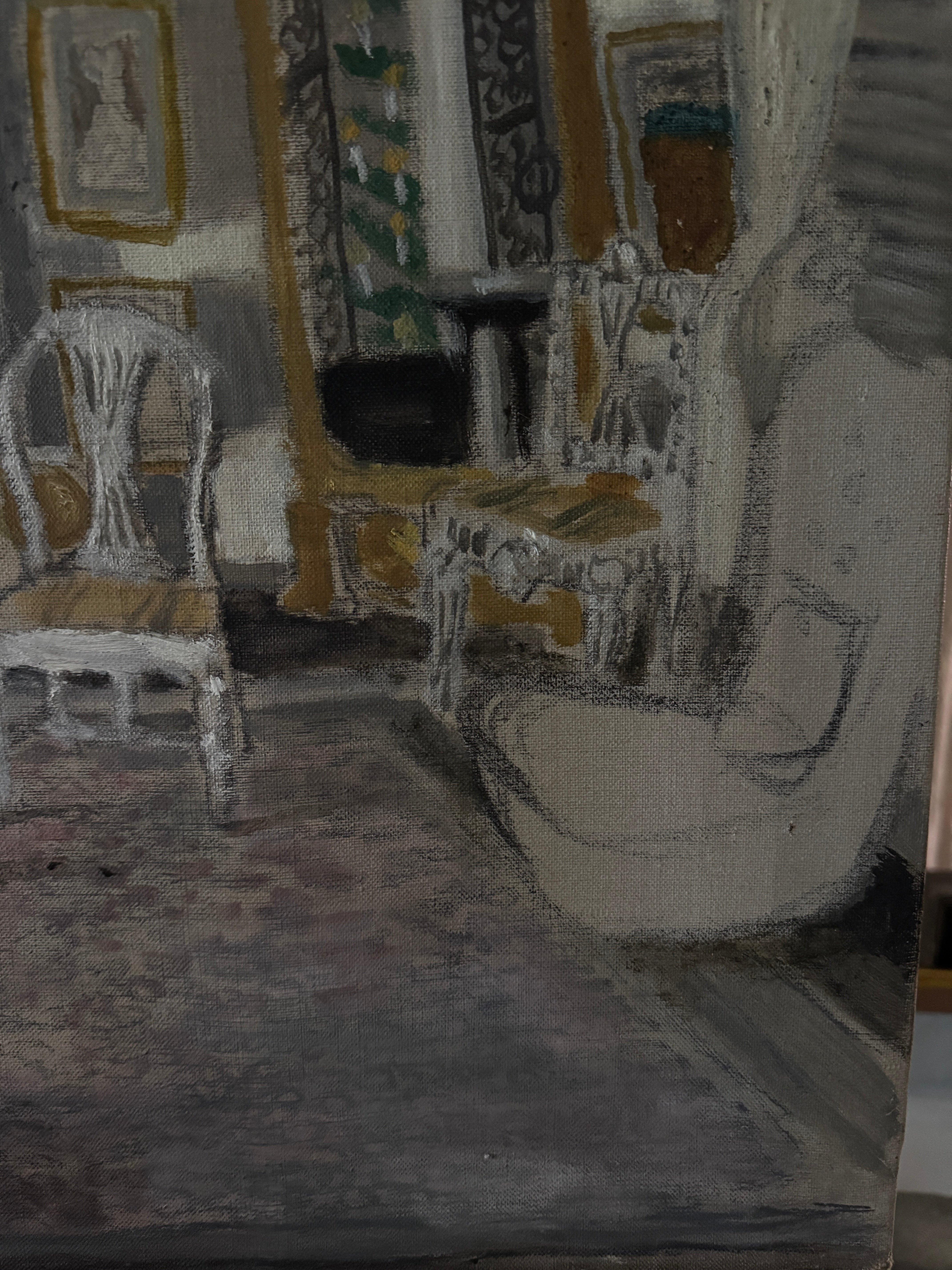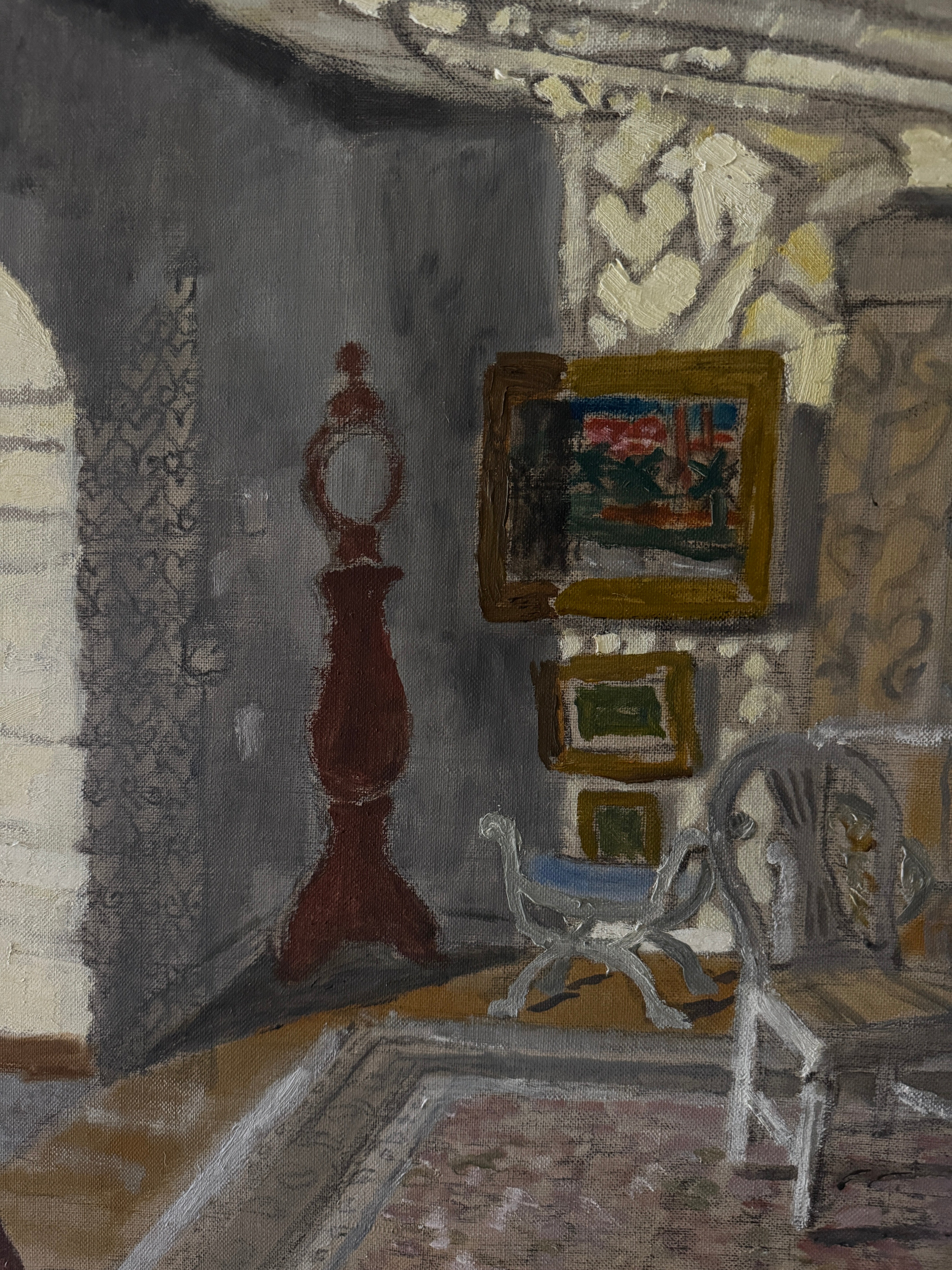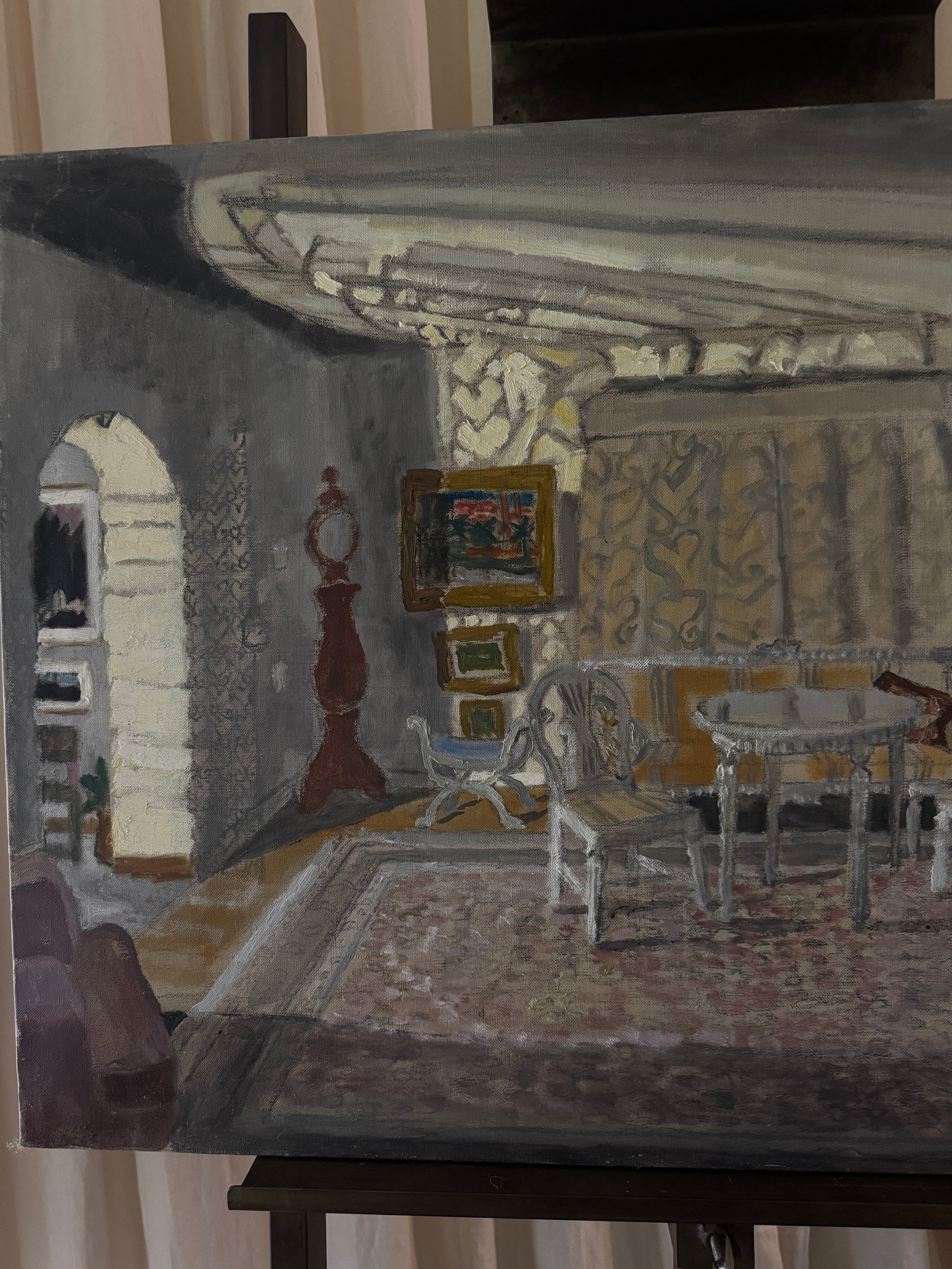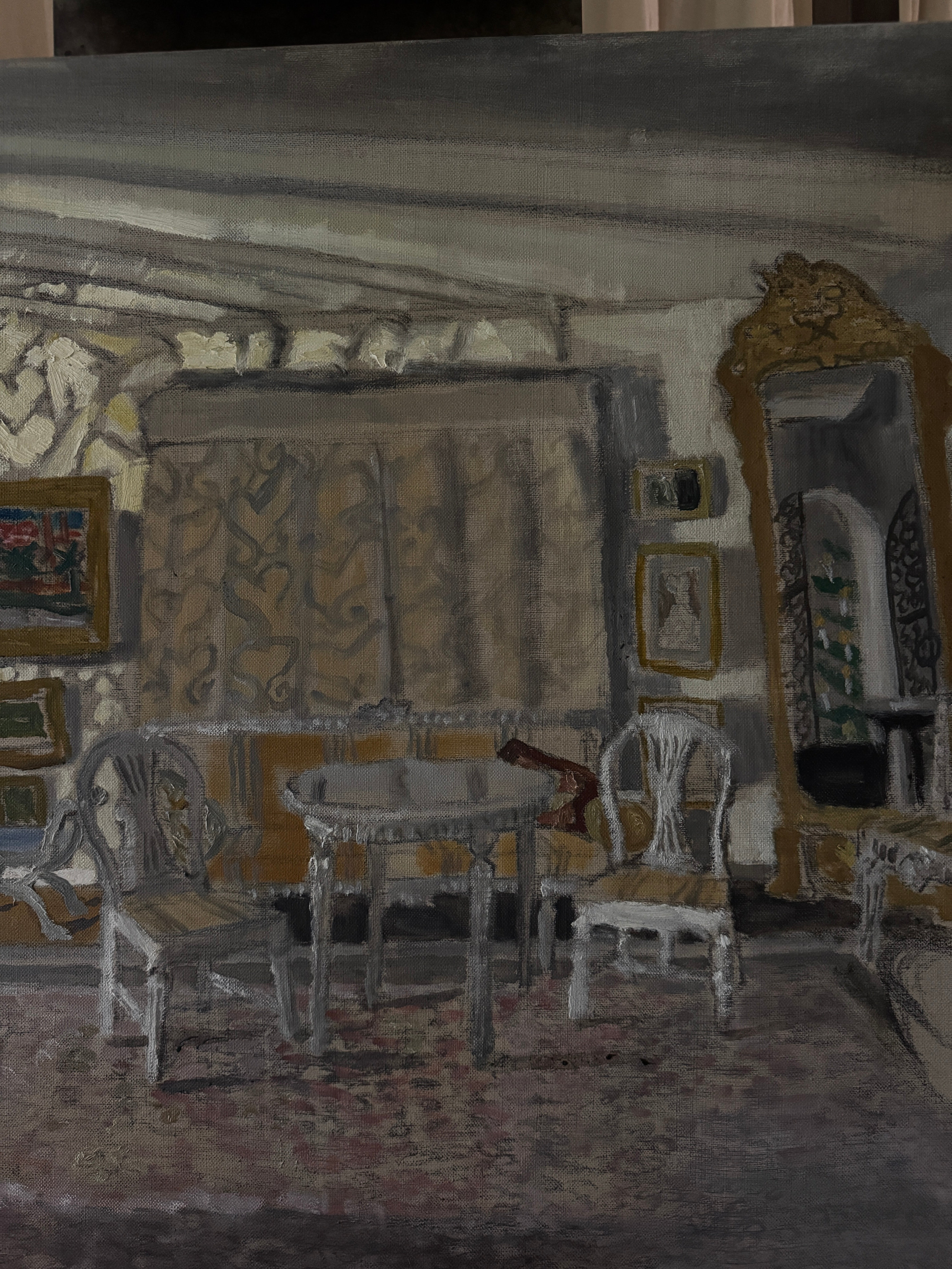 A stunning Gustavian interior, reminiscent of the early evening hours or after a lovely holiday soiree. This midcentury painting captures a richly decorated salon in all its eccentric glory: scalloped chairs, layered rugs, mirrored arches, and gilt frames arranged with a collector’s eye. There is a lit Christmas tree in the back right room, and the ceiling shadows are exquisite. The brushwork is fine and deliberate, allowing the artistry of the piece to shine. It comes unframed and it is a midcentury Swedish oil on canvas.