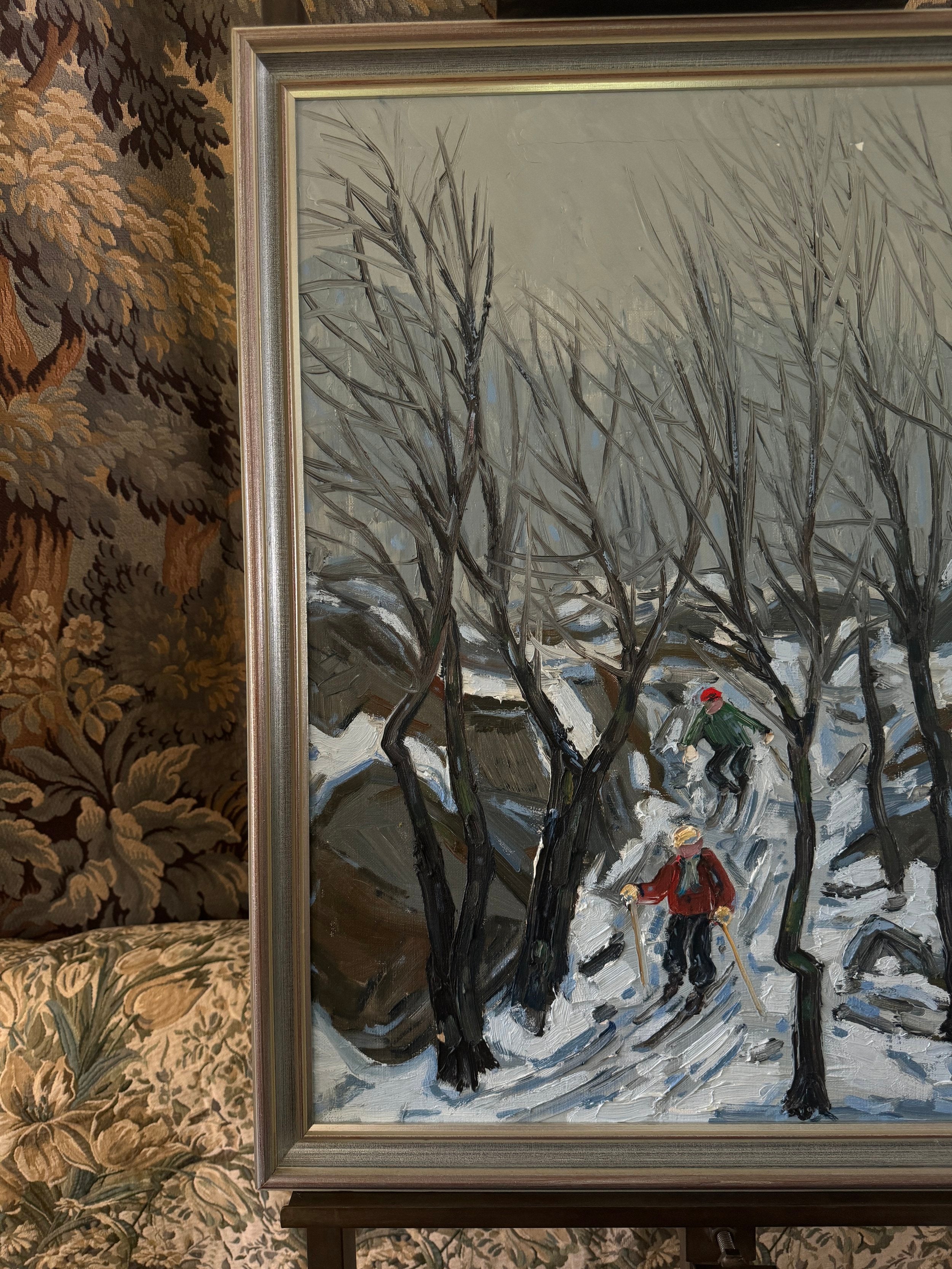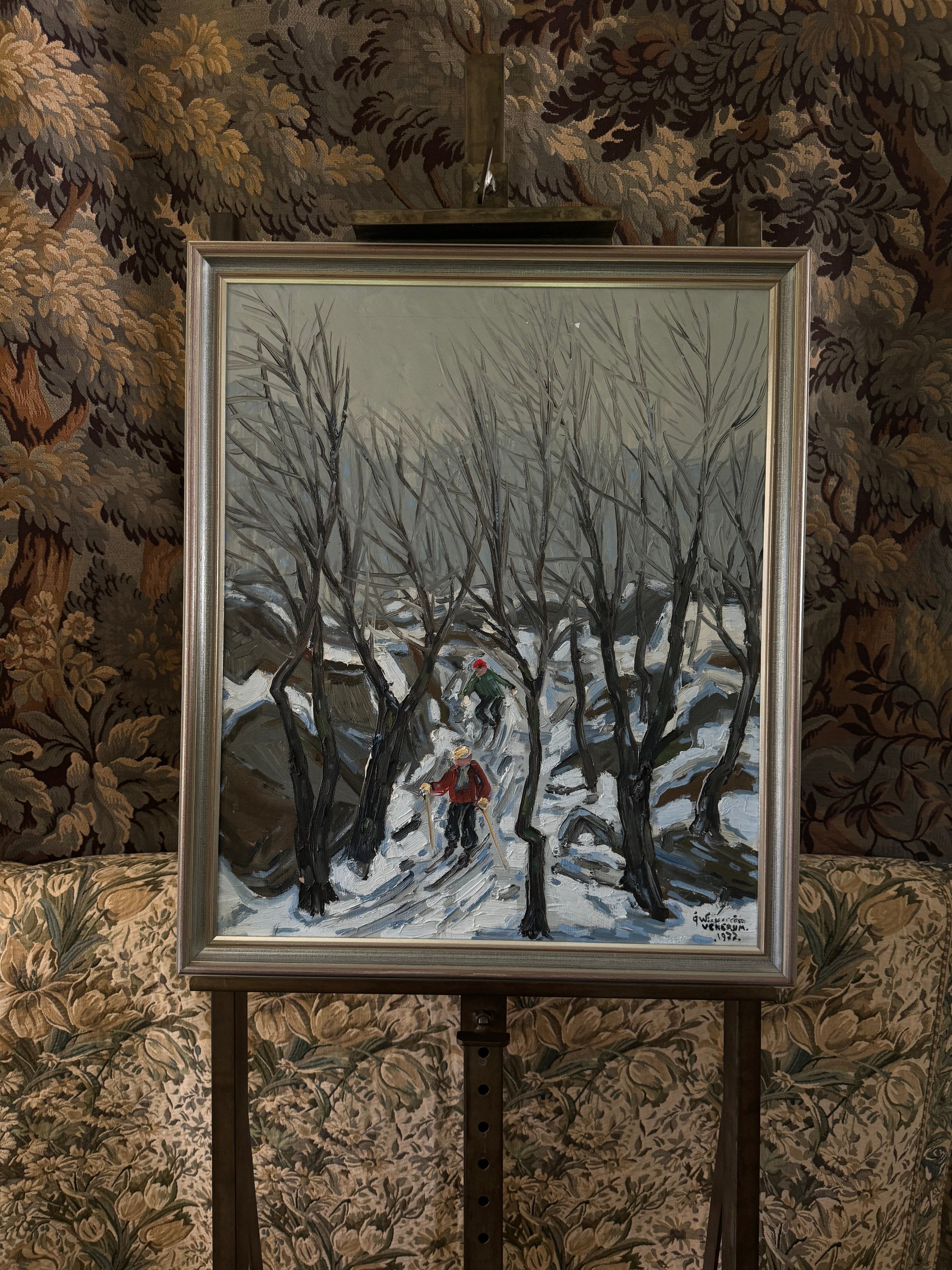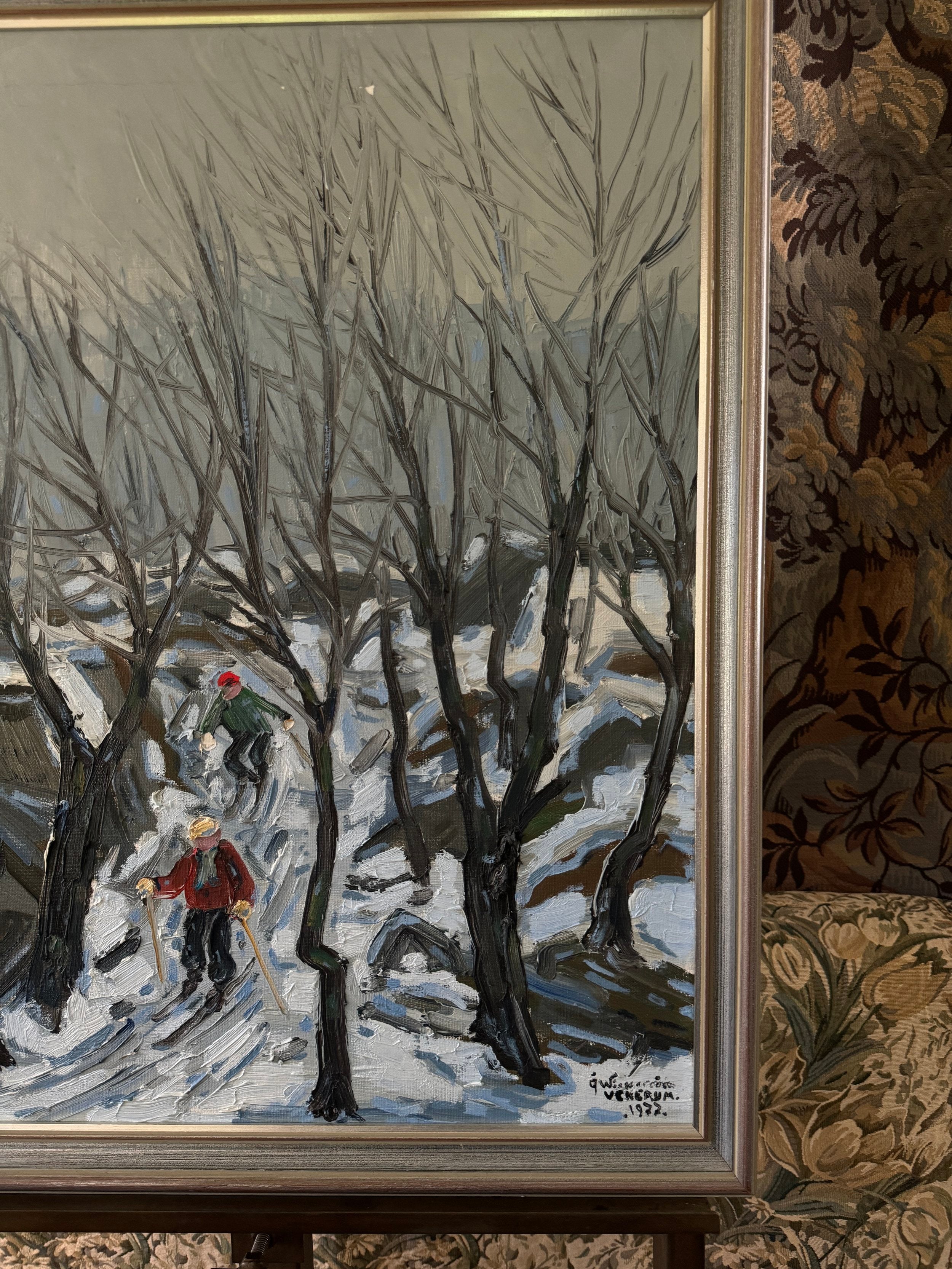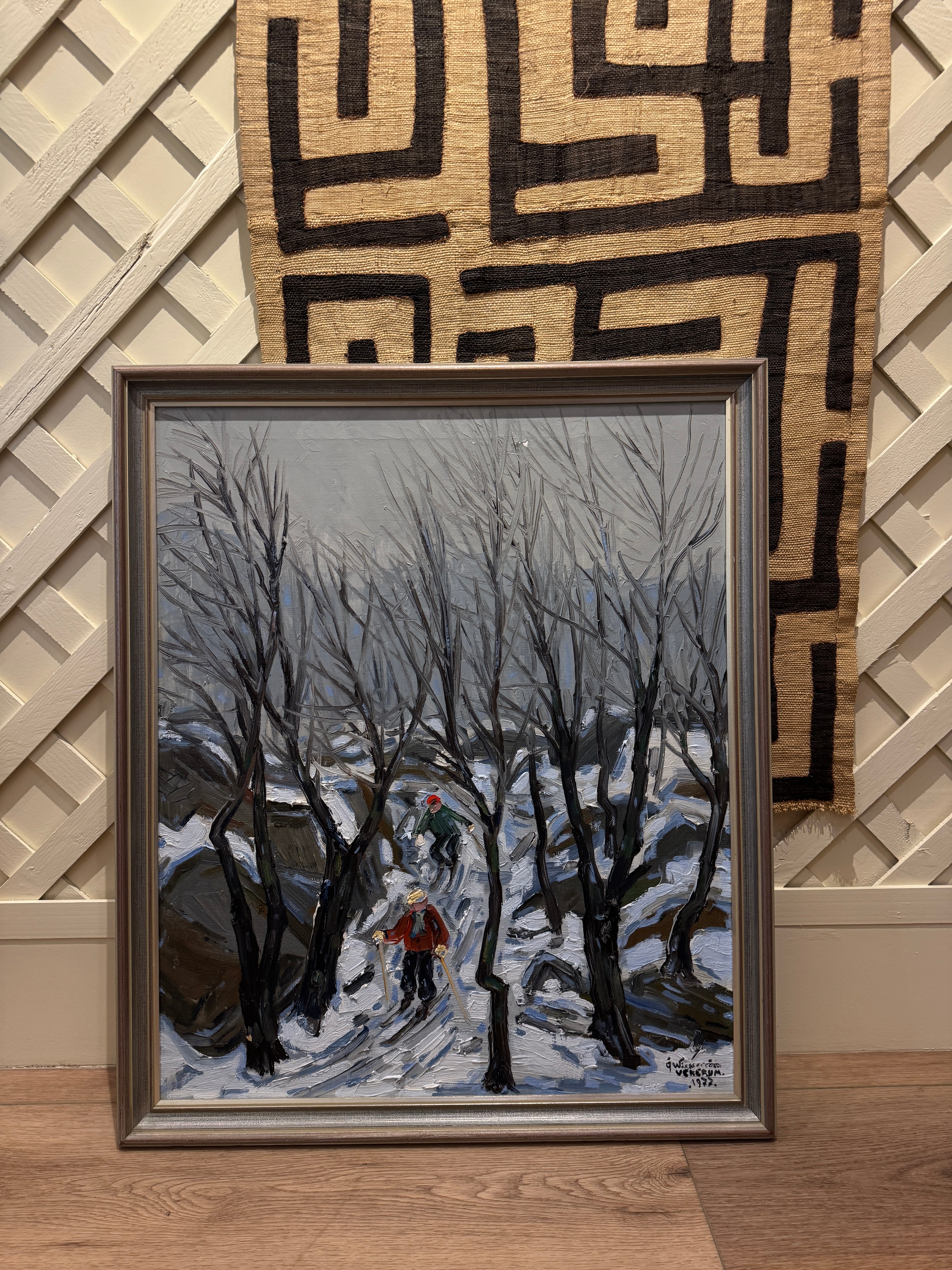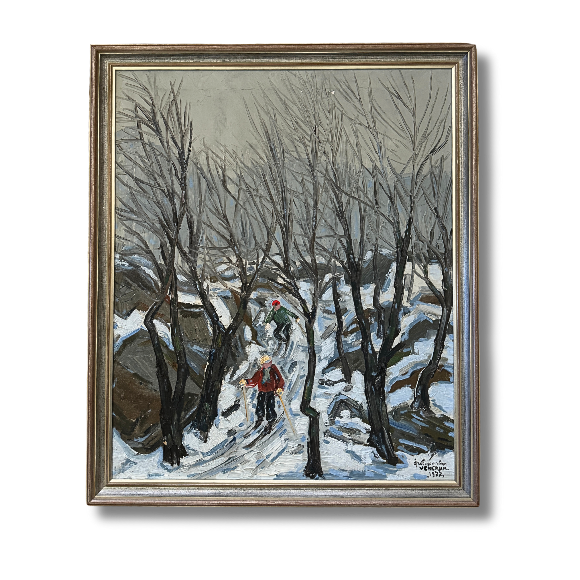 This dynamic Swedish winter scene from 1977 captures two figures skiing through a forest path, framed by the stark, leafless trees of a Scandinavian woodland. The artist employs bold, expressive lines and a muted color palette, dominated by greys and whites, to convey the cold, crisp atmosphere of a snowy day. The skiers, one dressed in a bright red jacket and the other in green, provide a pop of color and a sense of movement against the monochromatic background. The twisting path leads the viewer’s eye deeper into the painting, while the rhythmic, vertical brushstrokes of the trees create a sense of height and depth. The composition exudes a playful yet serene energy, capturing the joy and stillness of a winter outing in nature. Surrounded by the original frame and there is wear that commiserates with age on this piece.