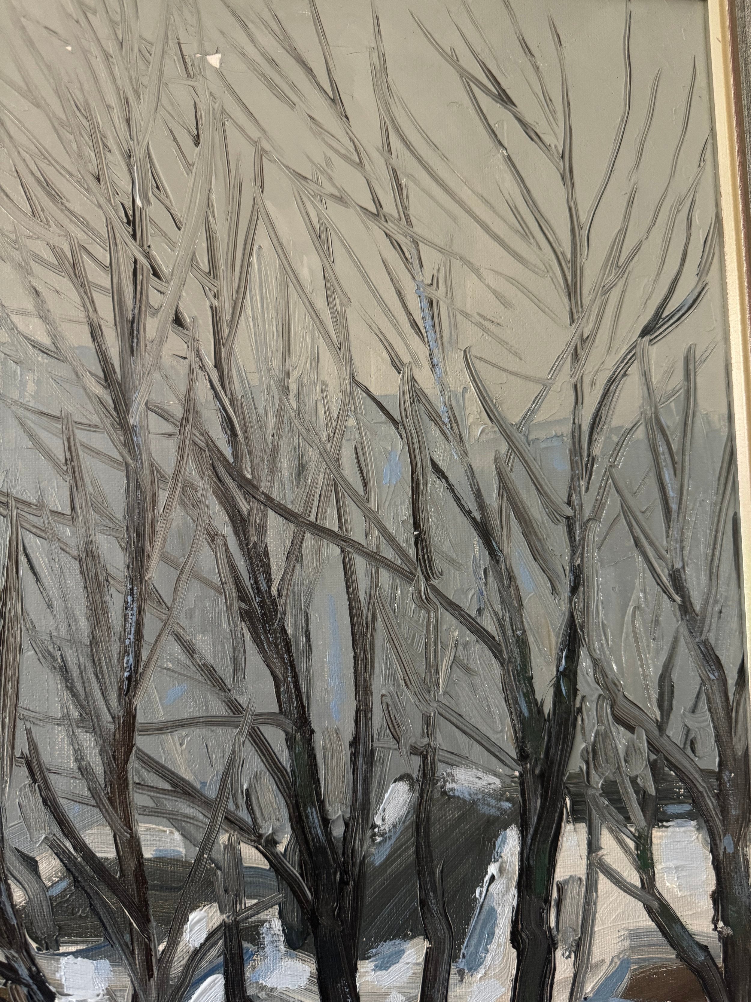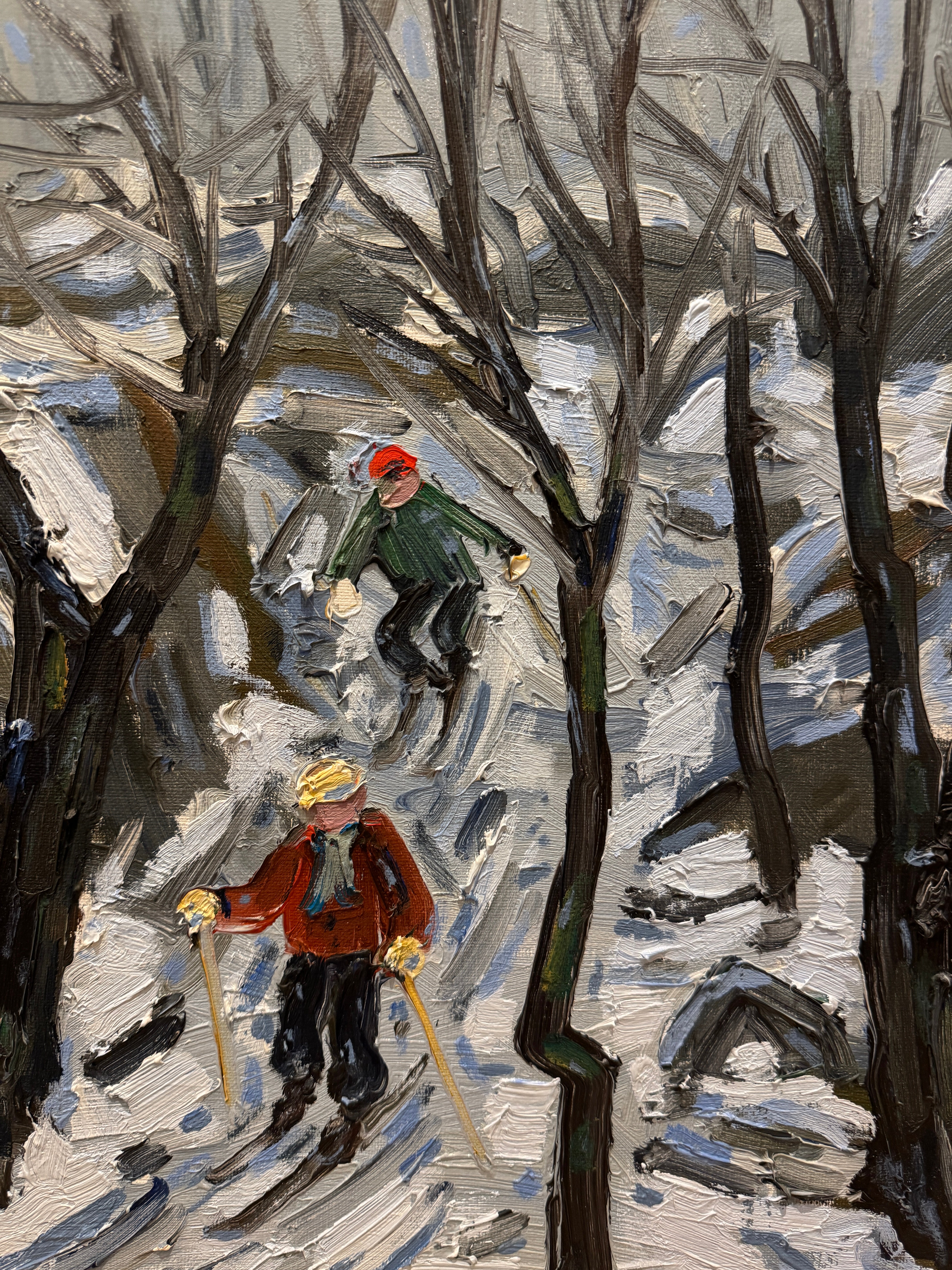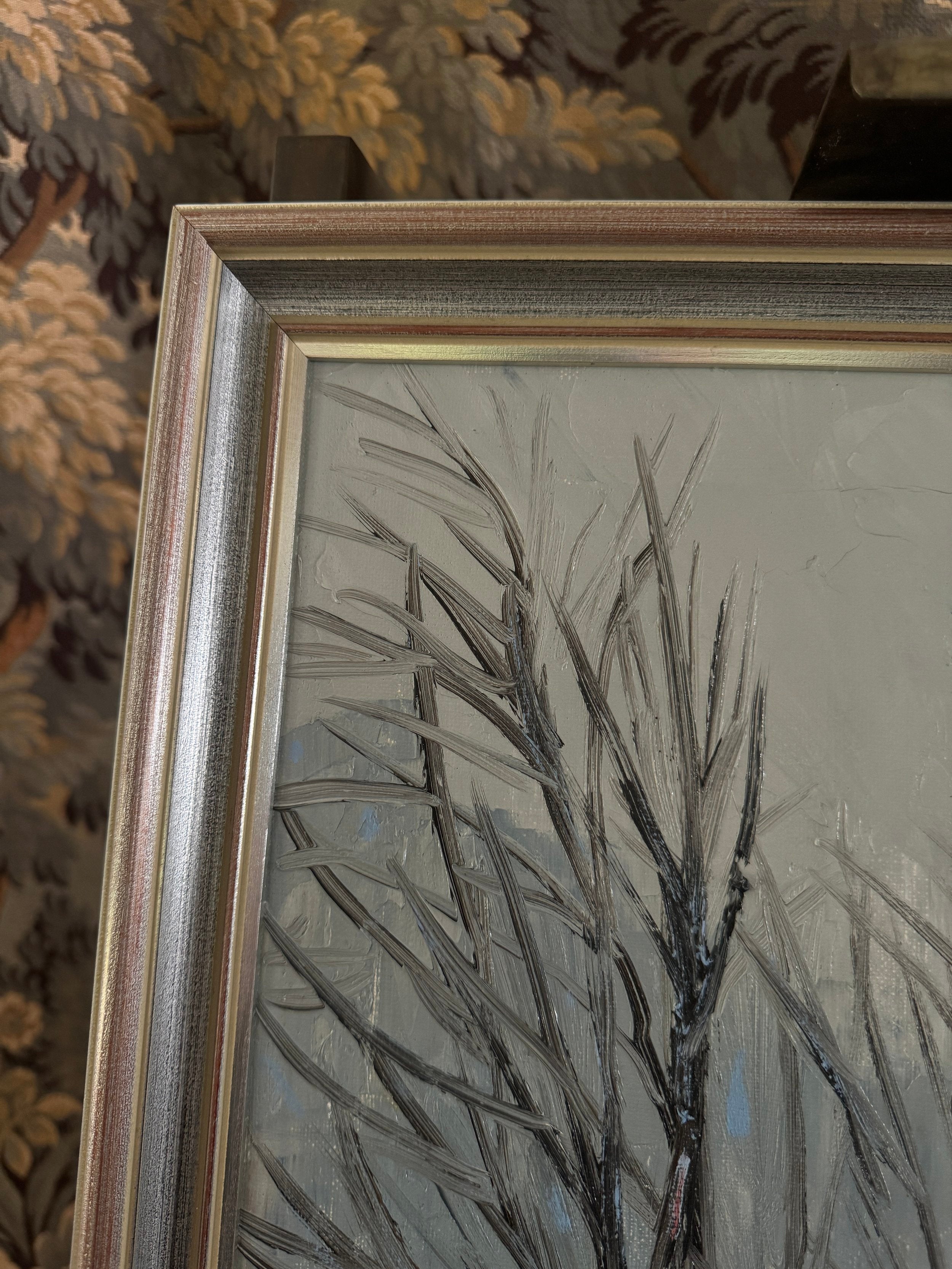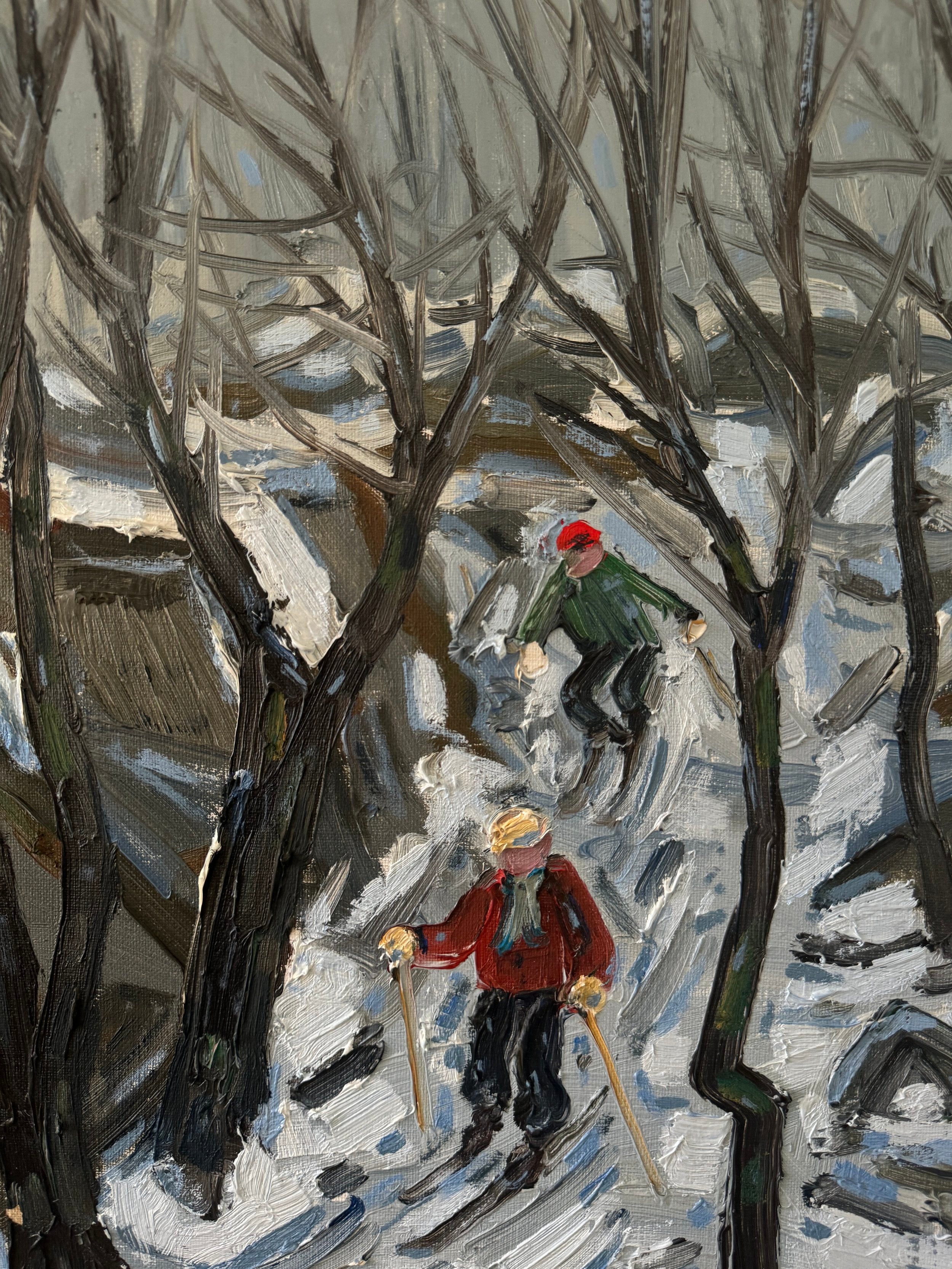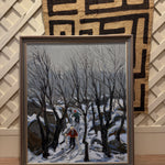 This dynamic Swedish winter scene from 1977 captures two figures skiing through a forest path, framed by the stark, leafless trees of a Scandinavian woodland. The artist employs bold, expressive lines and a muted color palette, dominated by greys and whites, to convey the cold, crisp atmosphere of a snowy day. The skiers, one dressed in a bright red jacket and the other in green, provide a pop of color and a sense of movement against the monochromatic background. The twisting path leads the viewer’s eye deeper into the painting, while the rhythmic, vertical brushstrokes of the trees create a sense of height and depth. The composition exudes a playful yet serene energy, capturing the joy and stillness of a winter outing in nature. Surrounded by the original frame and there is wear that commiserates with age on this piece.