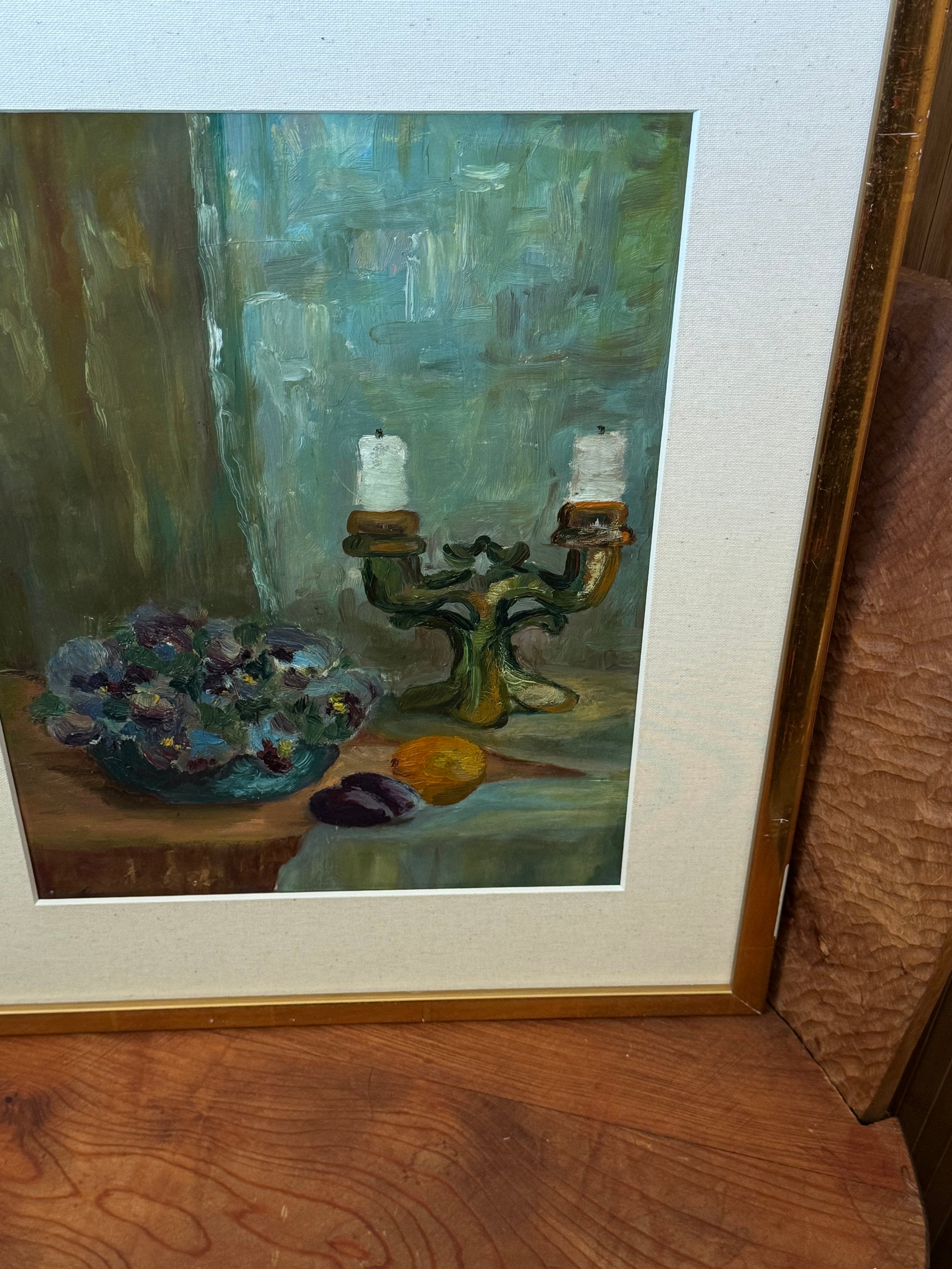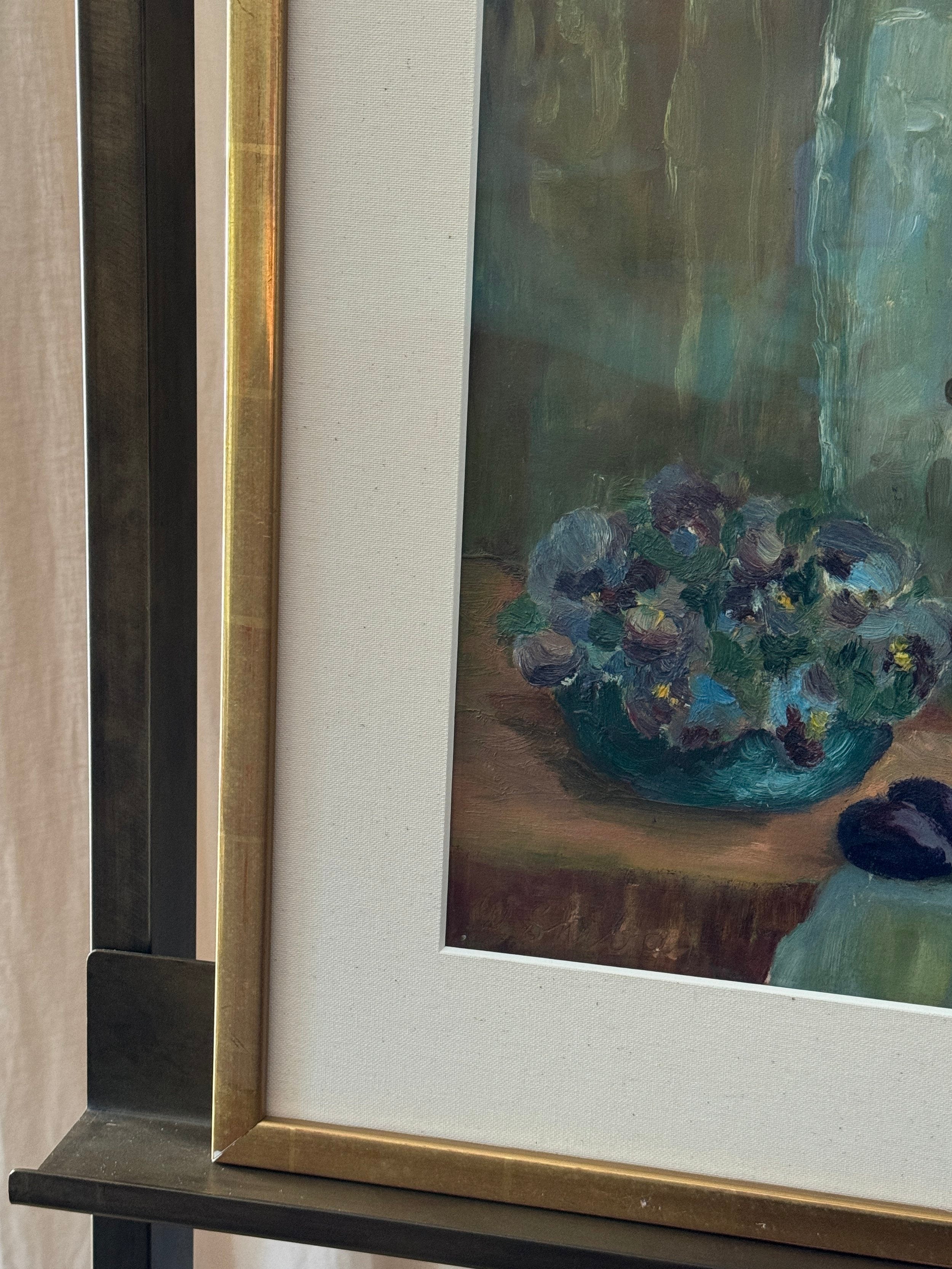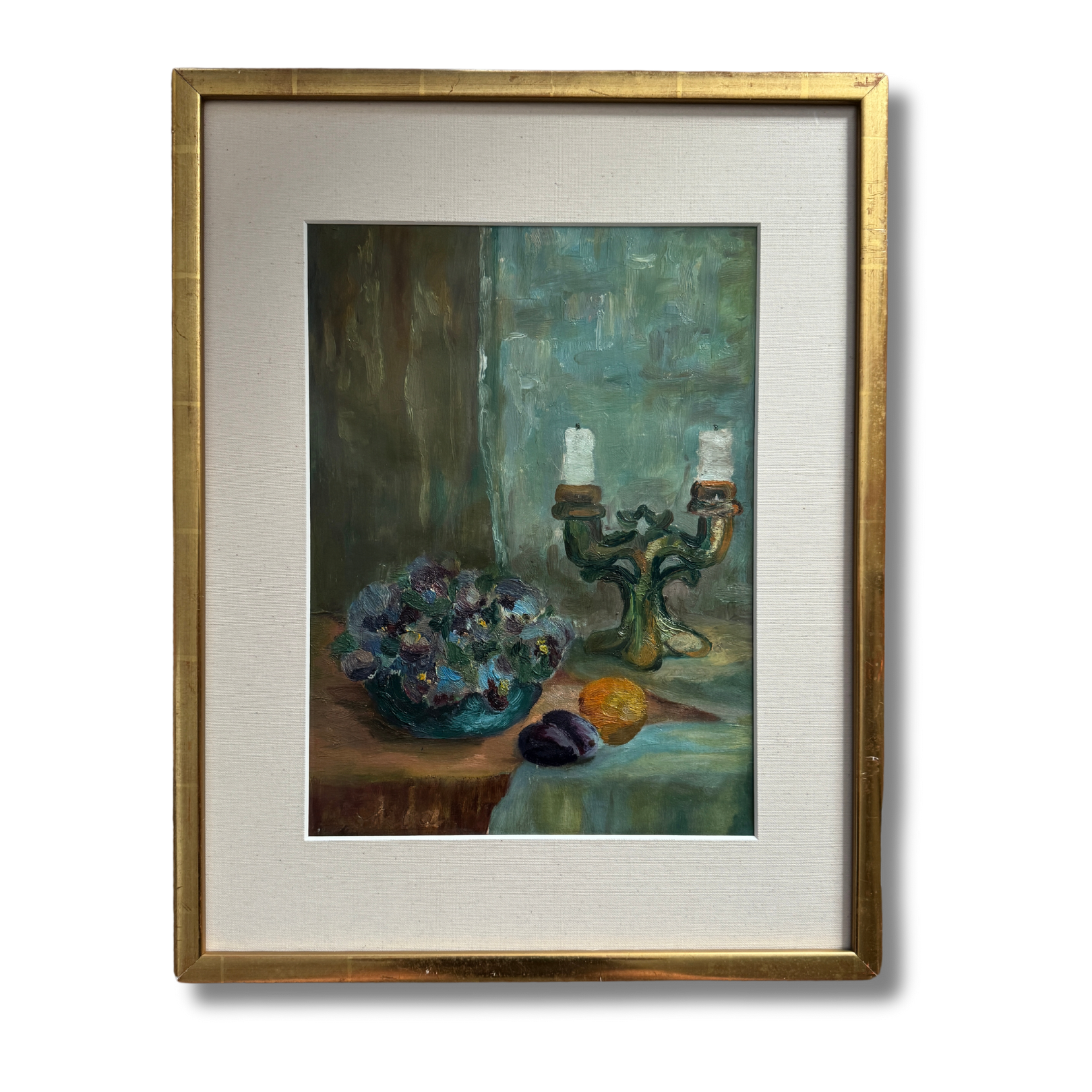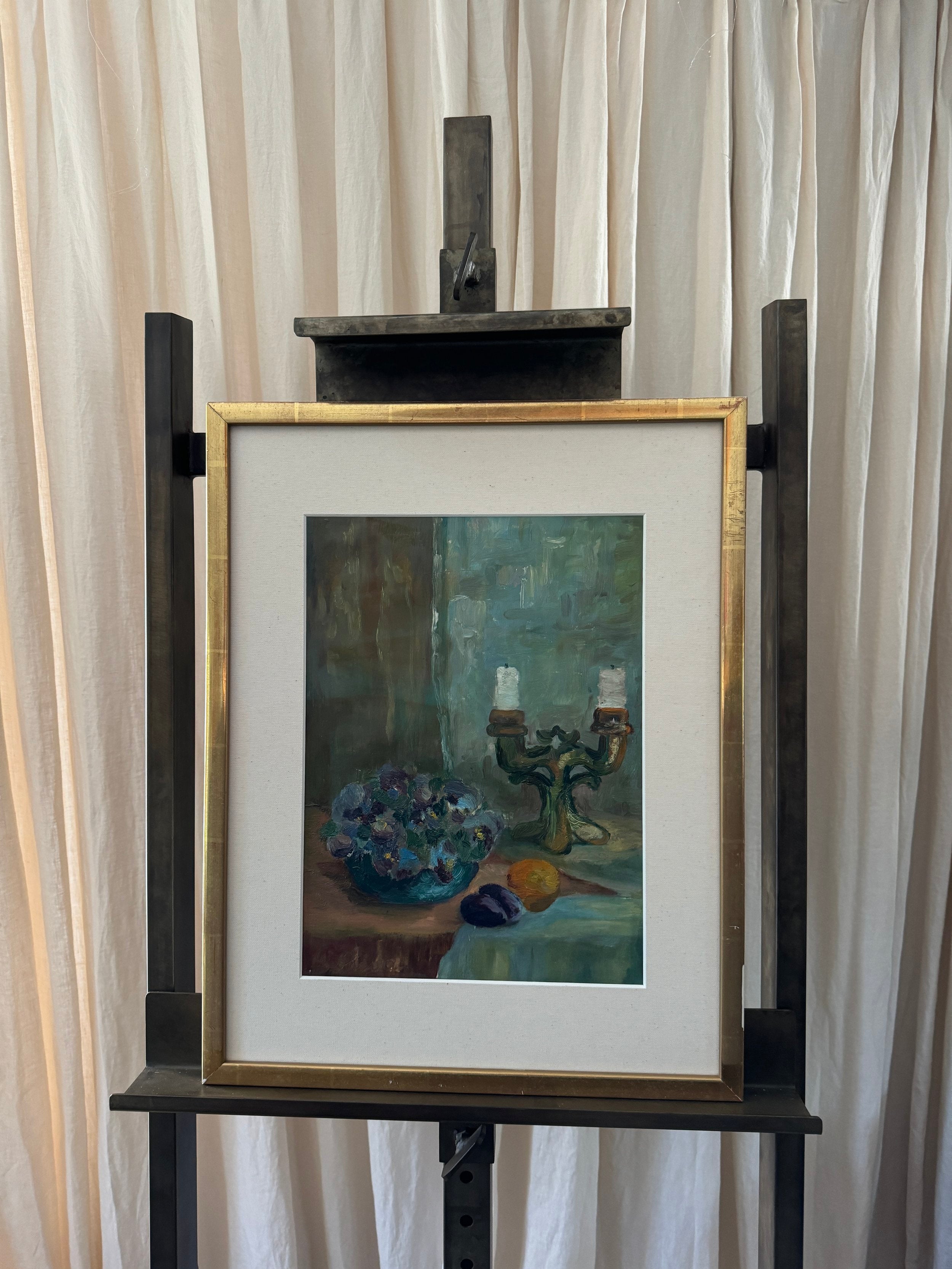 In this still life, signed by the artist and sourced in London, the artist draws the viewer into a quiet, intimate moment of everyday elegance. The candelabra stands tall, its muted bronze complementing the soft teal backdrop, while a bowl of violets adds a touch of lushness and life to the scene. The careful placement of fruit—a single plum and an orange—grounds the composition with their deep, rich tones. It’s as if the objects have been gathered not for their grandeur but for their subtle, timeless beauty, offering a quiet respite from the world beyond. Updated with a fresh linen mount and museum glass.