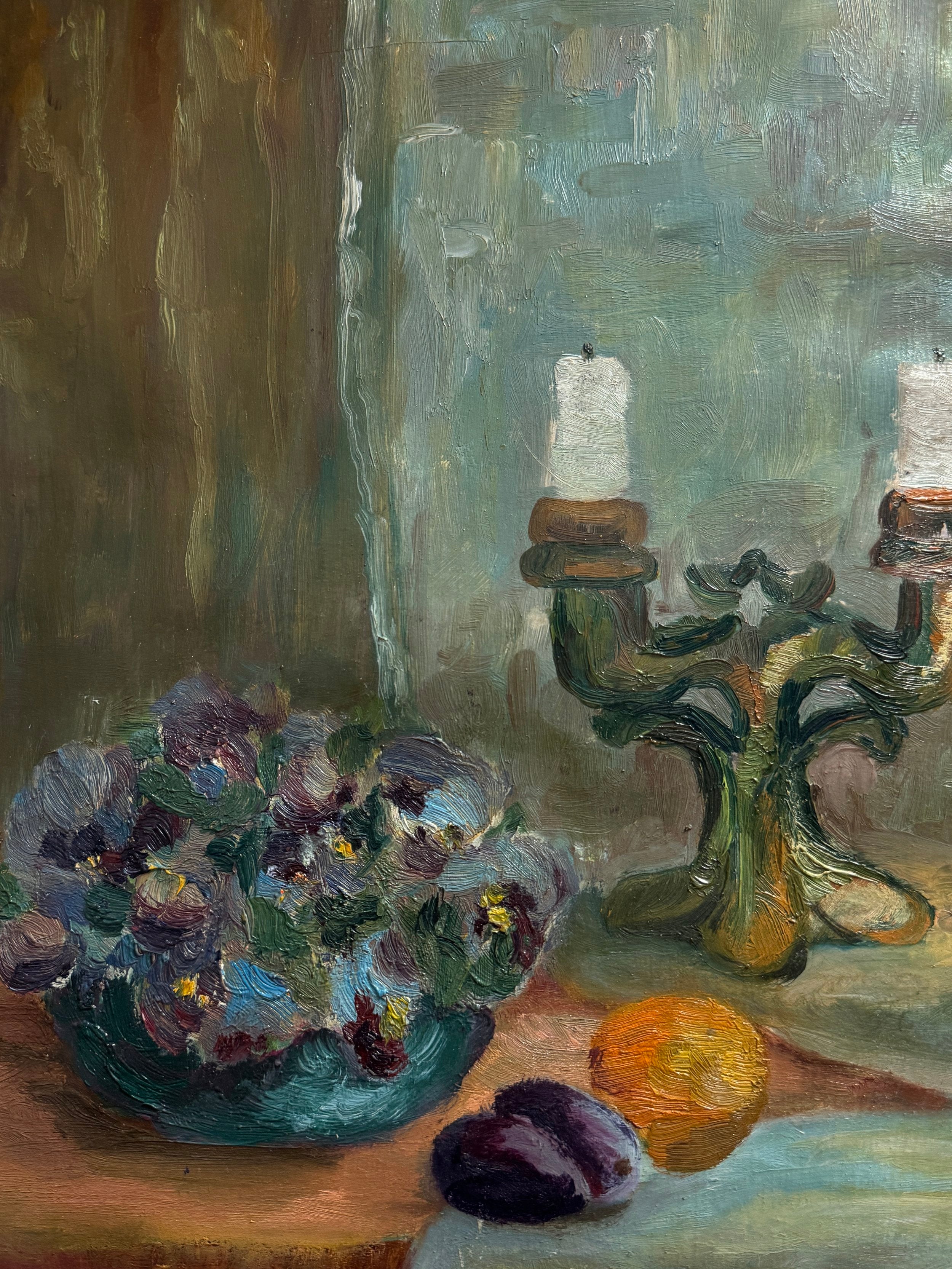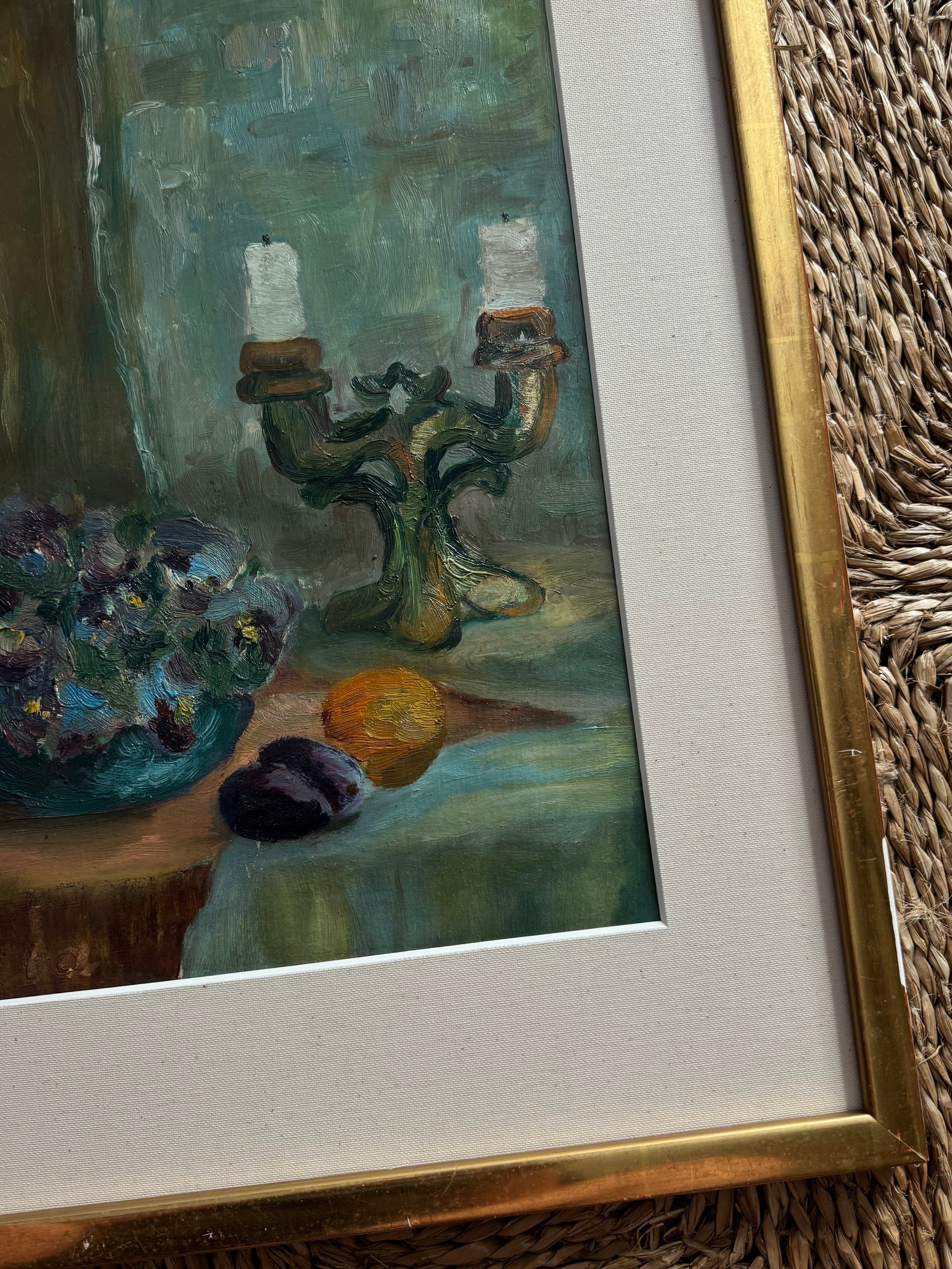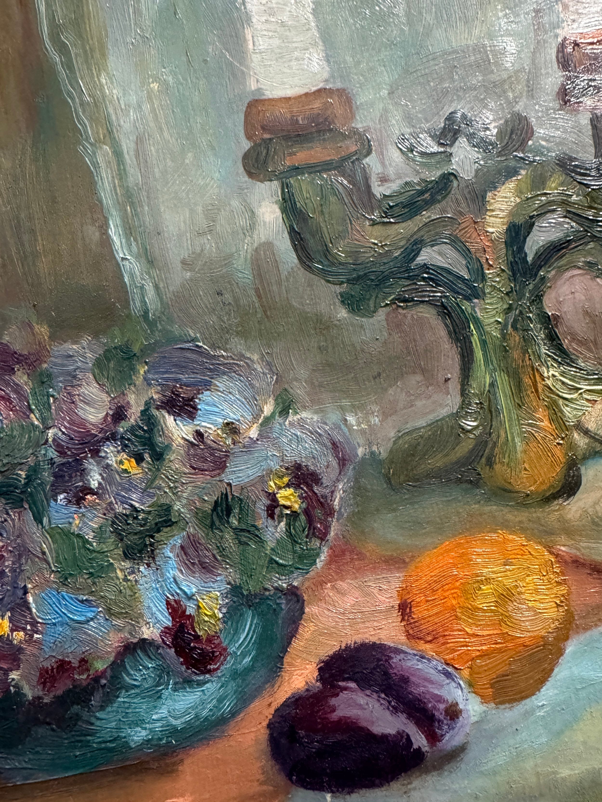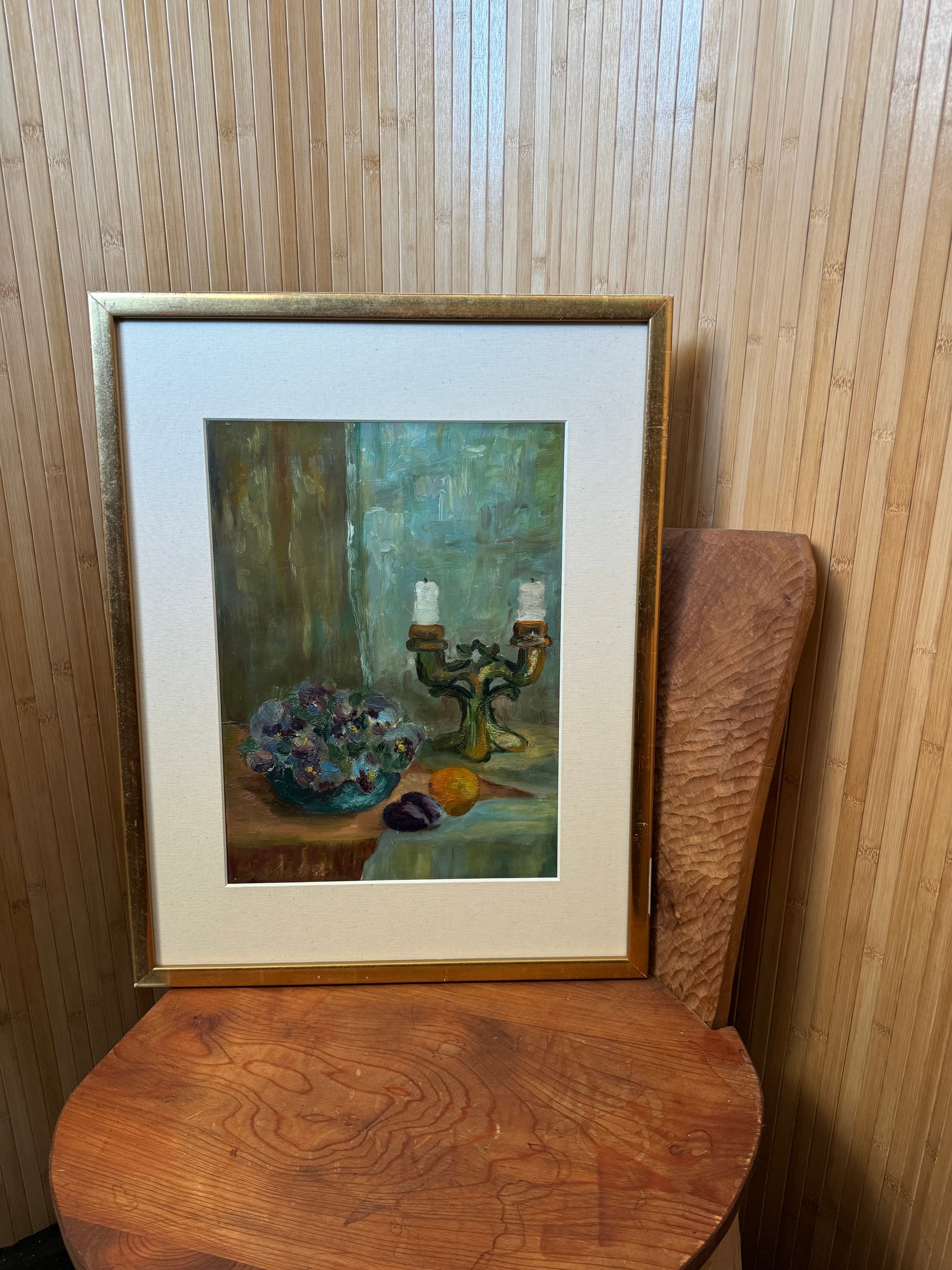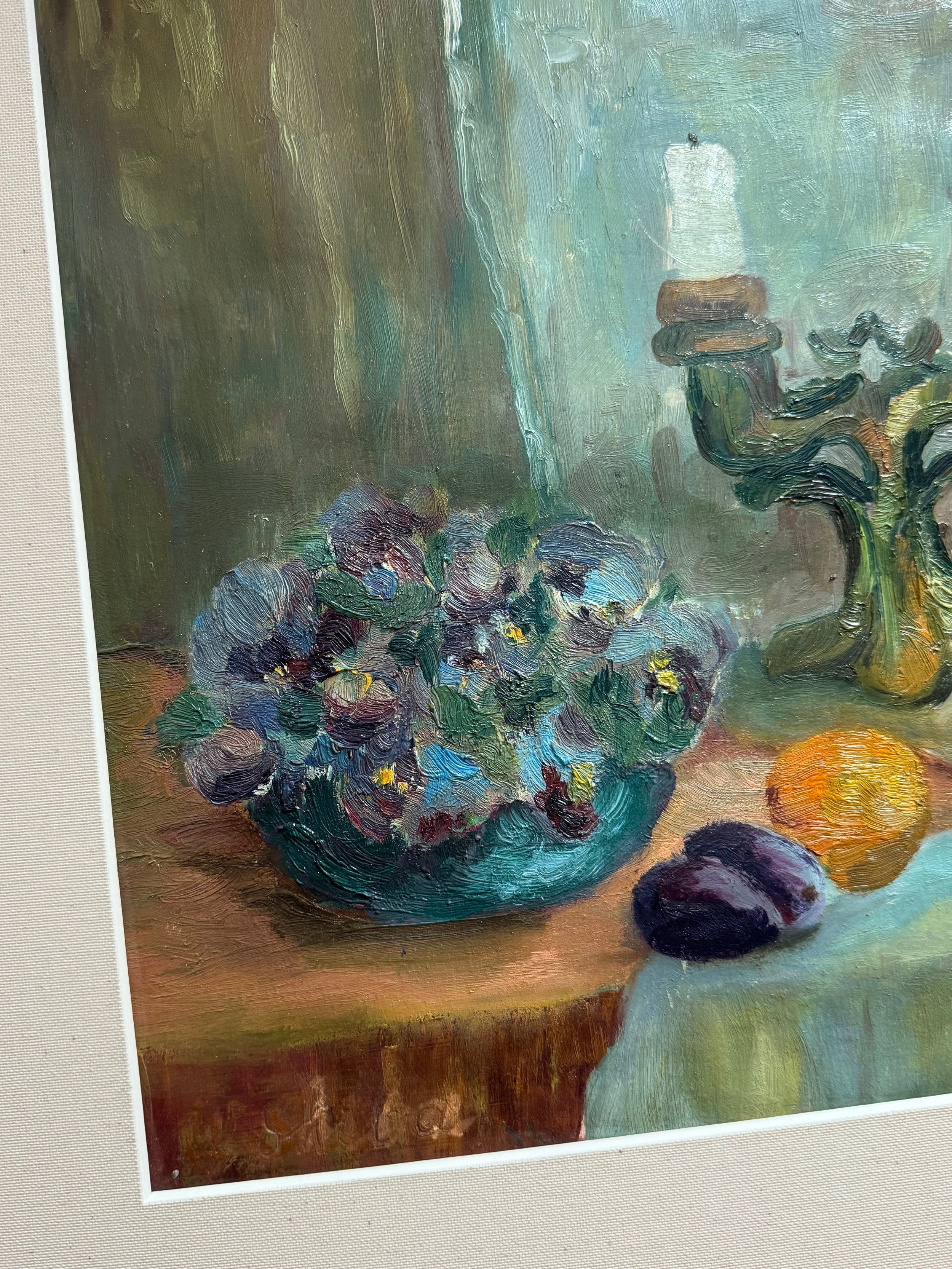 In this still life, signed by the artist and sourced in London, the artist draws the viewer into a quiet, intimate moment of everyday elegance. The candelabra stands tall, its muted bronze complementing the soft teal backdrop, while a bowl of violets adds a touch of lushness and life to the scene. The careful placement of fruit—a single plum and an orange—grounds the composition with their deep, rich tones. It’s as if the objects have been gathered not for their grandeur but for their subtle, timeless beauty, offering a quiet respite from the world beyond. Updated with a fresh linen mount and museum glass.