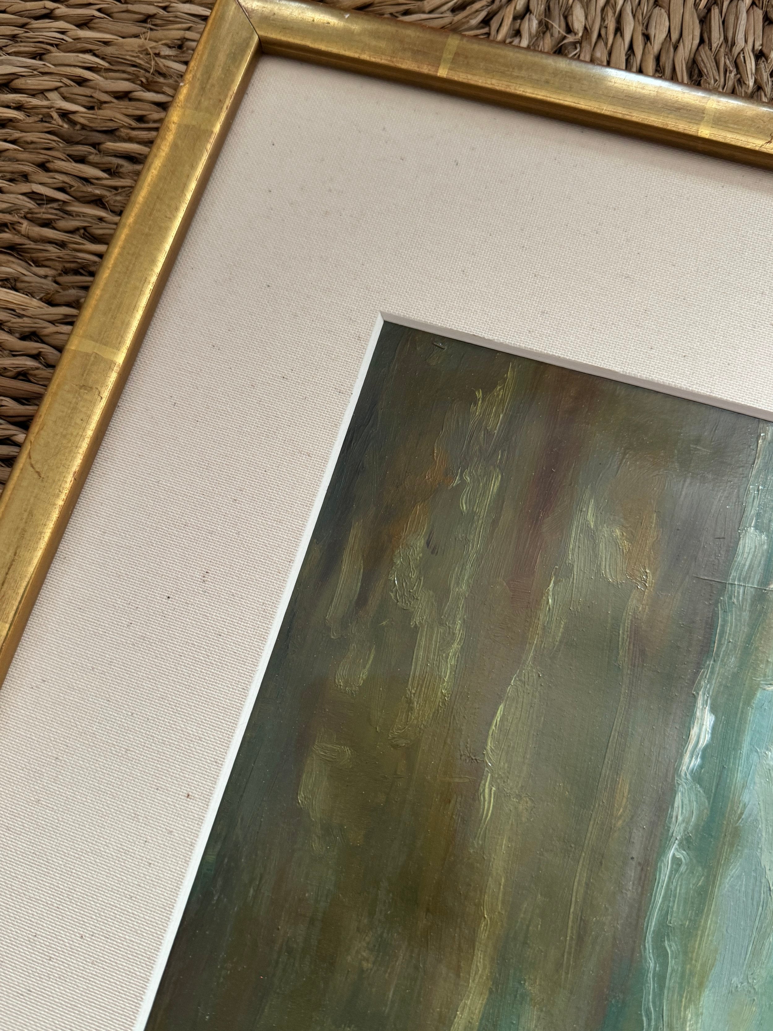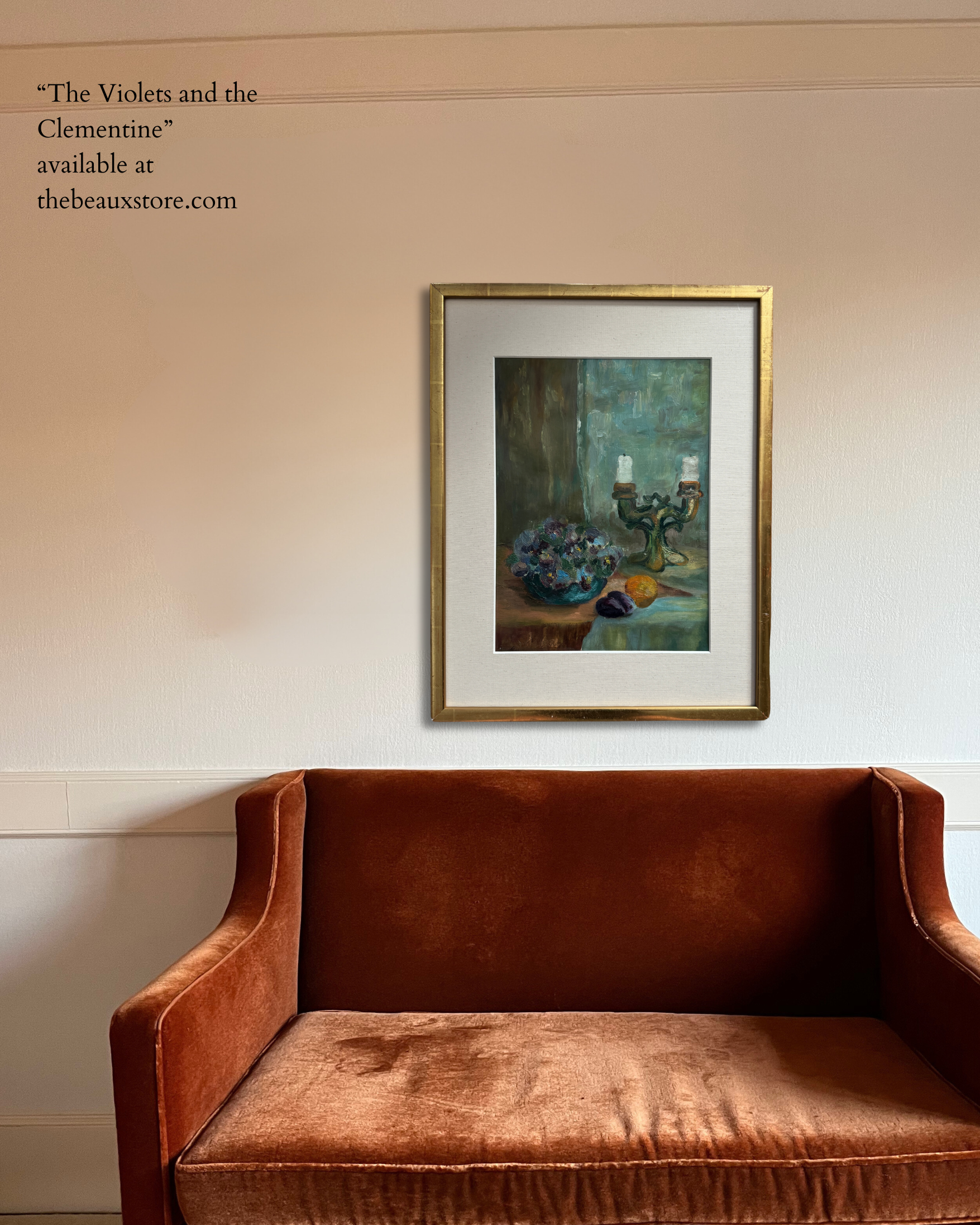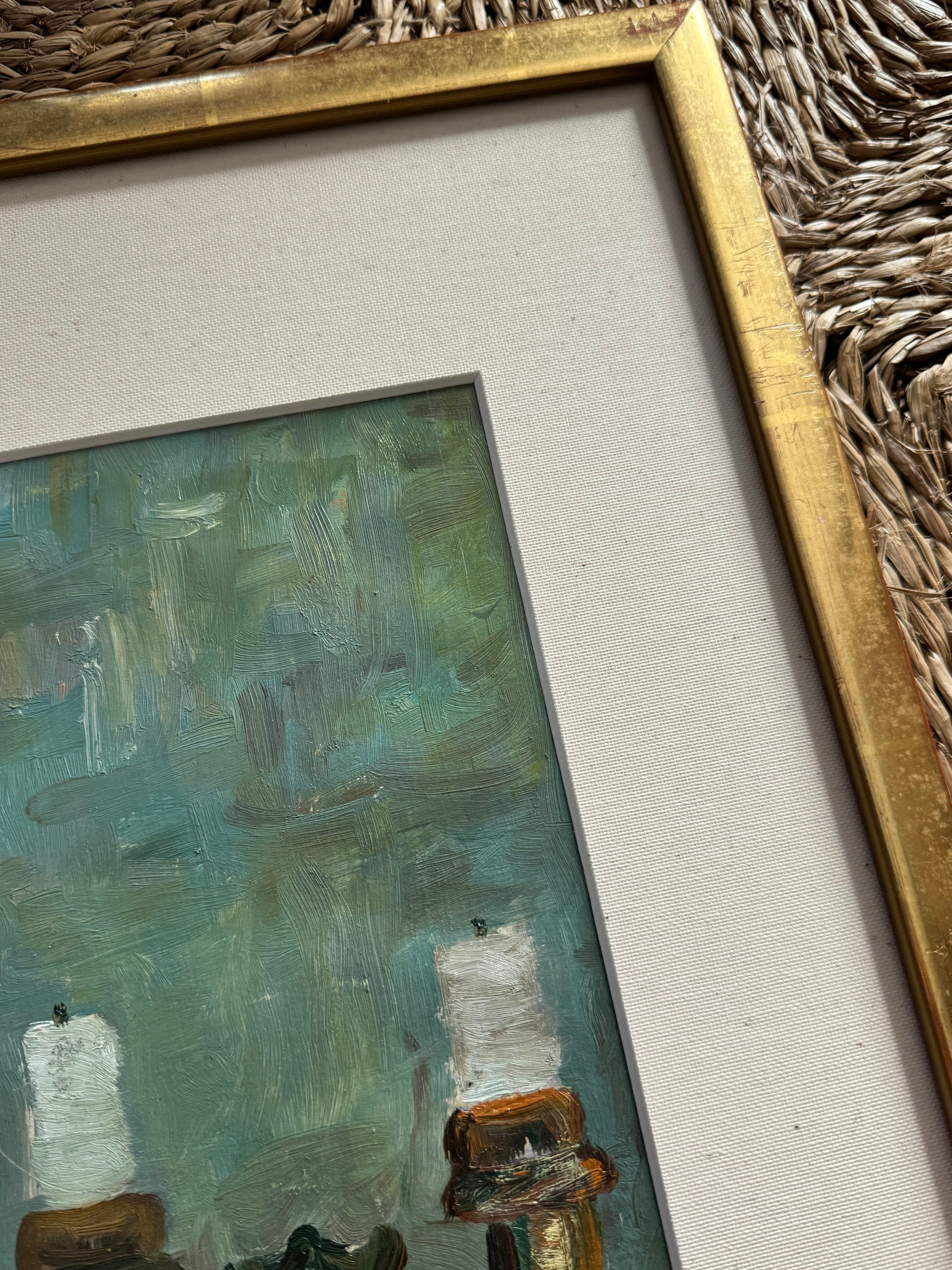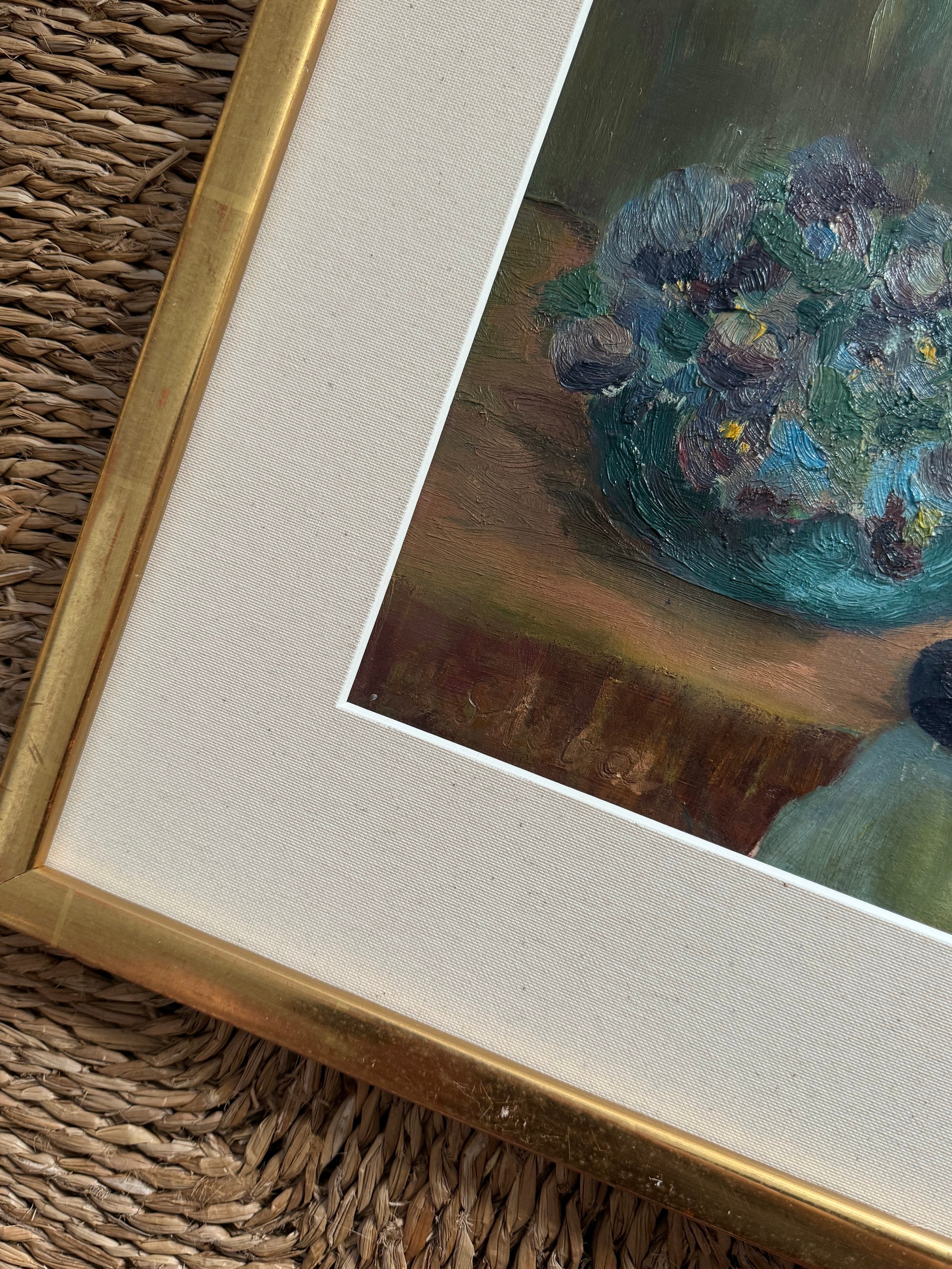 In this still life, signed by the artist and sourced in London, the artist draws the viewer into a quiet, intimate moment of everyday elegance. The candelabra stands tall, its muted bronze complementing the soft teal backdrop, while a bowl of violets adds a touch of lushness and life to the scene. The careful placement of fruit—a single plum and an orange—grounds the composition with their deep, rich tones. It’s as if the objects have been gathered not for their grandeur but for their subtle, timeless beauty, offering a quiet respite from the world beyond. Updated with a fresh linen mount and museum glass.