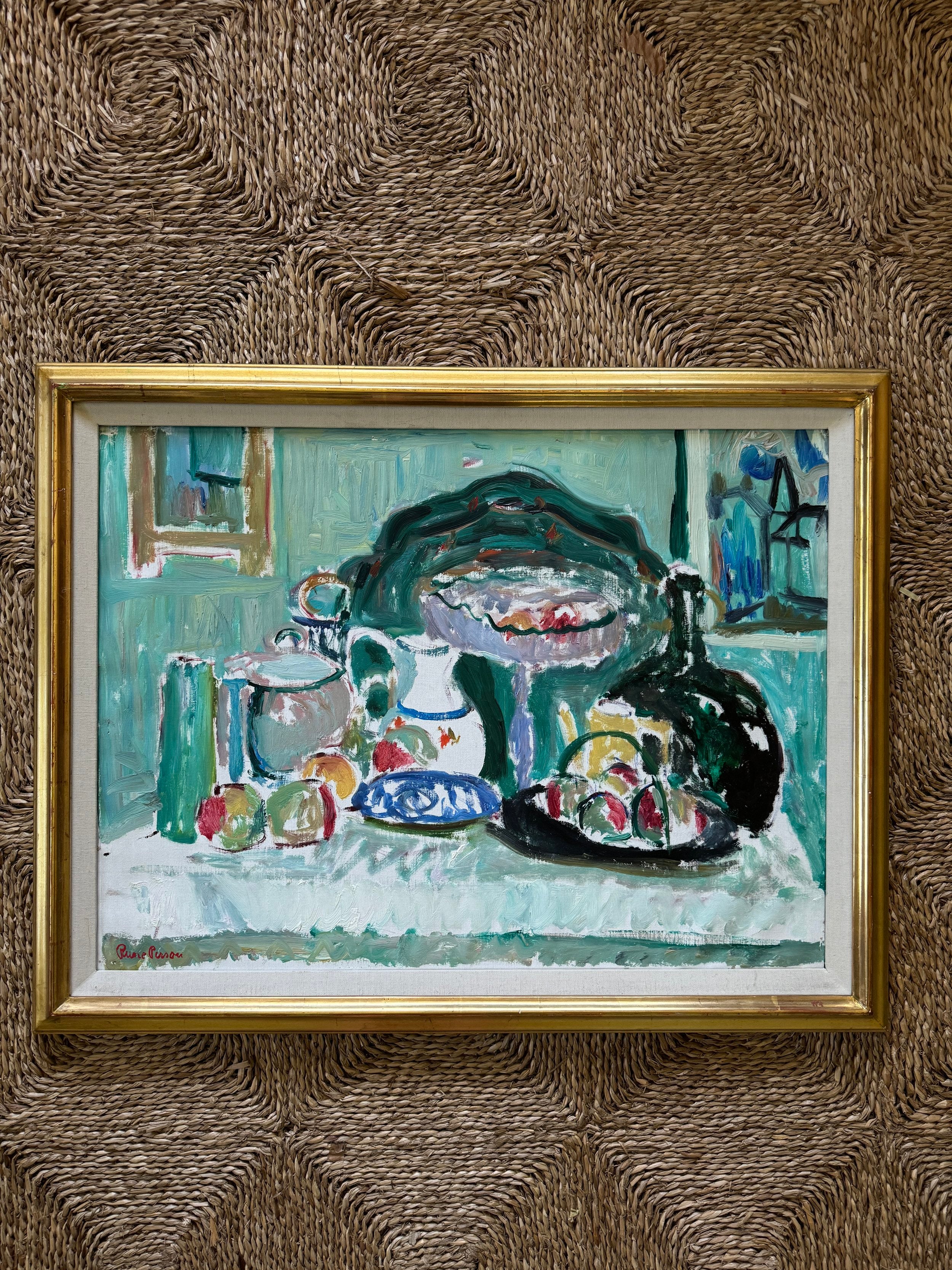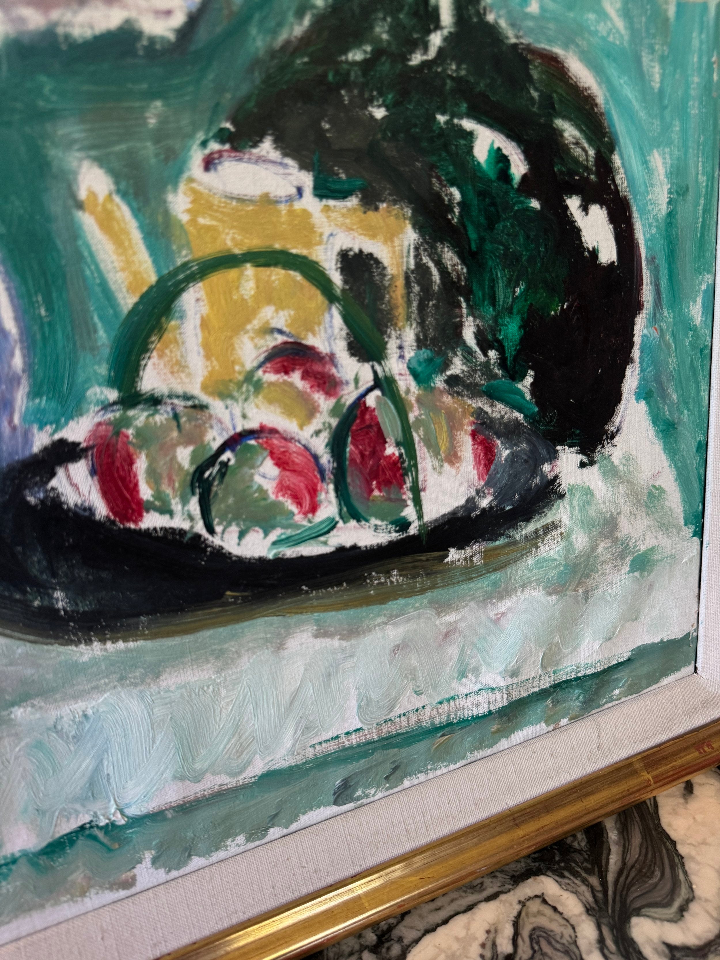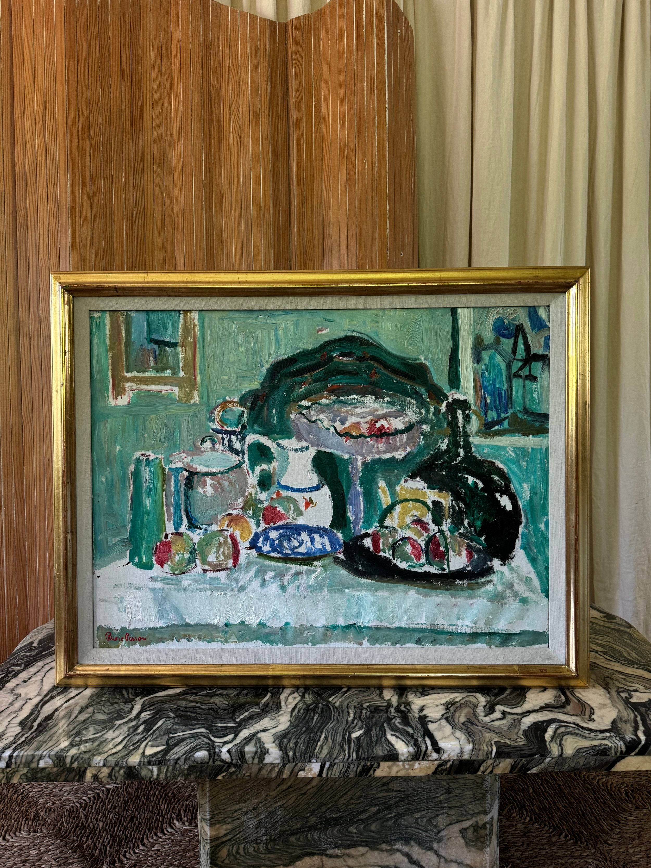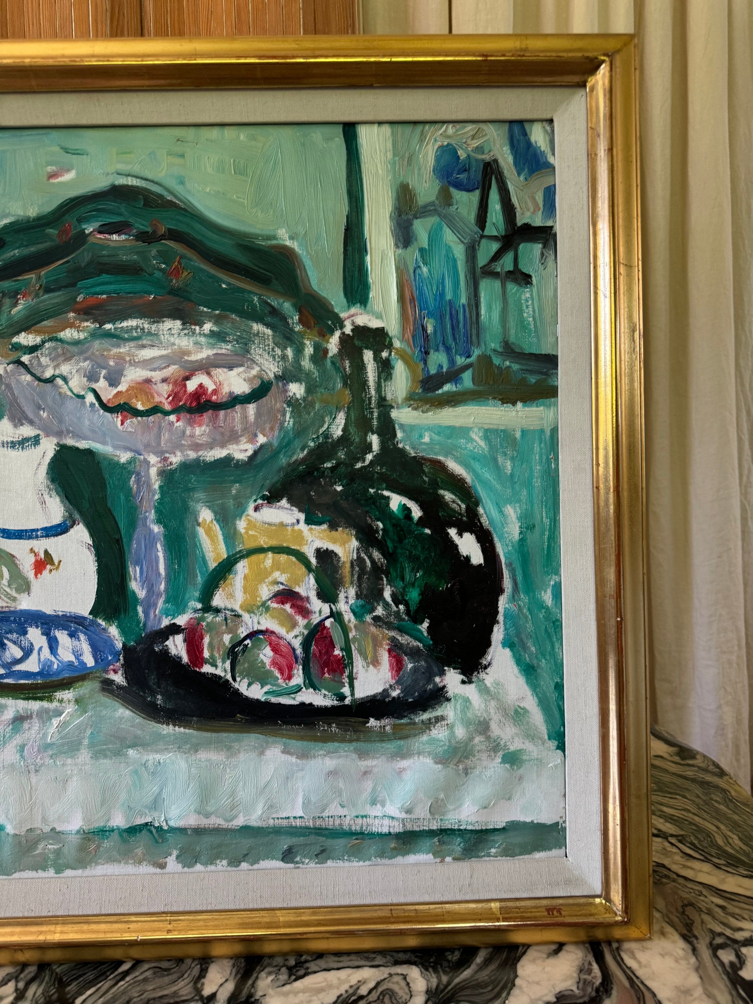 This large midcentury oil on canvas brims with painterly energy, transforming a traditional still life into a vibrant, modernist tableau. Bowls of fruit, vessels, and glassware are rendered in broad, confident strokes, their forms dissolving into passages of luminous turquoise, emerald, and white. The brushwork is loose yet full of intent, giving the composition a sense of immediacy, as if the artist captured the scene in one breath. Framed in gilt wood, the piece radiates vitality and scale, offering both decorative impact and art-historical depth. It is a work that elevates the everyday into something exuberant, alive, and distinctly of its time. The canvas has a bit of slack but it doesn't detract from the piece. It is named Stilleben, which is Swedish for still life.