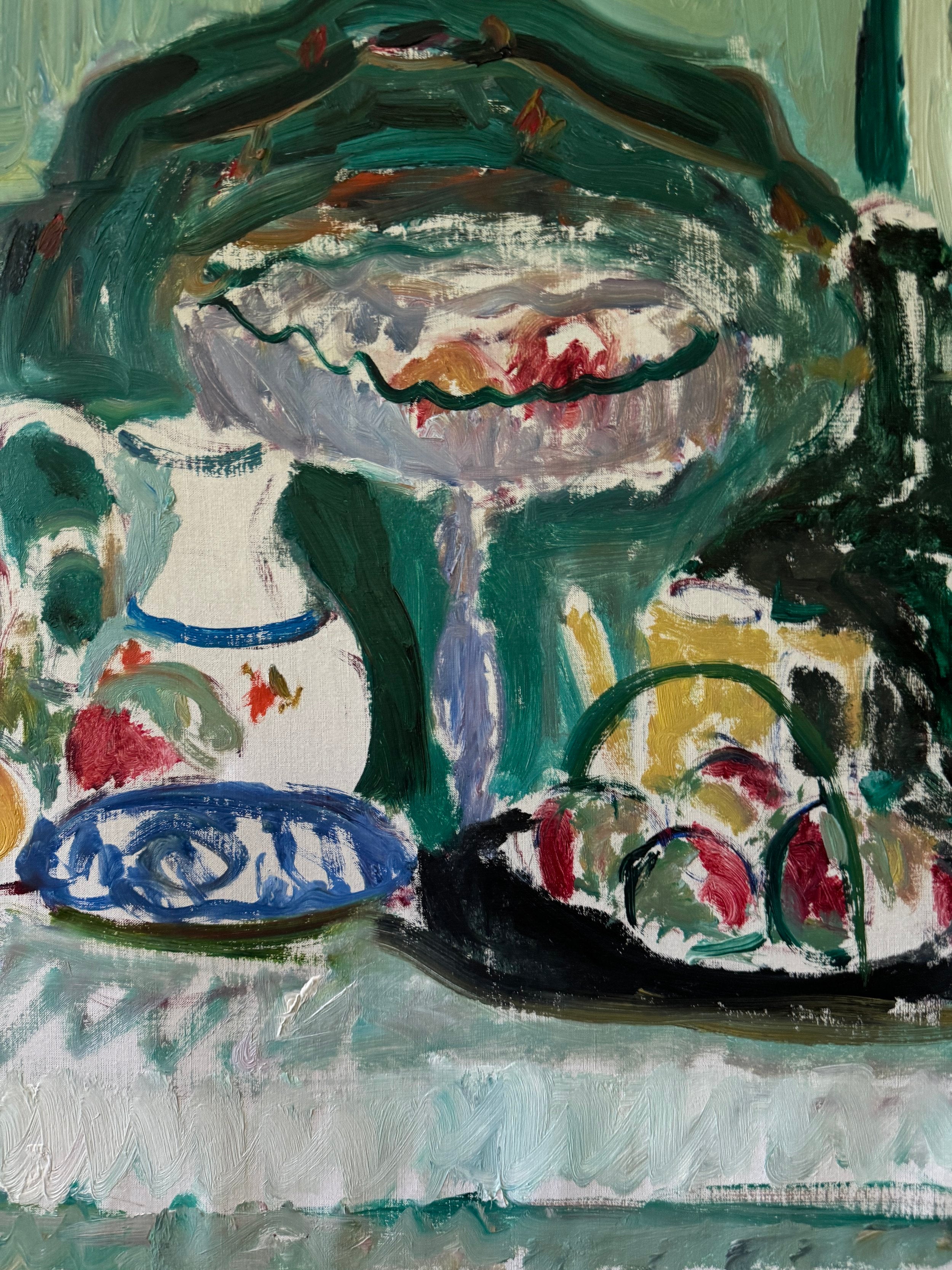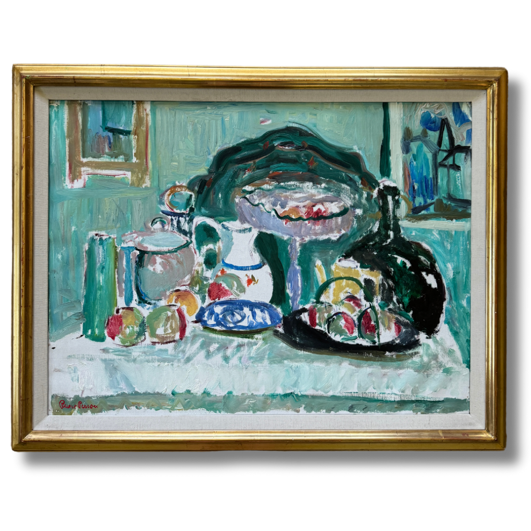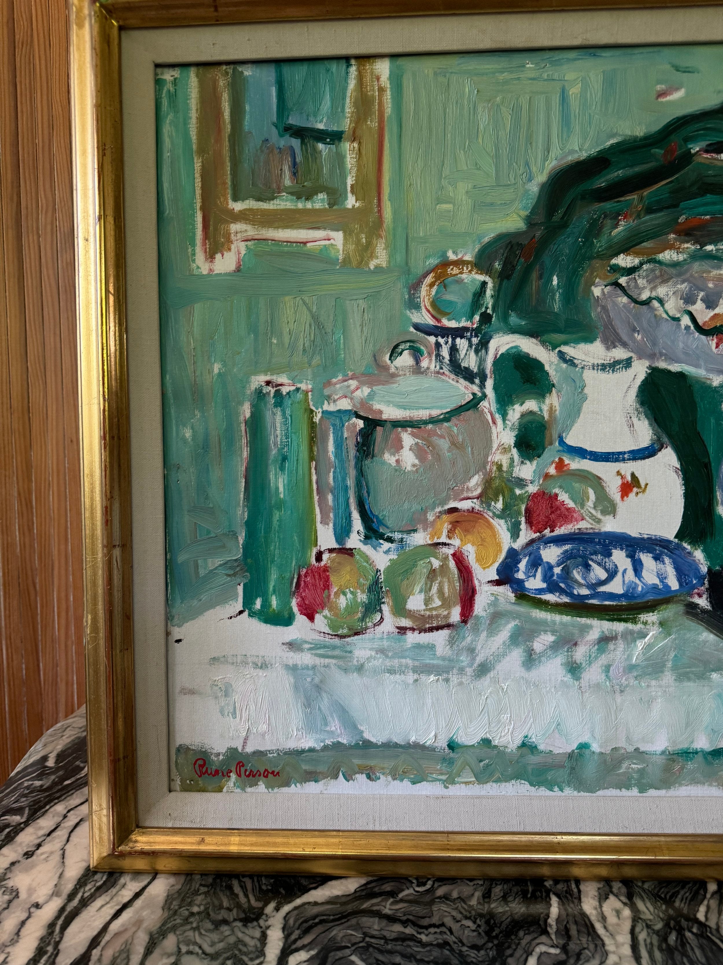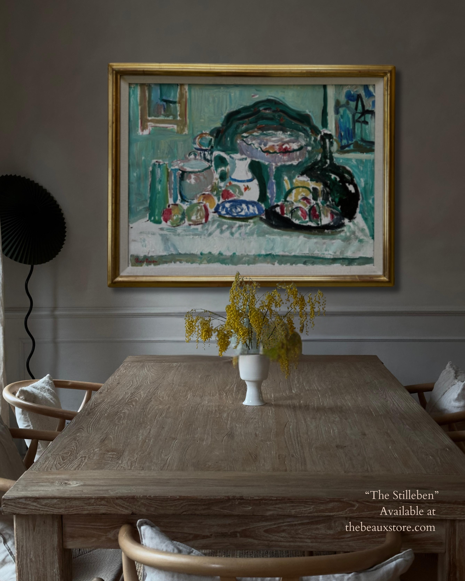 This large midcentury oil on canvas brims with painterly energy, transforming a traditional still life into a vibrant, modernist tableau. Bowls of fruit, vessels, and glassware are rendered in broad, confident strokes, their forms dissolving into passages of luminous turquoise, emerald, and white. The brushwork is loose yet full of intent, giving the composition a sense of immediacy, as if the artist captured the scene in one breath. Framed in gilt wood, the piece radiates vitality and scale, offering both decorative impact and art-historical depth. It is a work that elevates the everyday into something exuberant, alive, and distinctly of its time. The canvas has a bit of slack but it doesn't detract from the piece. It is named Stilleben, which is Swedish for still life.