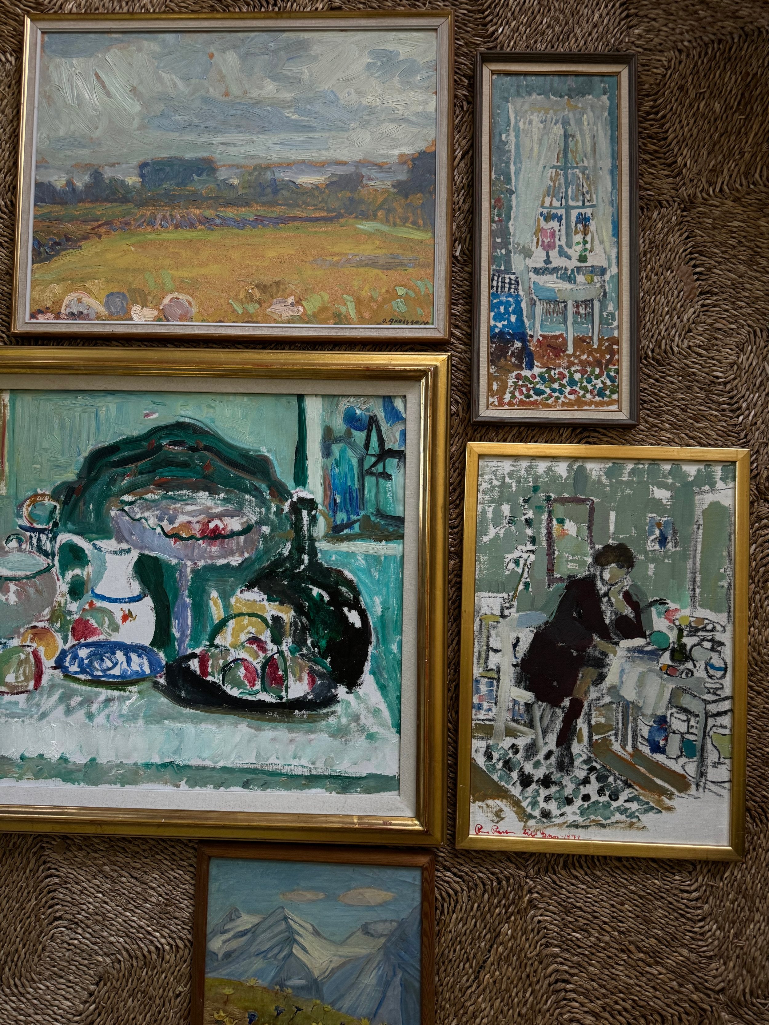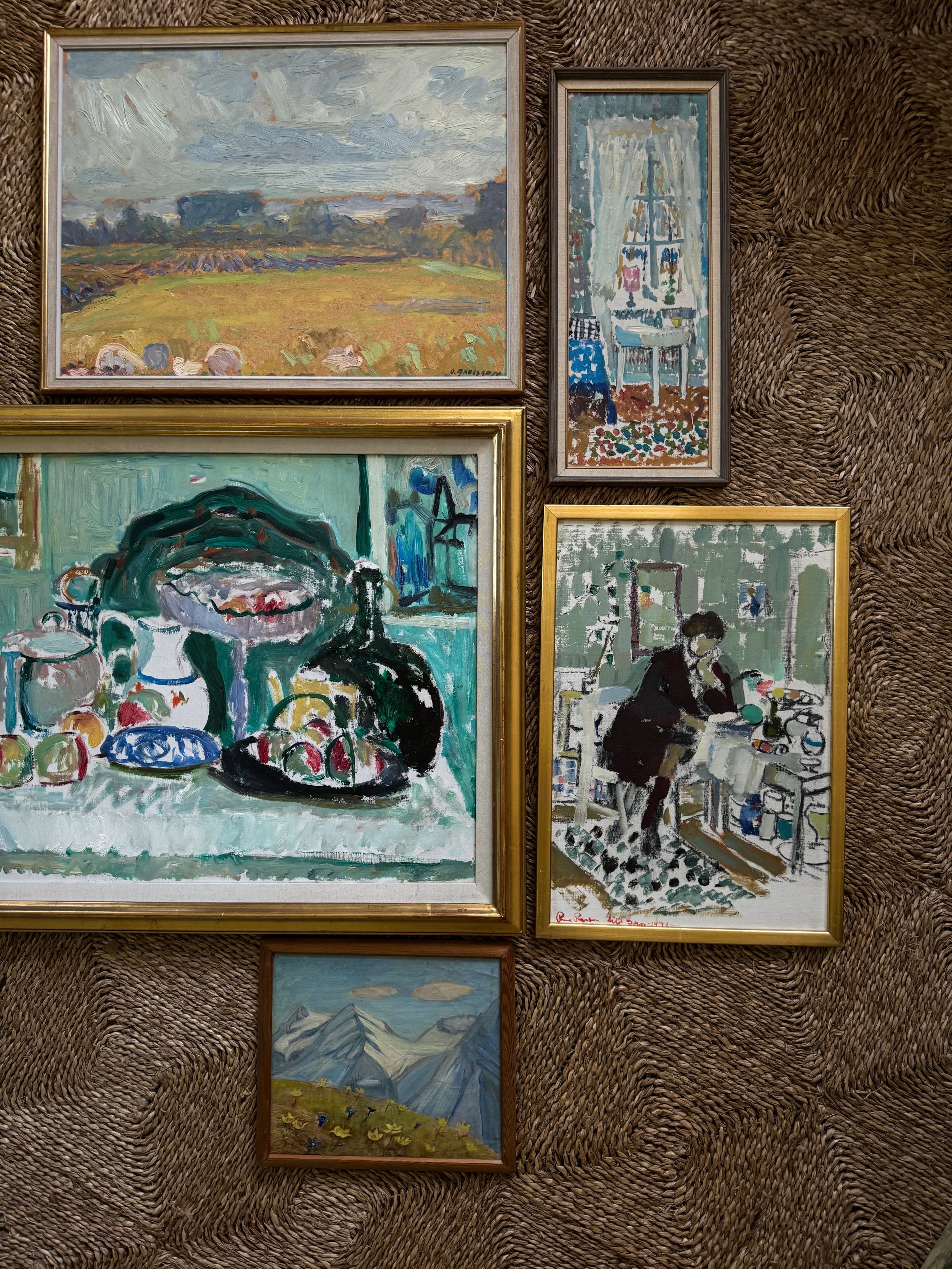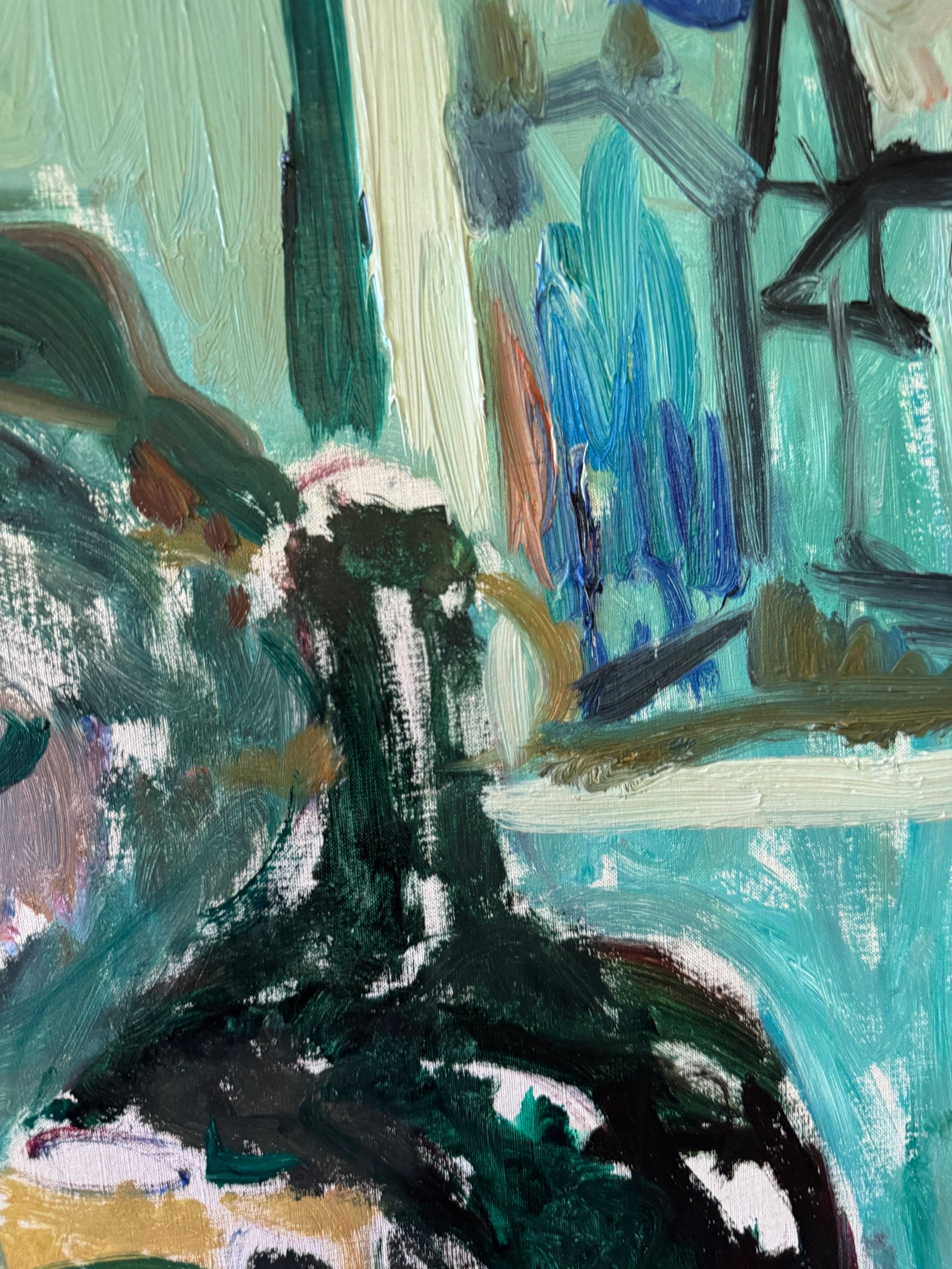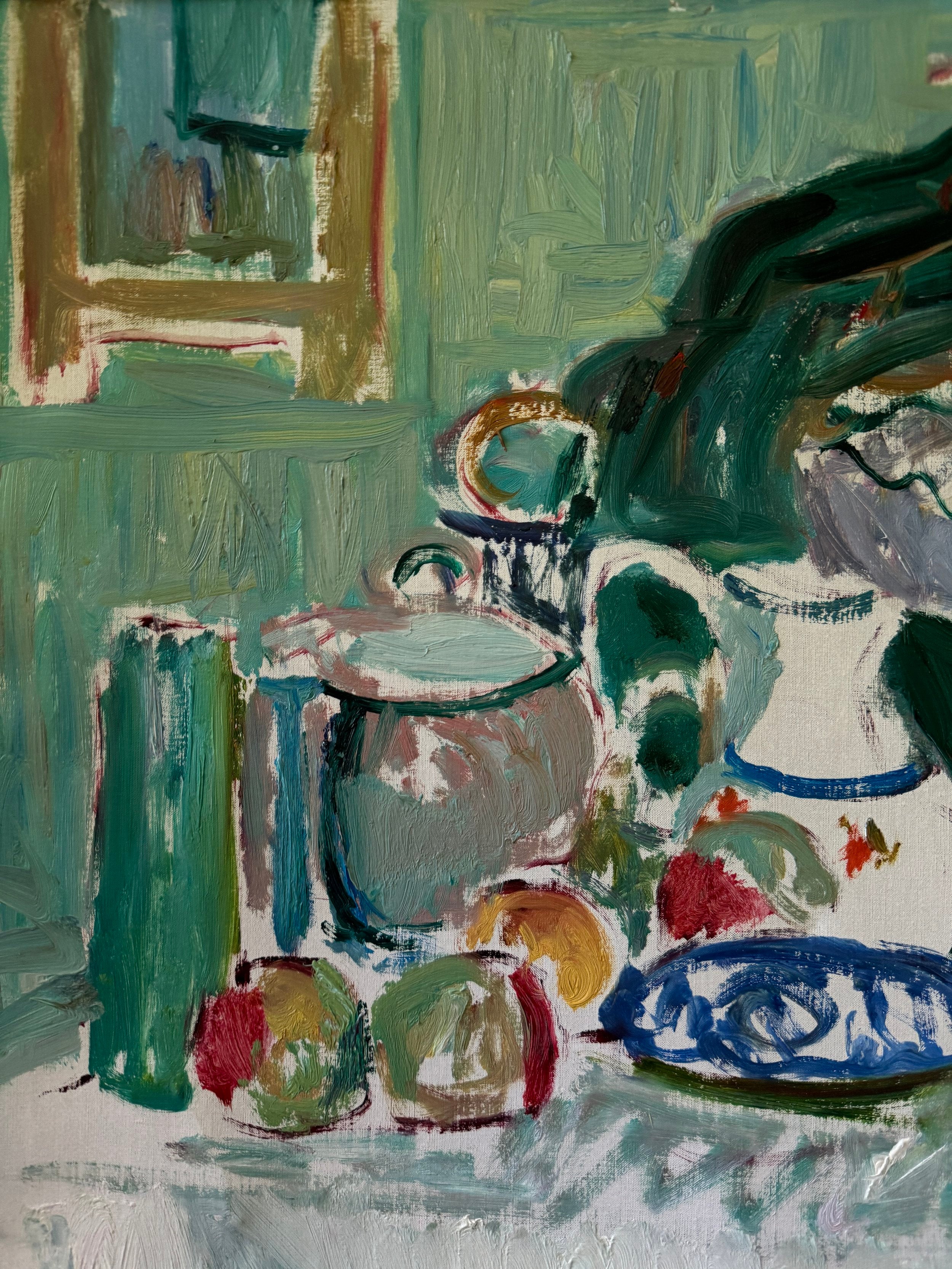 This large midcentury oil on canvas brims with painterly energy, transforming a traditional still life into a vibrant, modernist tableau. Bowls of fruit, vessels, and glassware are rendered in broad, confident strokes, their forms dissolving into passages of luminous turquoise, emerald, and white. The brushwork is loose yet full of intent, giving the composition a sense of immediacy, as if the artist captured the scene in one breath. Framed in gilt wood, the piece radiates vitality and scale, offering both decorative impact and art-historical depth. It is a work that elevates the everyday into something exuberant, alive, and distinctly of its time. The canvas has a bit of slack but it doesn't detract from the piece. It is named Stilleben, which is Swedish for still life.