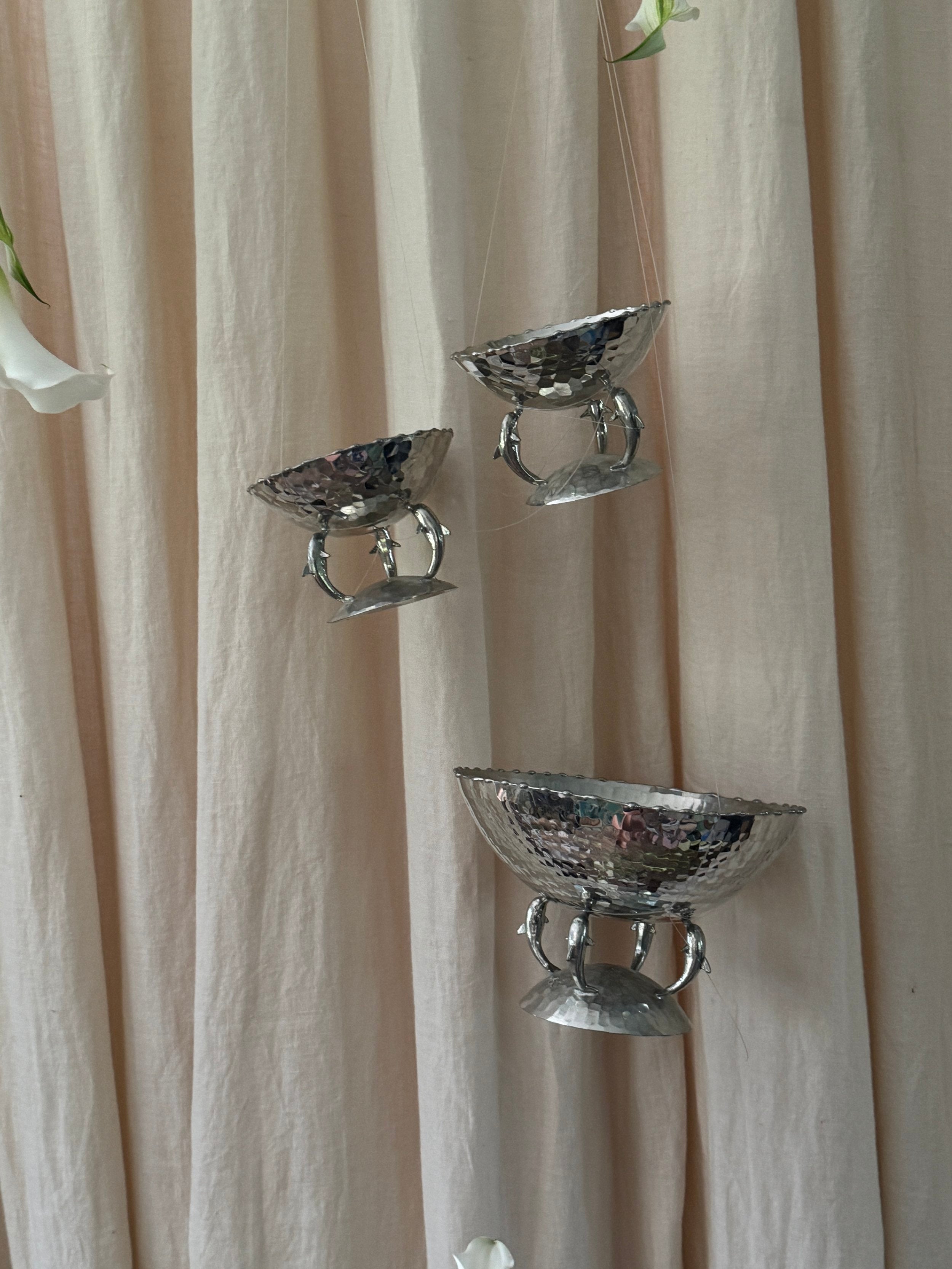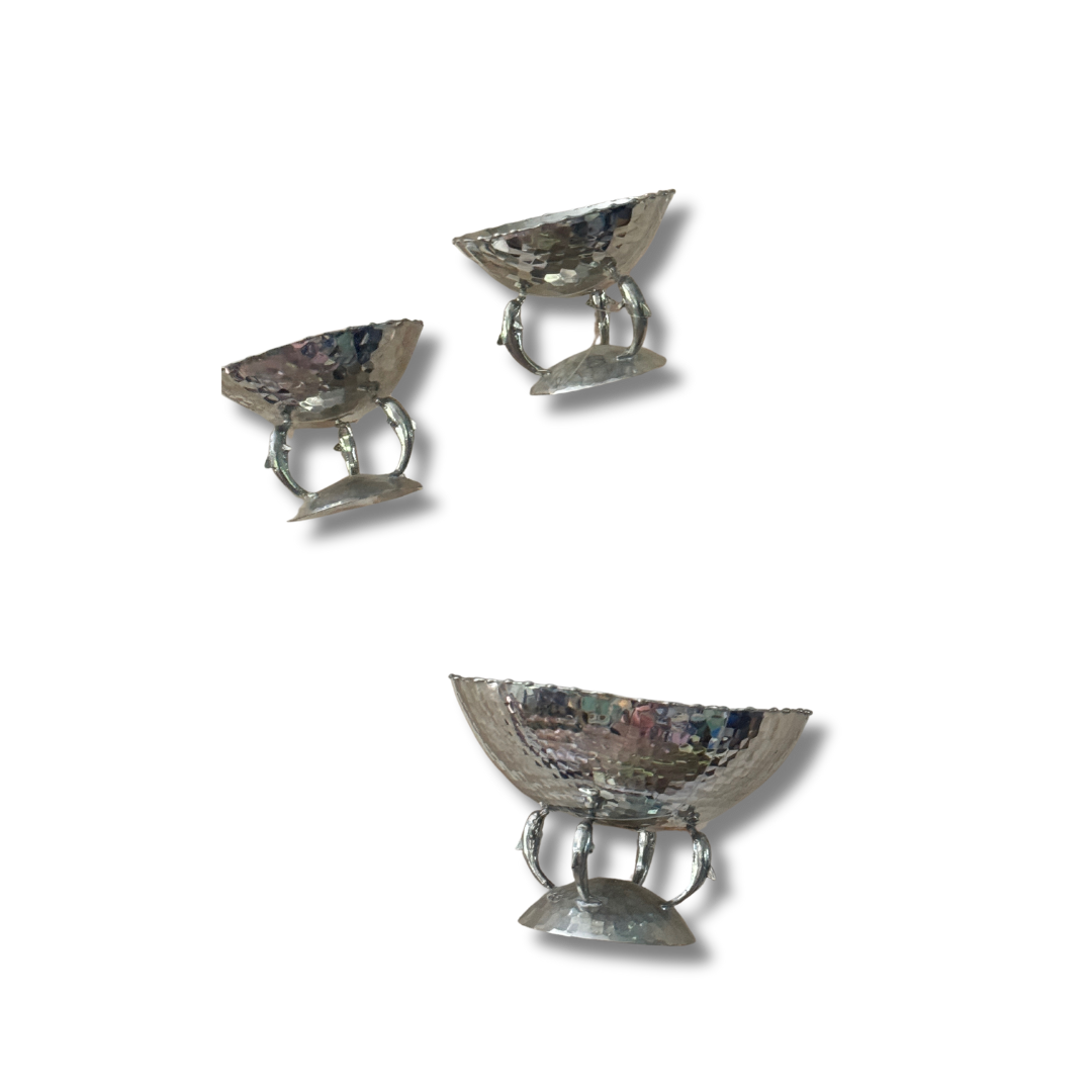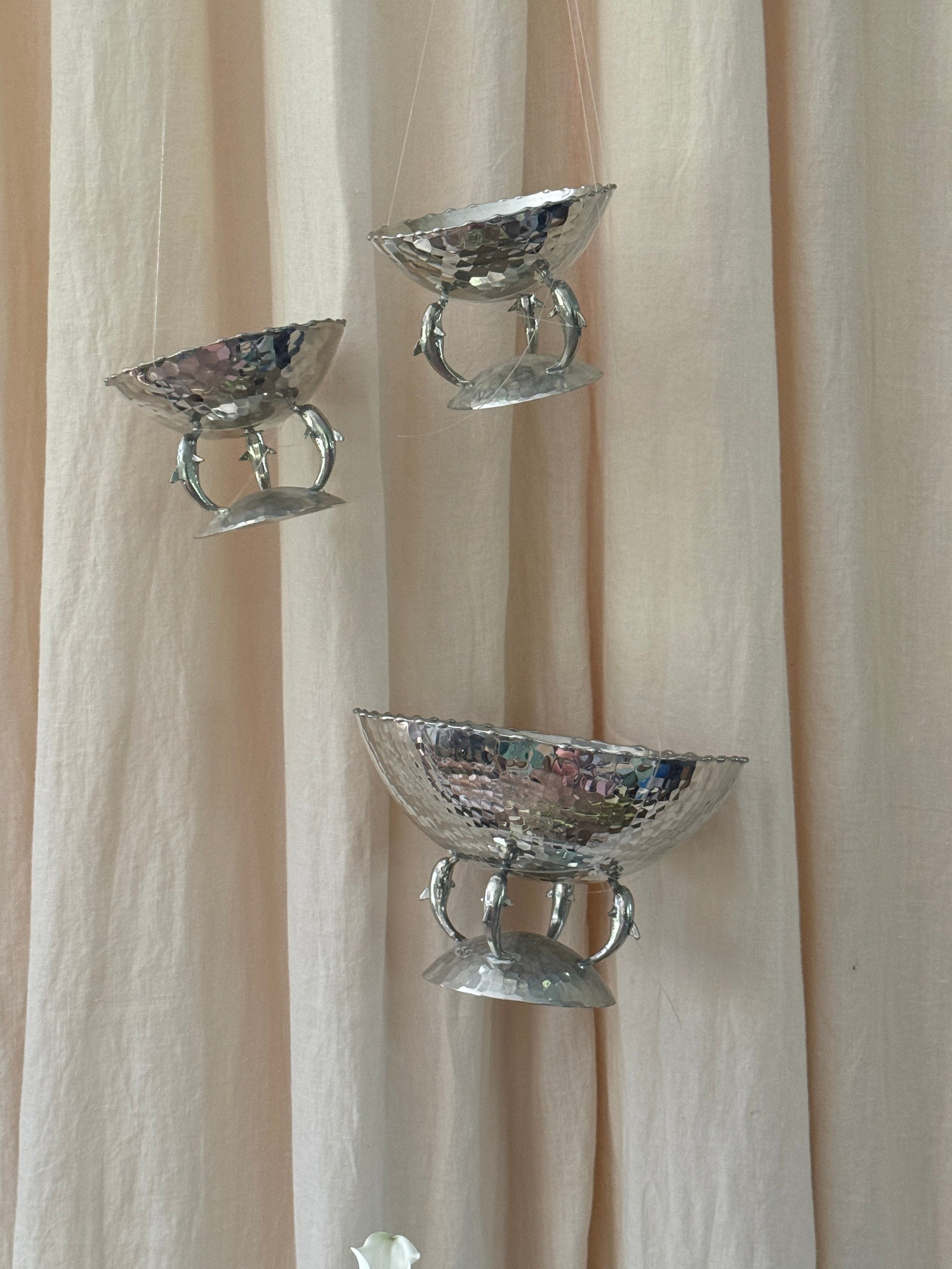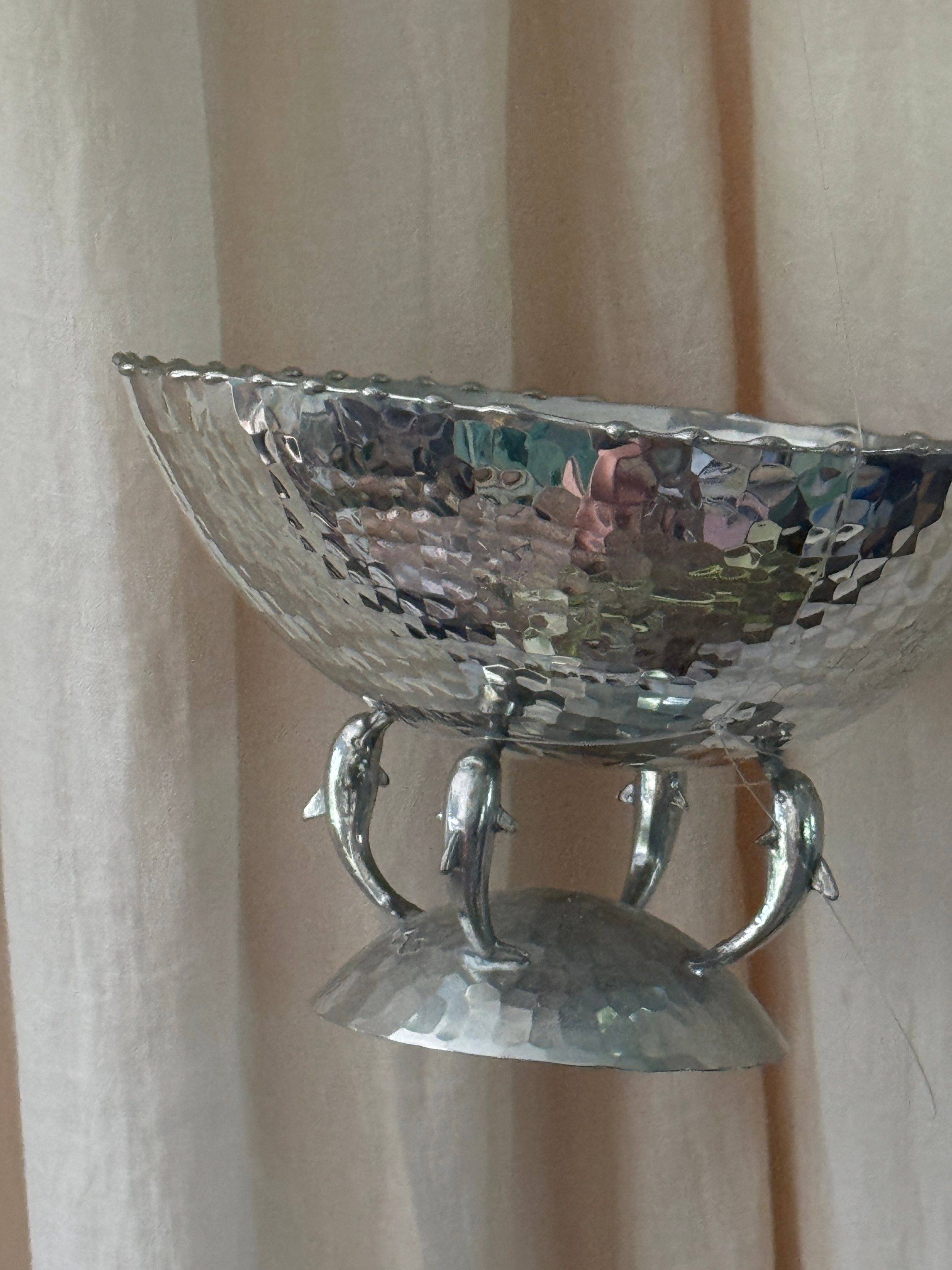 Here is a glorious hammered pewter set featuring a bowl and two candlestick holders from the 1990s with Dolphin motifs. Swedish.