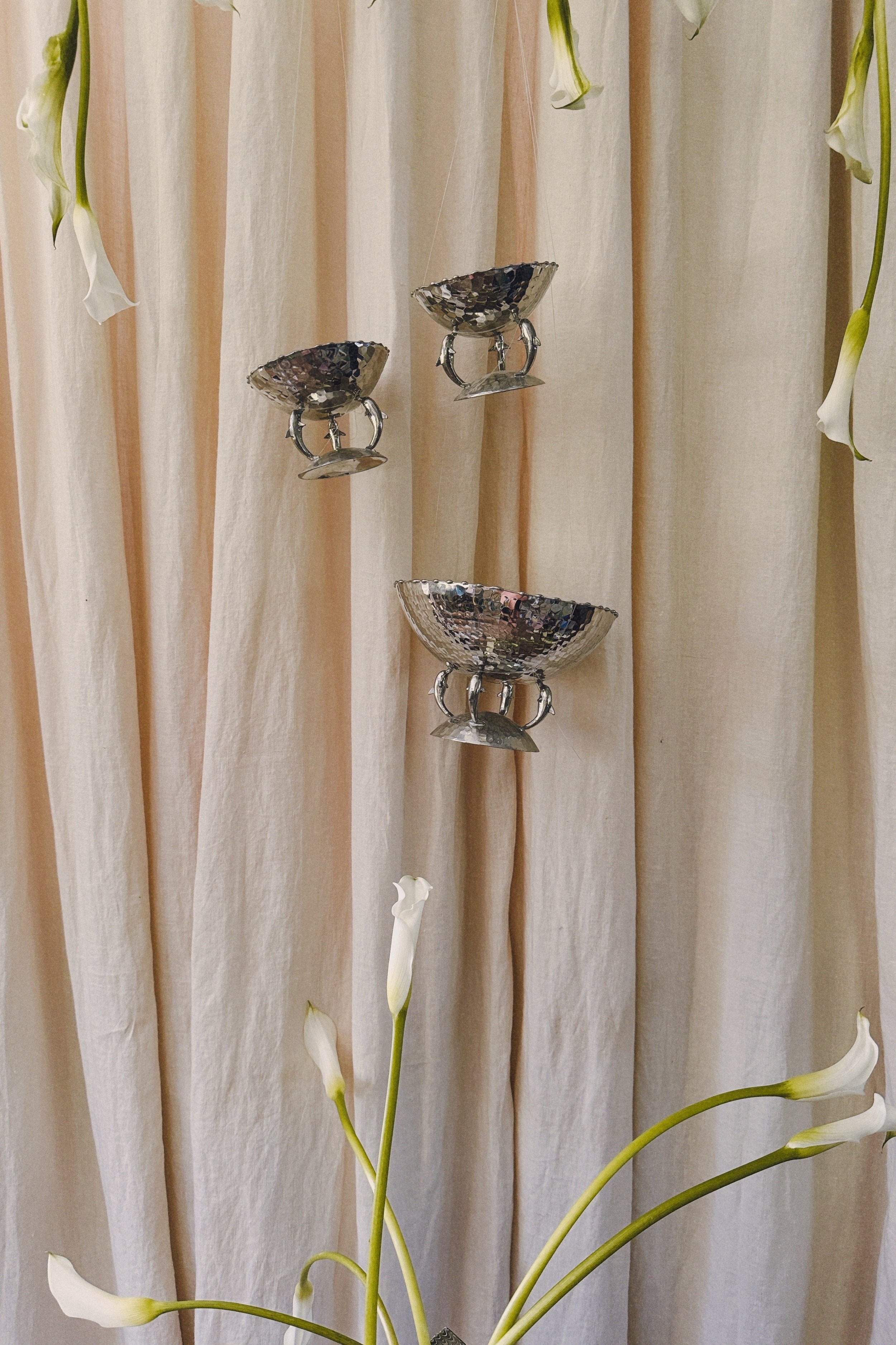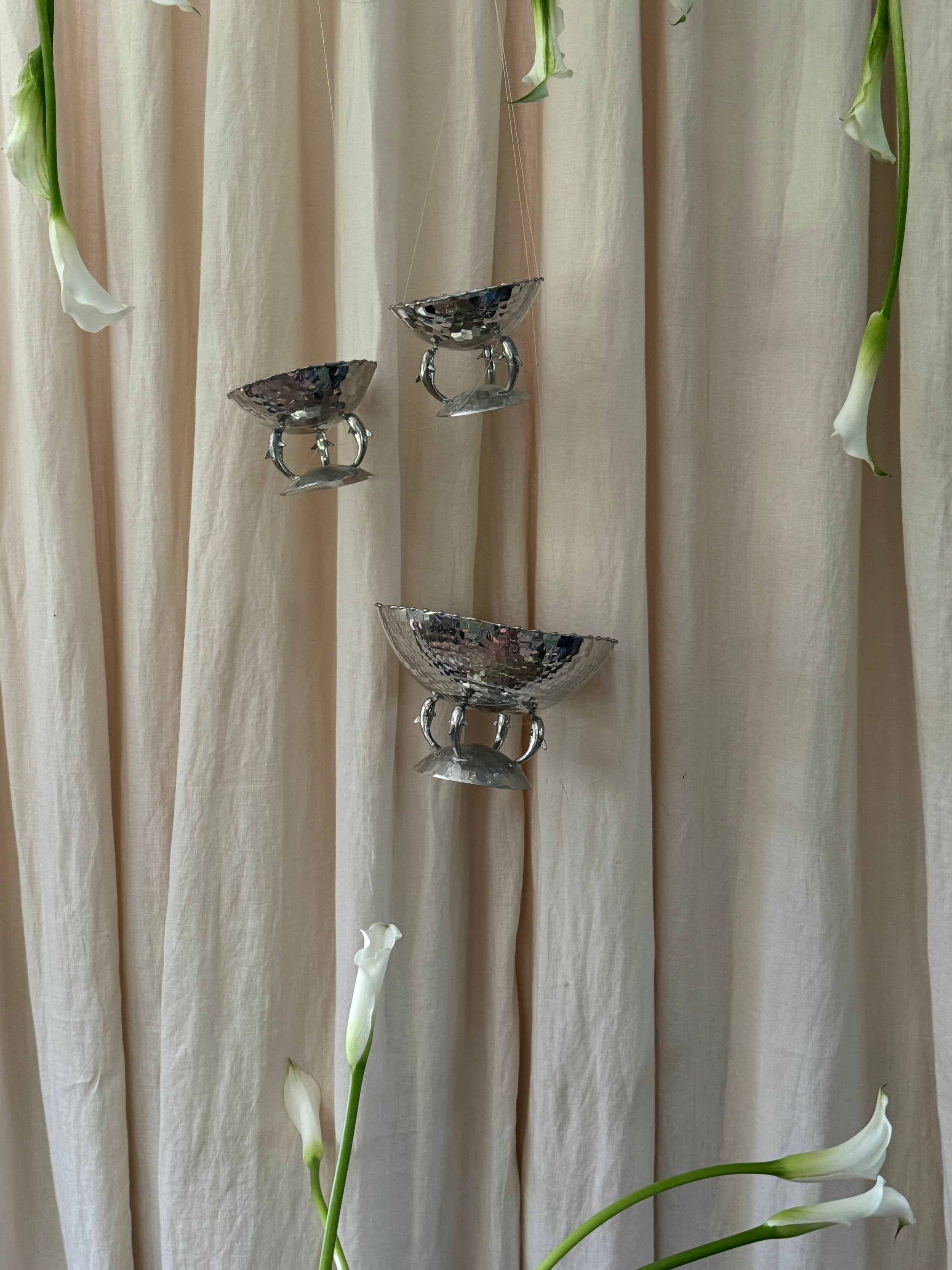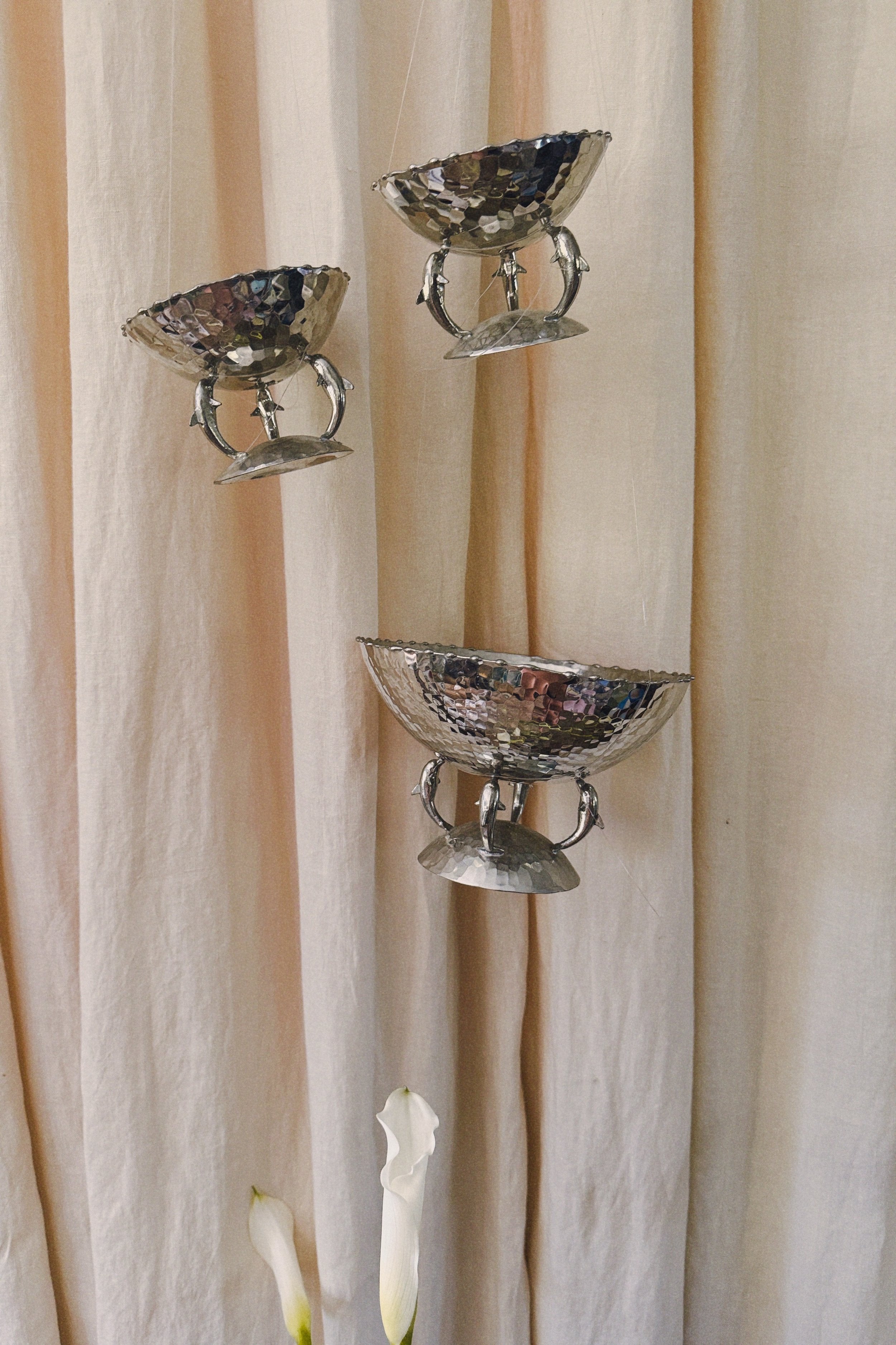 Here is a glorious hammered pewter set featuring a bowl and two candlestick holders from the 1990s with Dolphin motifs. Swedish.