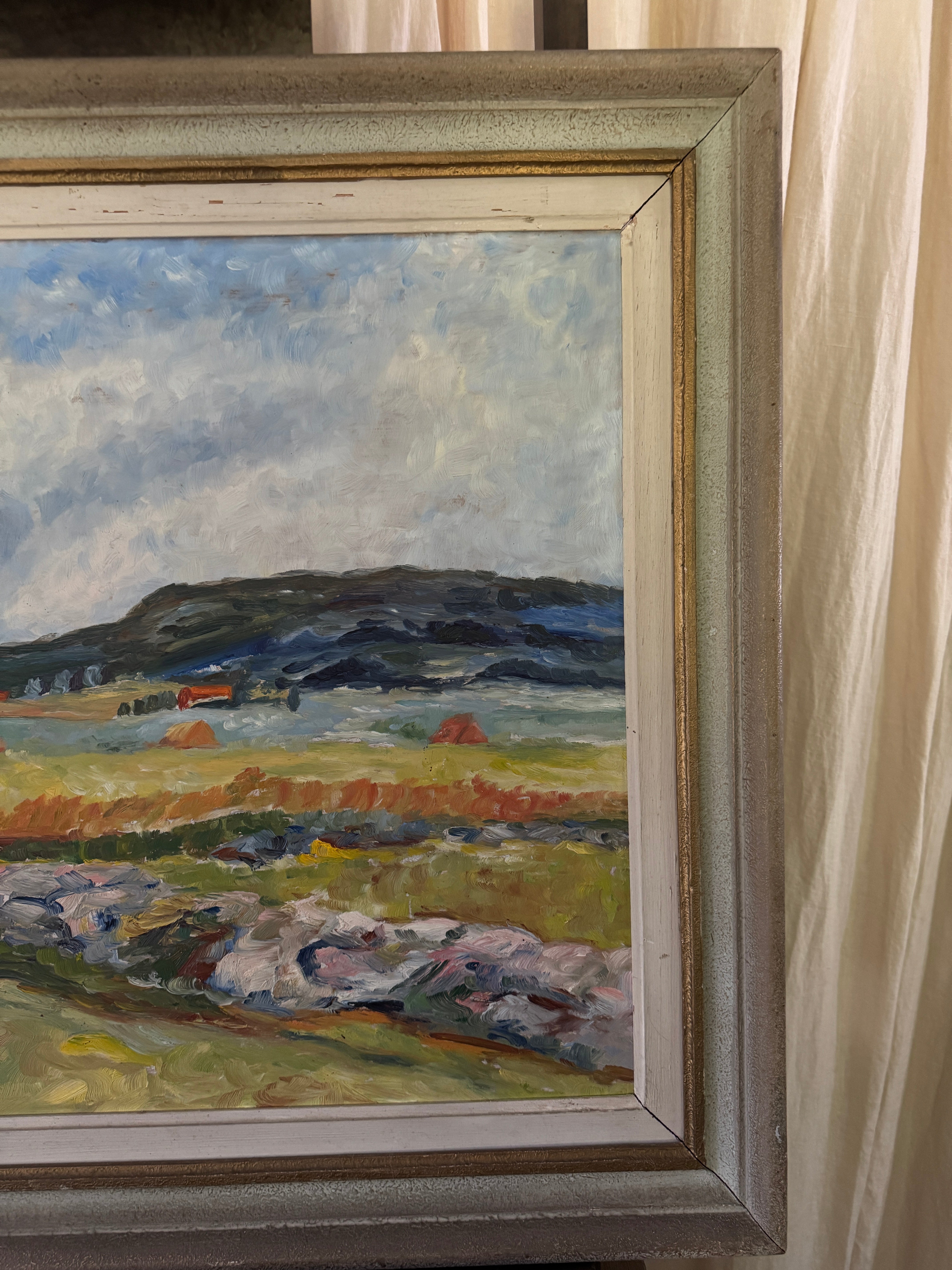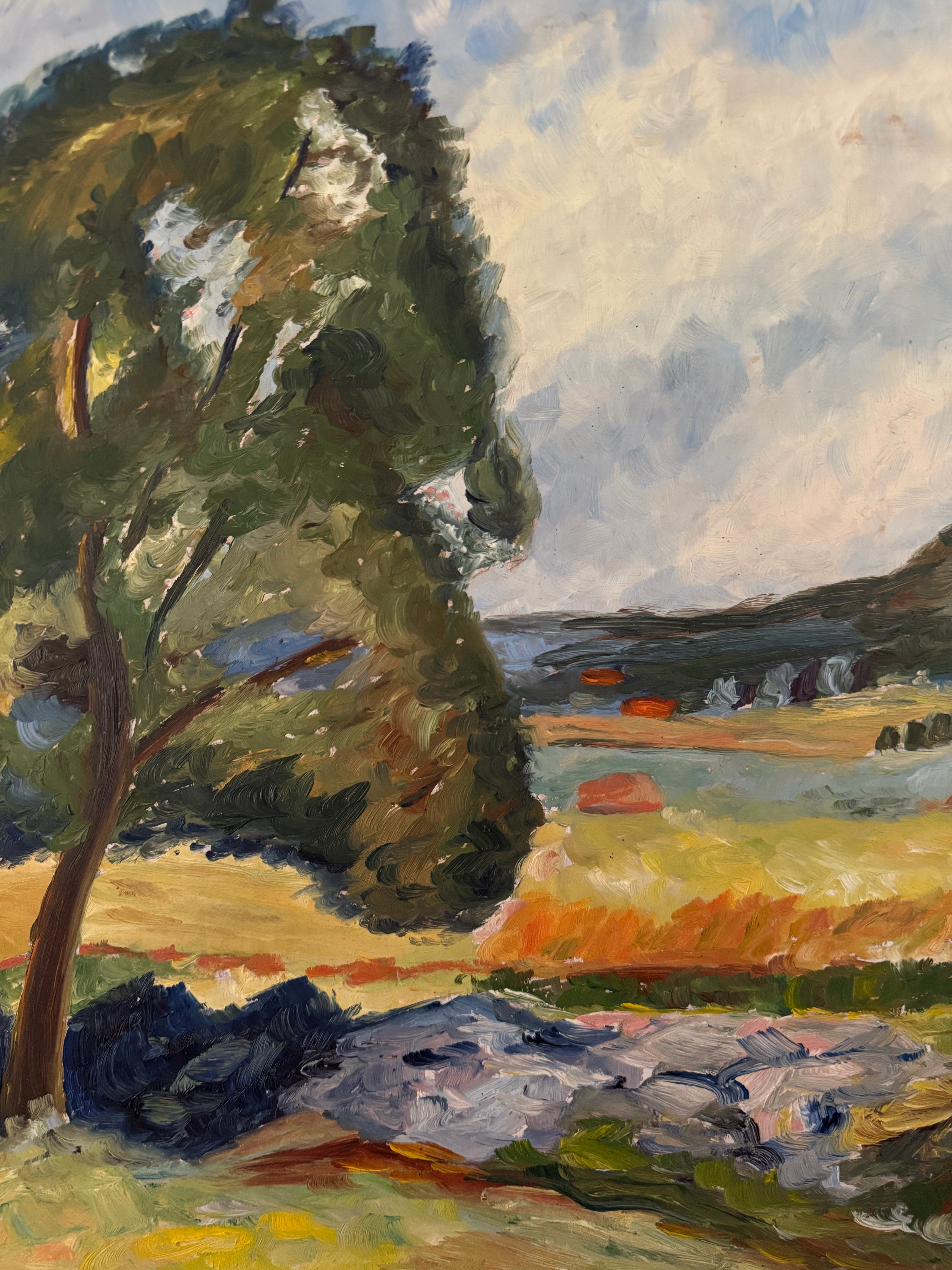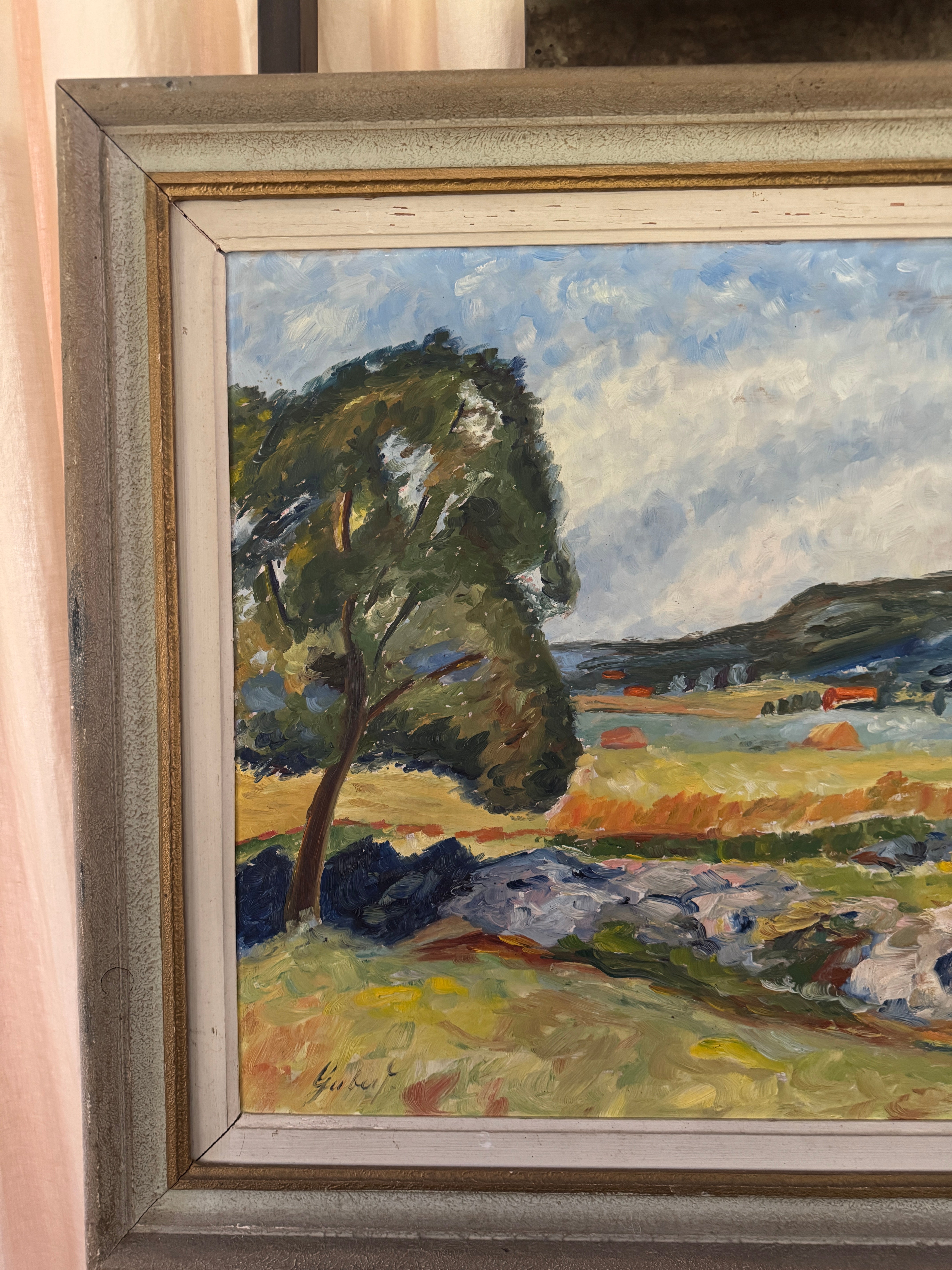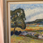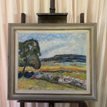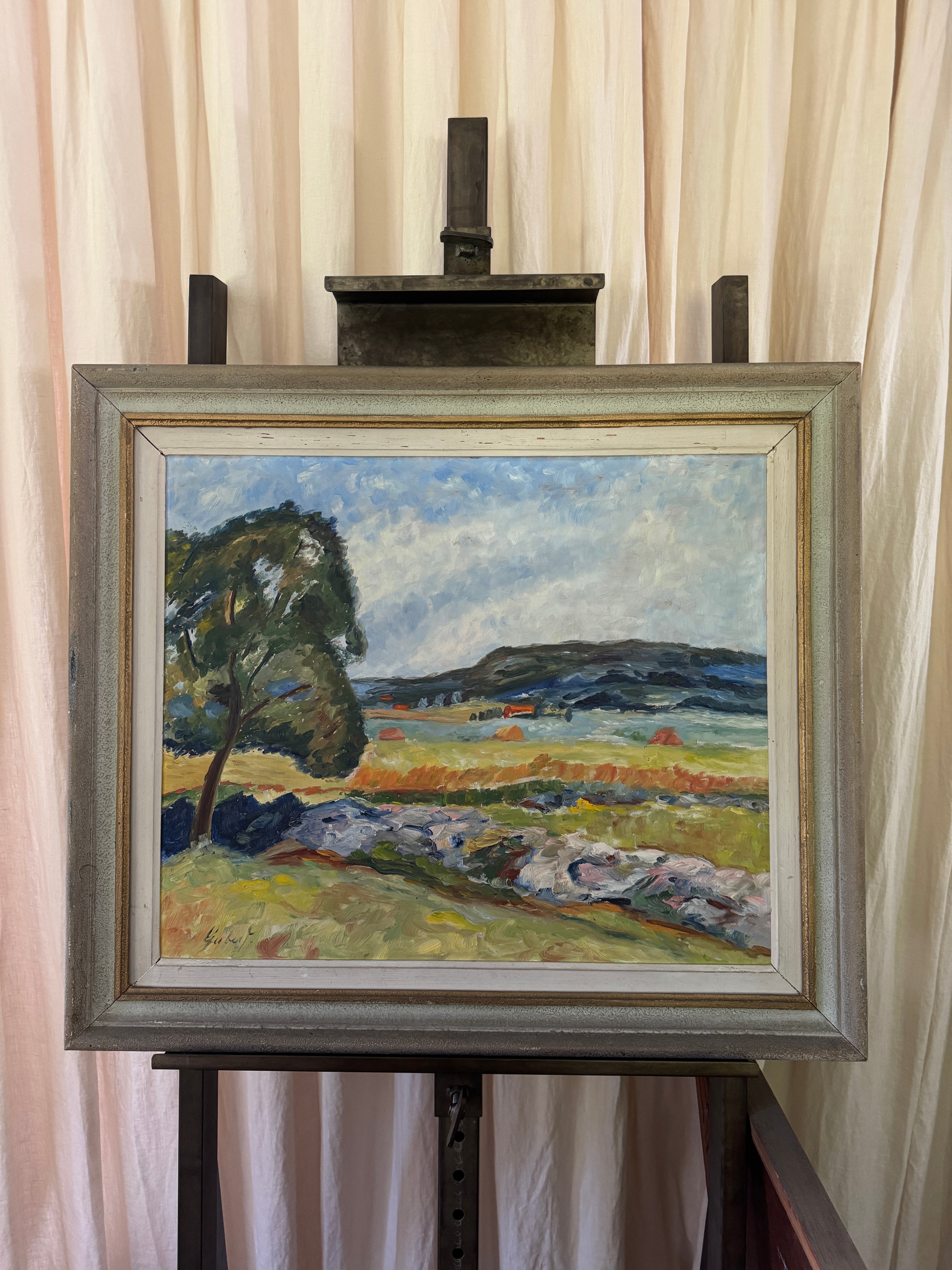 Here is a large Swedish oil on canvas, brimming with movement and light. The artist’s fluid brushwork captures a windswept landscape where ochre fields meet the deep greens and blues of the horizon. There’s a lyrical rhythm in the way the tree bends toward the breeze and the stone wall carves its gentle path through the countryside. The palette, earthy yet enlivened by strokes of cobalt and gold, feels romantic, a celebration of rural serenity rendered through expressive, modernist eyes.