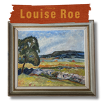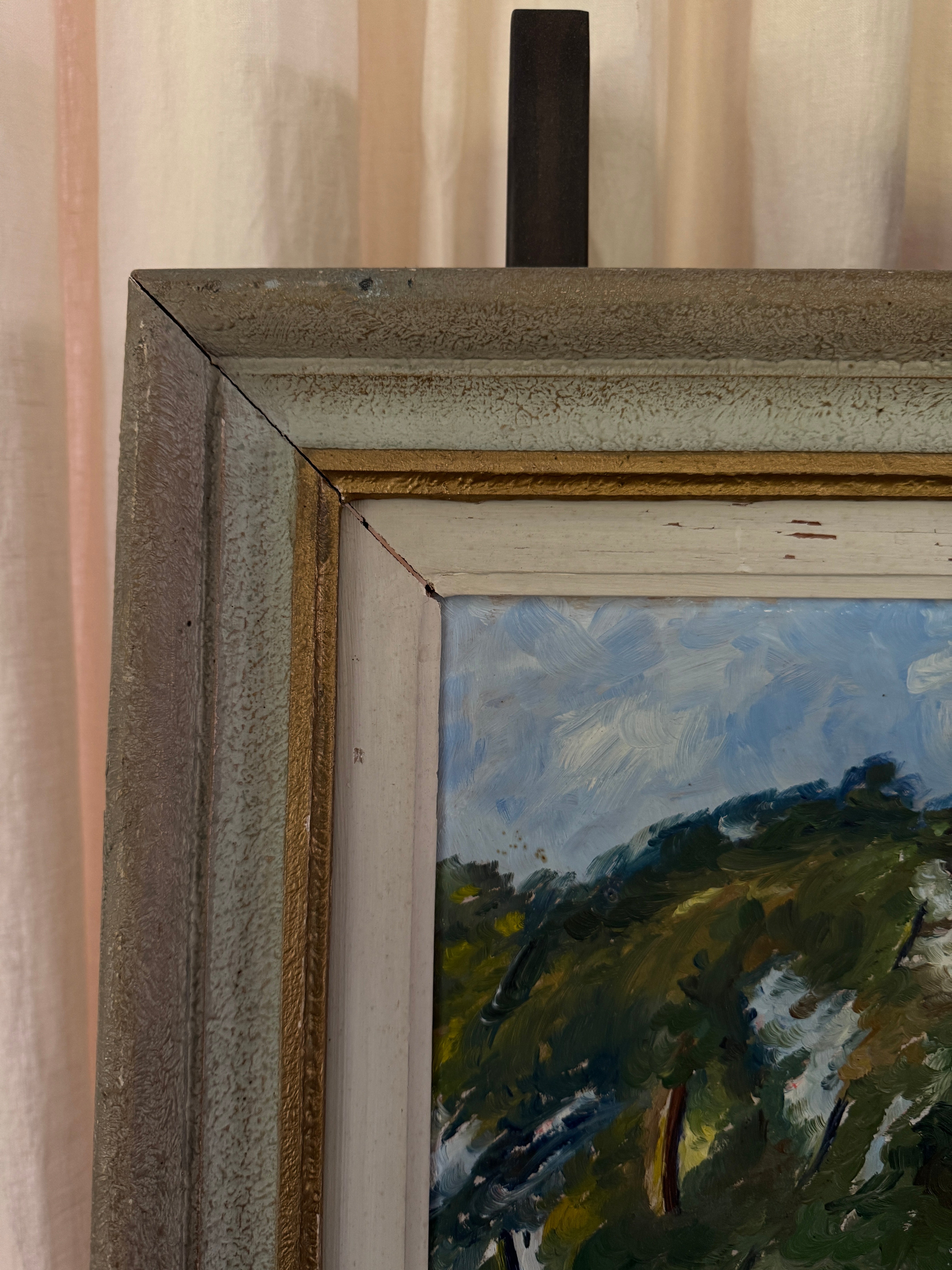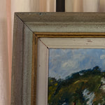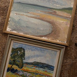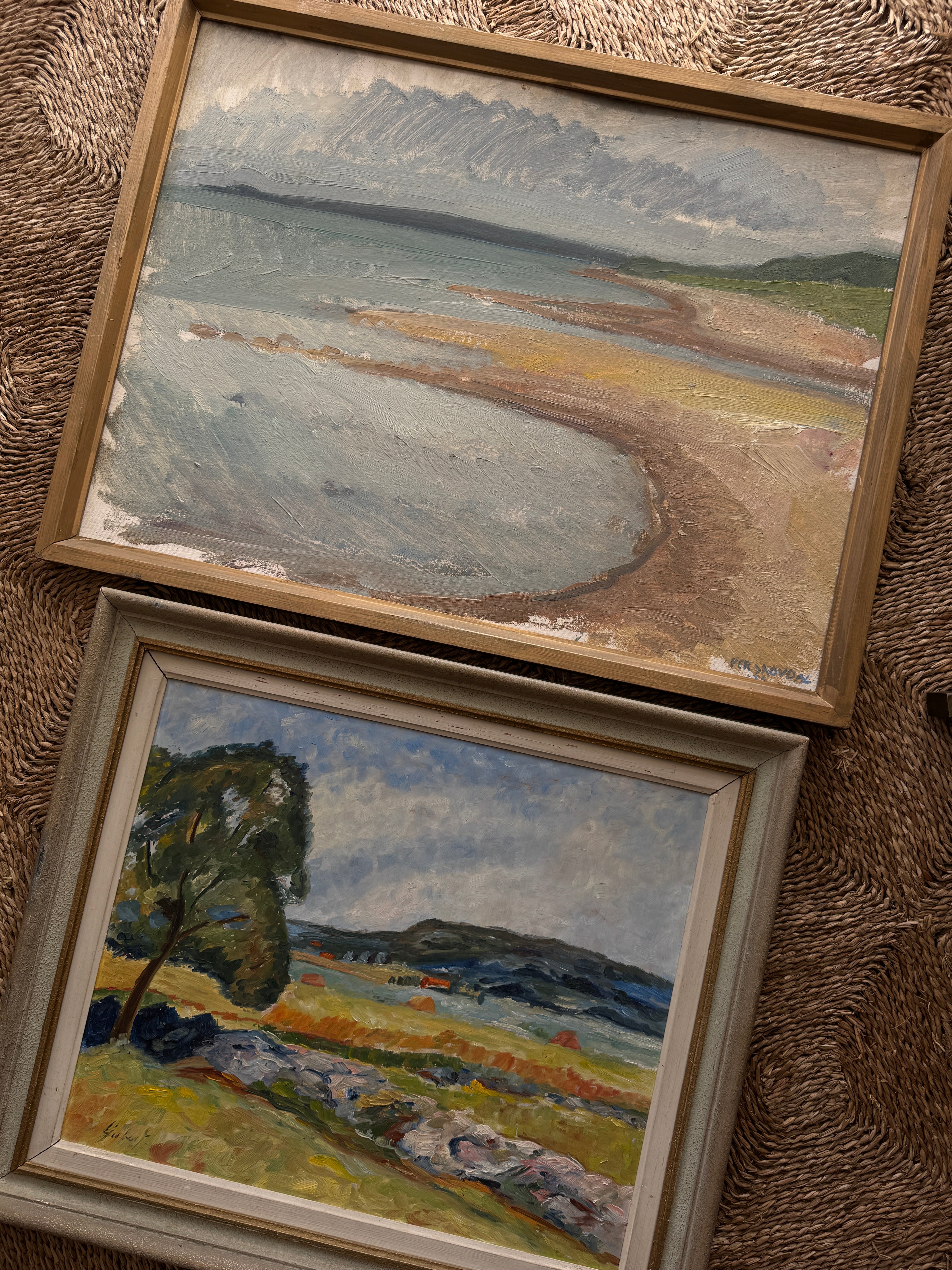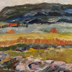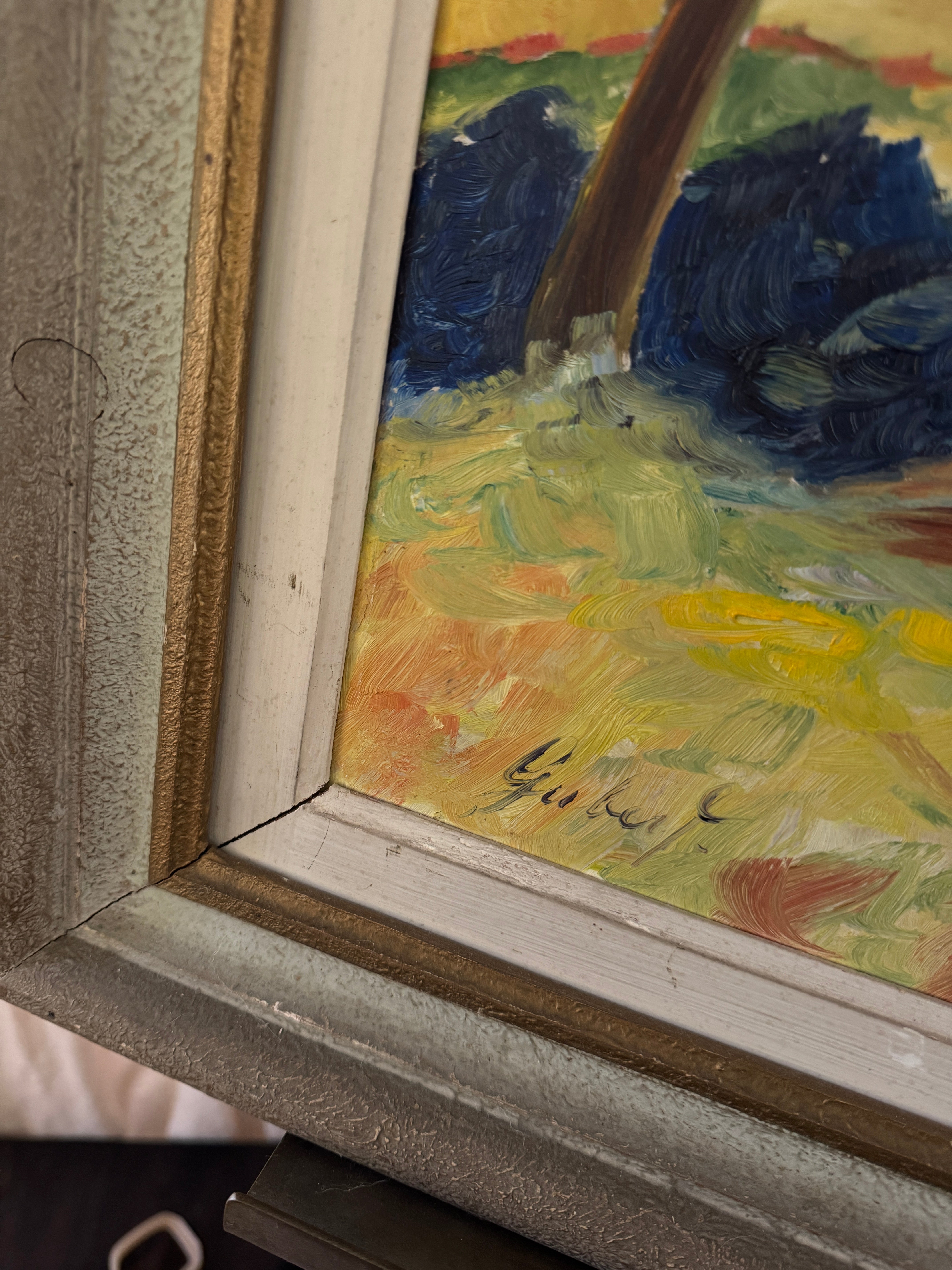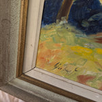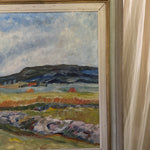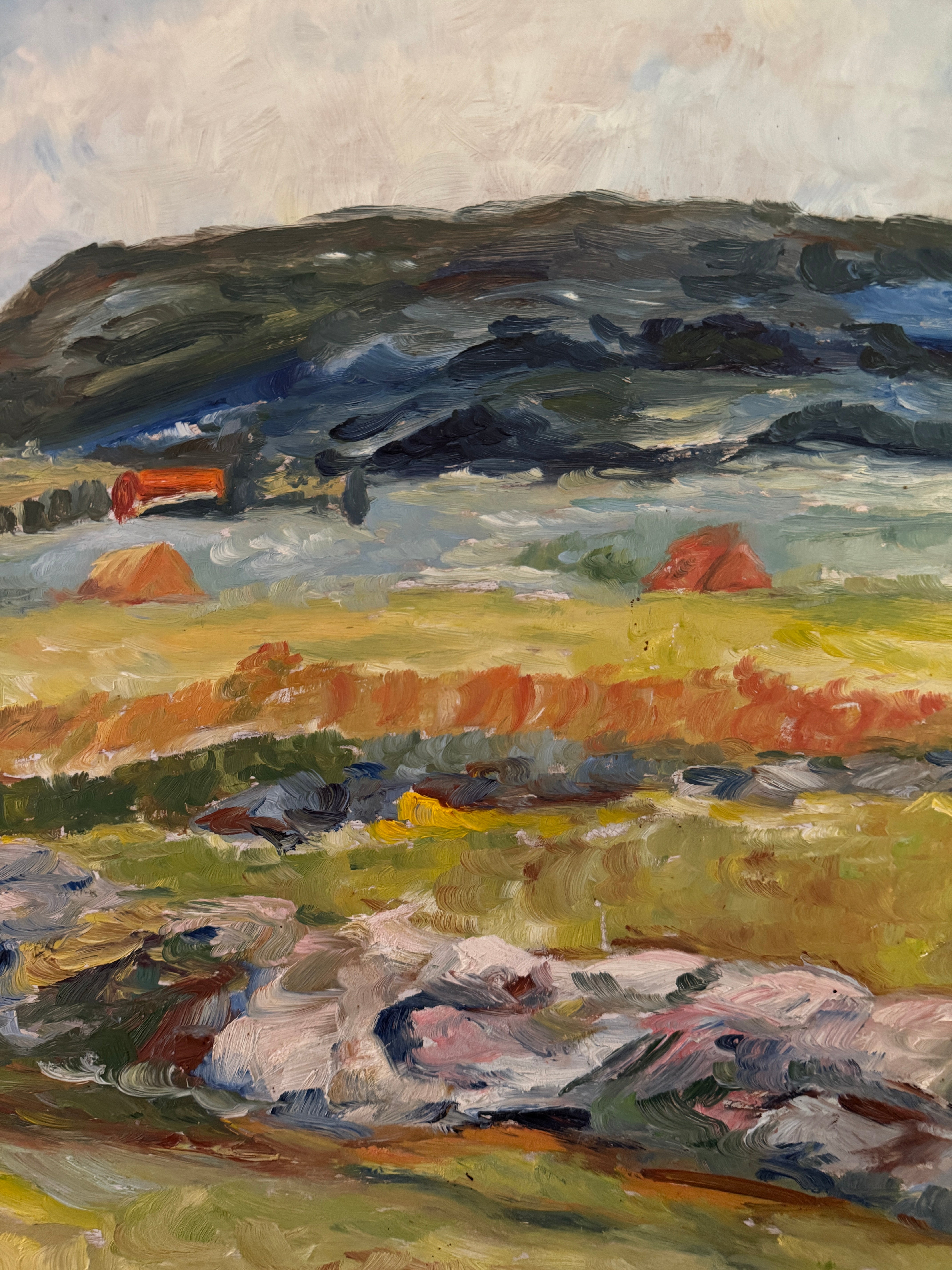 Here is a large Swedish oil on canvas, brimming with movement and light. The artist’s fluid brushwork captures a windswept landscape where ochre fields meet the deep greens and blues of the horizon. There’s a lyrical rhythm in the way the tree bends toward the breeze and the stone wall carves its gentle path through the countryside. The palette, earthy yet enlivened by strokes of cobalt and gold, feels romantic, a celebration of rural serenity rendered through expressive, modernist eyes.