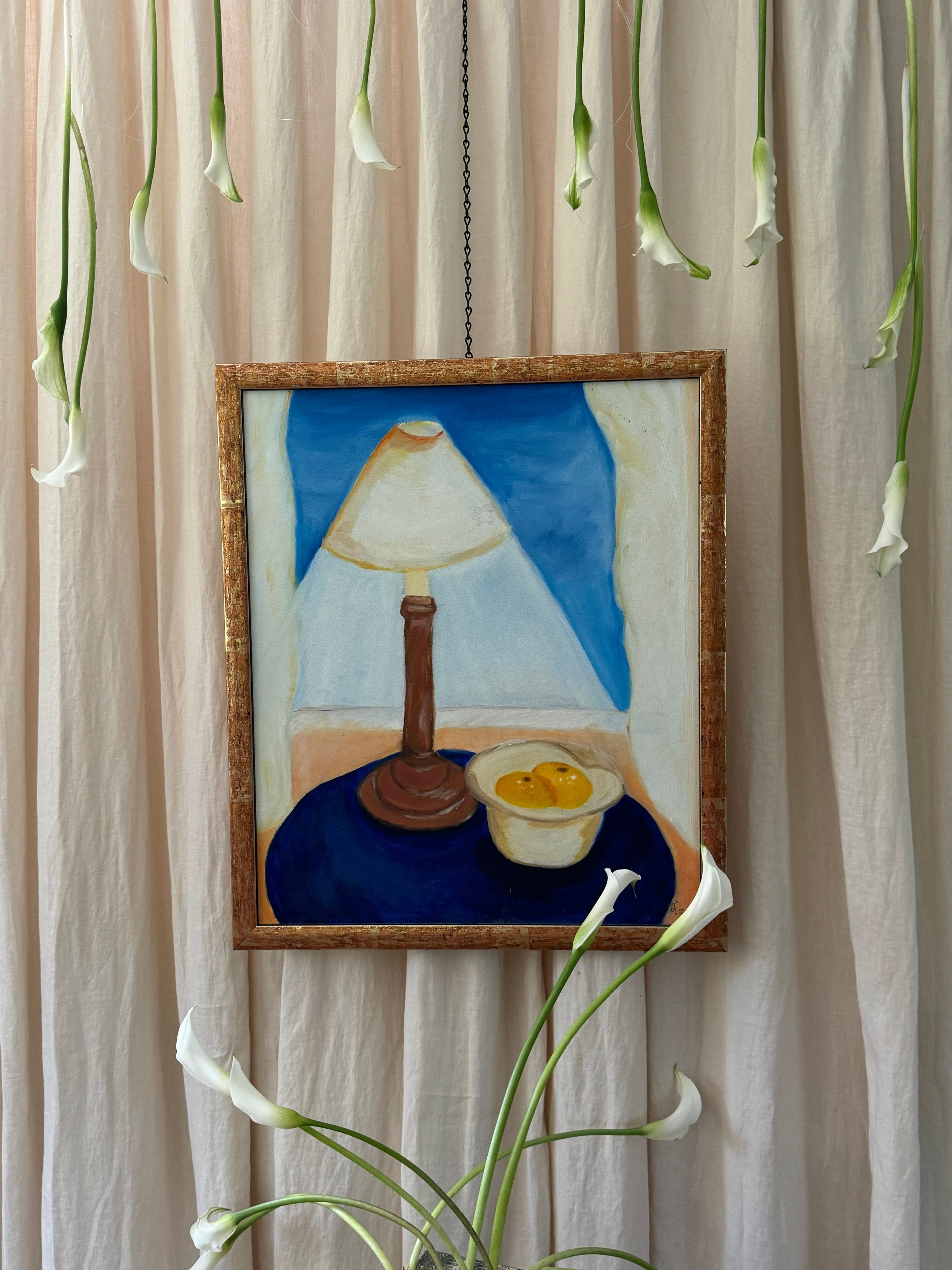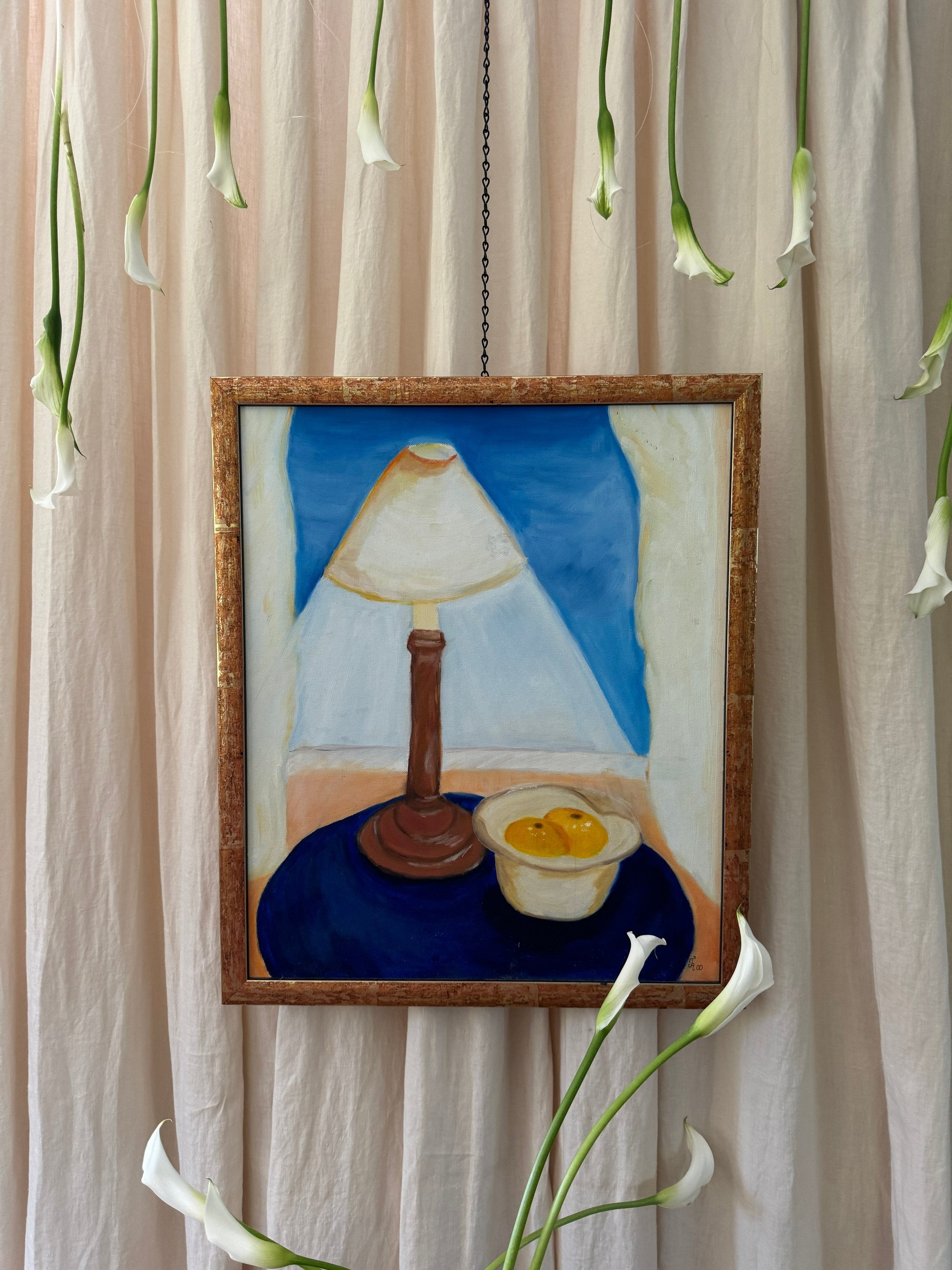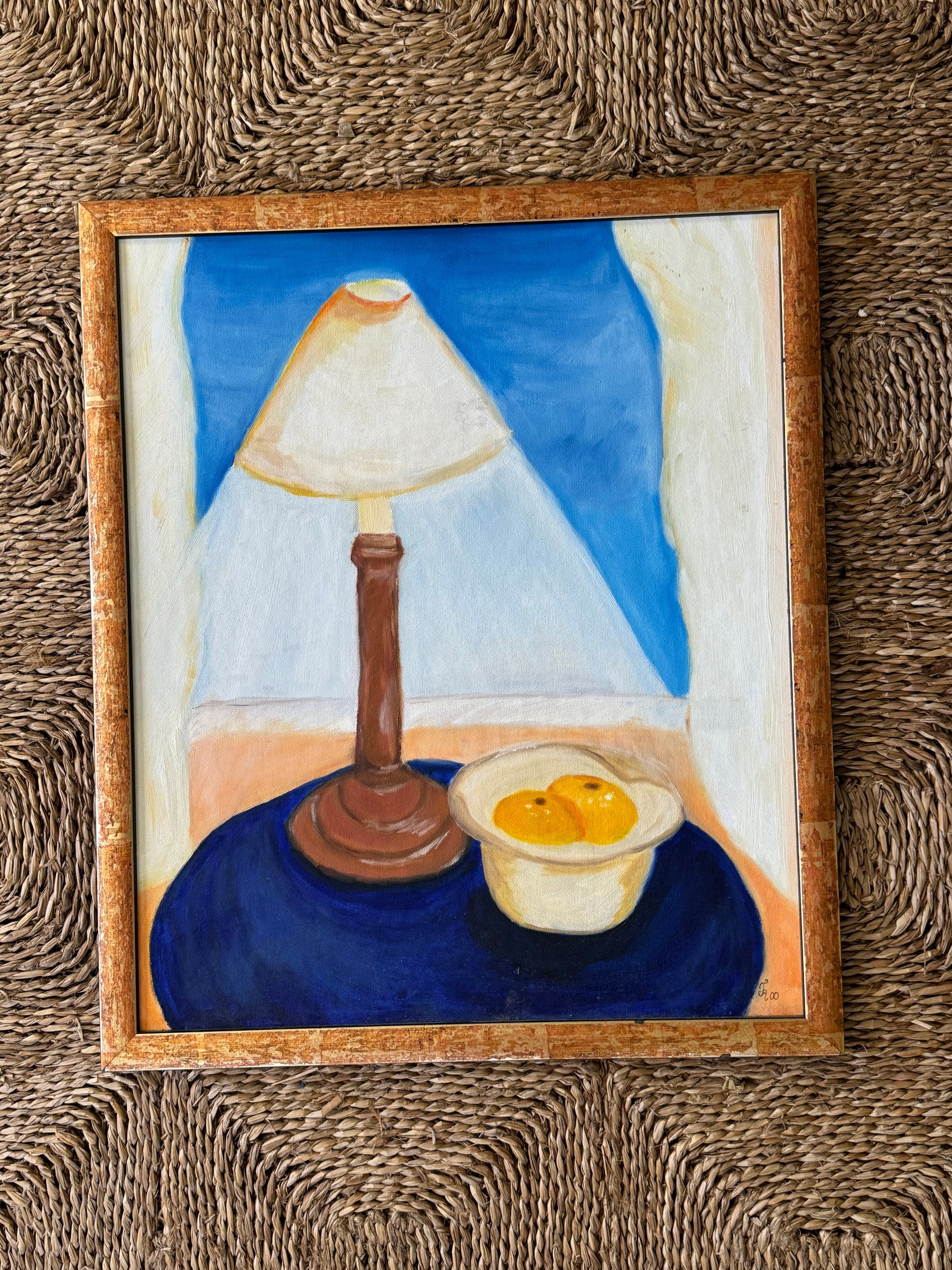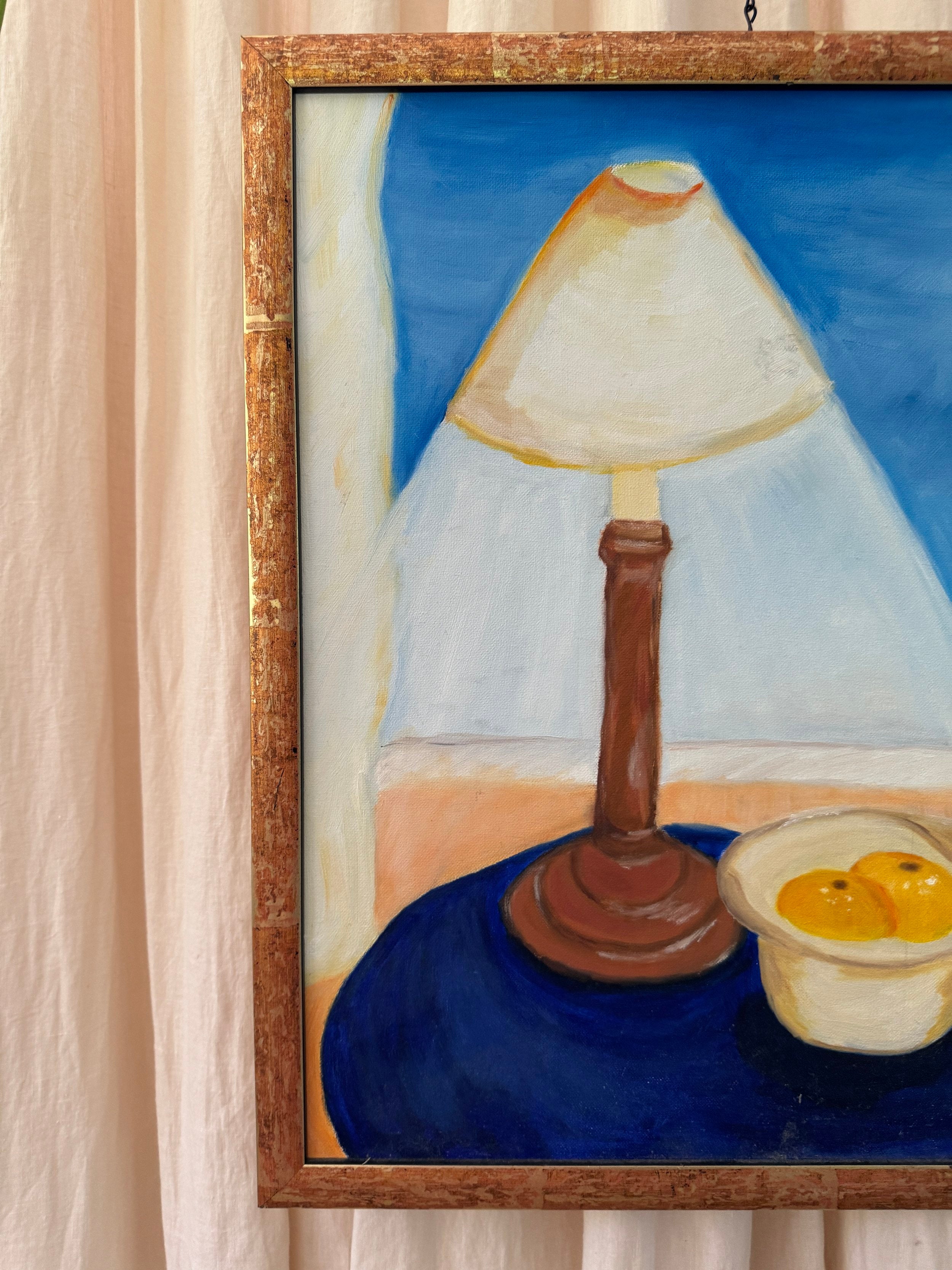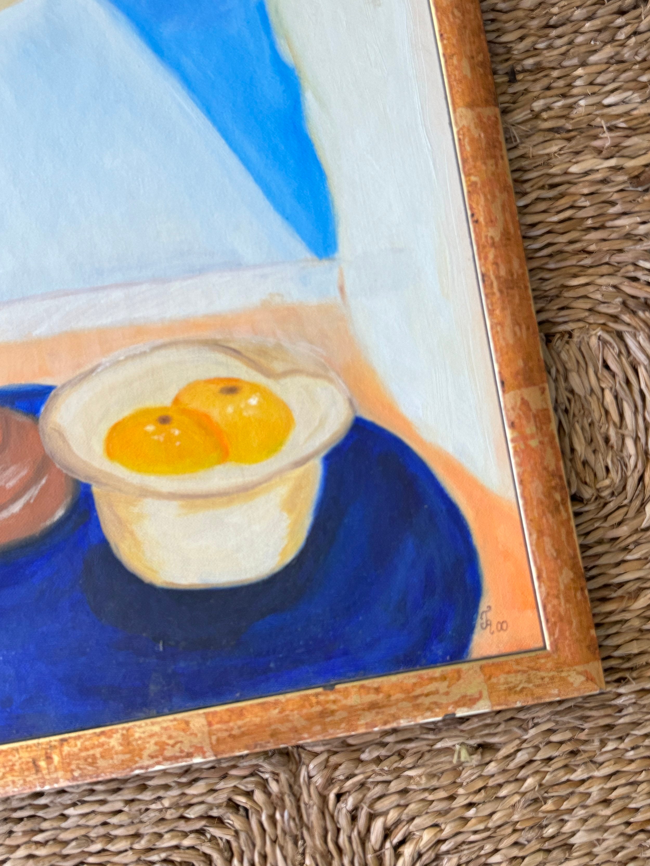 A charming vintage still life in oil on canvas, signed and dated 2000. The composition features a table lamp and a bowl of oranges, painted in bold, simplified forms with strong blocks of color. The artist’s use of luminous blues and warm ochres gives the work a distinctly modernist feel, balancing domestic intimacy with a sense of abstraction. Both nostalgic and contemporary in spirit, this piece captures the poetry of everyday life in a playful manner.