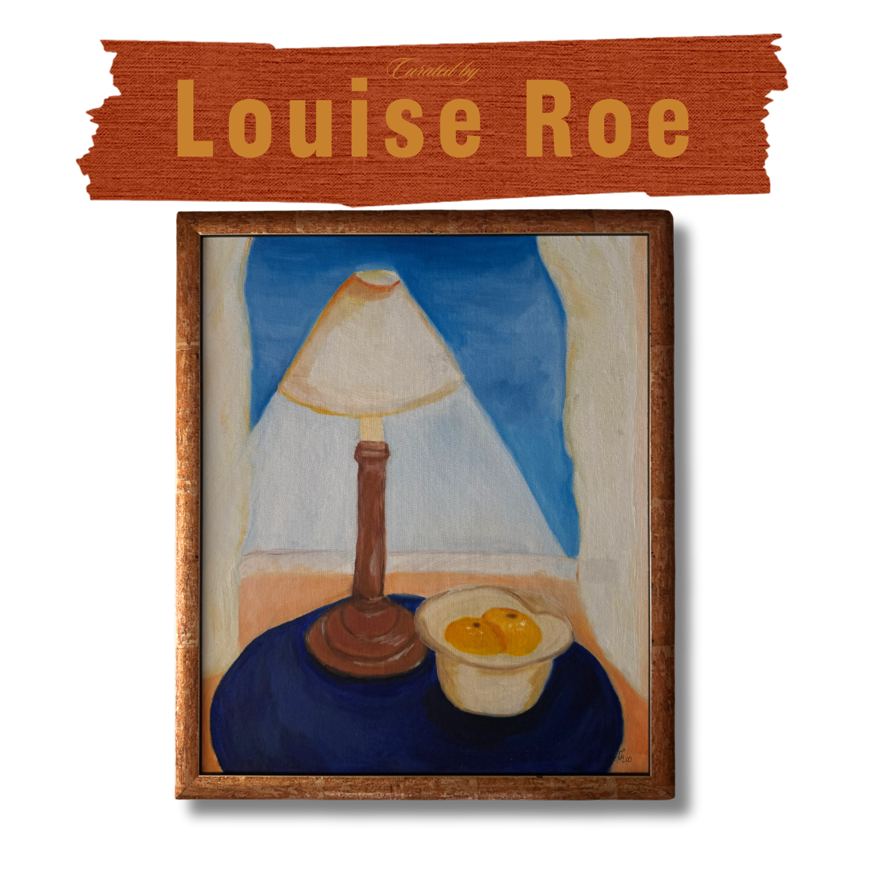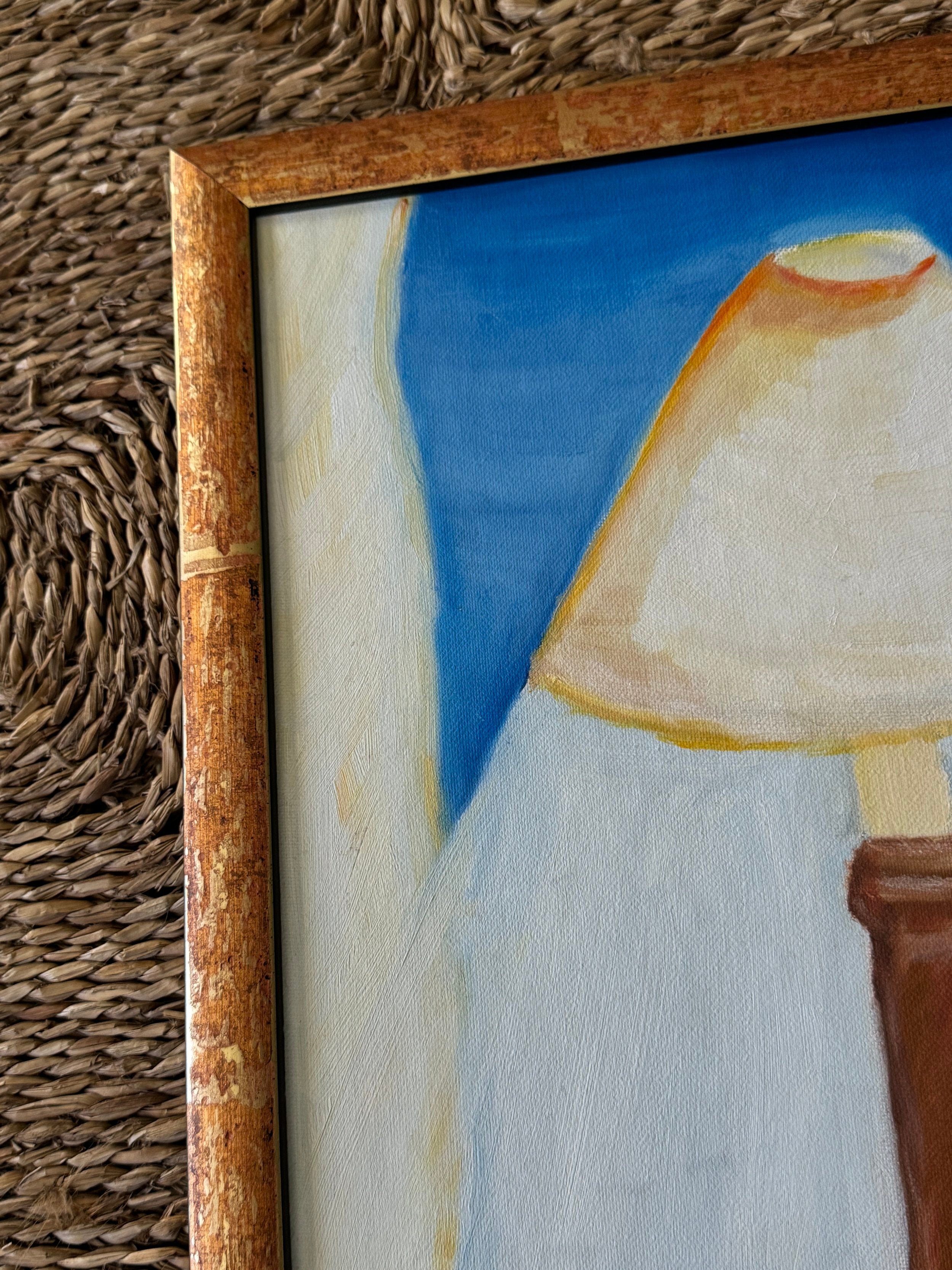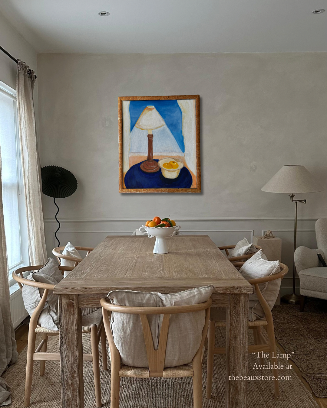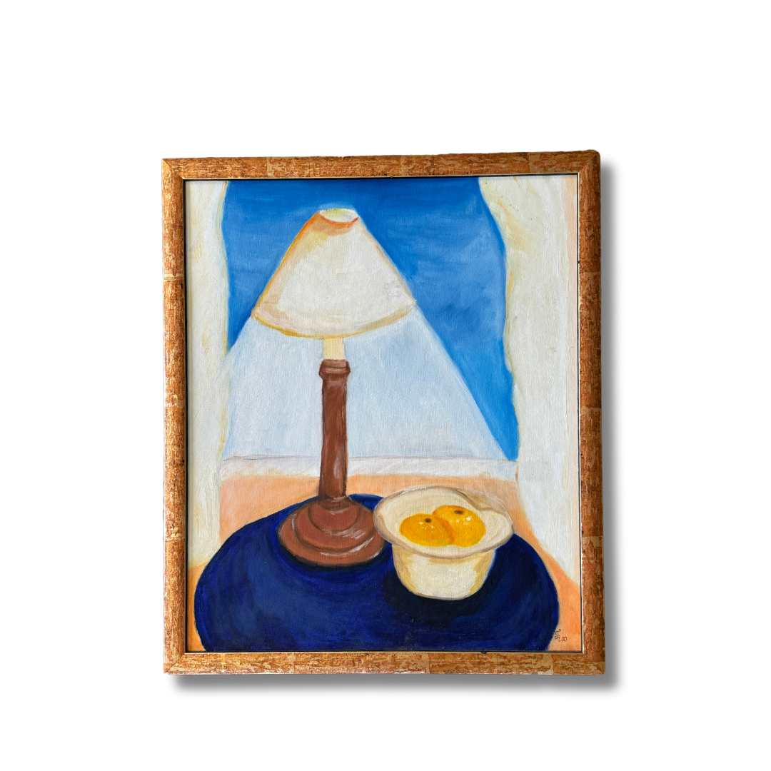 A charming vintage still life in oil on canvas, signed and dated 2000. The composition features a table lamp and a bowl of oranges, painted in bold, simplified forms with strong blocks of color. The artist’s use of luminous blues and warm ochres gives the work a distinctly modernist feel, balancing domestic intimacy with a sense of abstraction. Both nostalgic and contemporary in spirit, this piece captures the poetry of everyday life in a playful manner.