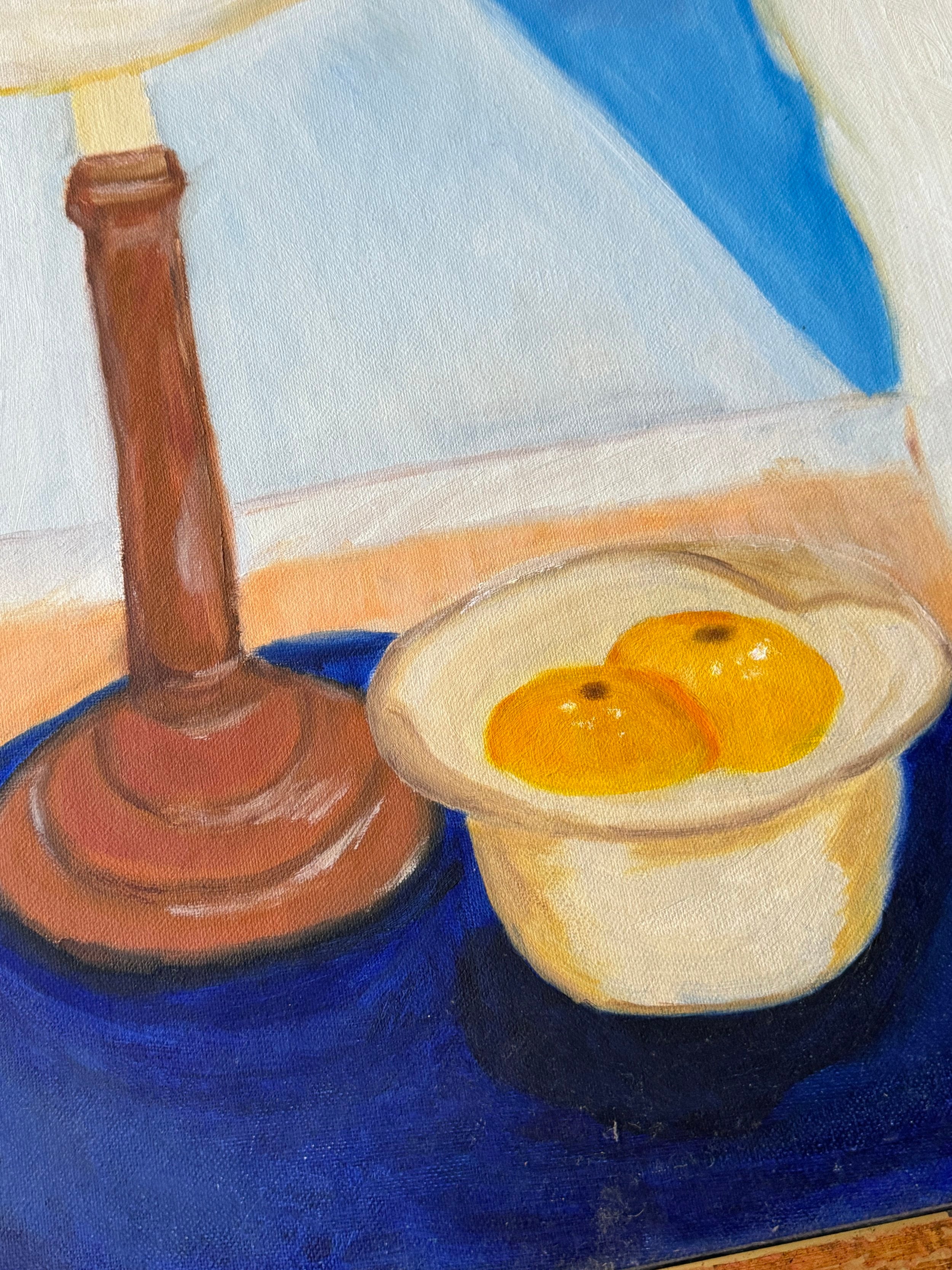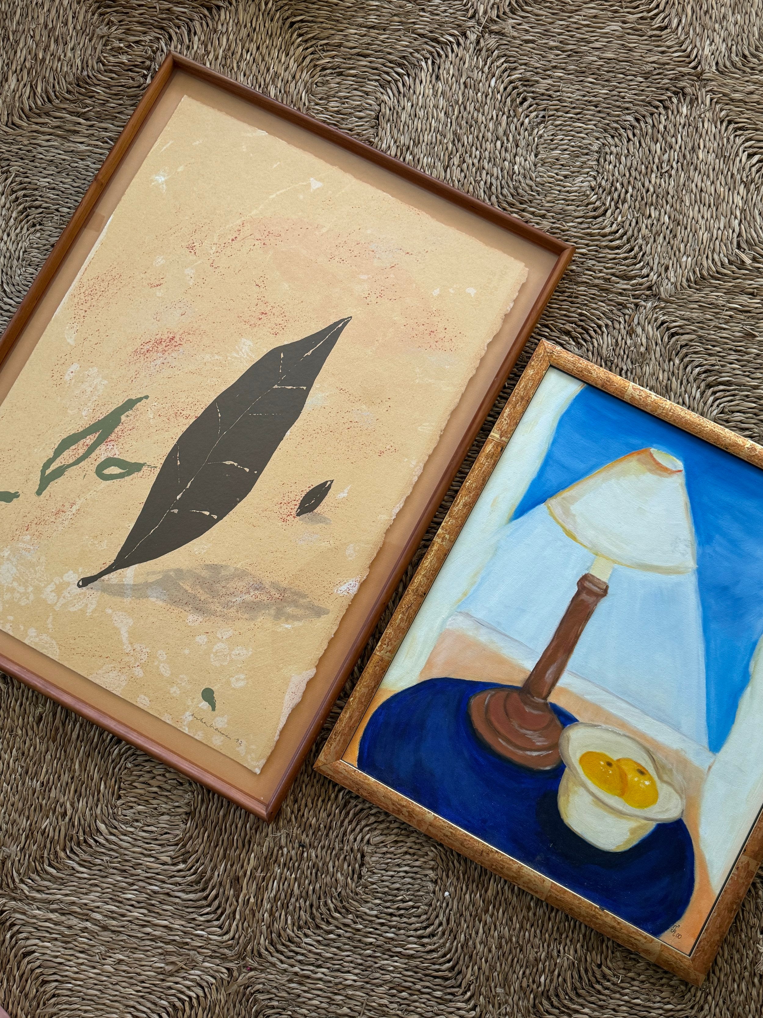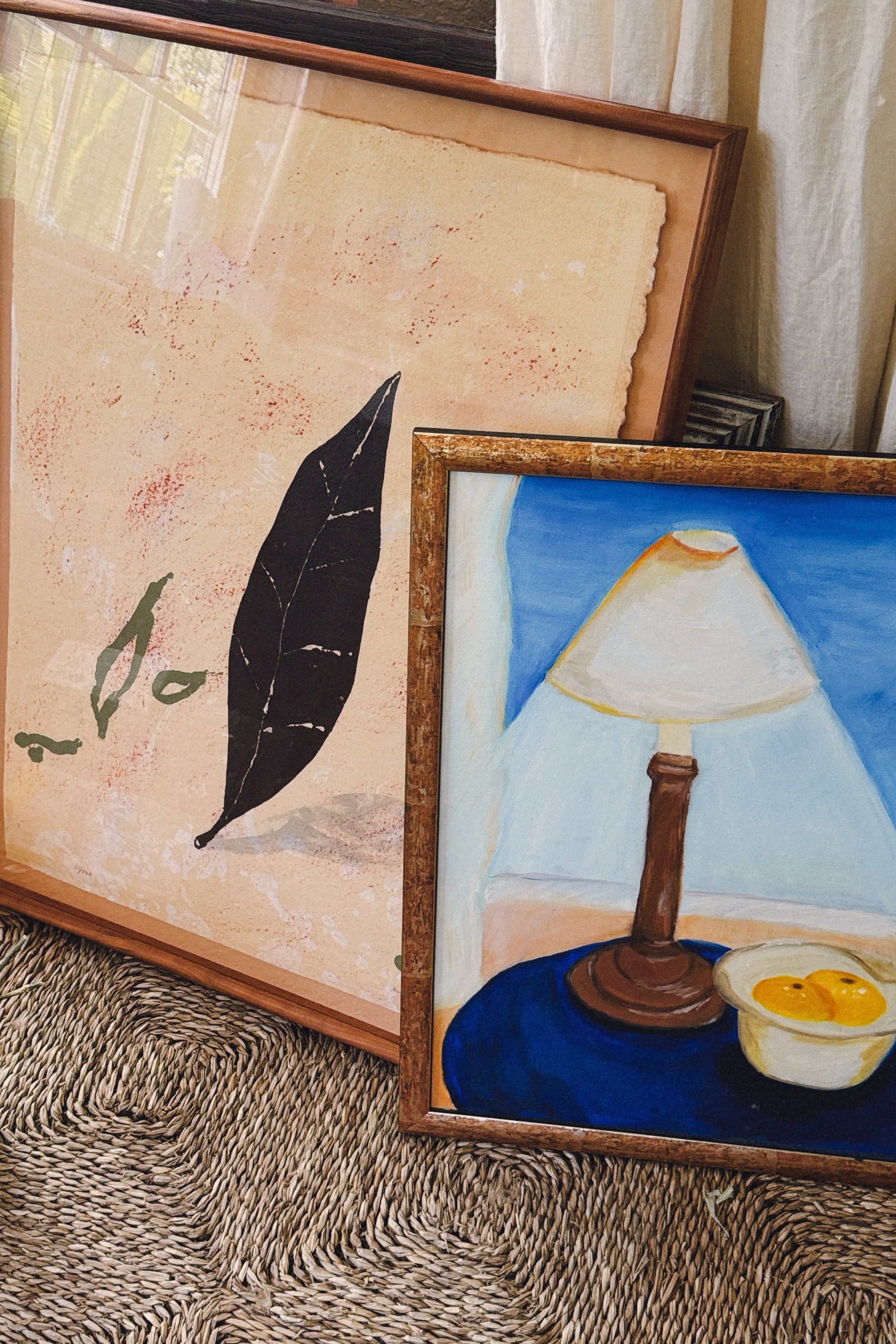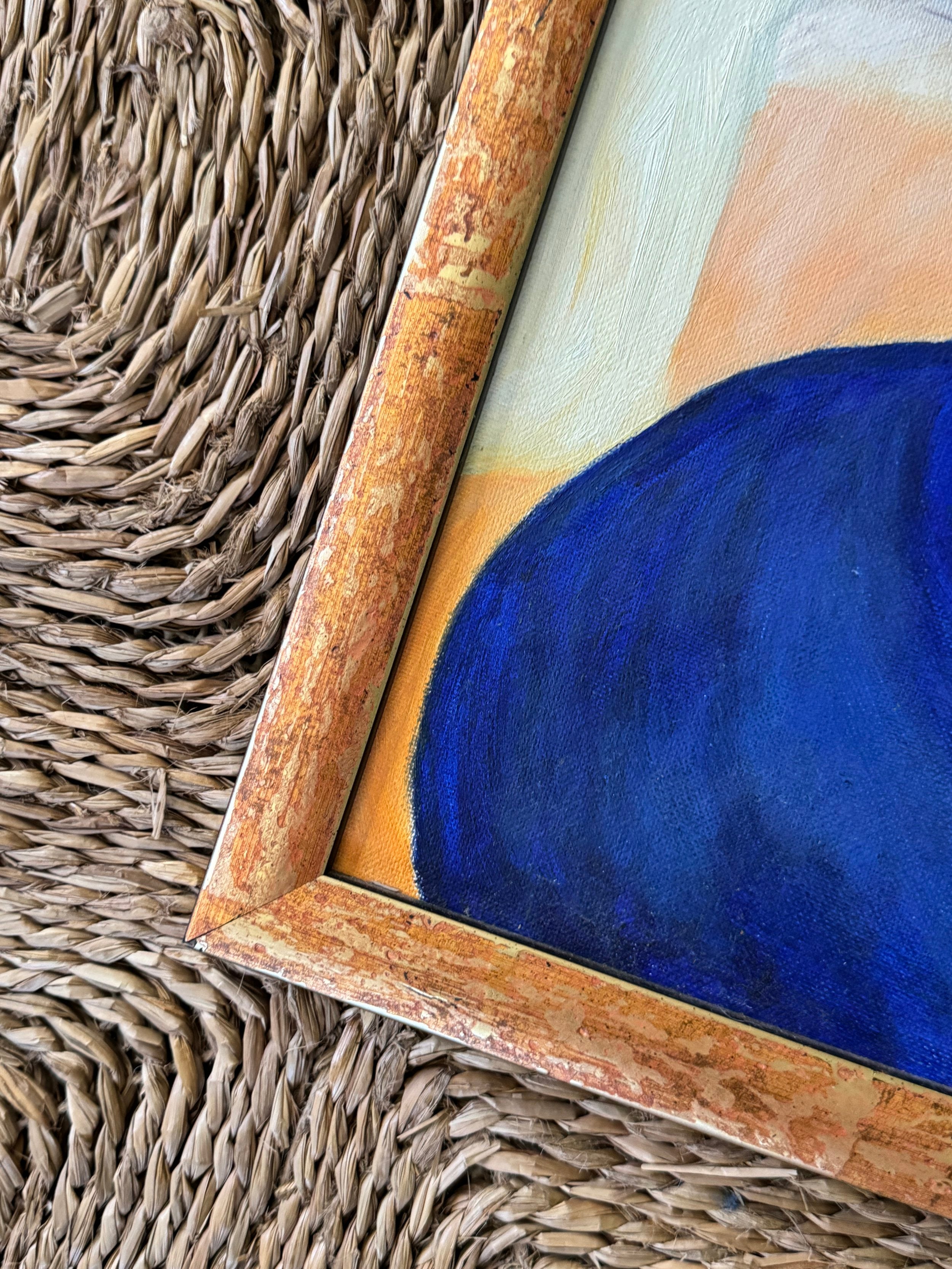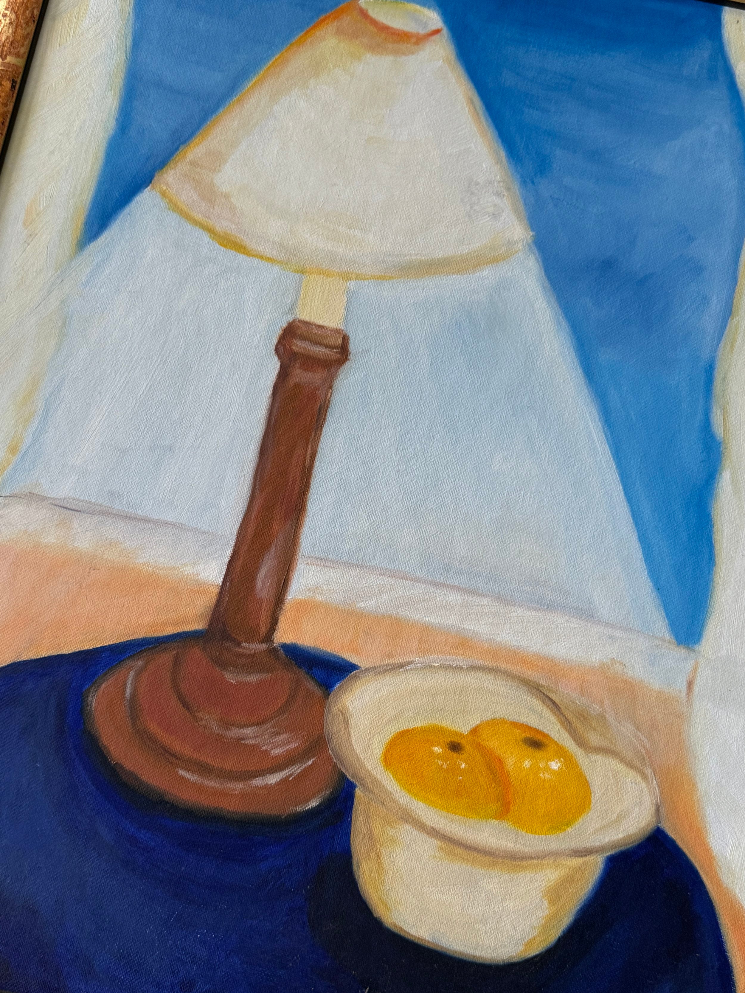 A charming vintage still life in oil on canvas, signed and dated 2000. The composition features a table lamp and a bowl of oranges, painted in bold, simplified forms with strong blocks of color. The artist’s use of luminous blues and warm ochres gives the work a distinctly modernist feel, balancing domestic intimacy with a sense of abstraction. Both nostalgic and contemporary in spirit, this piece captures the poetry of everyday life in a playful manner.