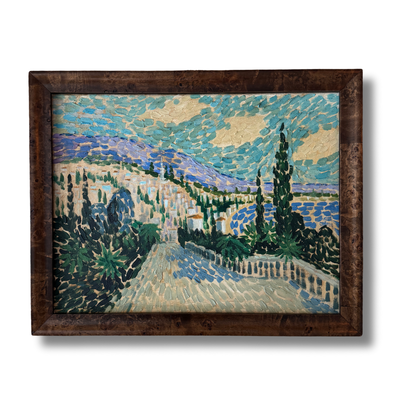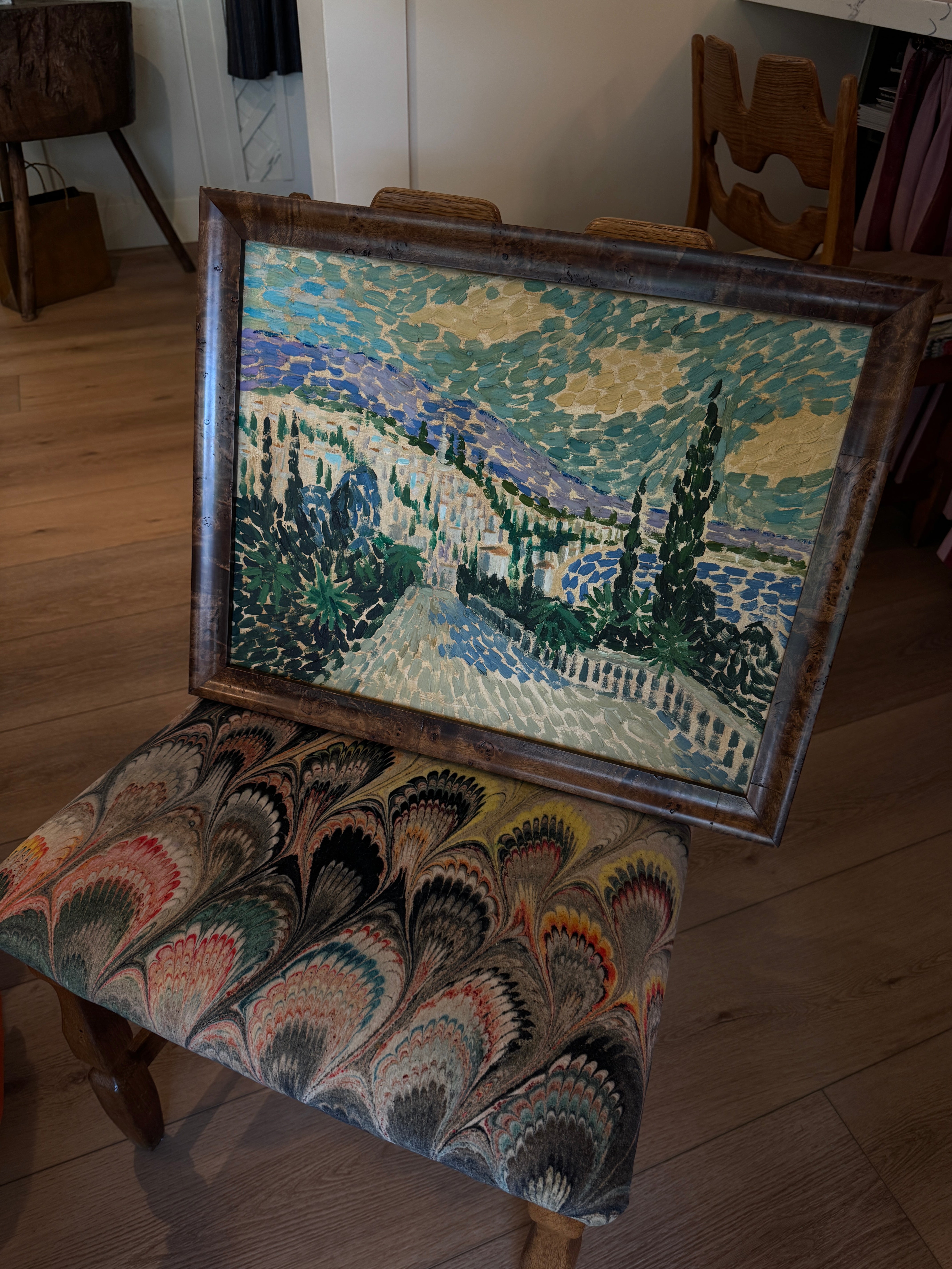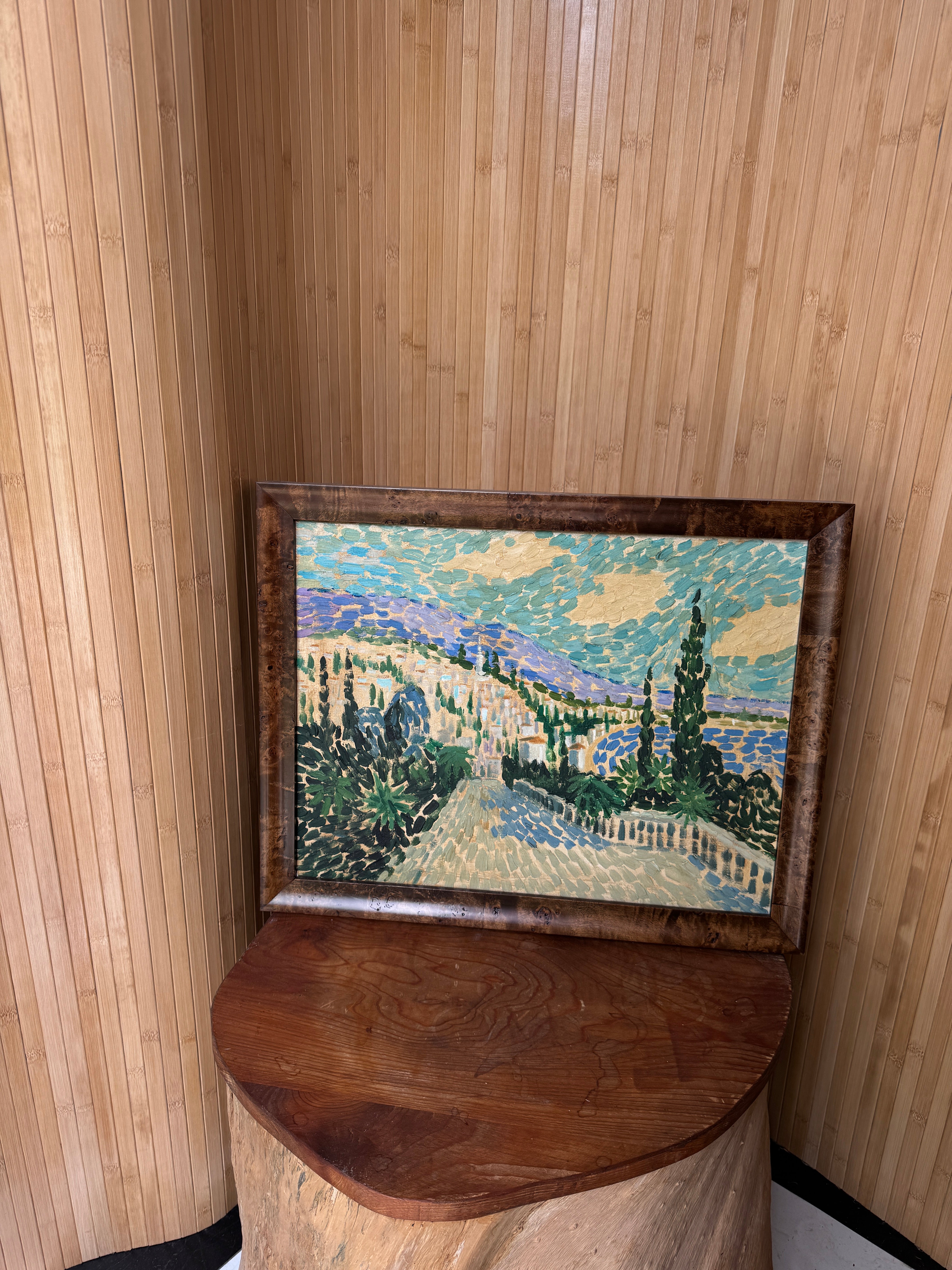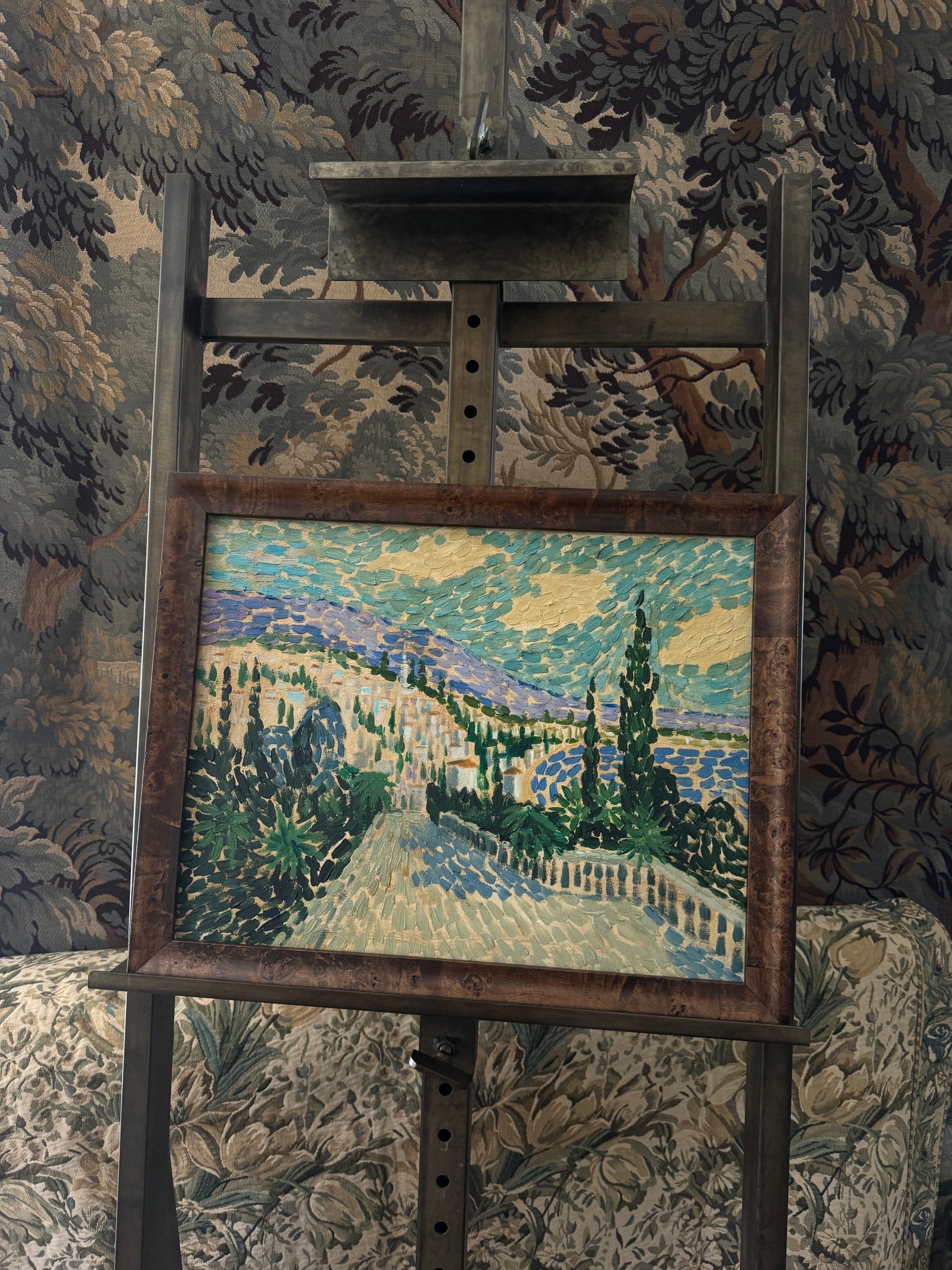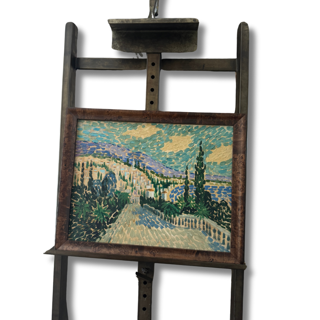 This French midcentury oil on canvas evokes the timeless beauty of the South of France with its vibrant depiction of a winding pathway leading toward distant lavender hills. The artist’s pointillistic and rhythmic brushstrokes, characteristic of the midcentury modernist movement, bring the scene to life with texture and depth, capturing the rich interplay of light and landscape. The cypress trees and lush greenery stand as quintessential markers of Provence, while the serene, sunlit atmosphere invites us to lose ourselves in its peaceful charm.