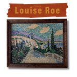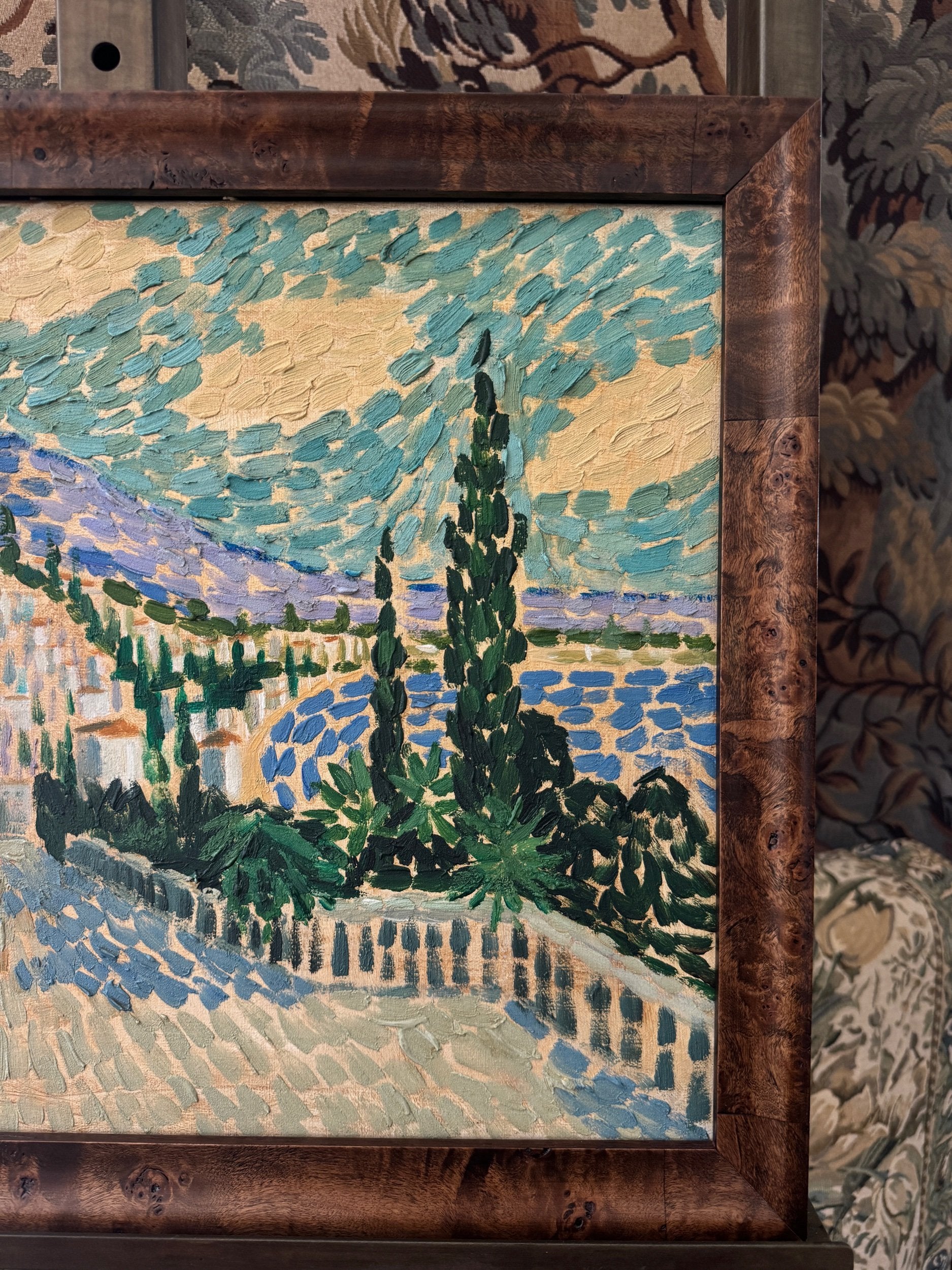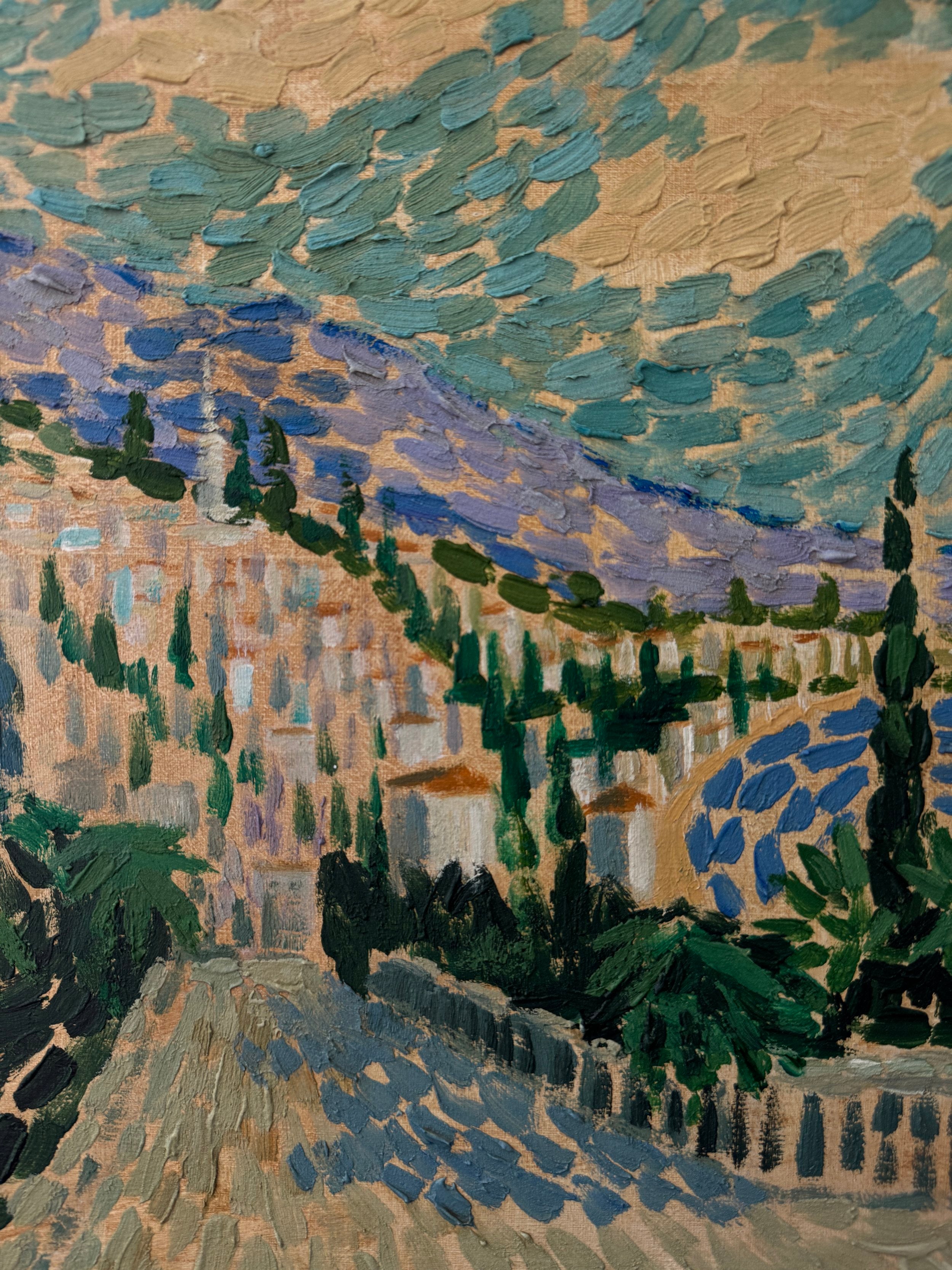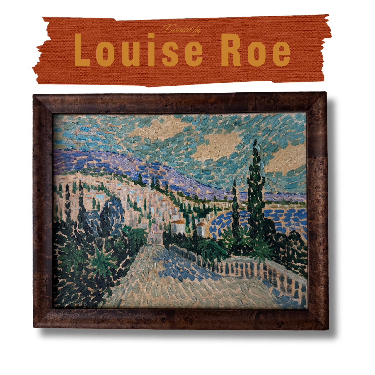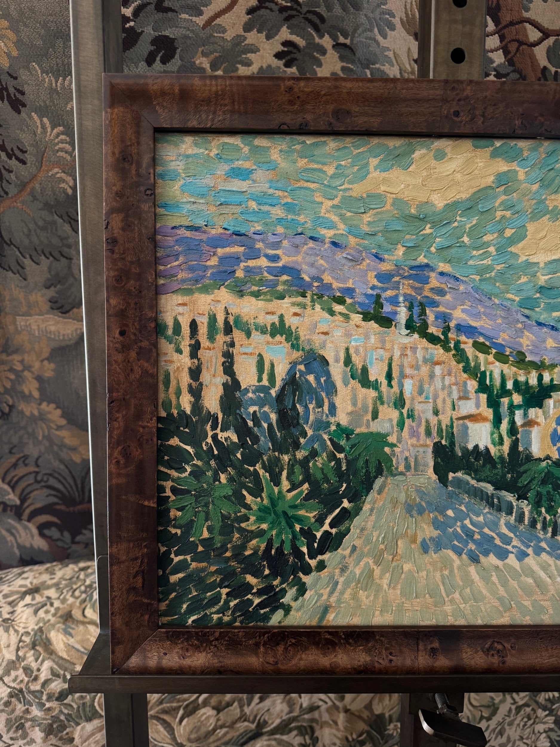 This French midcentury oil on canvas evokes the timeless beauty of the South of France with its vibrant depiction of a winding pathway leading toward distant lavender hills. The artist’s pointillistic and rhythmic brushstrokes, characteristic of the midcentury modernist movement, bring the scene to life with texture and depth, capturing the rich interplay of light and landscape. The cypress trees and lush greenery stand as quintessential markers of Provence, while the serene, sunlit atmosphere invites us to lose ourselves in its peaceful charm.