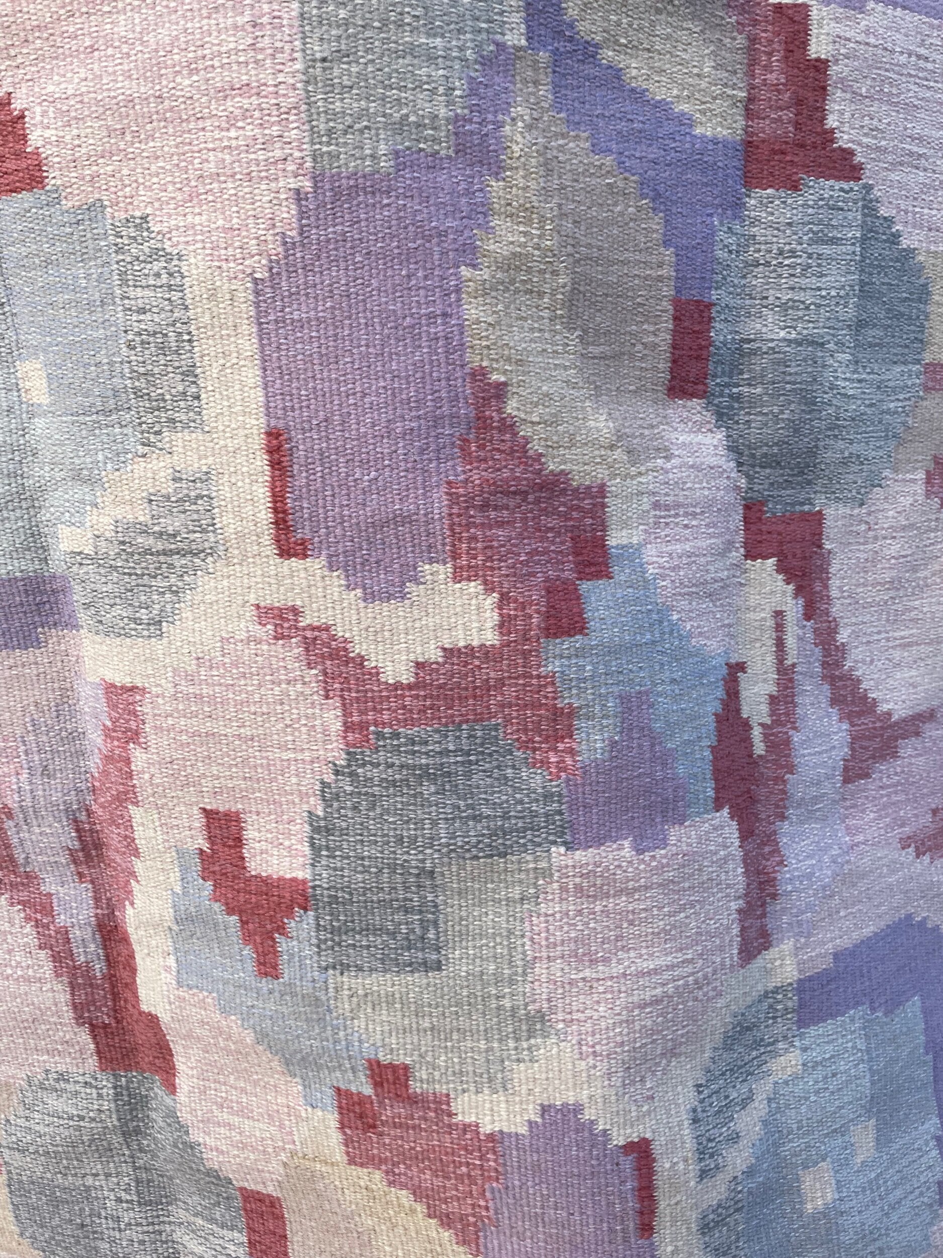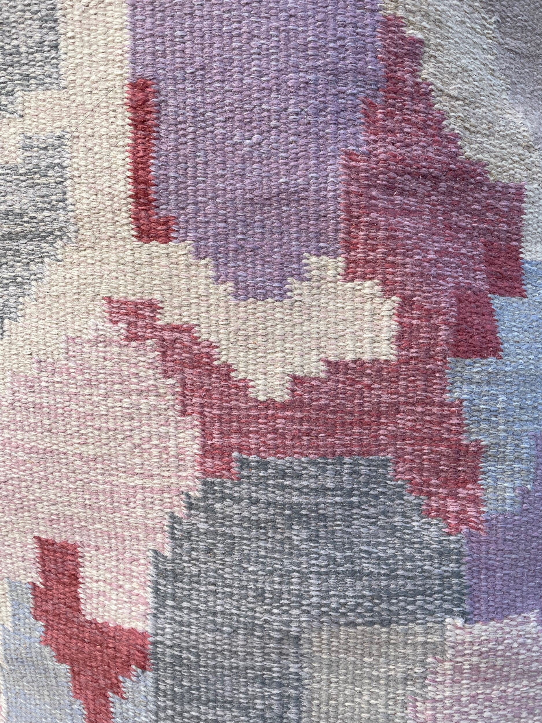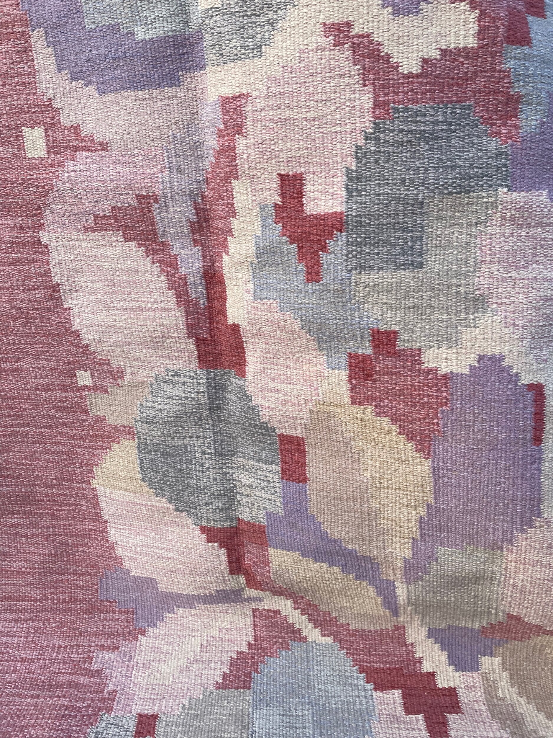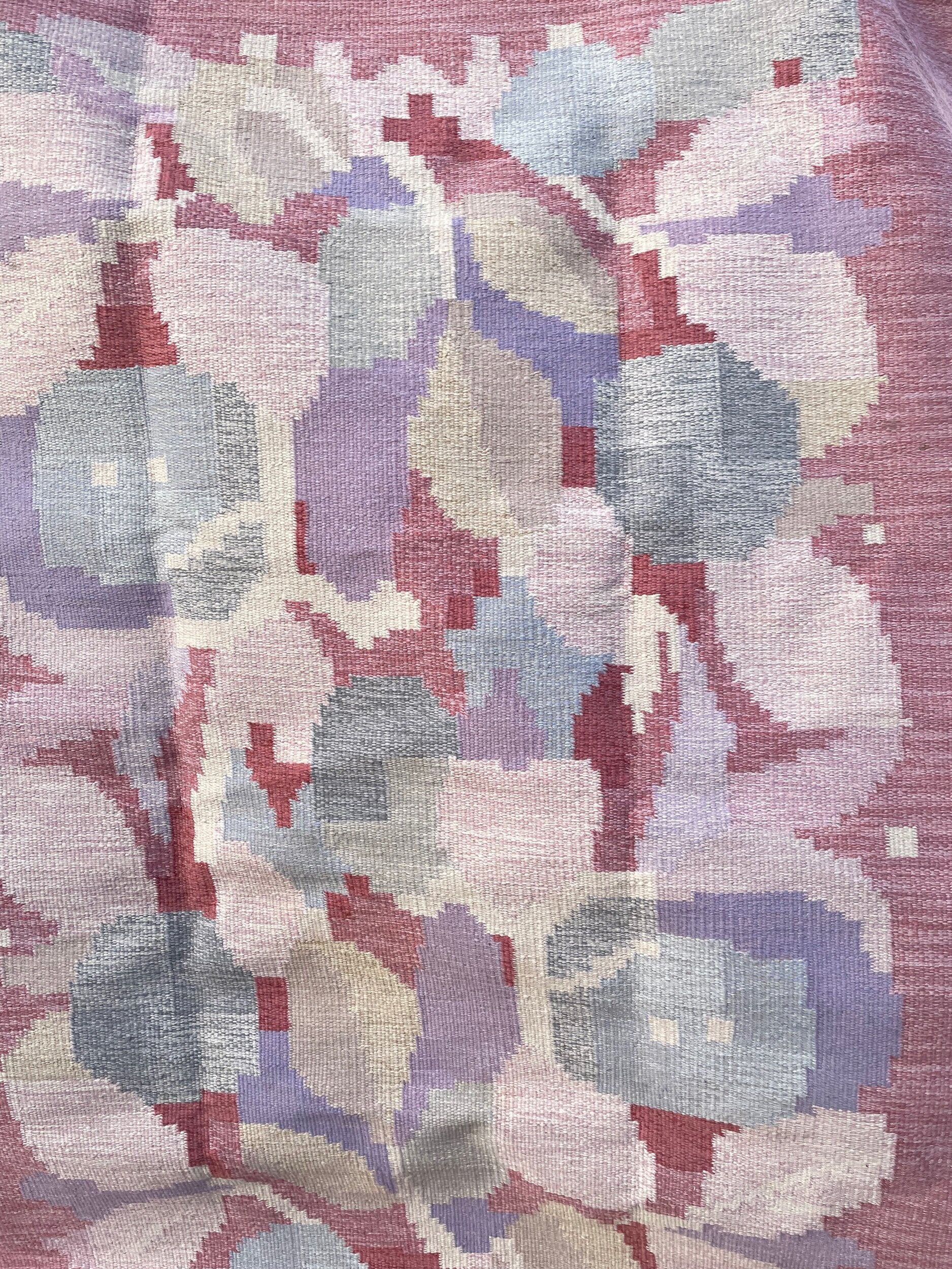 Designed by Swedish textile artist Ingegerd Silow, this handwoven flatweave rug embodies the midcentury Scandinavian approach to color and form. Shades of lilac, rose, sky blue, and ivory are arranged in a softly geometric floral motif, their tonal shifts lending depth without losing the rug’s clean graphic clarity. The palette is distinctly Silow; modern yet romantic, balancing softness with structure. Framed by a checkered border and finished with fringe, the rug brings warmth, texture, and a touch of Swedish design heritage to any interior. Both collectible and versatile, it speaks to the enduring beauty of Scandinavian craft. It is signed "IS" in the corner.