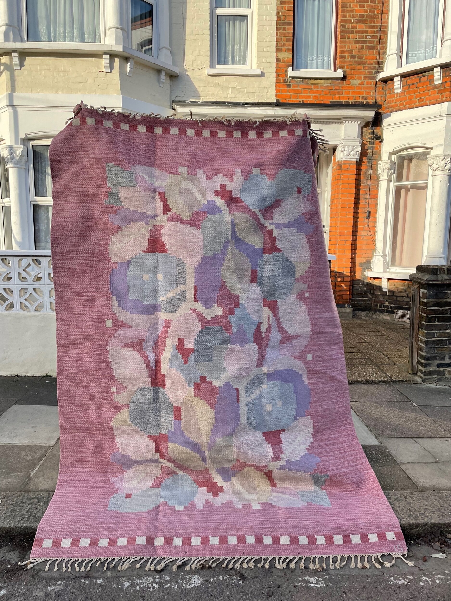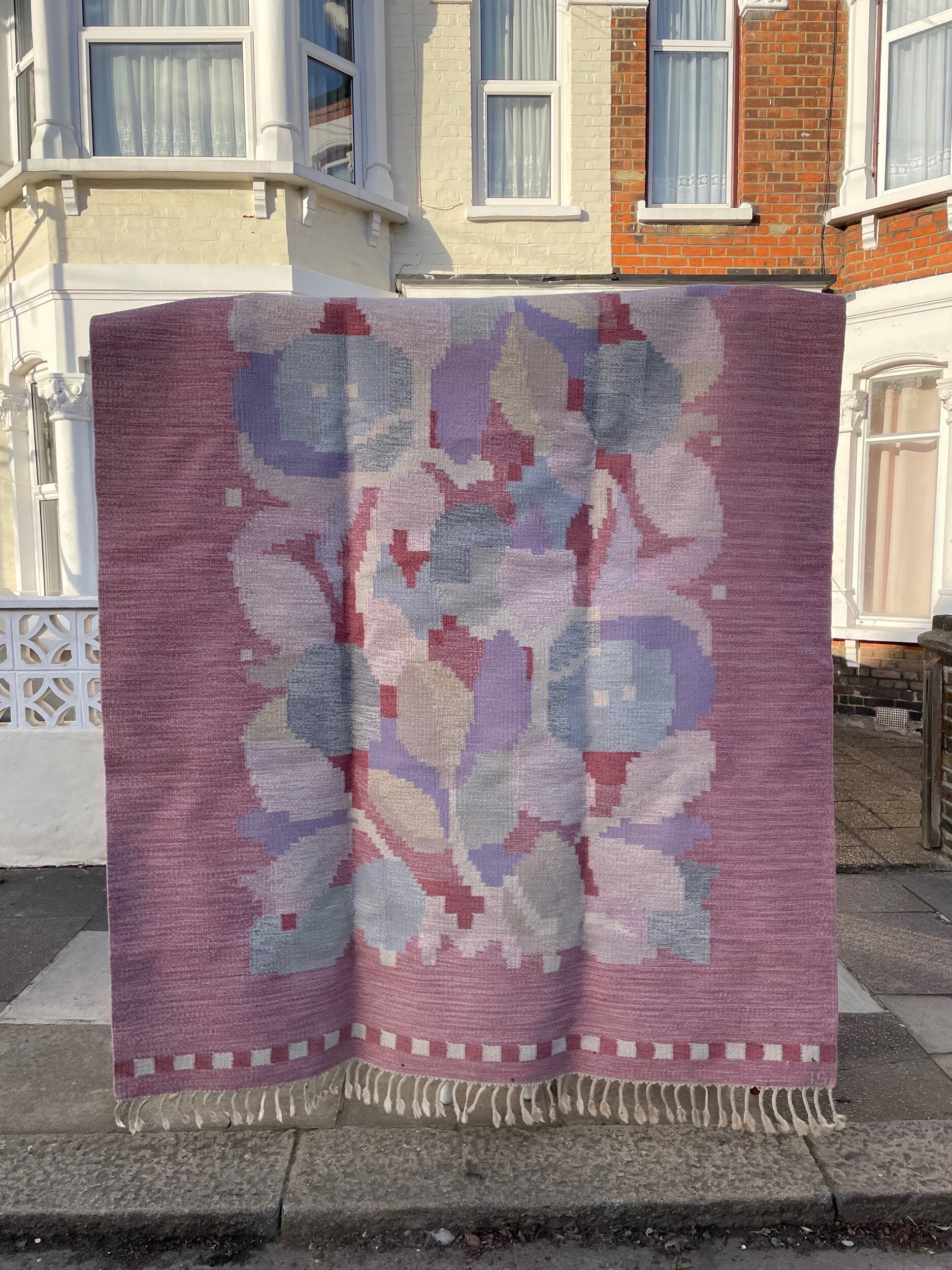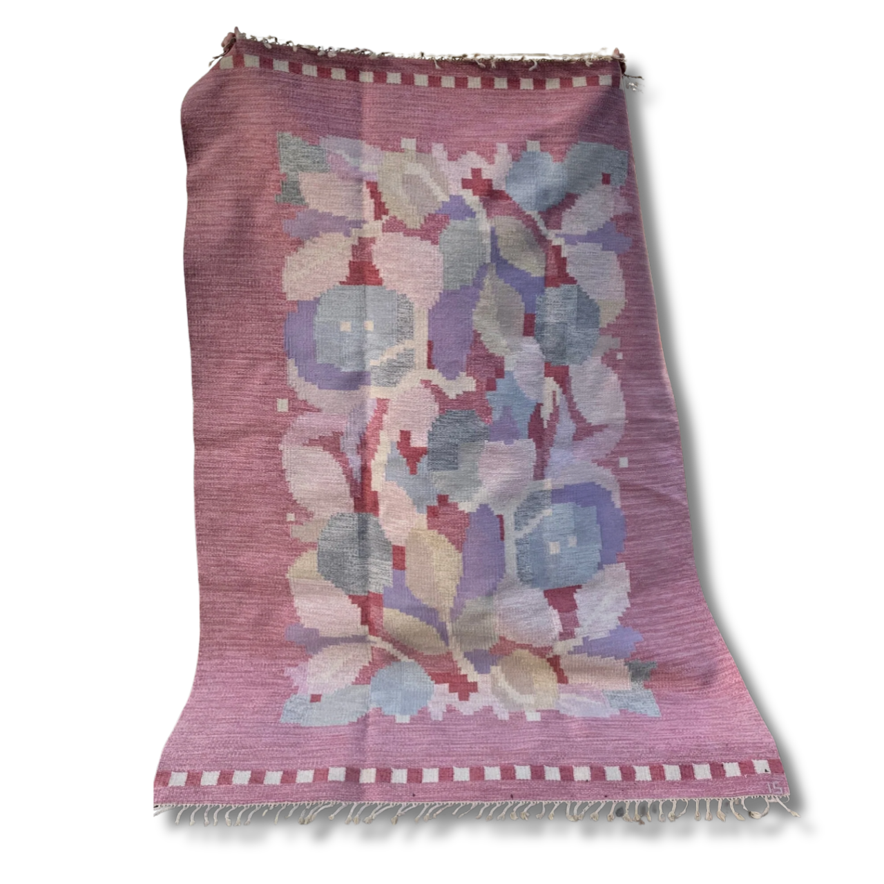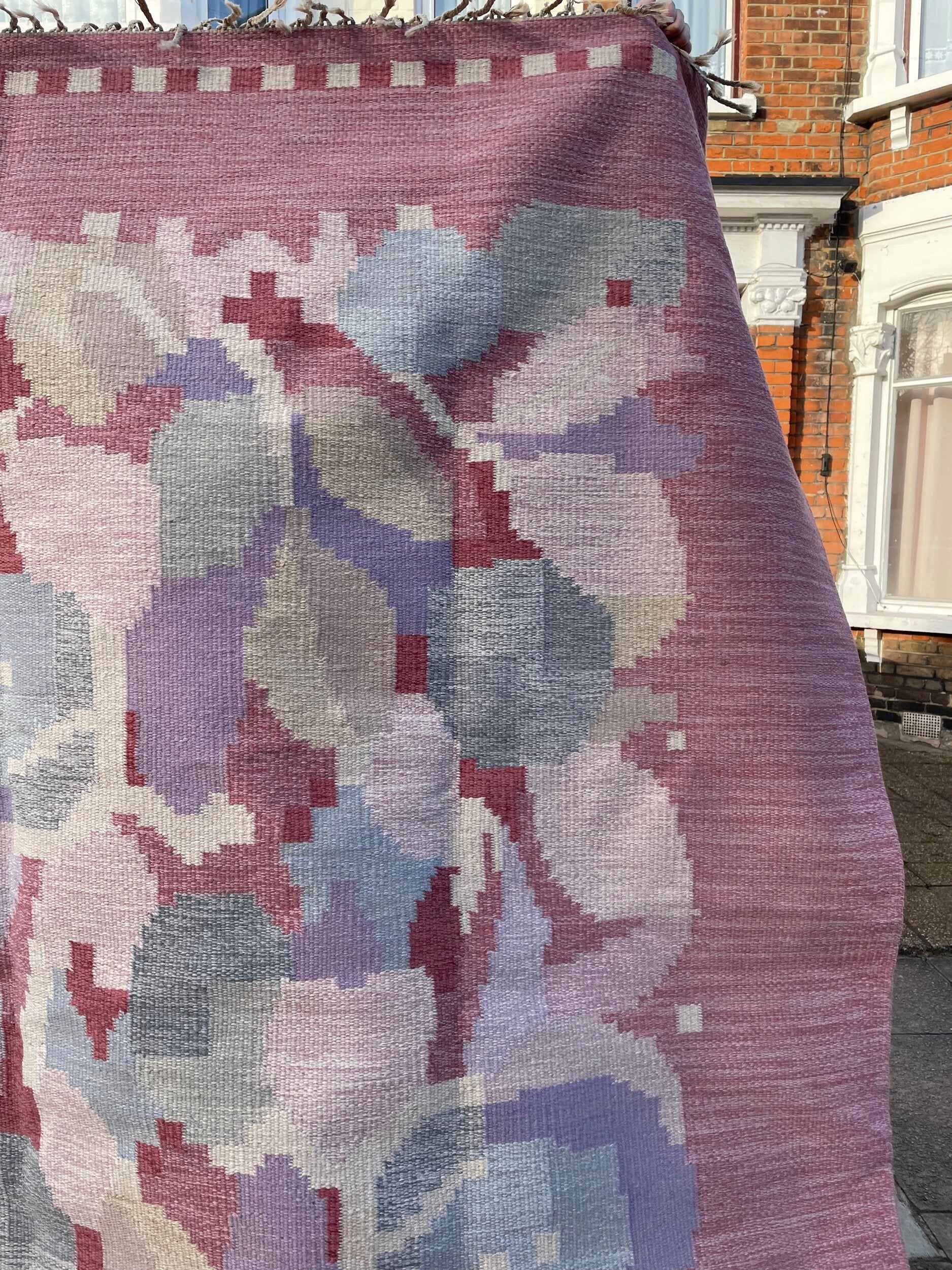Designed by Swedish textile artist Ingegerd Silow, this handwoven flatweave rug embodies the midcentury Scandinavian approach to color and form. Shades of lilac, rose, sky blue, and ivory are arranged in a softly geometric floral motif, their tonal shifts lending depth without losing the rug’s clean graphic clarity. The palette is distinctly Silow; modern yet romantic, balancing softness with structure. Framed by a checkered border and finished with fringe, the rug brings warmth, texture, and a touch of Swedish design heritage to any interior. Both collectible and versatile, it speaks to the enduring beauty of Scandinavian craft. It is signed "IS" in the corner.