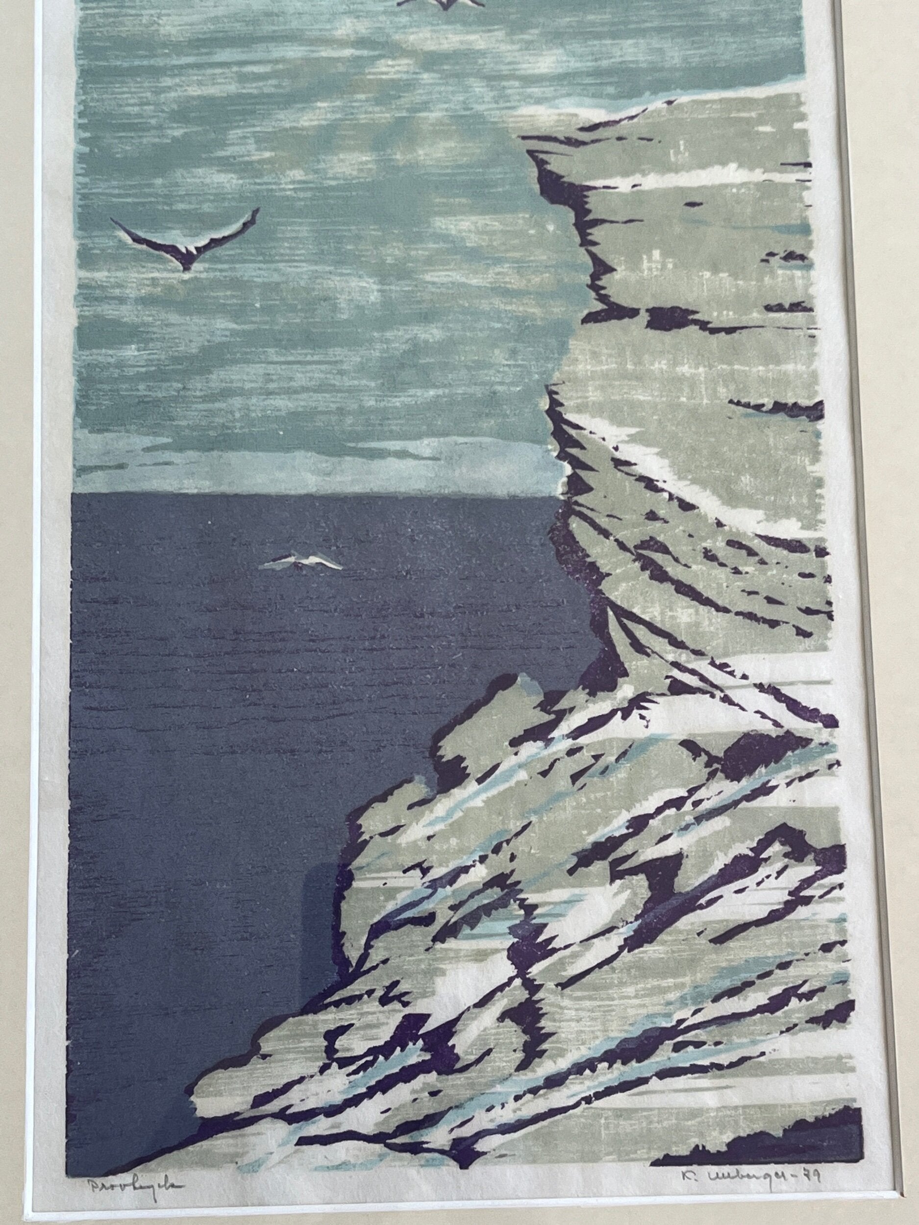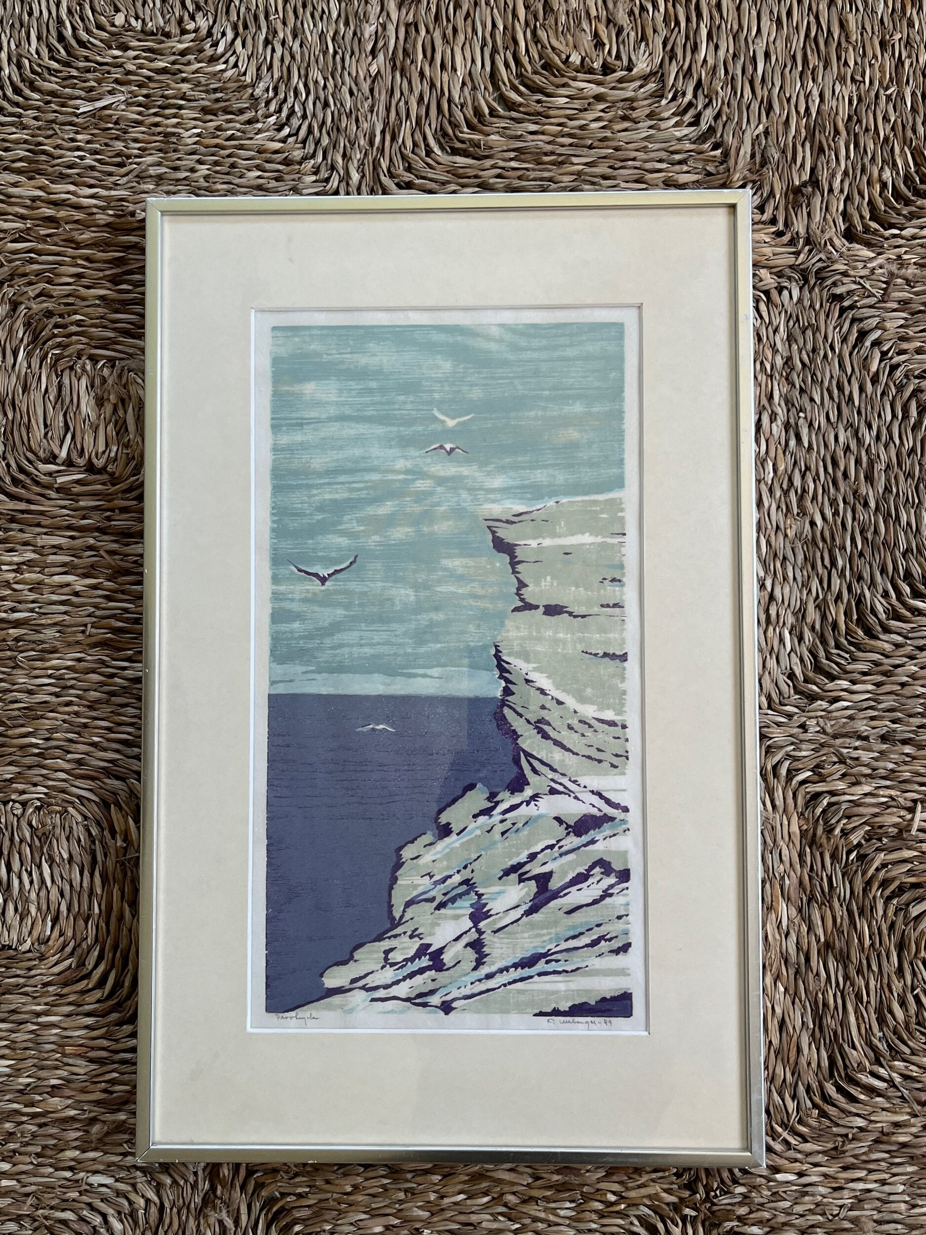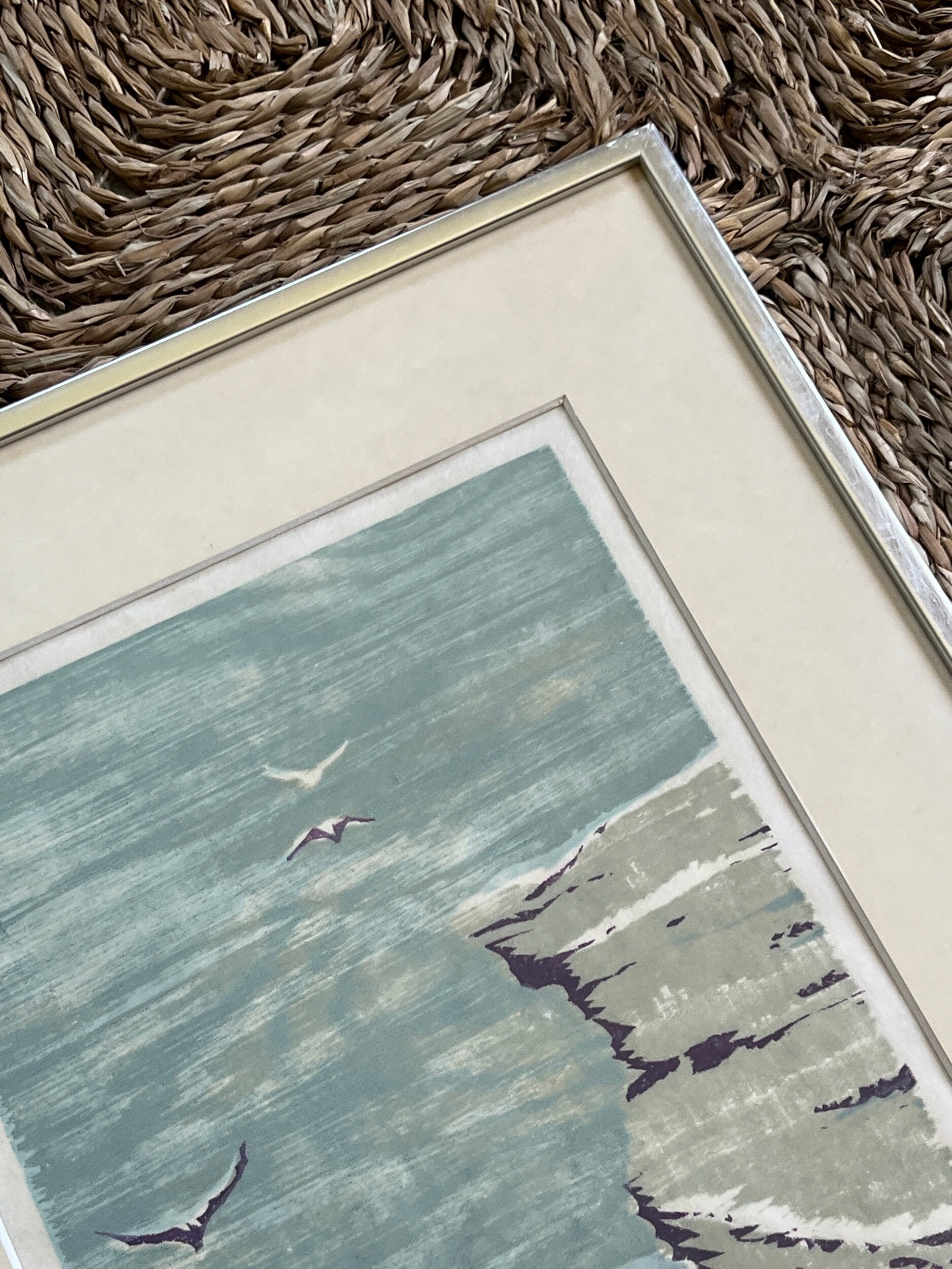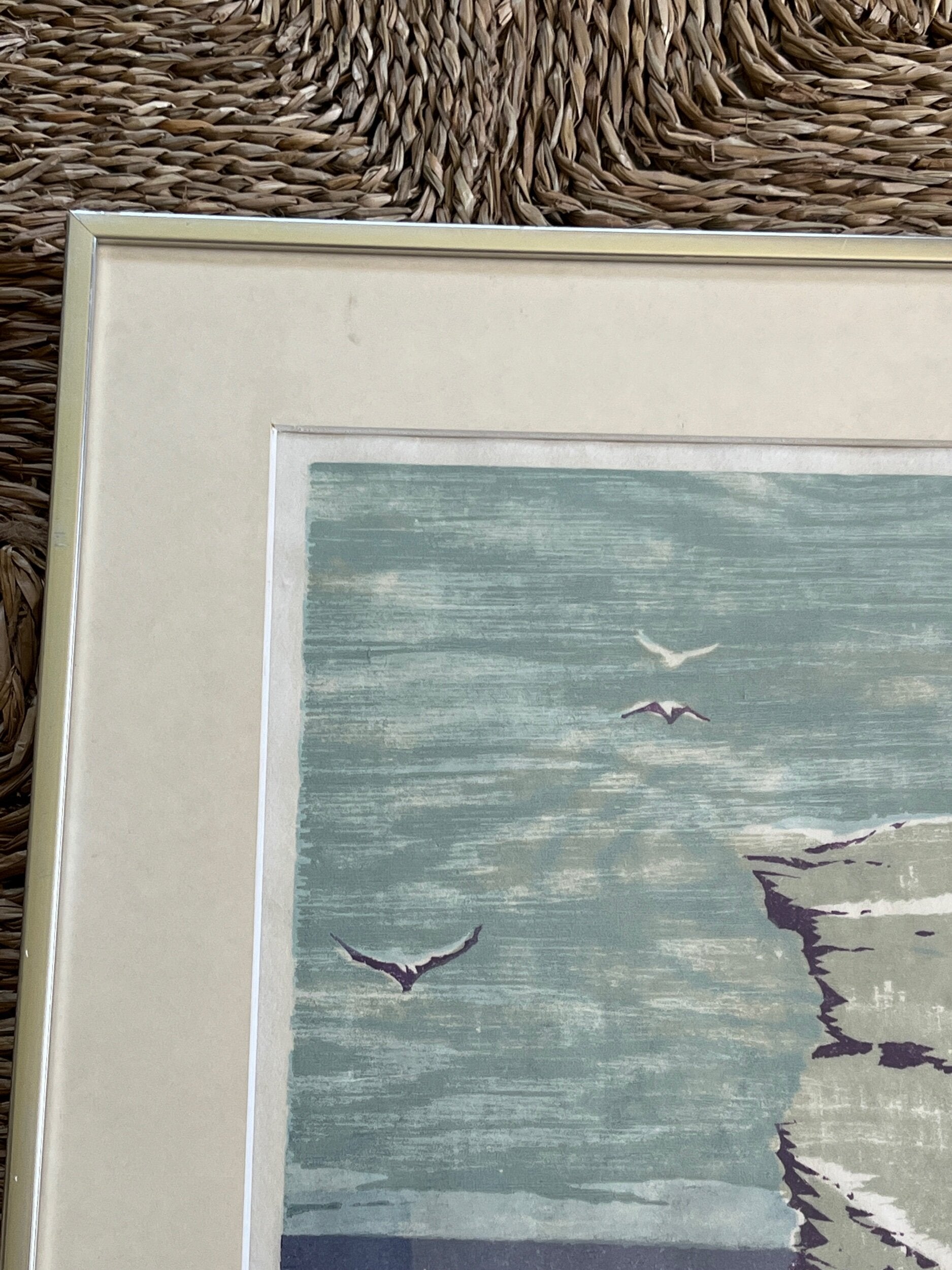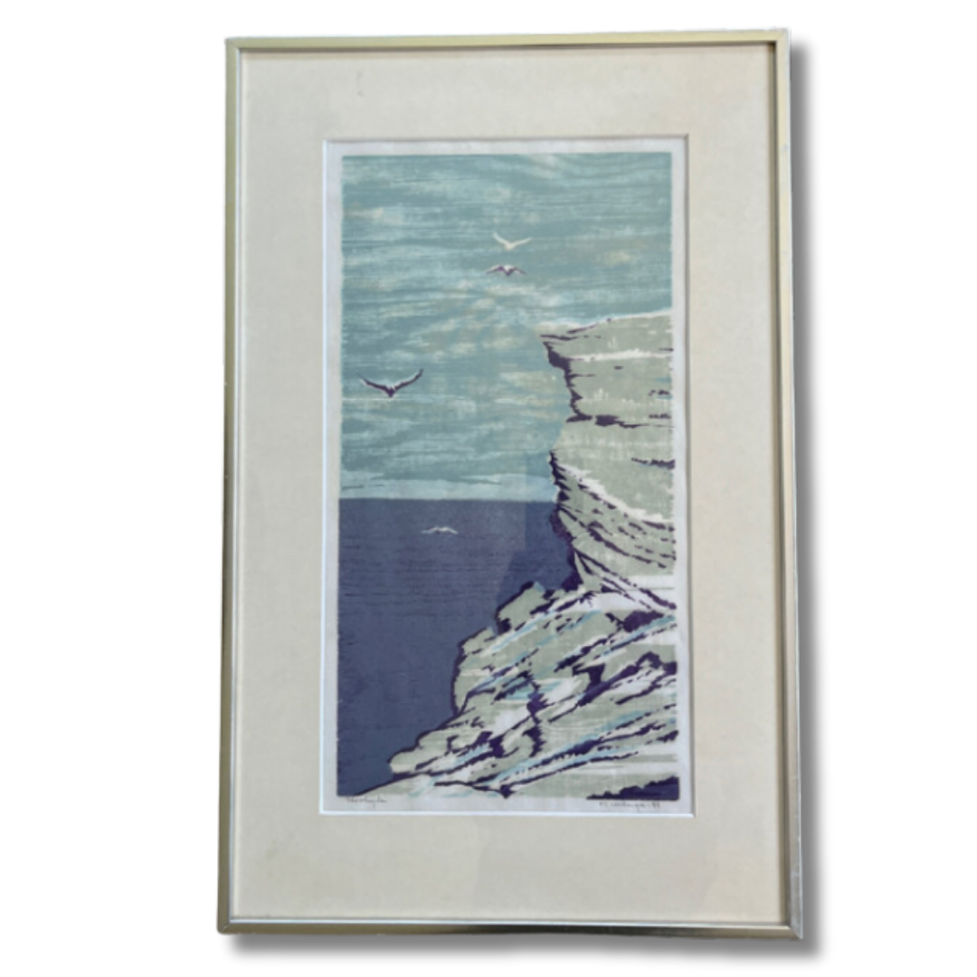 A striking 1979 woodcut lithograph depicting soaring seabirds above a dramatic coastal cliff. The artist’s use of cool seafoam blues, muted greys, and deep indigos captures both the stillness of the ocean and the movement of flight. Strong linear carving defines the cliff’s strata, giving the work both texture and rhythm, while the sky is softened with painterly washes of pale clouds. A powerful balance of geometry and atmosphere, the print reflects the late-20th-century Scandinavian affinity for nature distilled into essential forms. Framed under glass, it remains a timeless study of landscape and motion.