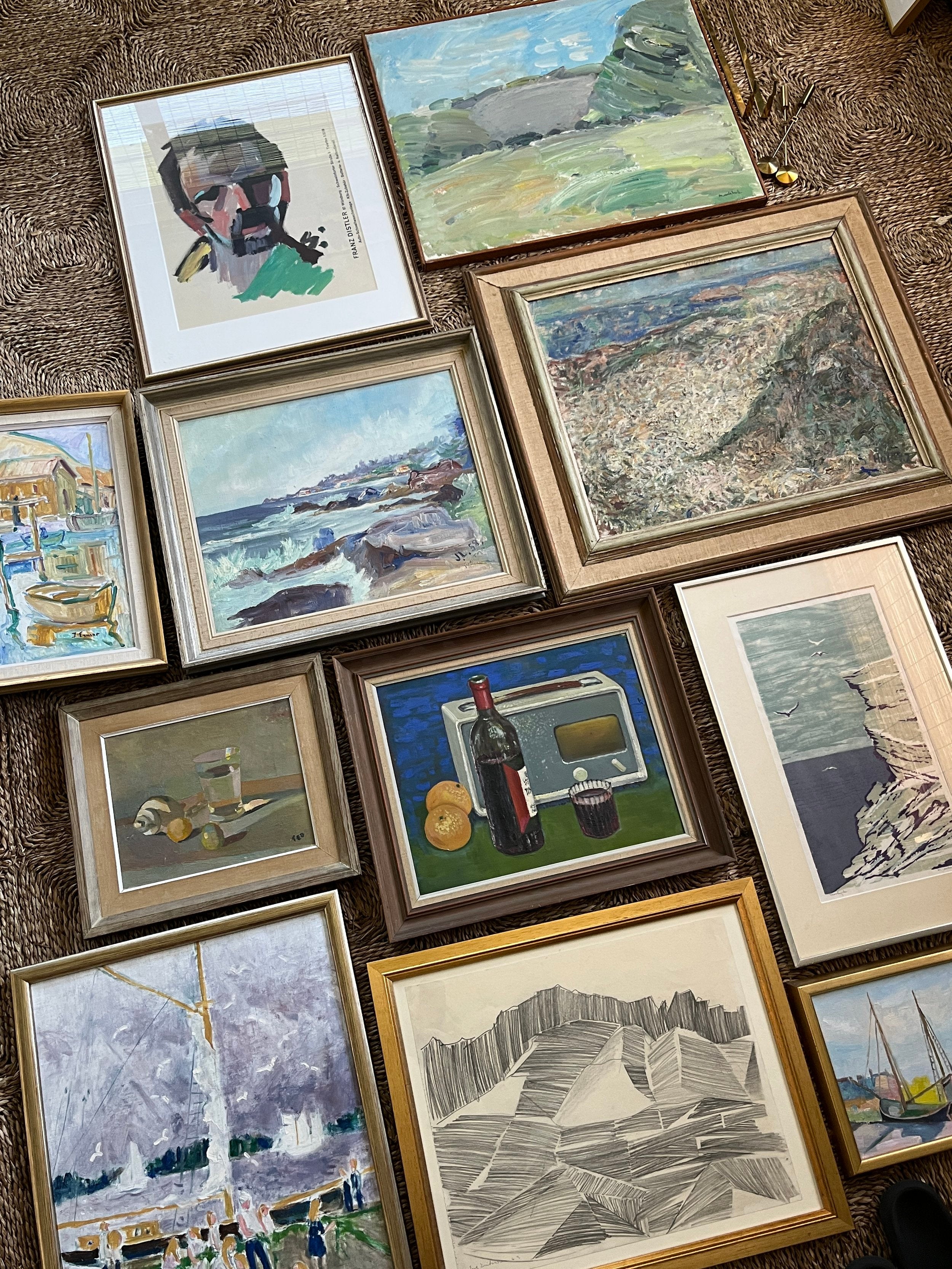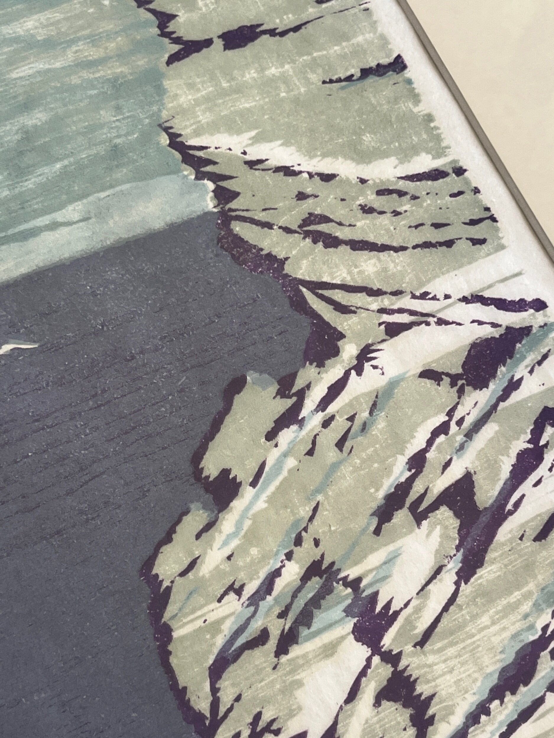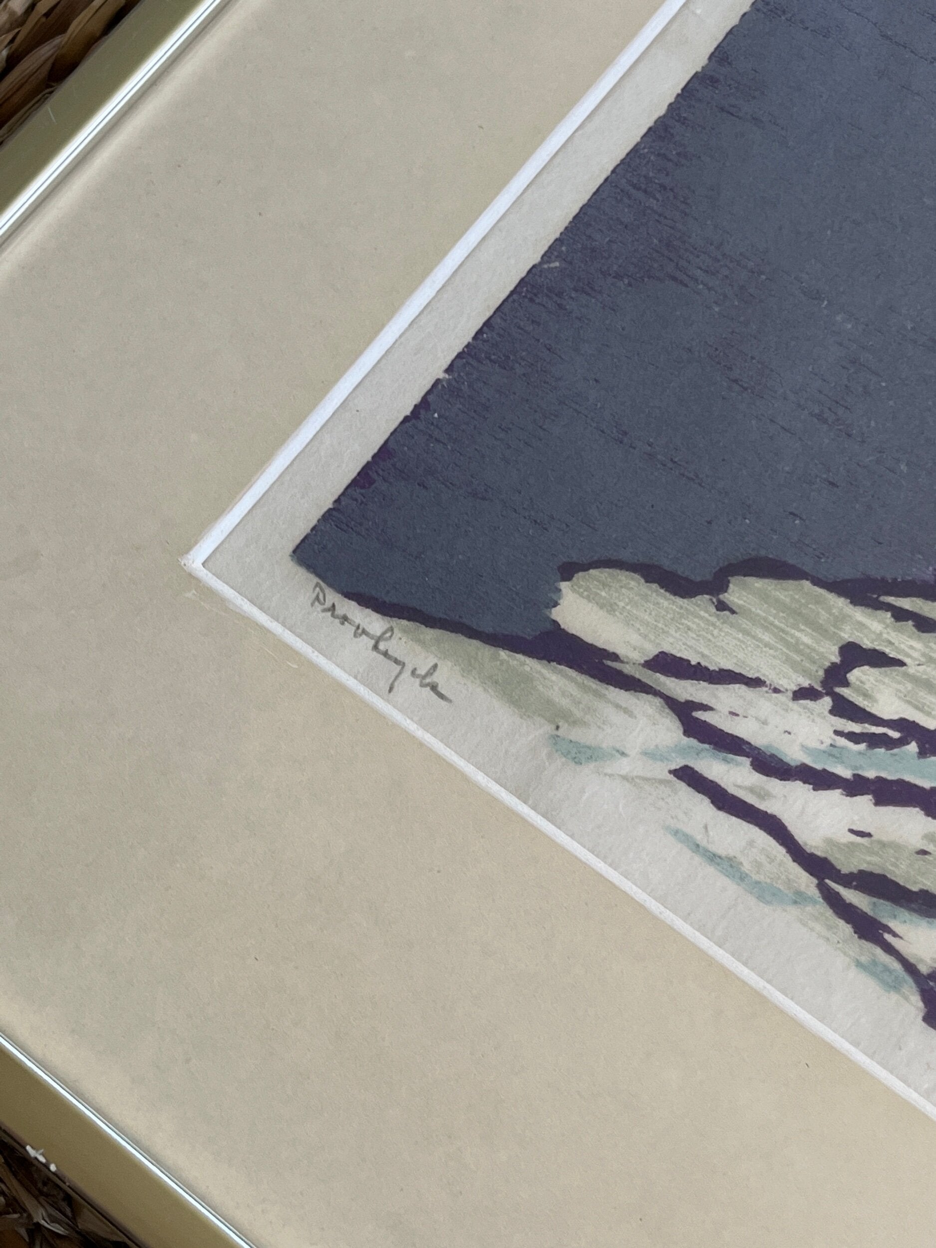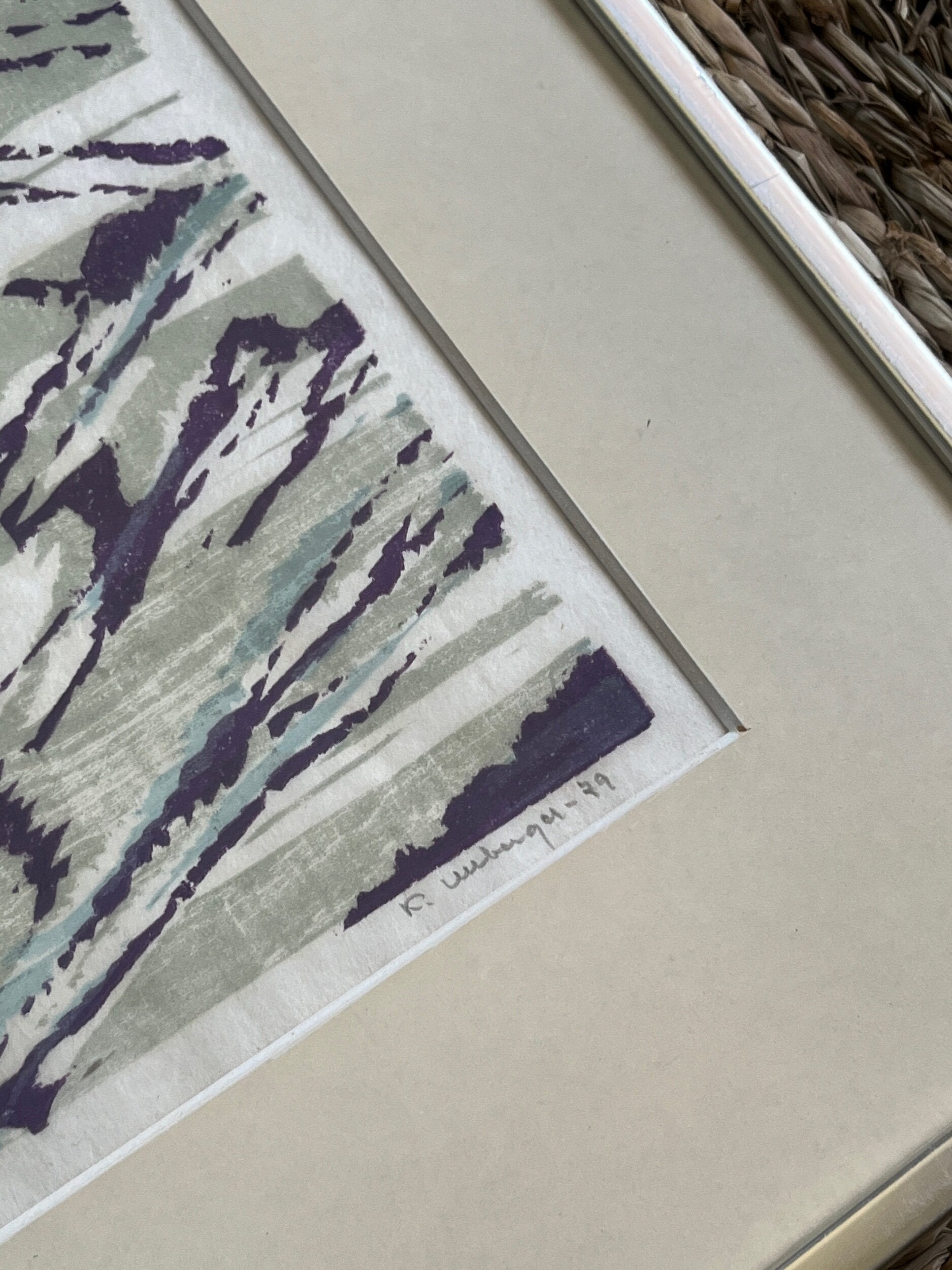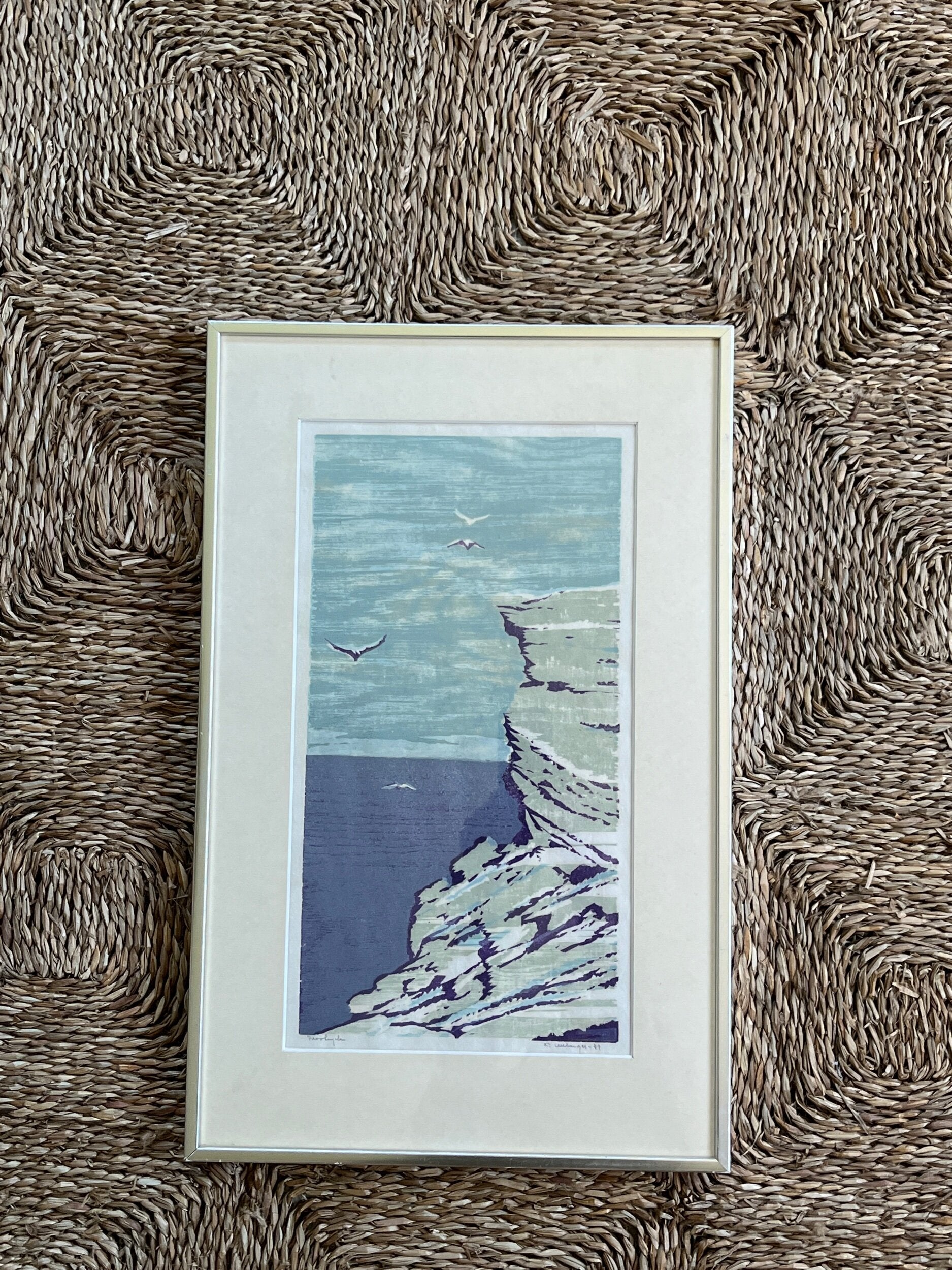 A striking 1979 woodcut lithograph depicting soaring seabirds above a dramatic coastal cliff. The artist’s use of cool seafoam blues, muted greys, and deep indigos captures both the stillness of the ocean and the movement of flight. Strong linear carving defines the cliff’s strata, giving the work both texture and rhythm, while the sky is softened with painterly washes of pale clouds. A powerful balance of geometry and atmosphere, the print reflects the late-20th-century Scandinavian affinity for nature distilled into essential forms. Framed under glass, it remains a timeless study of landscape and motion.