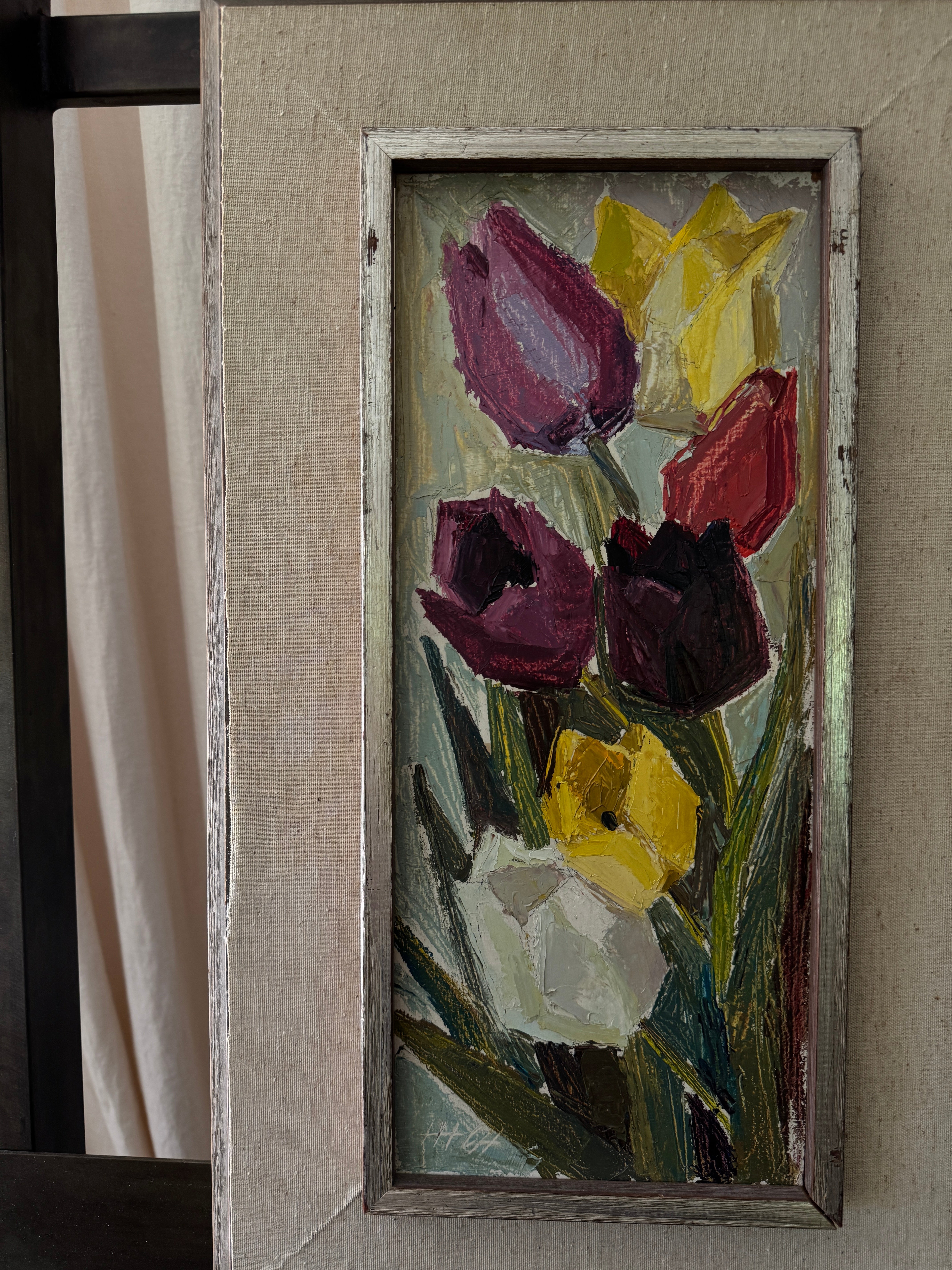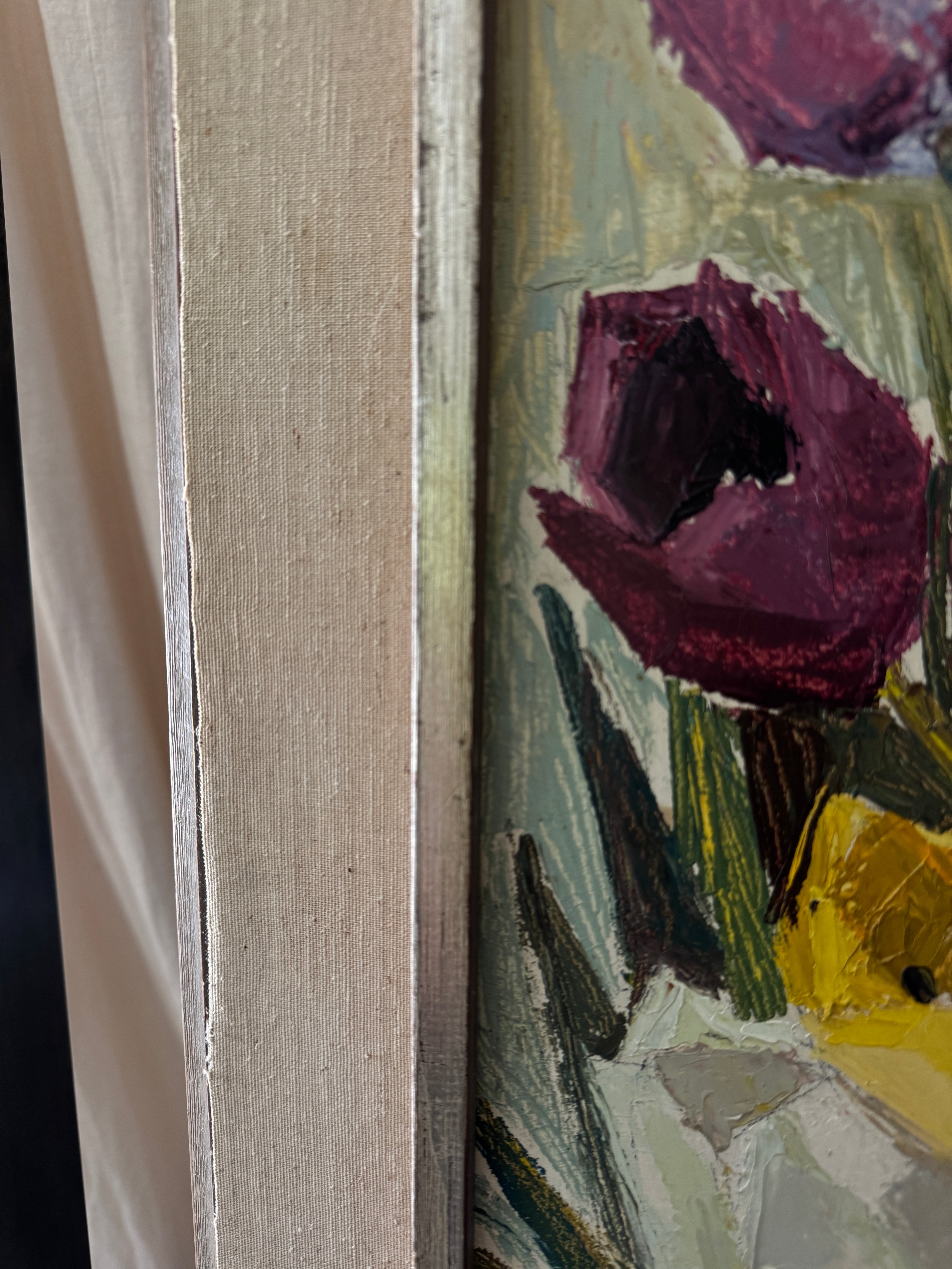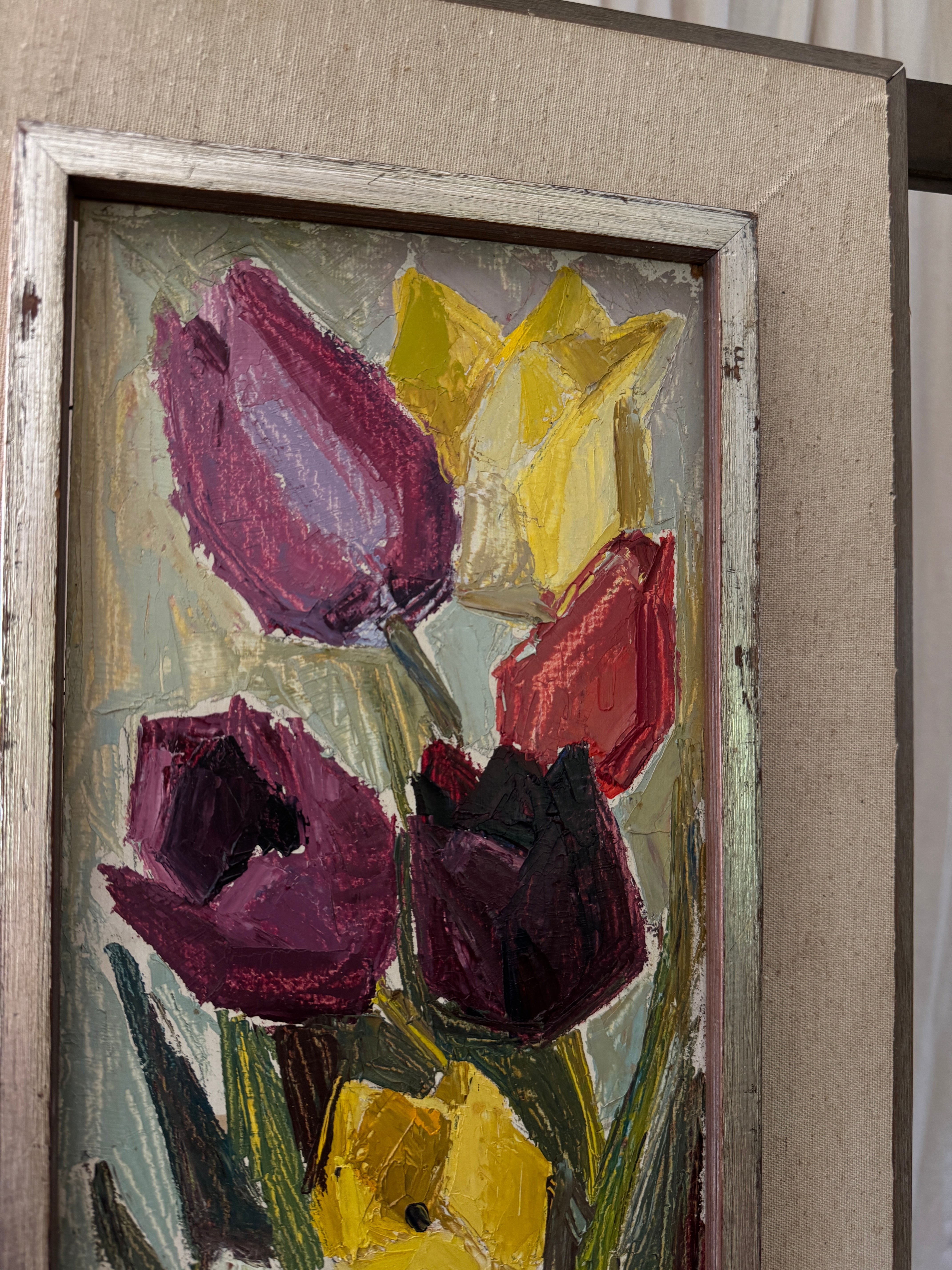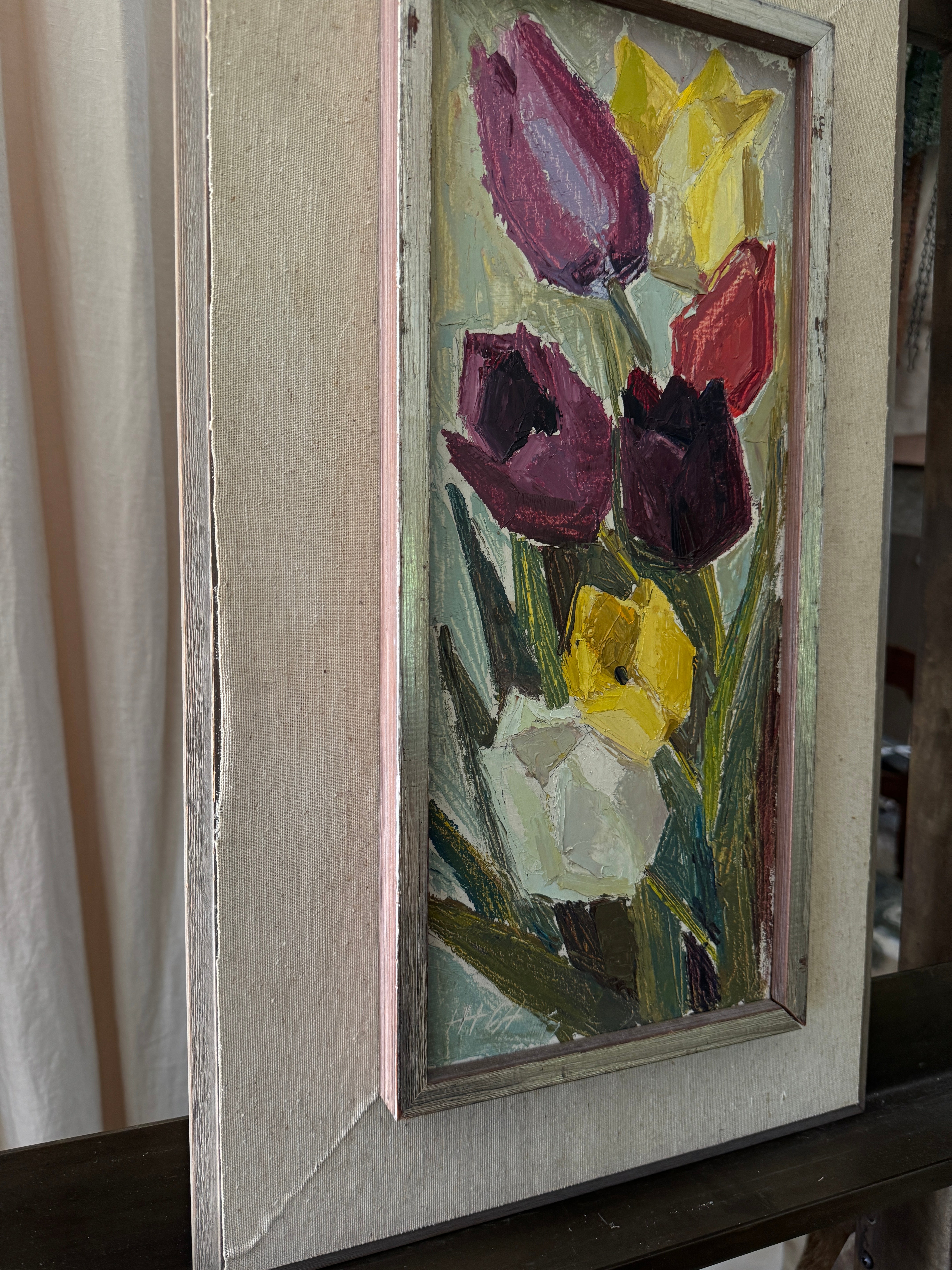 A study in cubist color and texture, this vertical bouquet of tulips feels both joyous and timeless. Each bloom, plum, crimson, golden, and ivory, is sculpted with rich impasto, giving the petals a tangible presence that almost reaches off the canvas. The elongated format draws the eye upward, while the soft, original frame grounds the exuberance of the flowers with a touch of quiet sophistication. This is the kind of piece that lifts a room with an everlasting bloom that brings life, charm, and a little dose of spring to any wall.