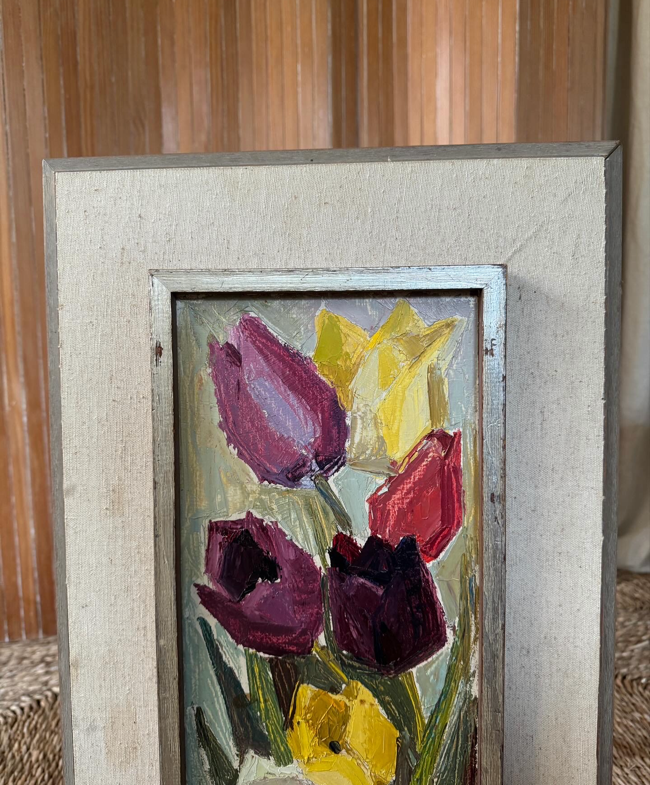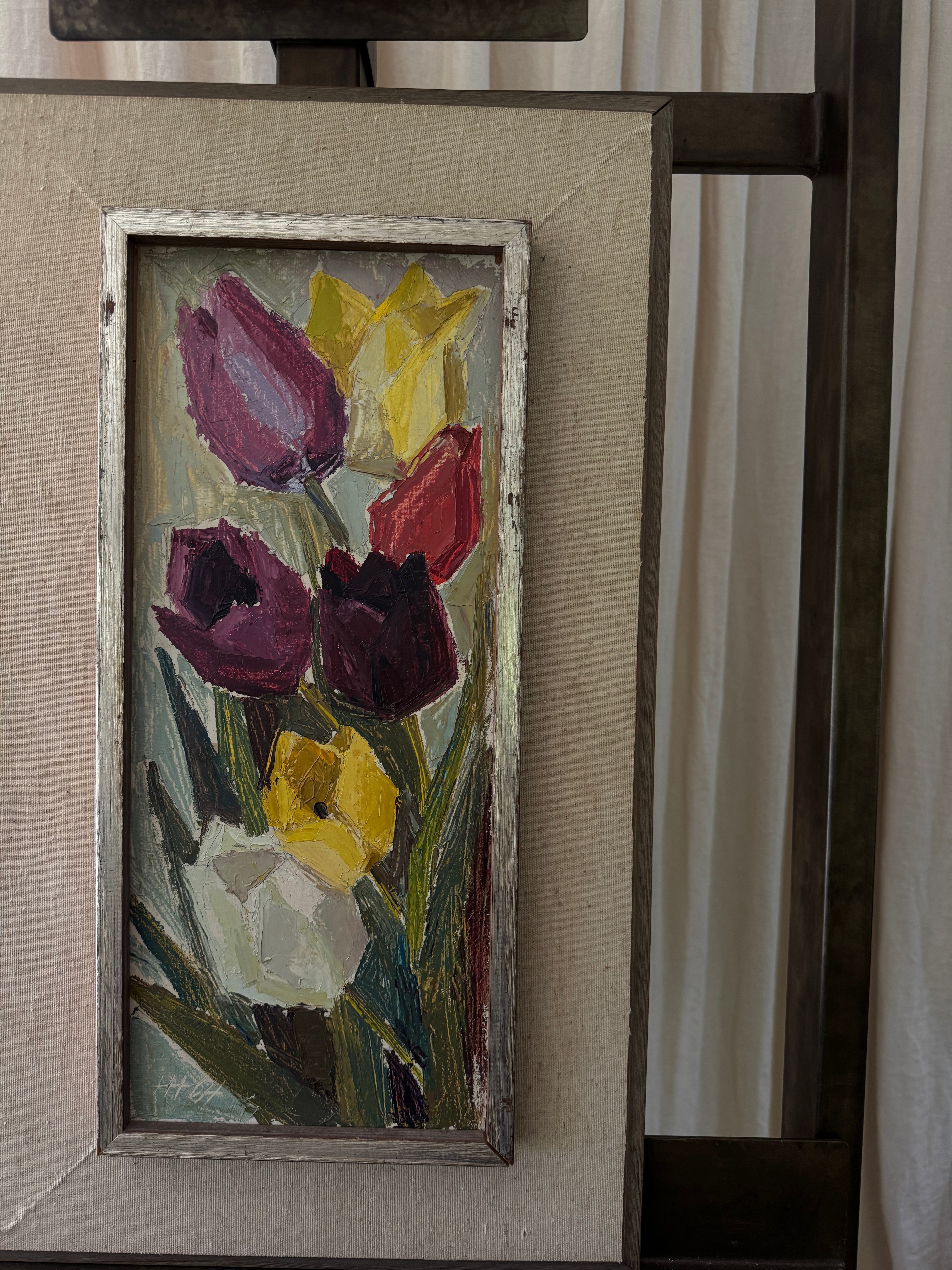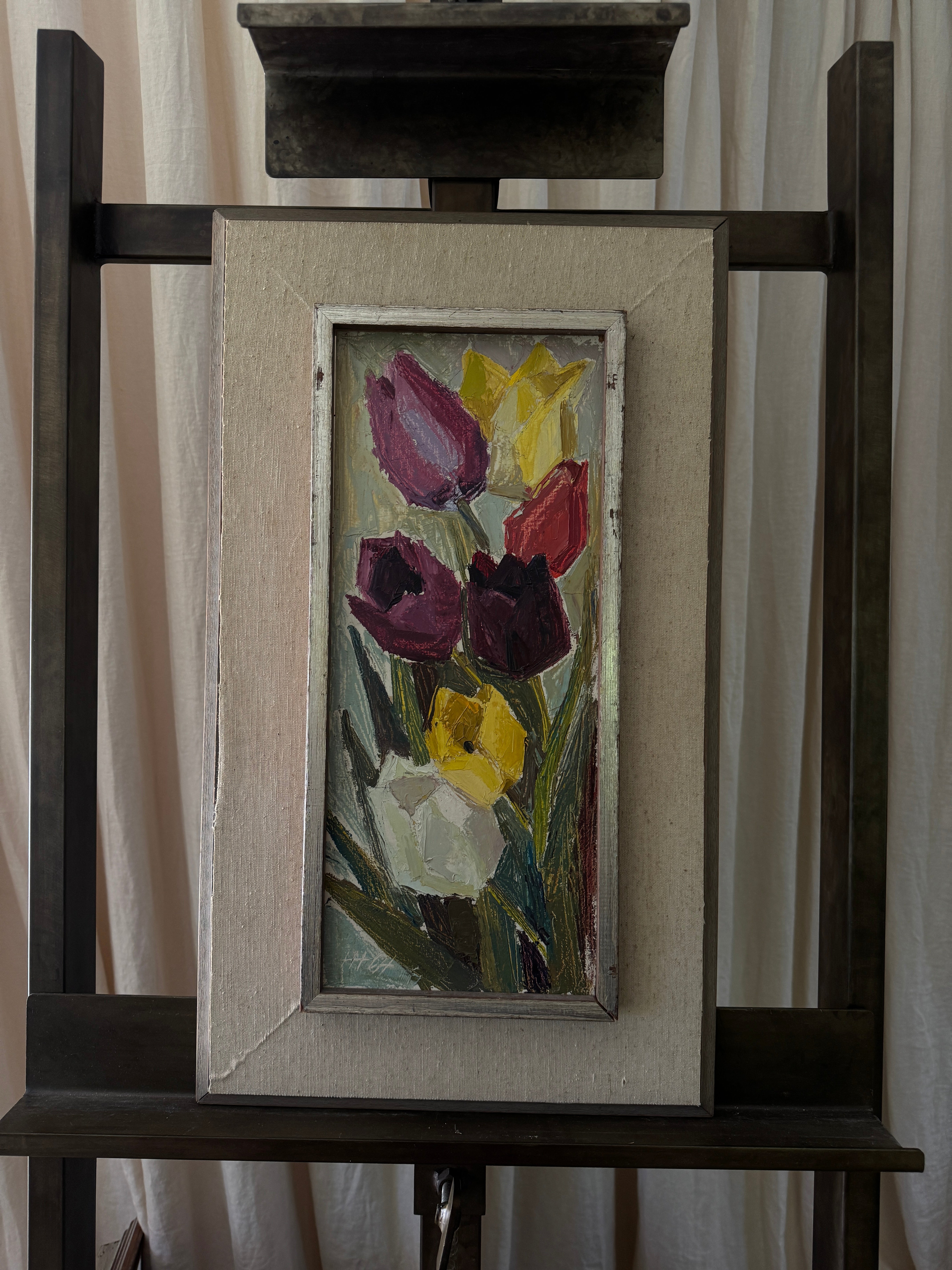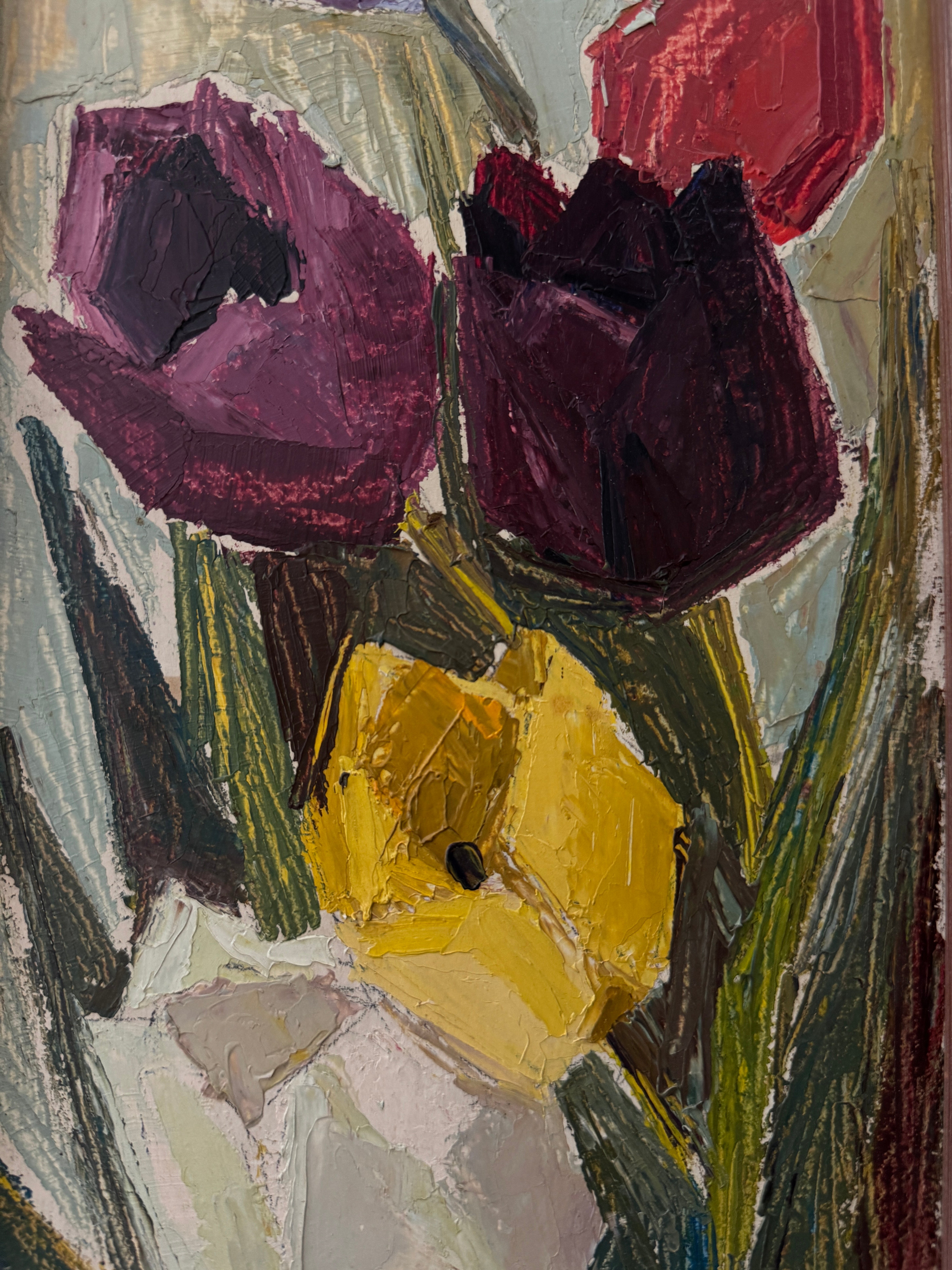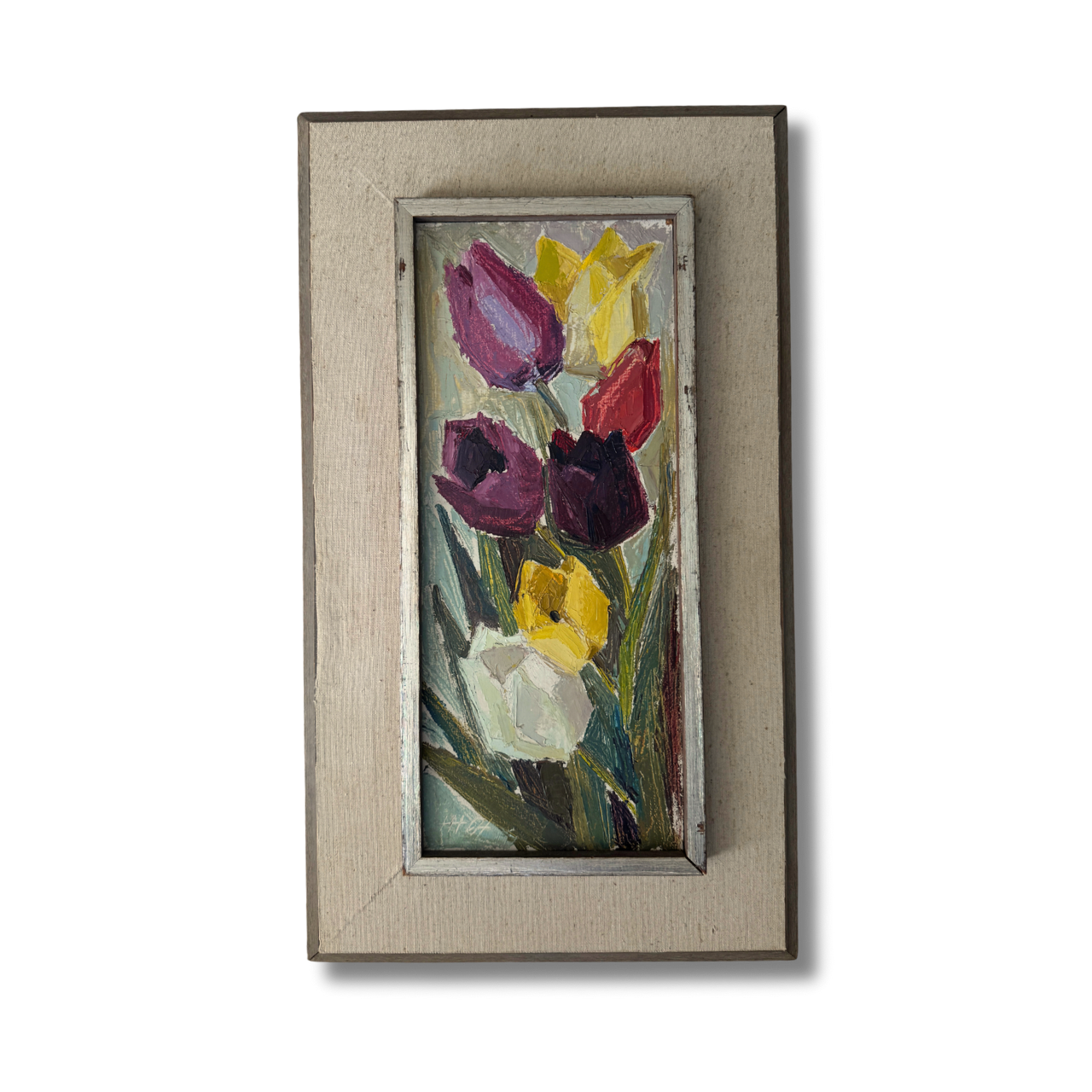 A study in cubist color and texture, this vertical bouquet of tulips feels both joyous and timeless. Each bloom, plum, crimson, golden, and ivory, is sculpted with rich impasto, giving the petals a tangible presence that almost reaches off the canvas. The elongated format draws the eye upward, while the soft, original frame grounds the exuberance of the flowers with a touch of quiet sophistication. This is the kind of piece that lifts a room with an everlasting bloom that brings life, charm, and a little dose of spring to any wall.