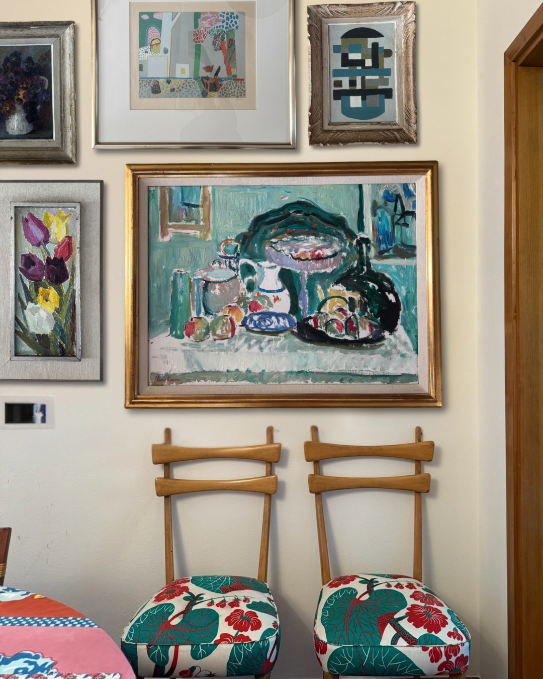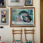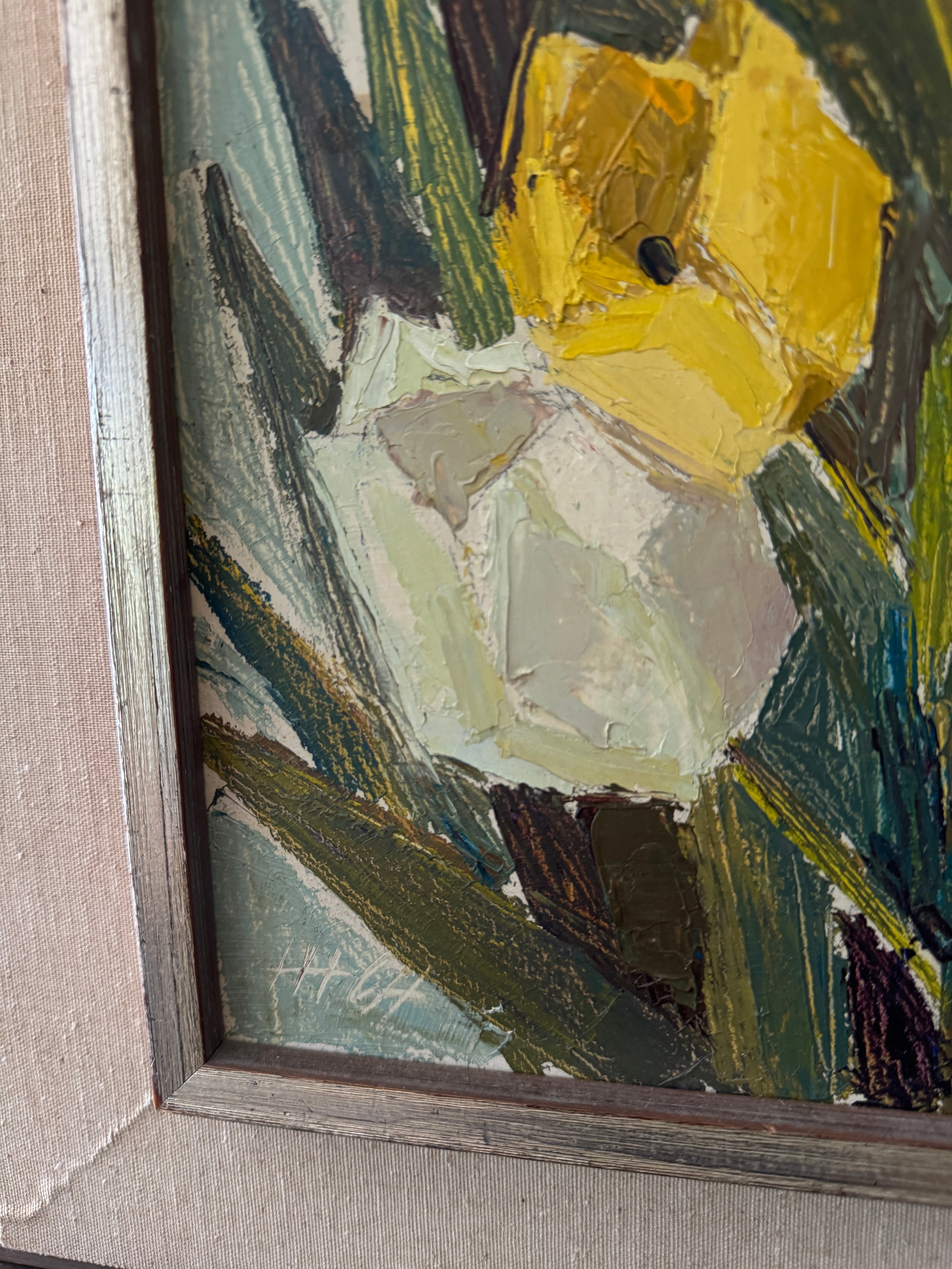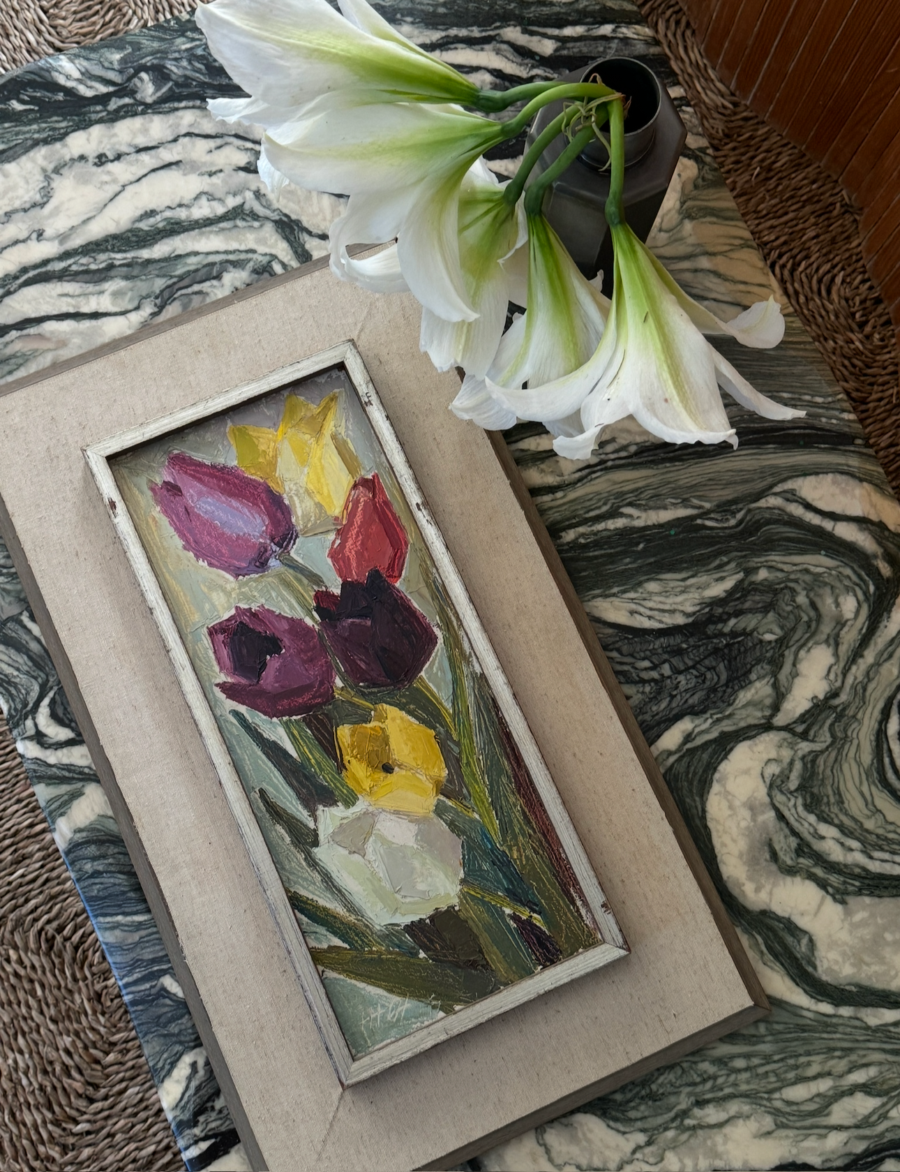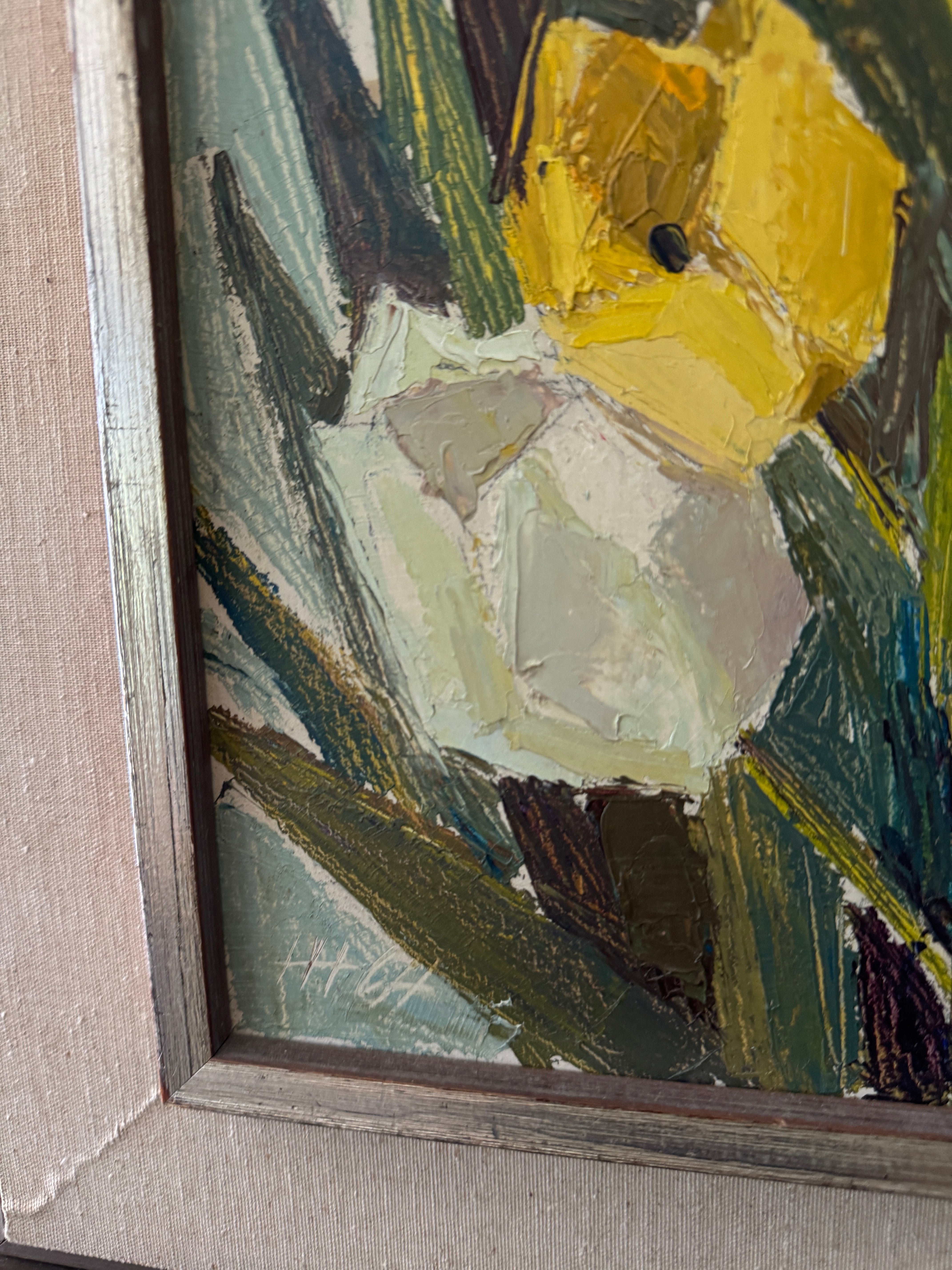 A study in cubist color and texture, this vertical bouquet of tulips feels both joyous and timeless. Each bloom, plum, crimson, golden, and ivory, is sculpted with rich impasto, giving the petals a tangible presence that almost reaches off the canvas. The elongated format draws the eye upward, while the soft, original frame grounds the exuberance of the flowers with a touch of quiet sophistication. This is the kind of piece that lifts a room with an everlasting bloom that brings life, charm, and a little dose of spring to any wall.