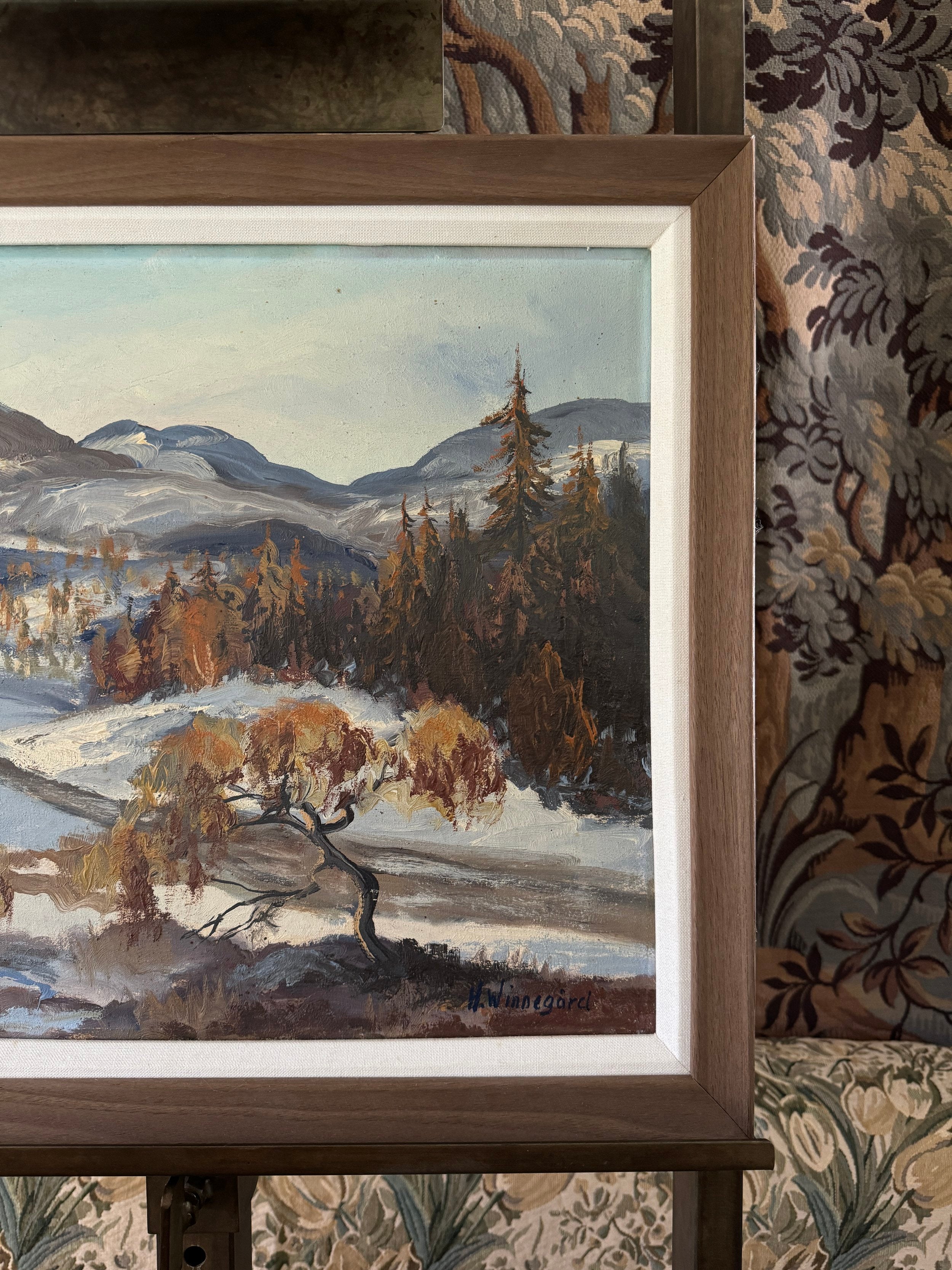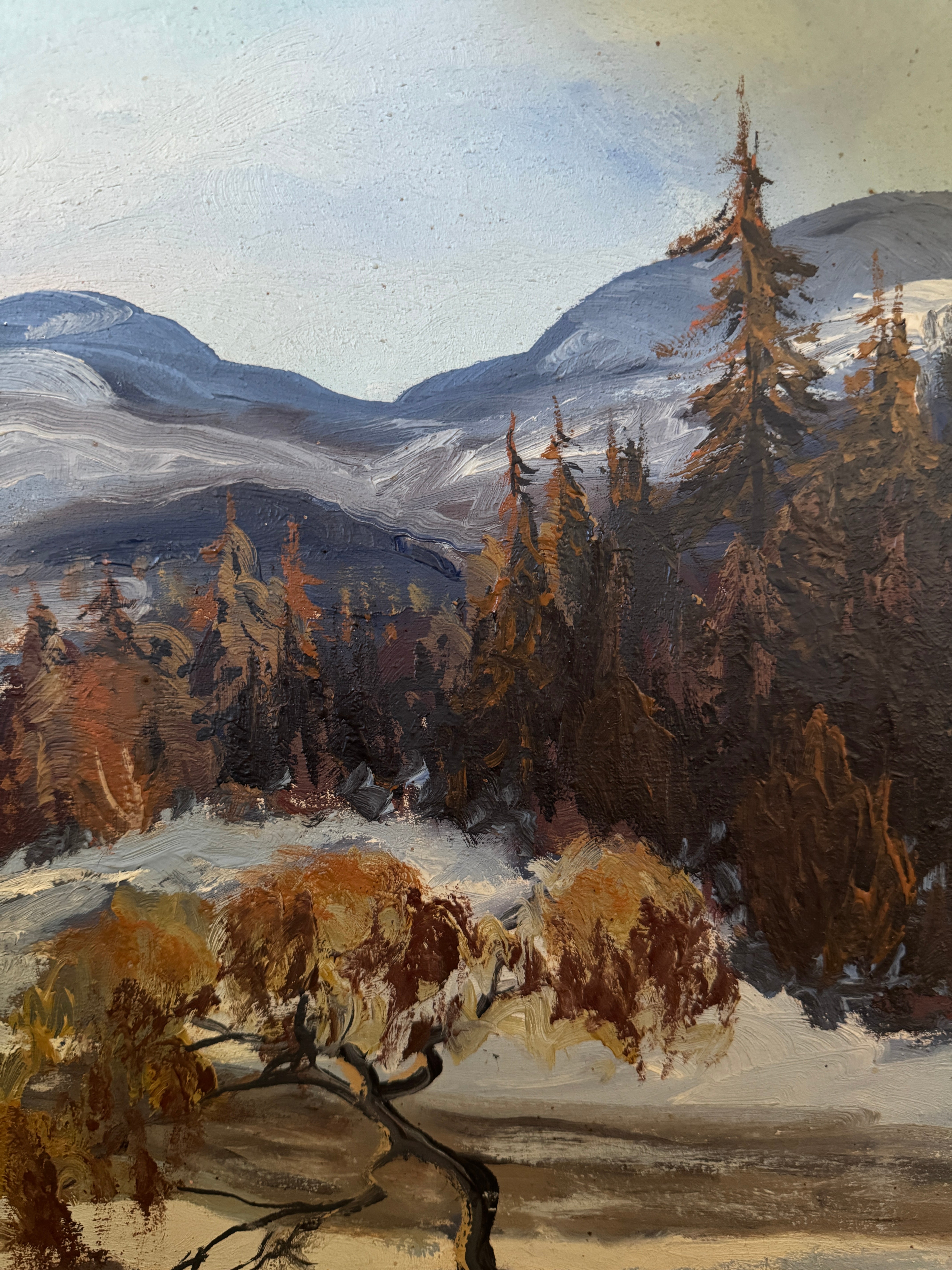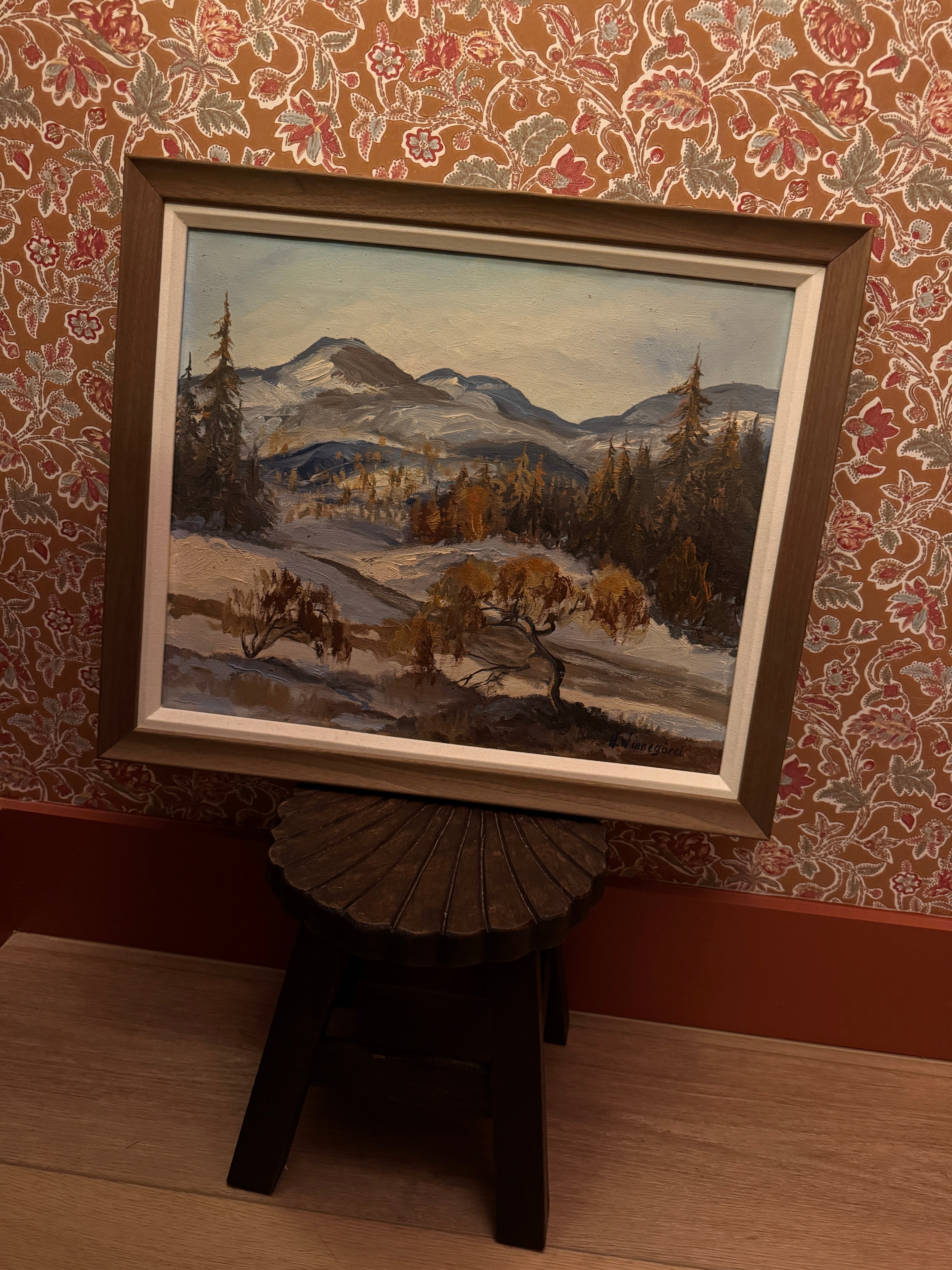 This Swedish landscape painting captures a tranquil winter scene with a stunning backdrop of rolling mountains. The foreground is dotted with delicate, leafless trees, their branches tinged with hints of golden brown, standing resiliently against the snow-laden ground. The artist uses a harmonious blend of blues, whites, and earthy tones, creating a serene contrast between the cool snow and the warm autumnal foliage. The brushstrokes are fluid yet precise, conveying the texture of the snowy terrain and the distant, softly rendered hills. The composition exudes a peaceful, reflective mood, celebrating the quiet beauty of a Nordic winter's day, while the expansive sky adds a sense of openness and calm. It is newly reframed. (And it reminds Ashley heavily of her old home, Elkhorn Sun Valley! Hence the name :) )