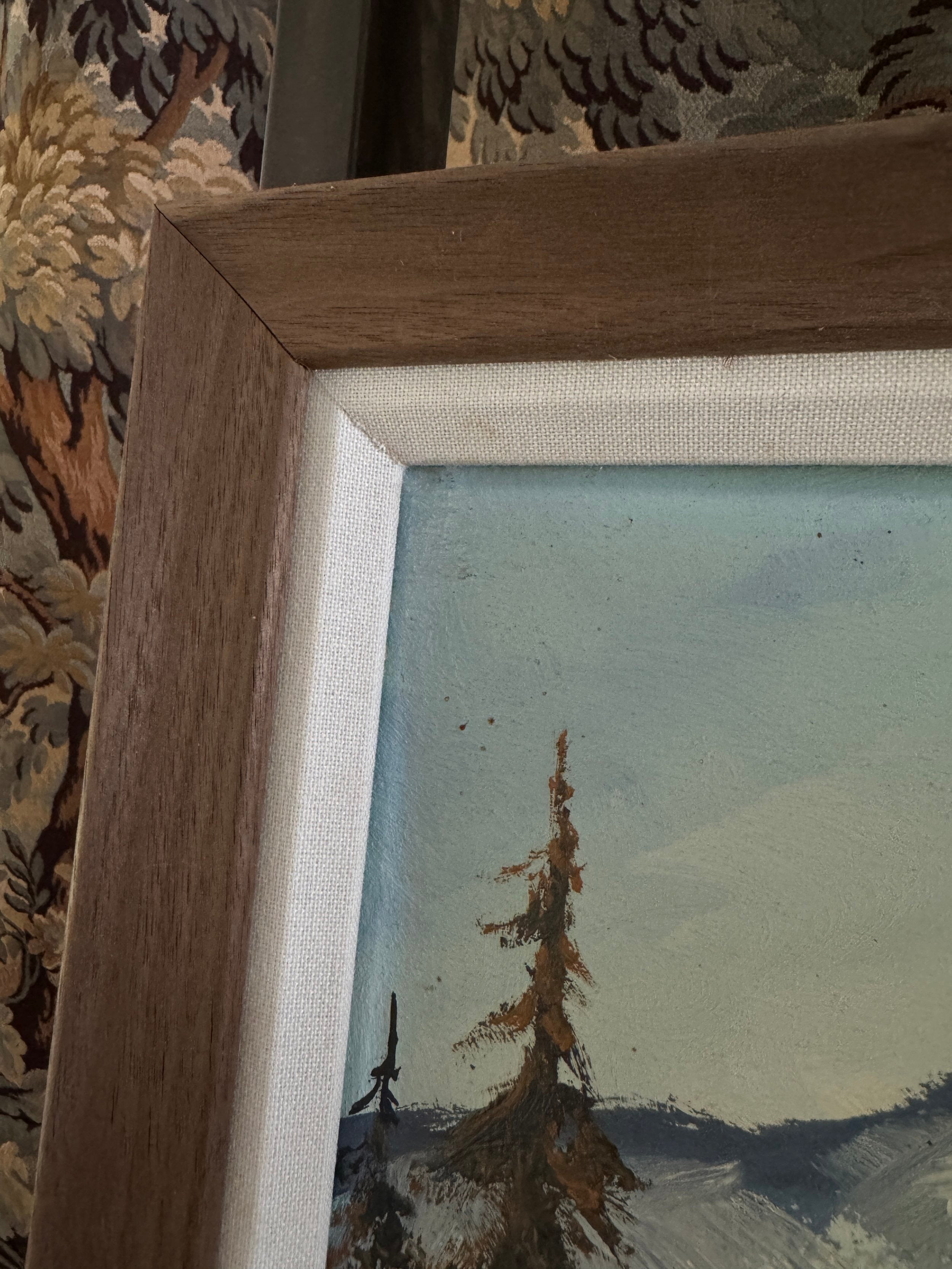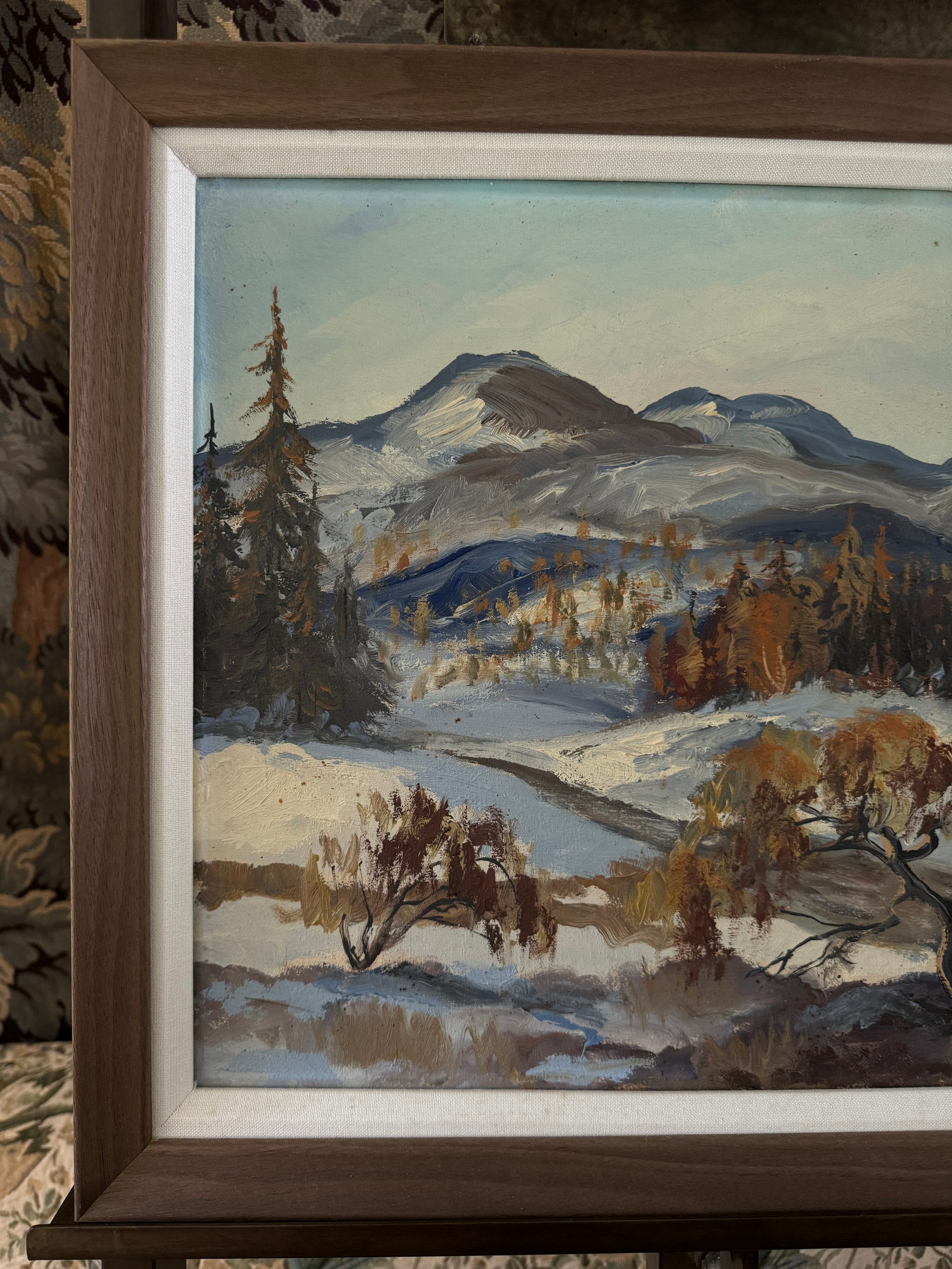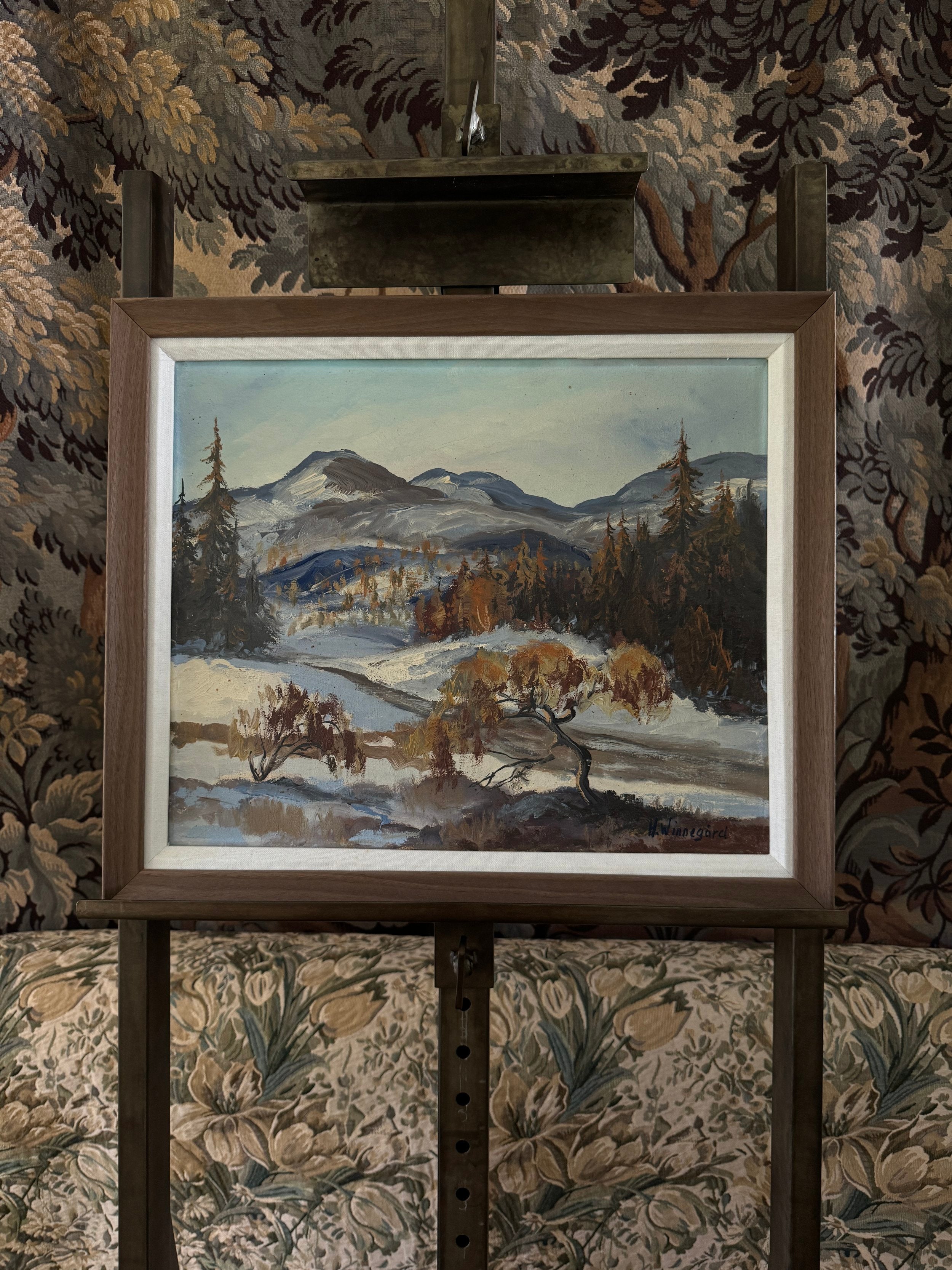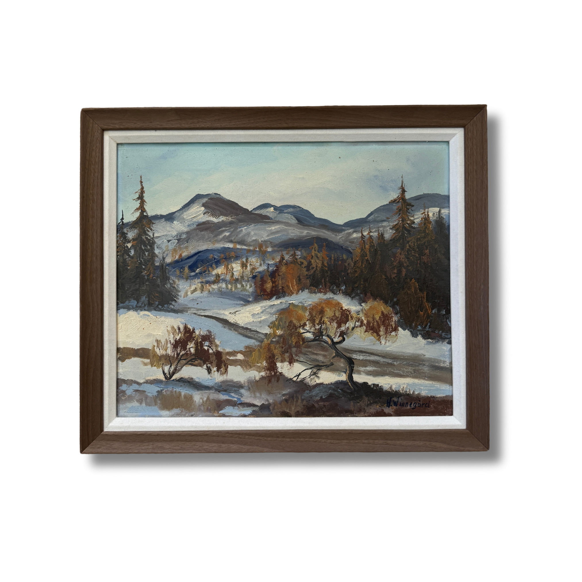 This Swedish landscape painting captures a tranquil winter scene with a stunning backdrop of rolling mountains. The foreground is dotted with delicate, leafless trees, their branches tinged with hints of golden brown, standing resiliently against the snow-laden ground. The artist uses a harmonious blend of blues, whites, and earthy tones, creating a serene contrast between the cool snow and the warm autumnal foliage. The brushstrokes are fluid yet precise, conveying the texture of the snowy terrain and the distant, softly rendered hills. The composition exudes a peaceful, reflective mood, celebrating the quiet beauty of a Nordic winter's day, while the expansive sky adds a sense of openness and calm. It is newly reframed. (And it reminds Ashley heavily of her old home, Elkhorn Sun Valley! Hence the name :) )