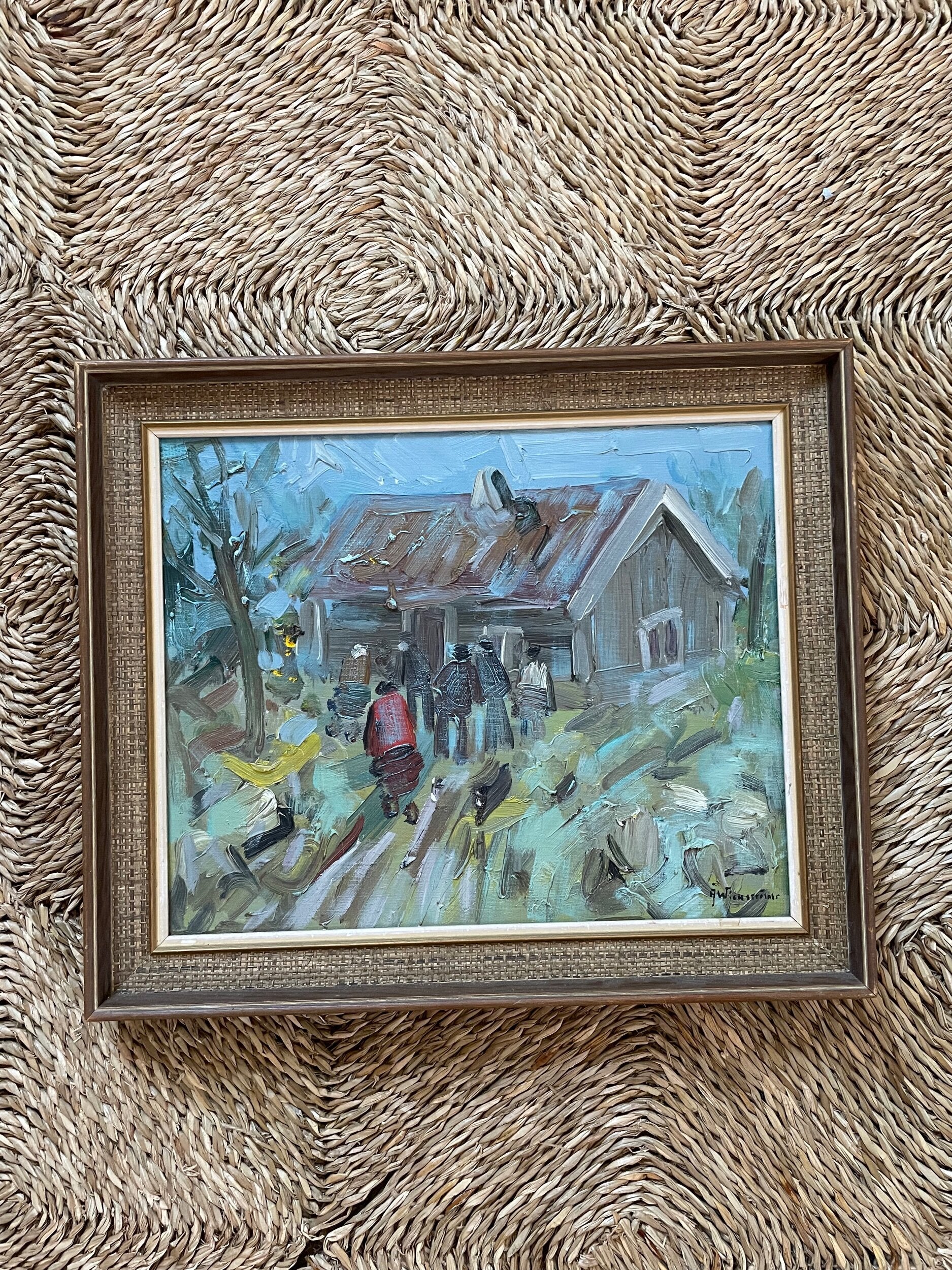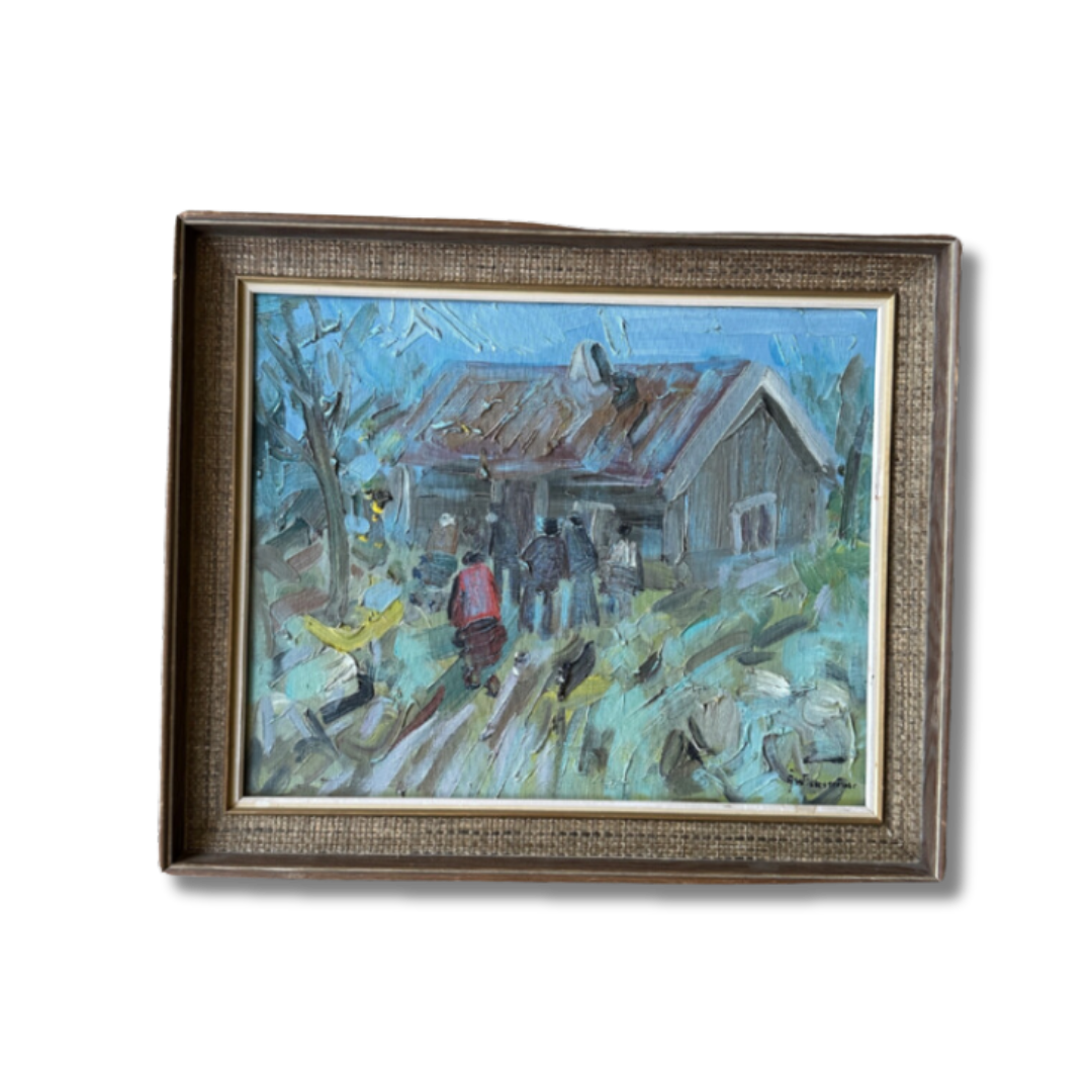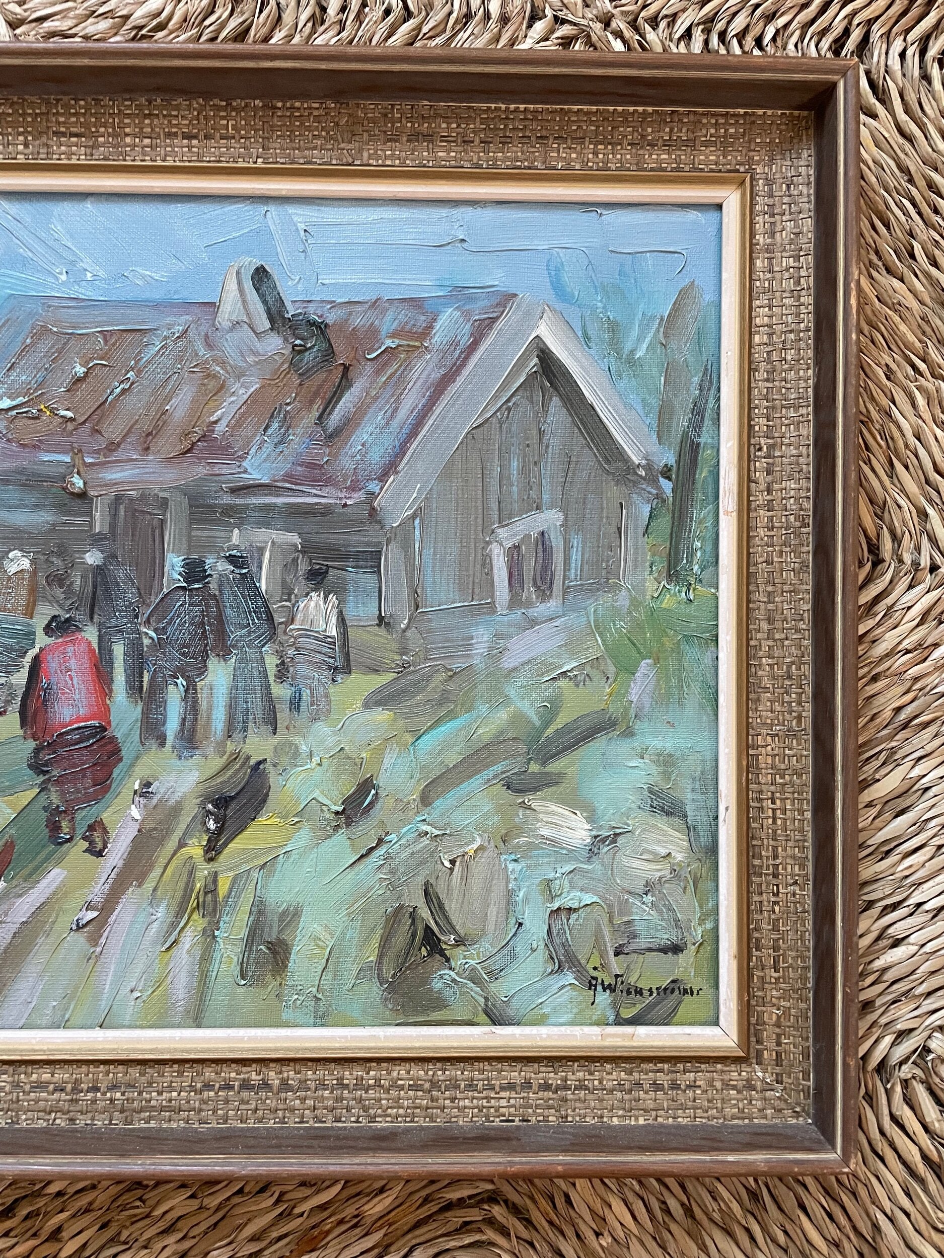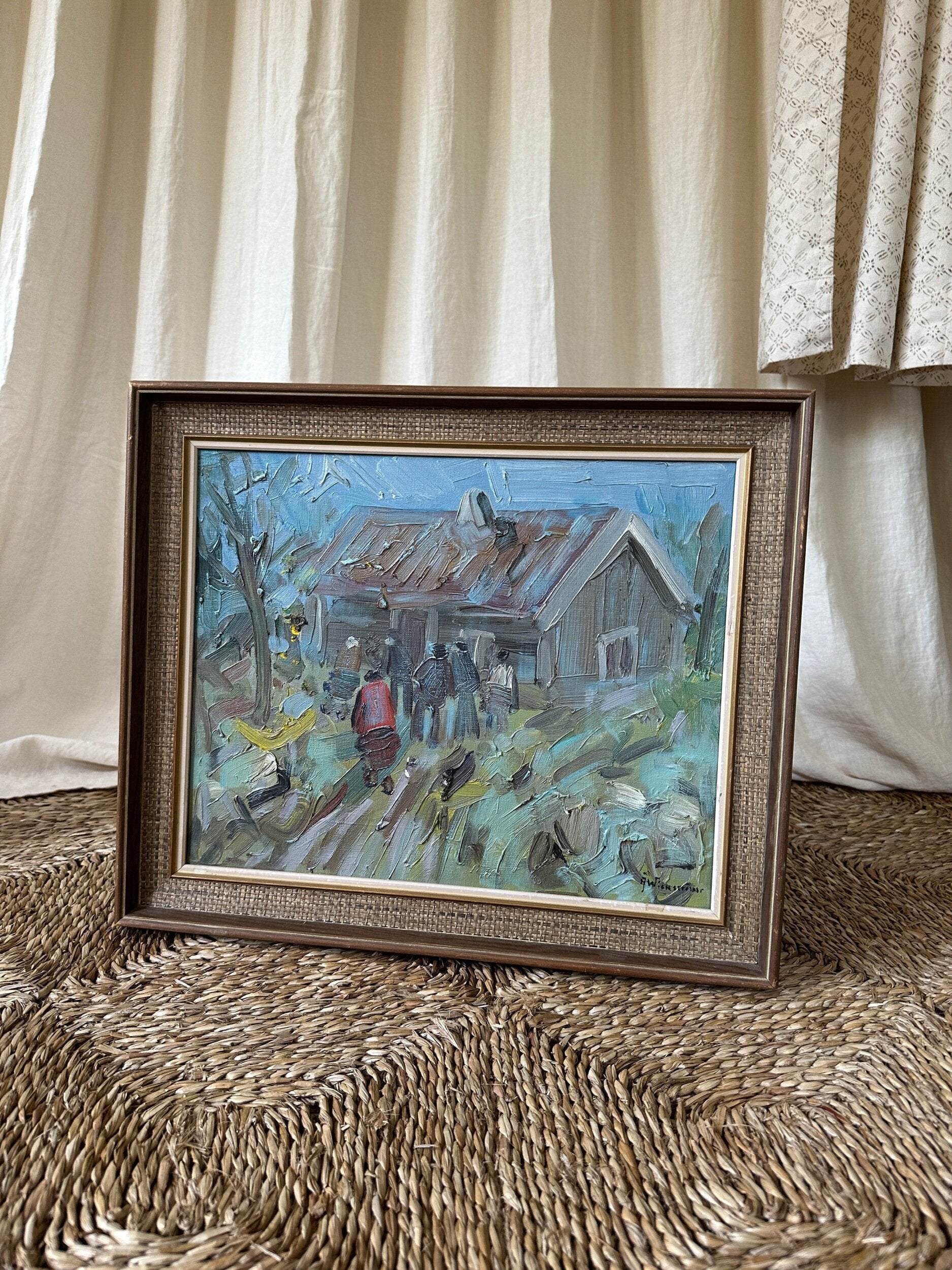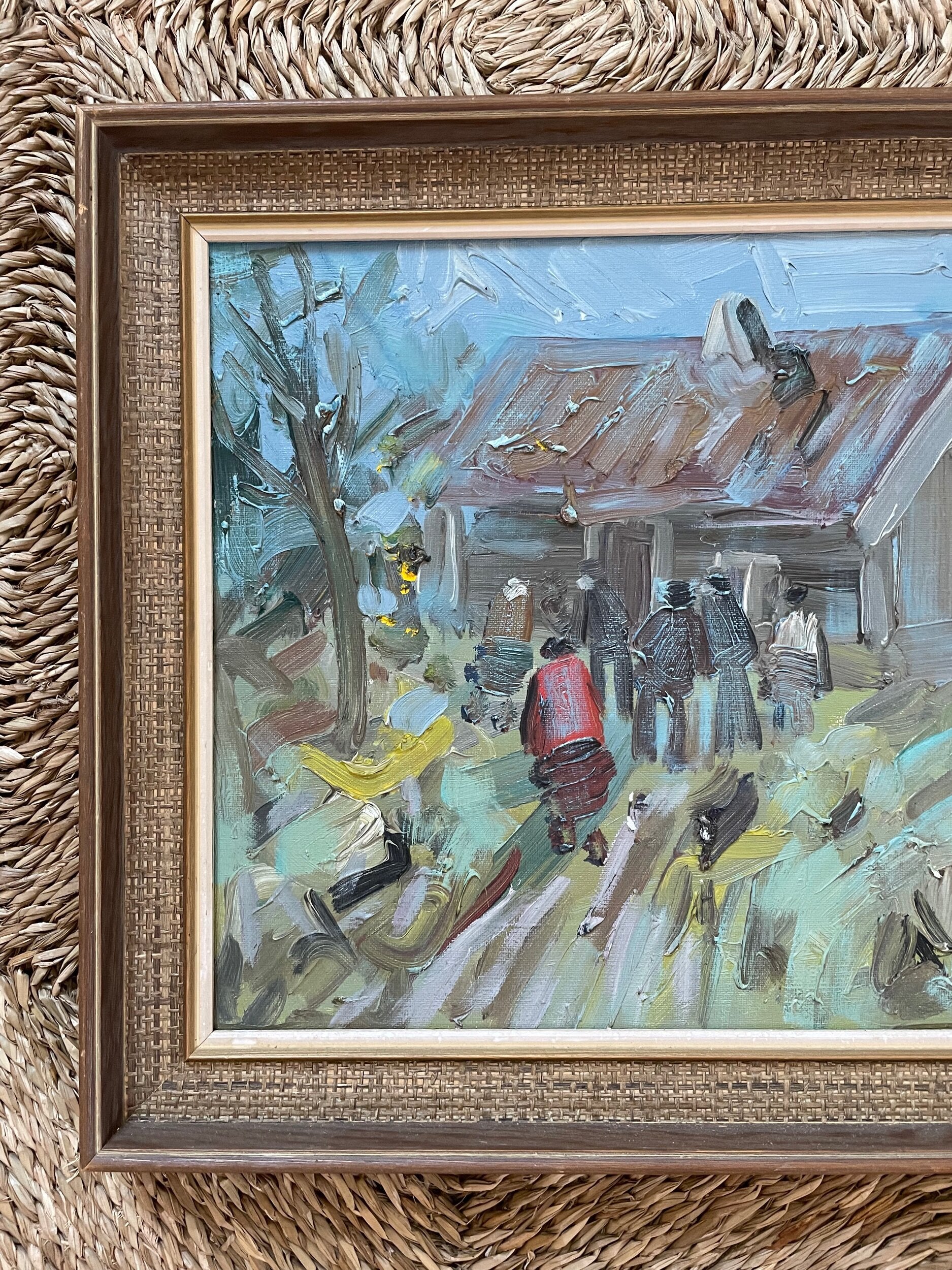 A charming oil on canvas capturing a rustic Scandinavian homestead, painted in loose, impressionistic strokes. Figures gather in front of the weathered wooden house, their presence lending warmth and life to the otherwise quiet rural setting. The earthy palette of greys, browns, and mossy greens is enlivened by a figure in a vivid red coat, drawing the eye into the composition. Expressive brushwork conveys movement and atmosphere, giving the painting a lively, almost narrative quality. Presented in its original textured frame with rattan slip, the work reflects both mid-century Nordic modernism and timeless folkloric charm.