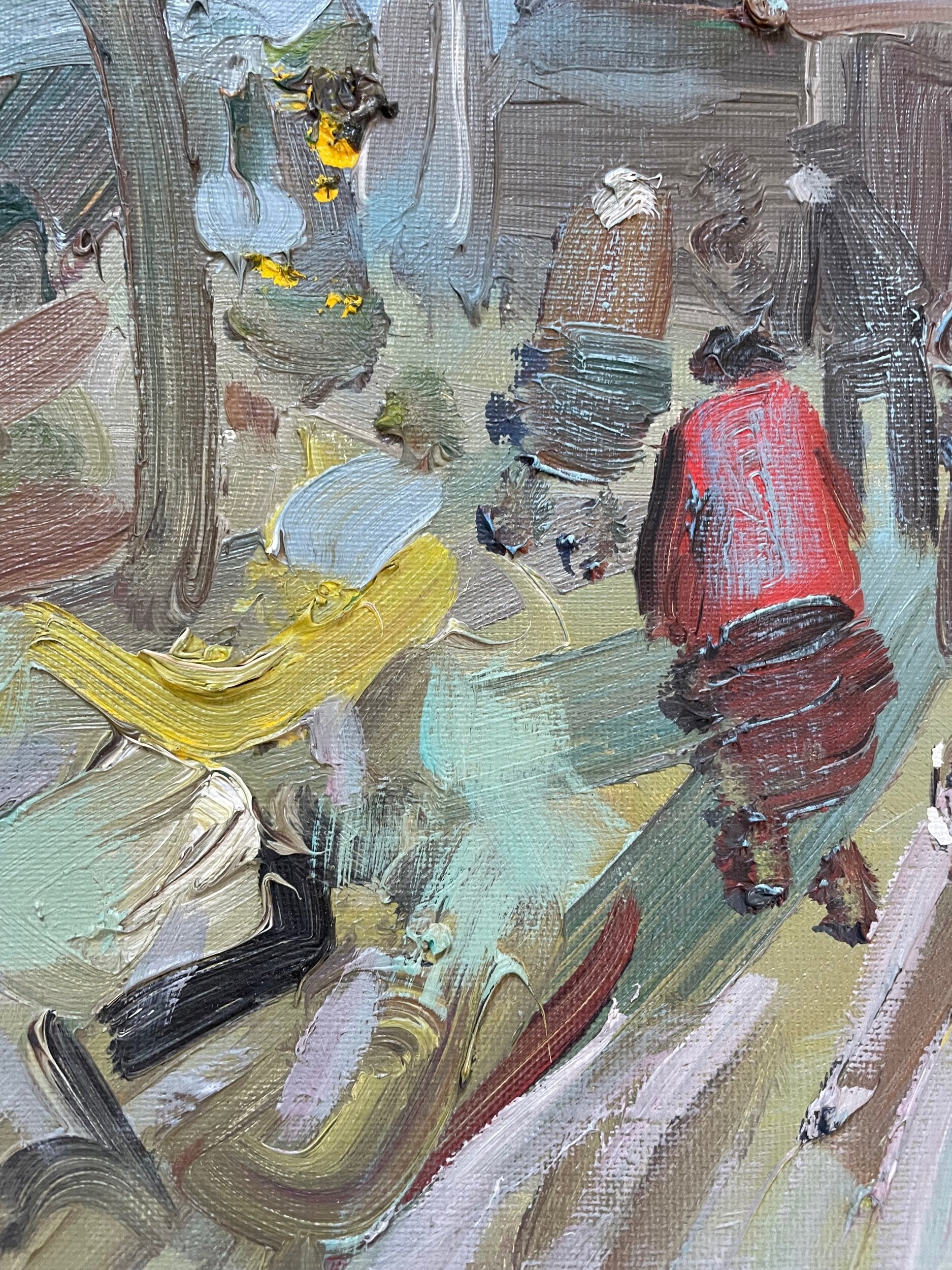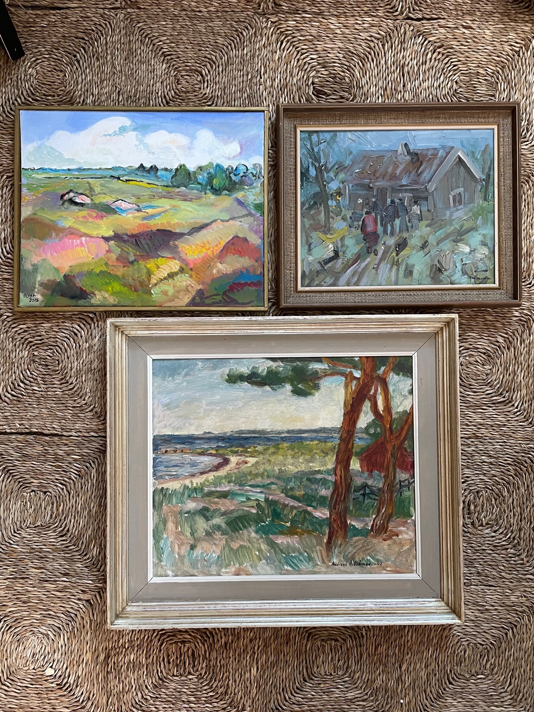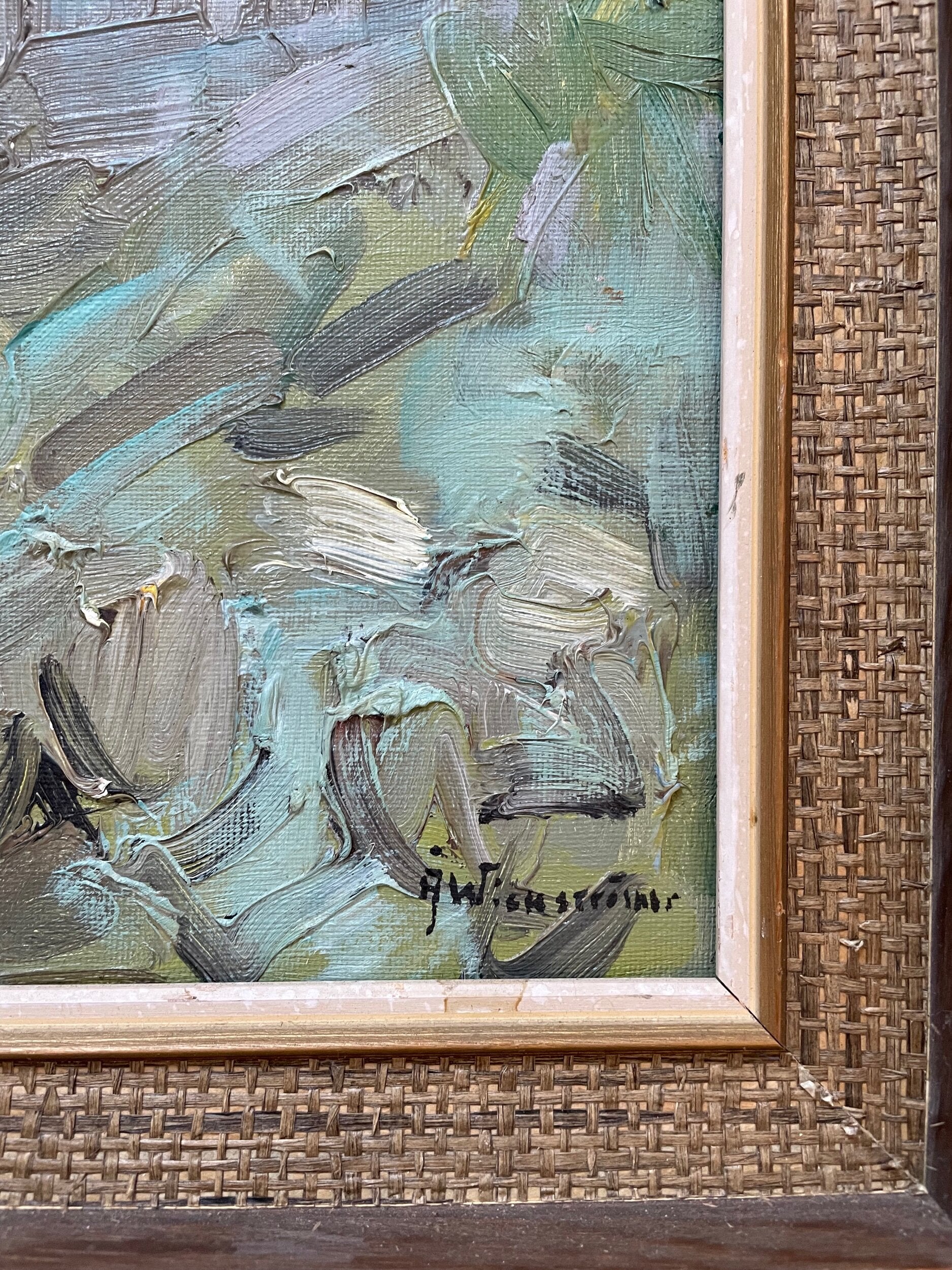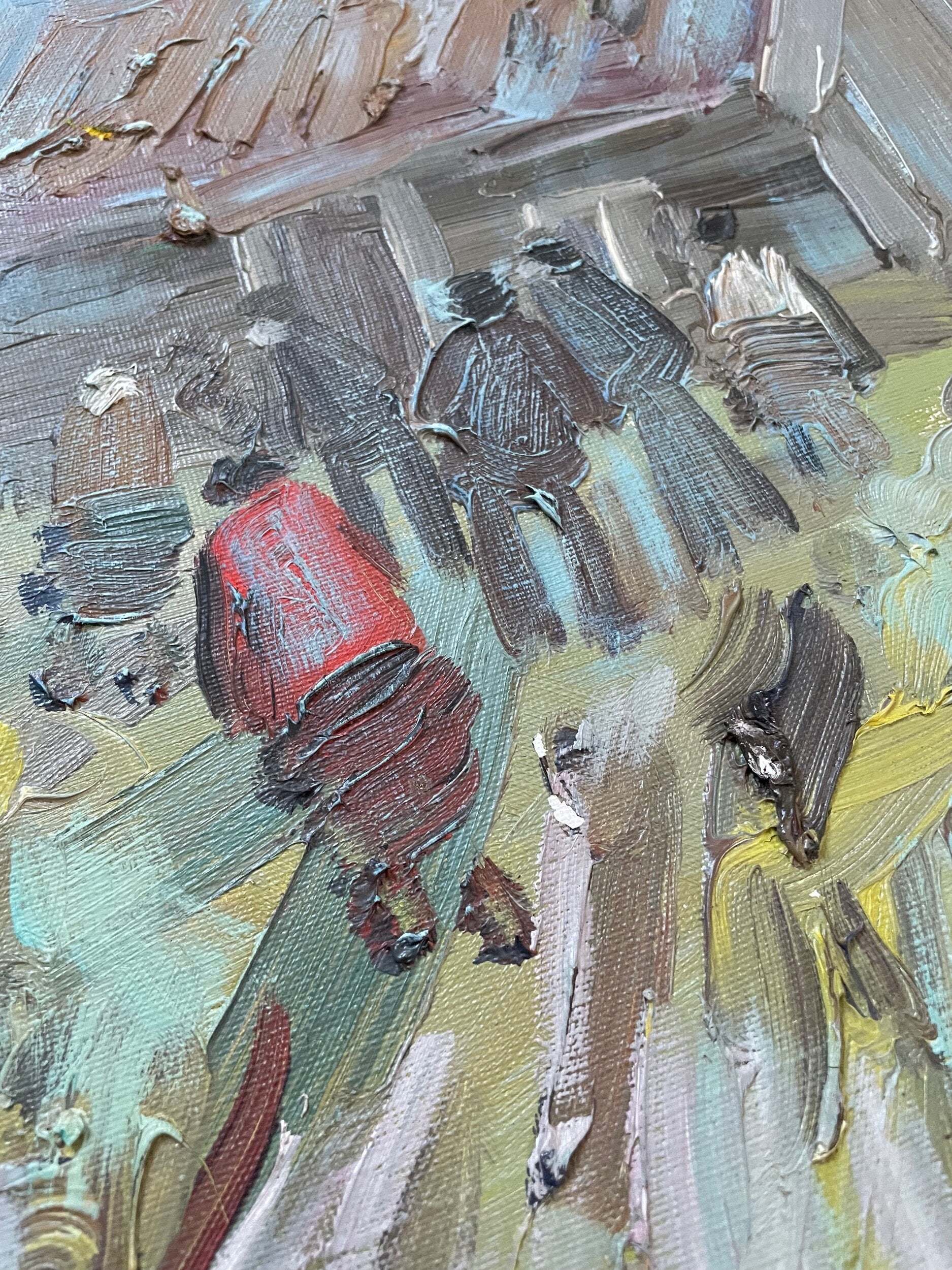 A charming oil on canvas capturing a rustic Scandinavian homestead, painted in loose, impressionistic strokes. Figures gather in front of the weathered wooden house, their presence lending warmth and life to the otherwise quiet rural setting. The earthy palette of greys, browns, and mossy greens is enlivened by a figure in a vivid red coat, drawing the eye into the composition. Expressive brushwork conveys movement and atmosphere, giving the painting a lively, almost narrative quality. Presented in its original textured frame with rattan slip, the work reflects both mid-century Nordic modernism and timeless folkloric charm.