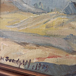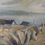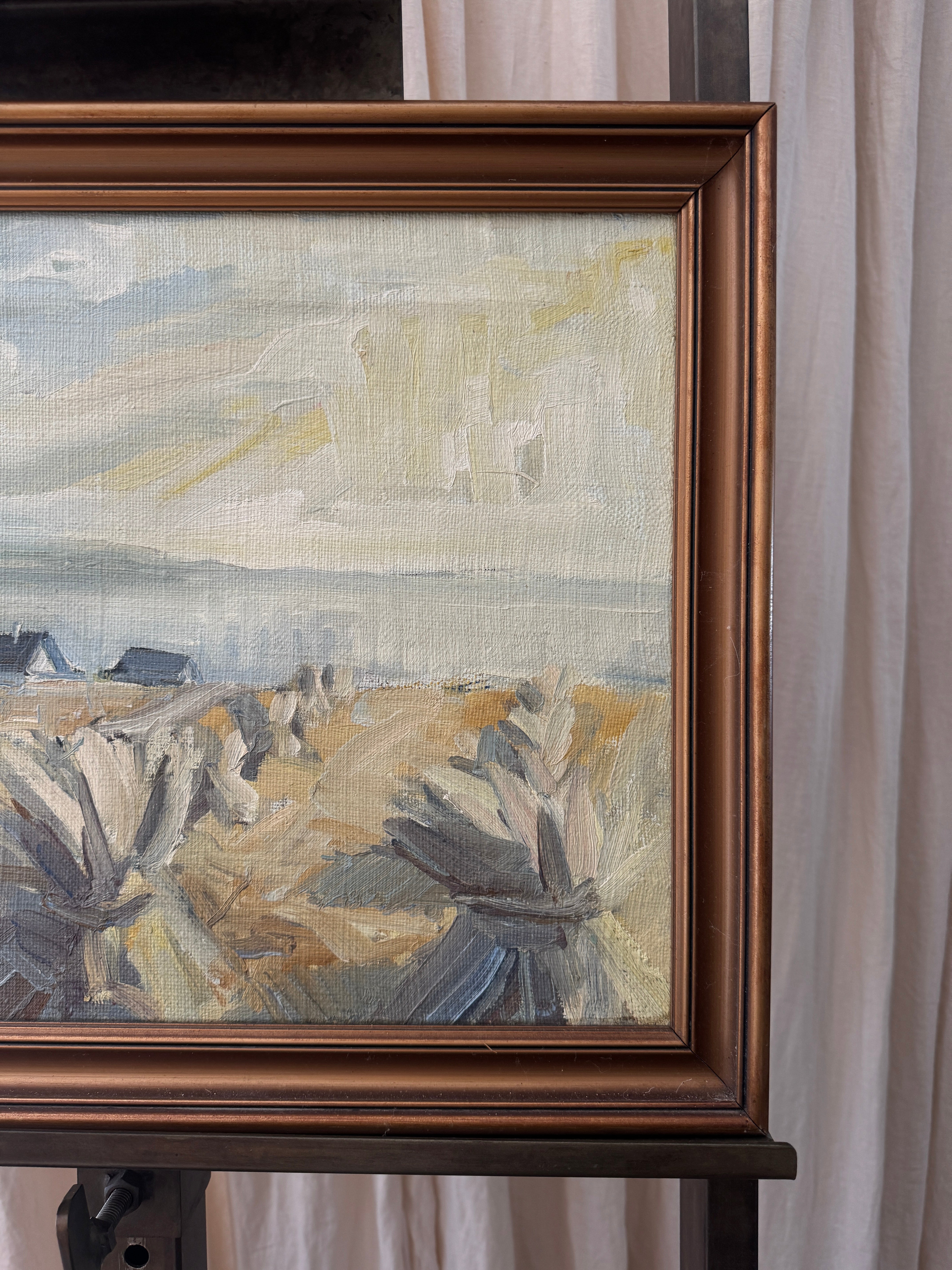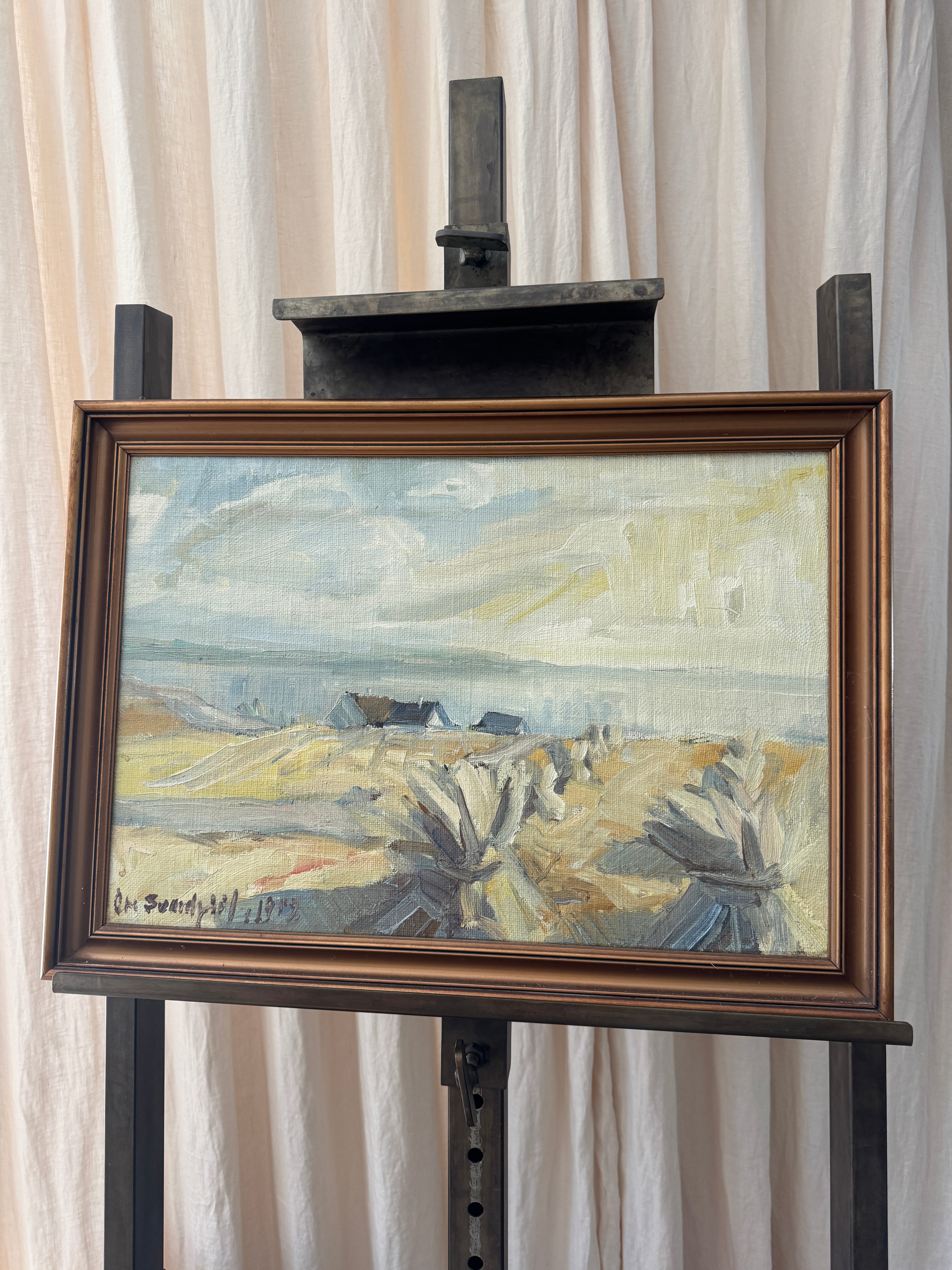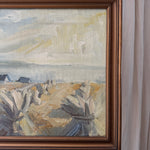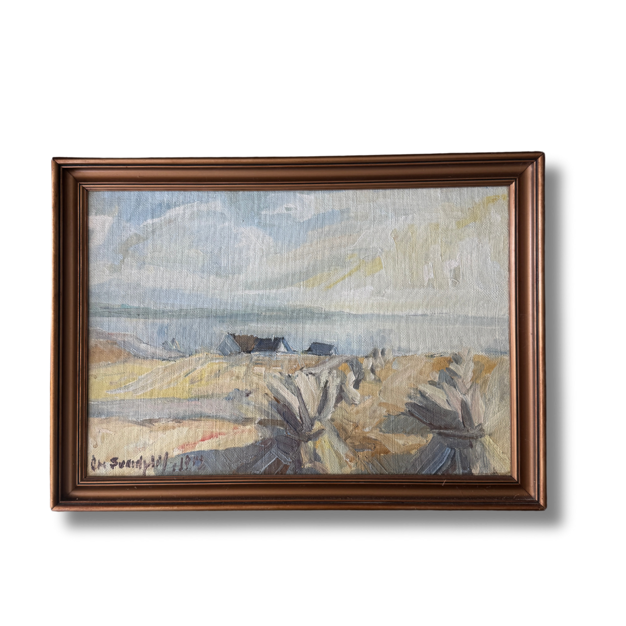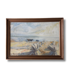 A pale, poetic shoreline rendered in the gentlest Nordic palette—silvery dunes, soft wheat tones, and a veil of cool sky brushed with winter light. Painted in 1978, this piece captures that deliciously in-between season when the coast feels both hushed and alive, the air crisp, the horizon blurred, and the land holding onto the last threads of warmth. Loose, lyrical strokes bring texture to the marsh grasses and movement to the sky, giving the whole scene a dreamy, almost whispered quality. It’s understated, soulful, and quietly transportive—the kind of painting that settles into a room like a deep breath.