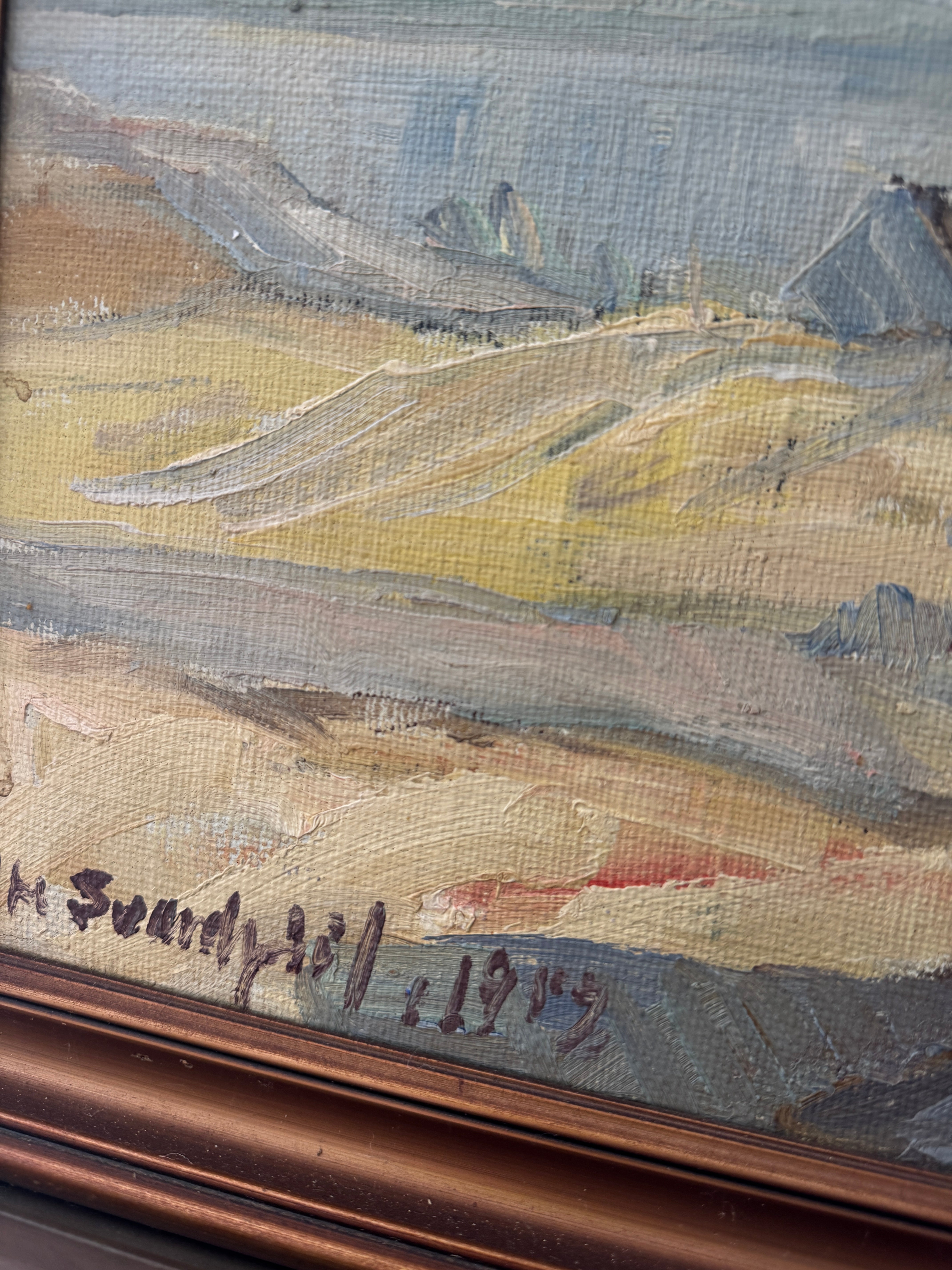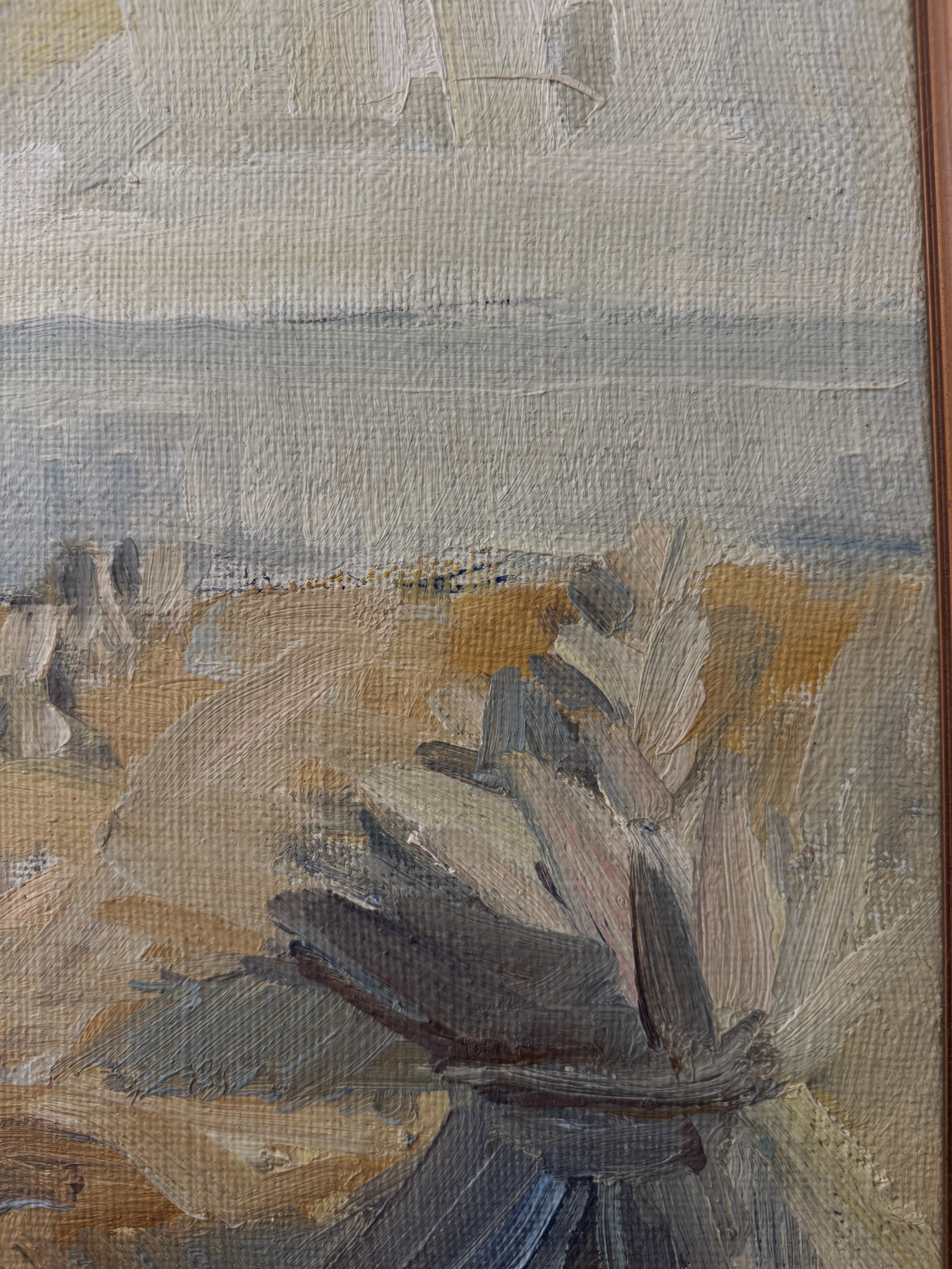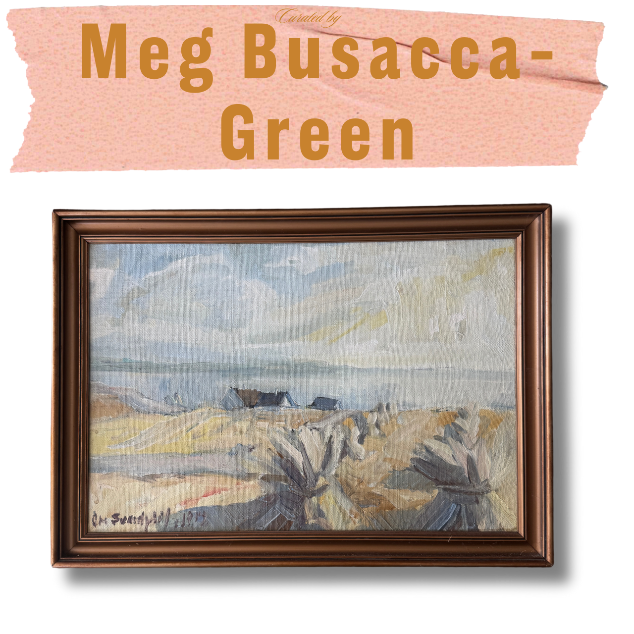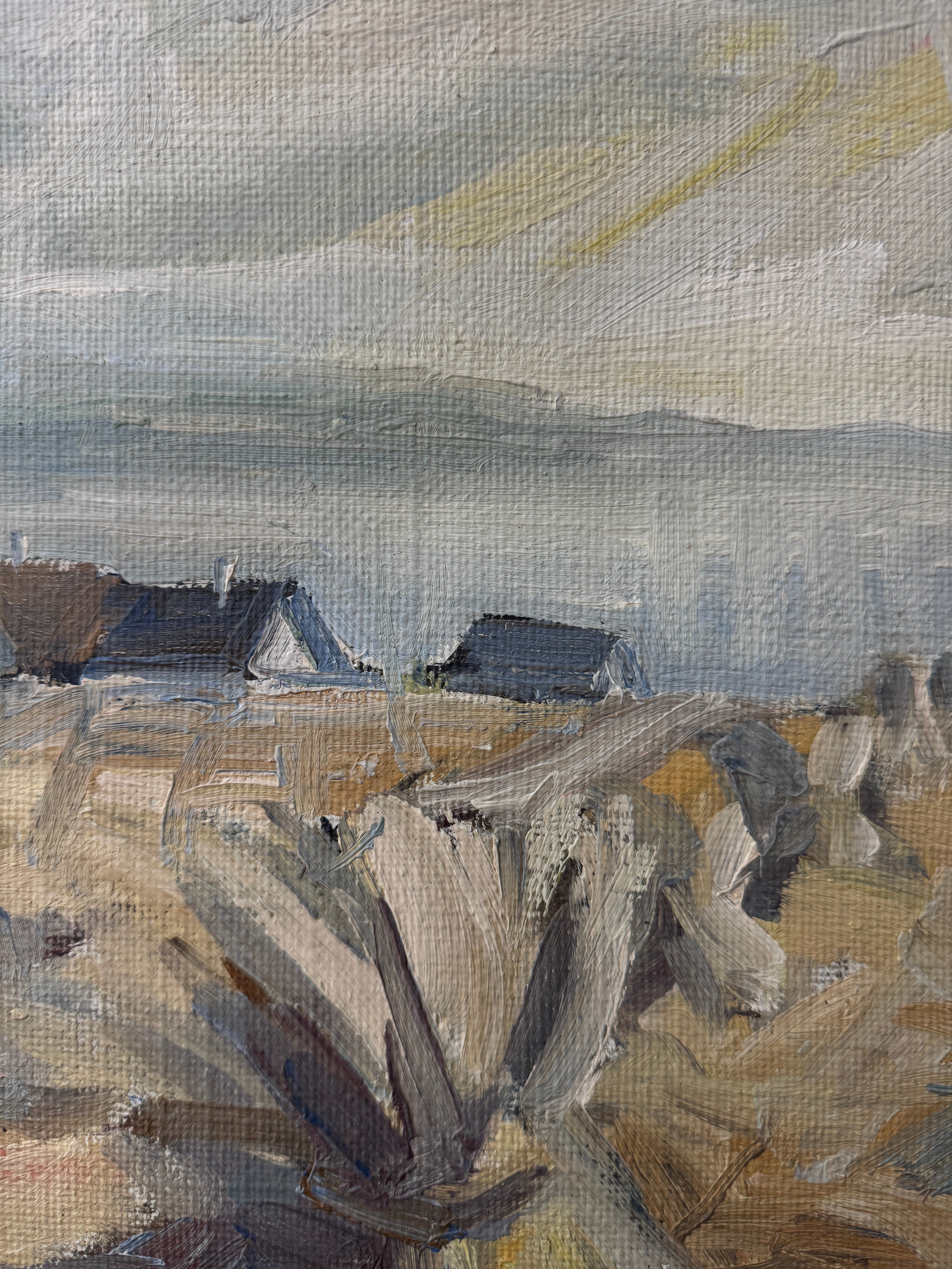 A pale, poetic shoreline rendered in the gentlest Nordic palette—silvery dunes, soft wheat tones, and a veil of cool sky brushed with winter light. Painted in 1978, this piece captures that deliciously in-between season when the coast feels both hushed and alive, the air crisp, the horizon blurred, and the land holding onto the last threads of warmth. Loose, lyrical strokes bring texture to the marsh grasses and movement to the sky, giving the whole scene a dreamy, almost whispered quality. It’s understated, soulful, and quietly transportive—the kind of painting that settles into a room like a deep breath.