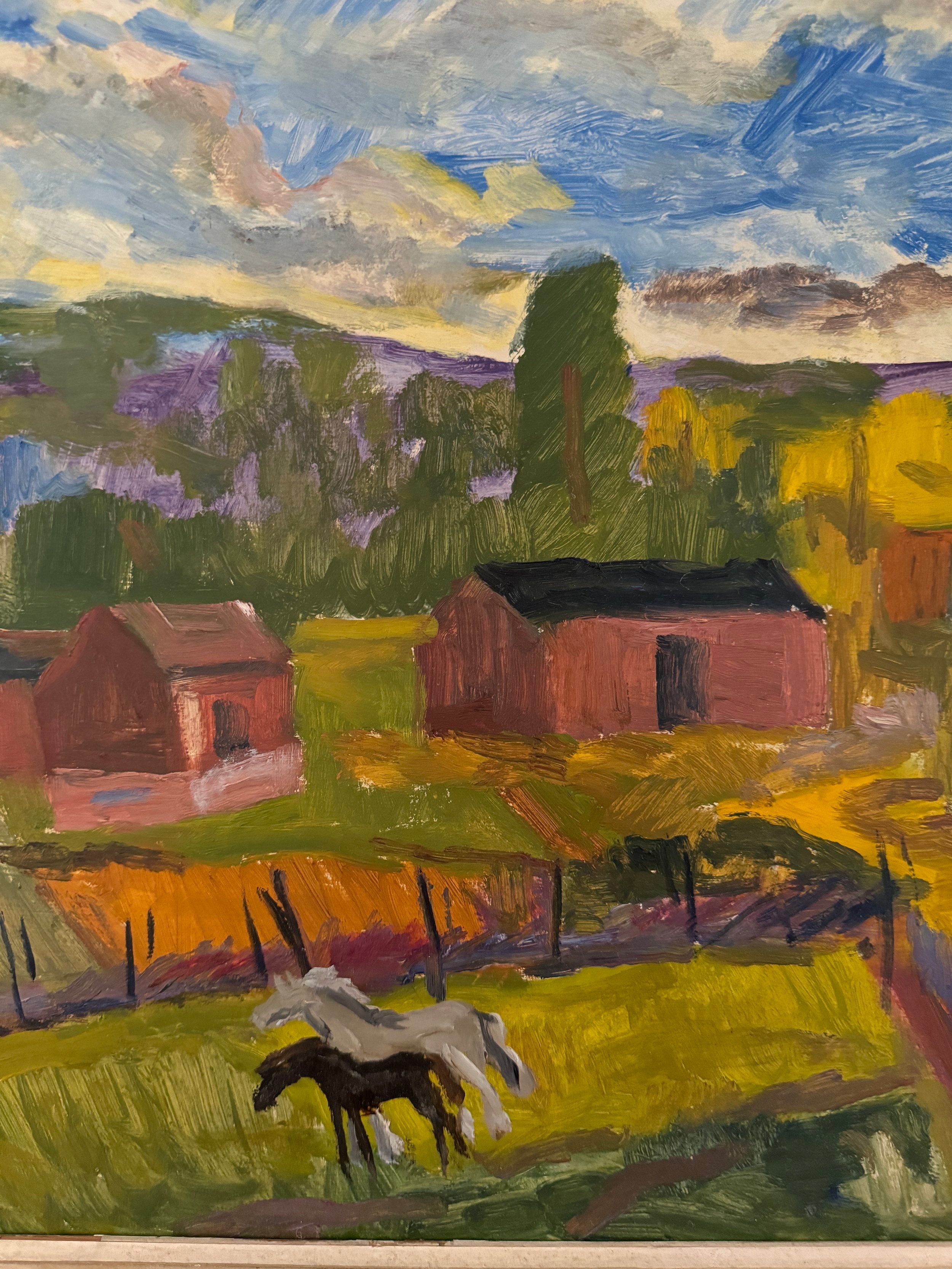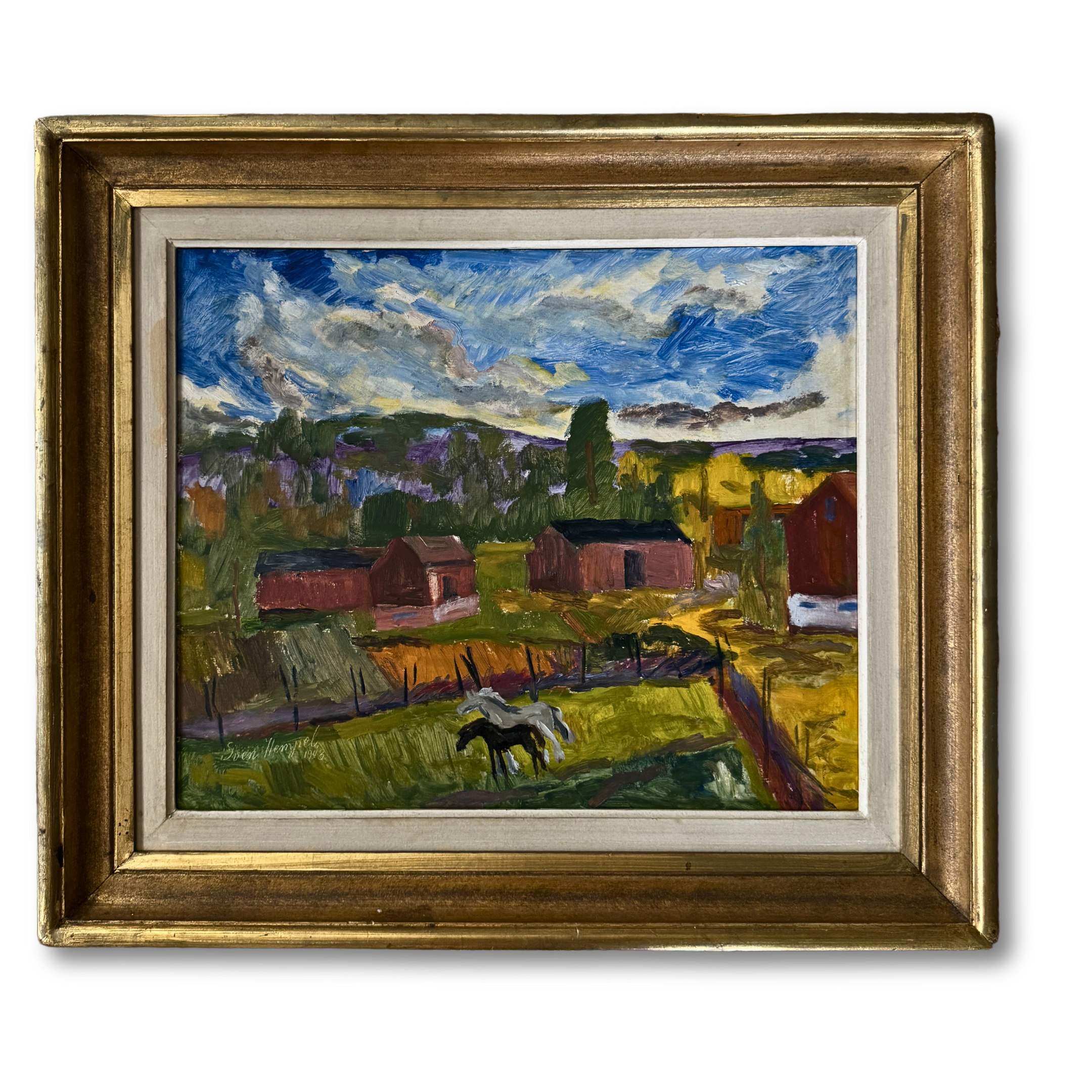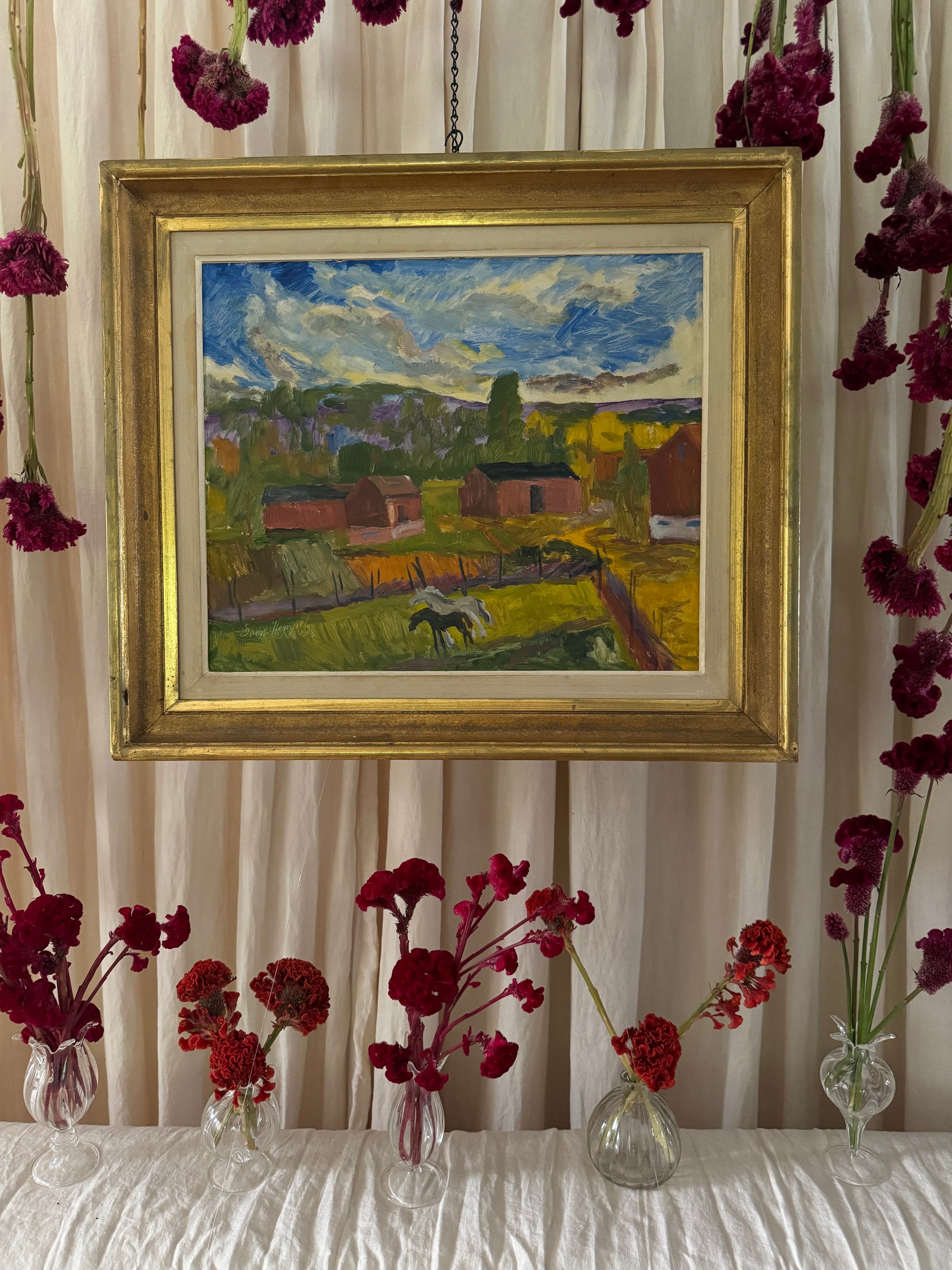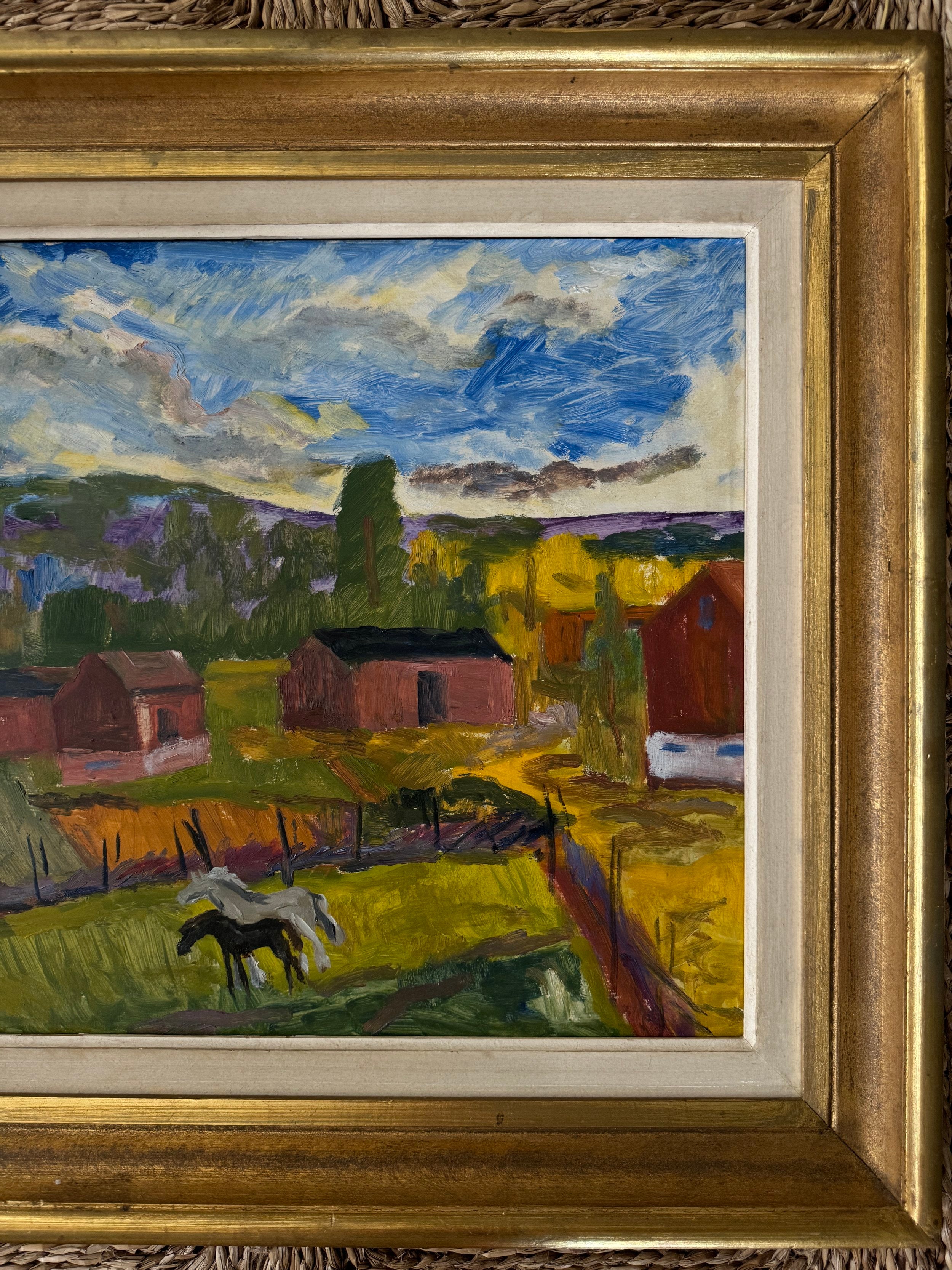 A personal favourite, this captivating oil on board from 1943 radiates the pastoral charm of a countryside scene, alive with bold, textured brushstrokes and a vivid, dynamic palette. Depicting rustic farm buildings nestled within lush, rolling fields and watched over by a moody, expressive sky, the composition creates a powerful sense of movement and life. The presence of two somewhat quirky horses grazing adds a layer of fun, lively tension, inviting the viewer into a rural world, with a twist. Encased in a warm gilt frame that enhances its timeless appeal, this piece is as relevant now as it was nearly 100 years ago.