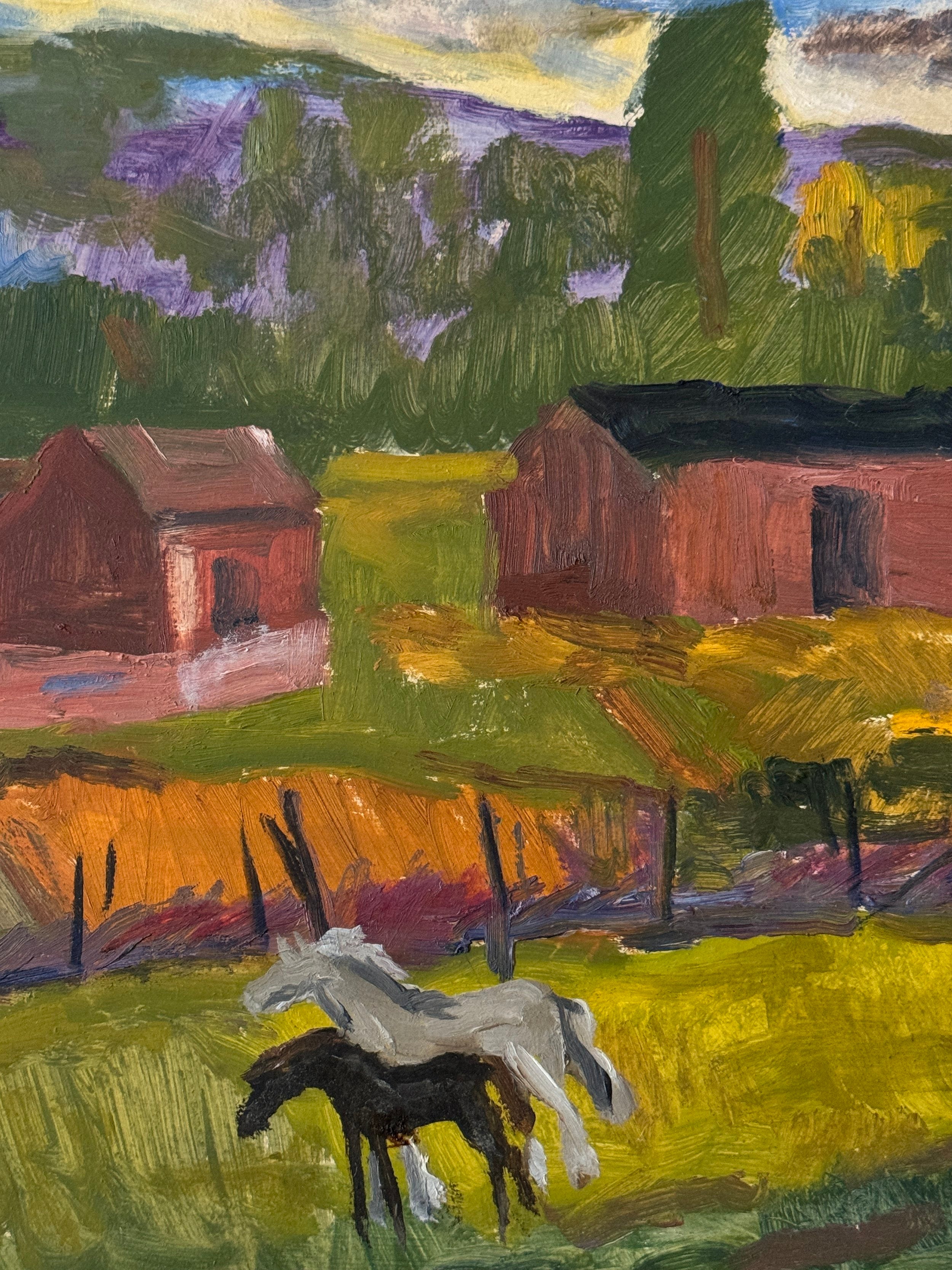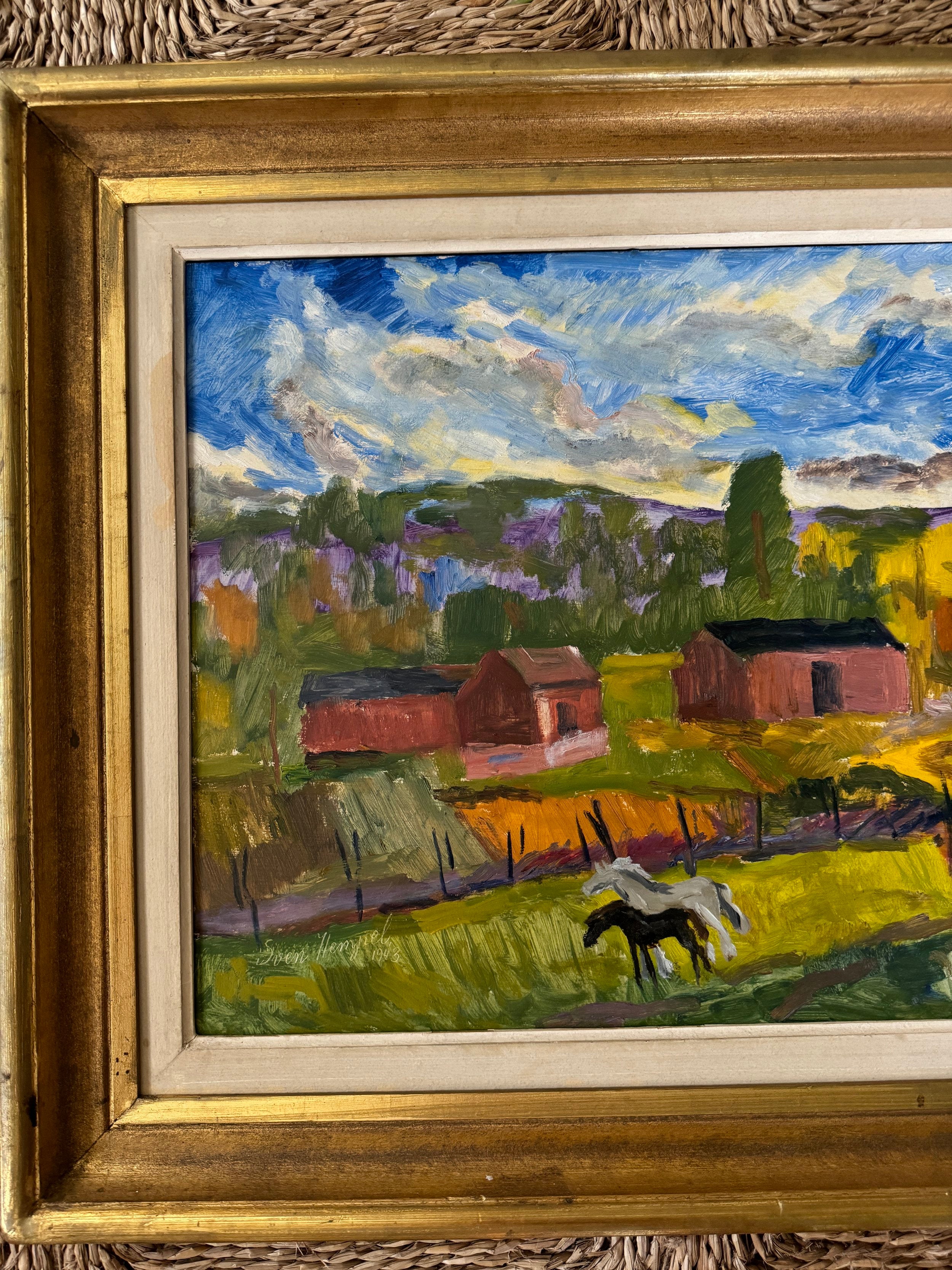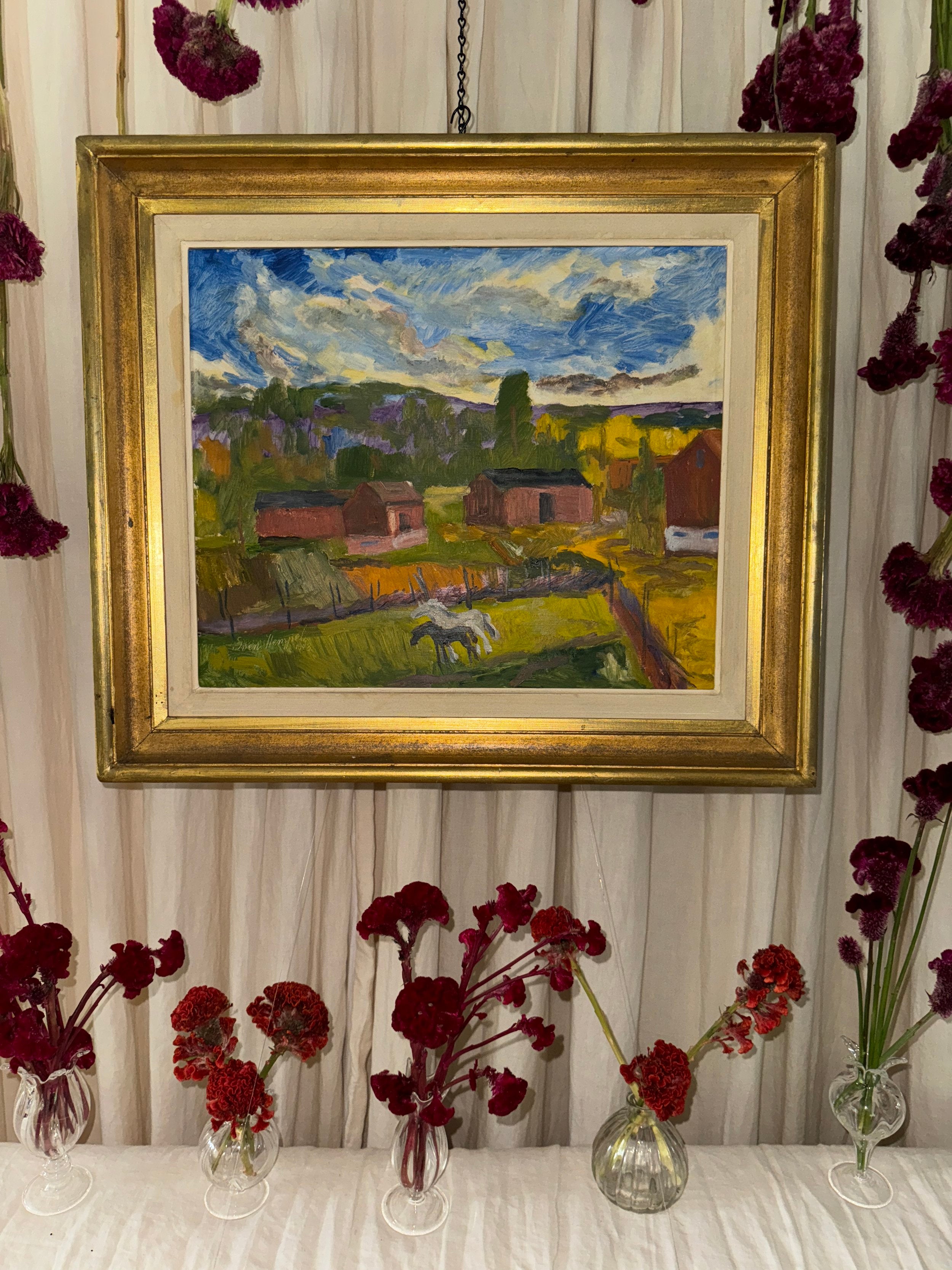 A personal favourite, this captivating oil on board from 1943 radiates the pastoral charm of a countryside scene, alive with bold, textured brushstrokes and a vivid, dynamic palette. Depicting rustic farm buildings nestled within lush, rolling fields and watched over by a moody, expressive sky, the composition creates a powerful sense of movement and life. The presence of two somewhat quirky horses grazing adds a layer of fun, lively tension, inviting the viewer into a rural world, with a twist. Encased in a warm gilt frame that enhances its timeless appeal, this piece is as relevant now as it was nearly 100 years ago.
