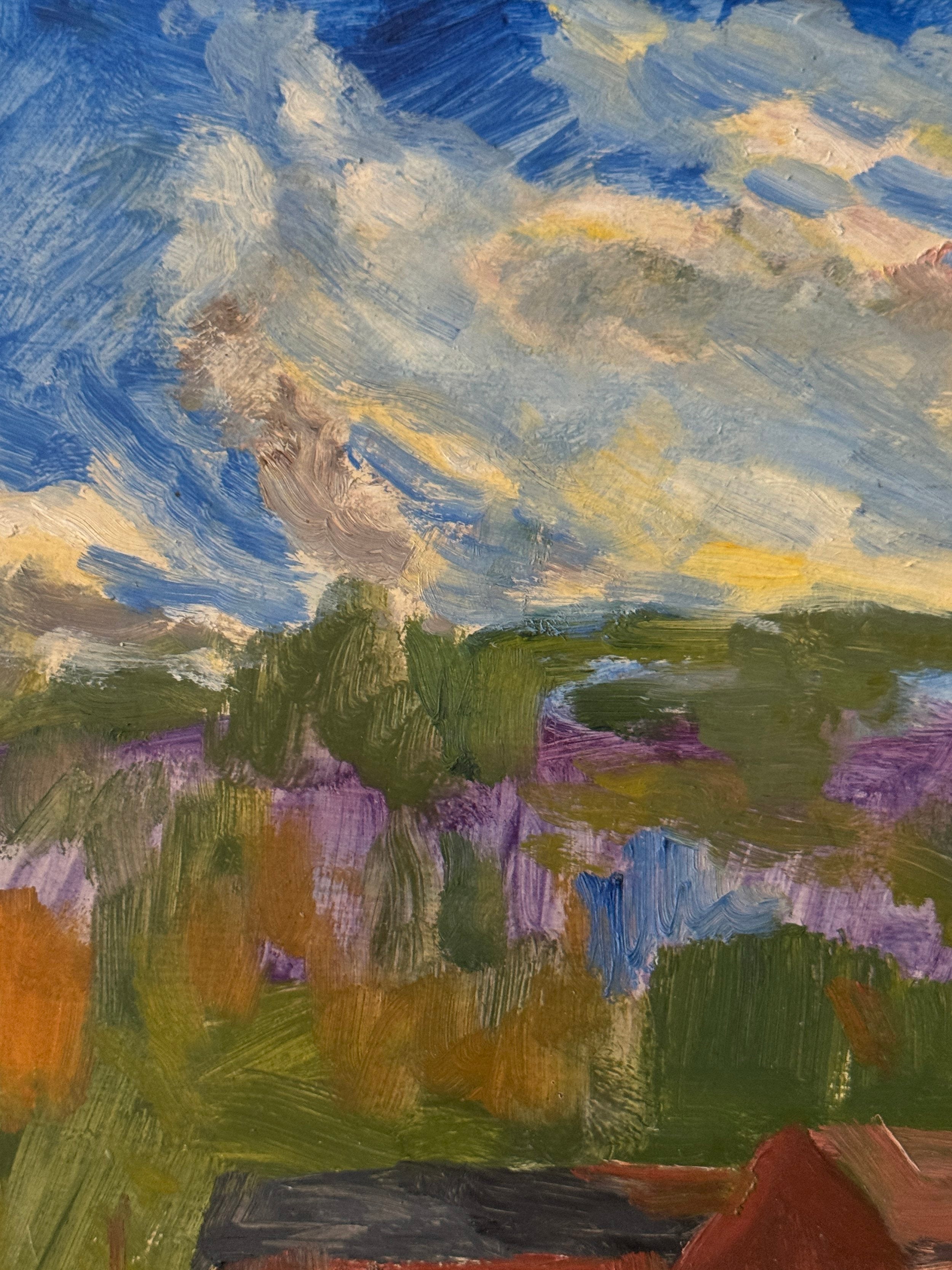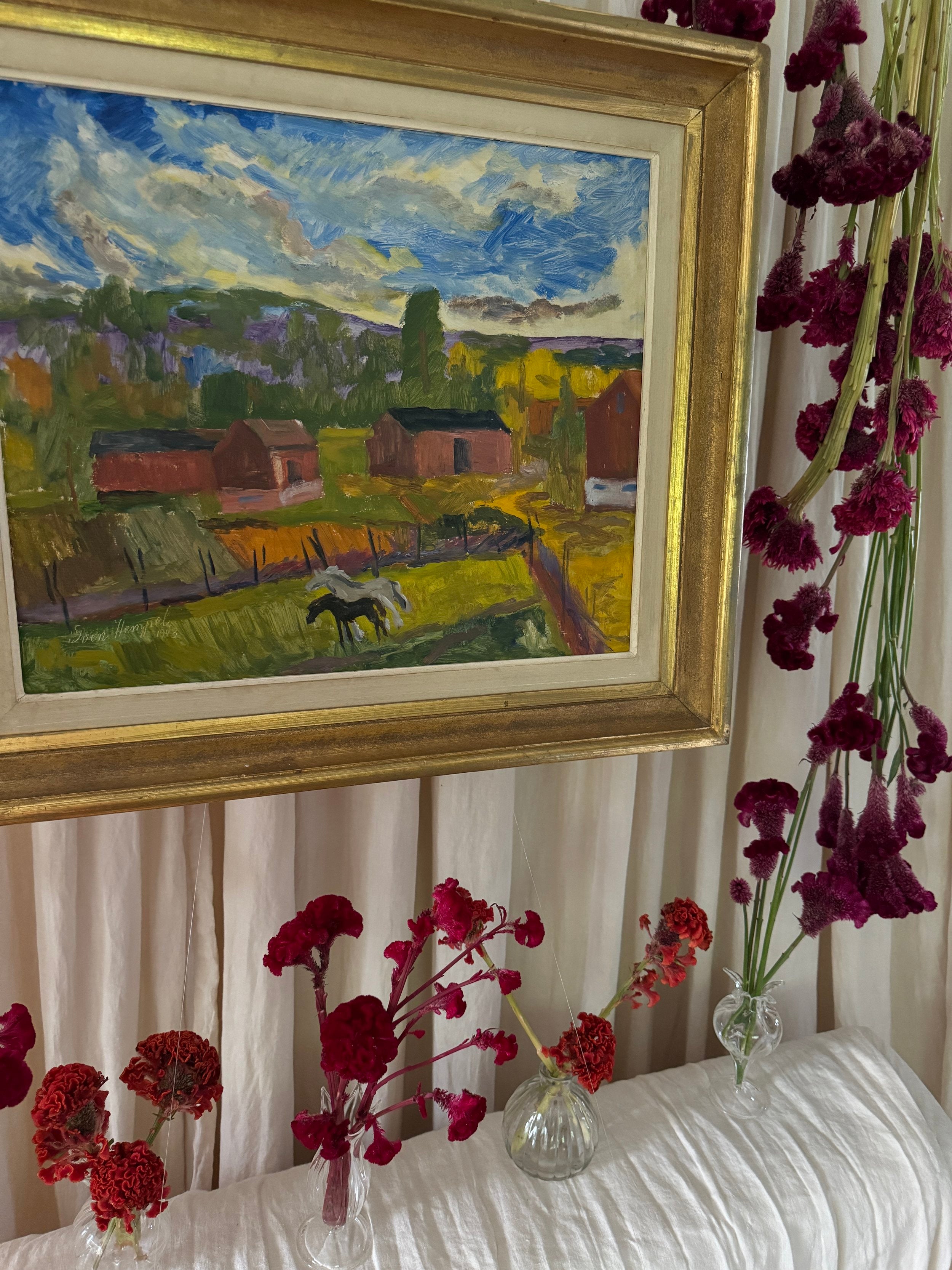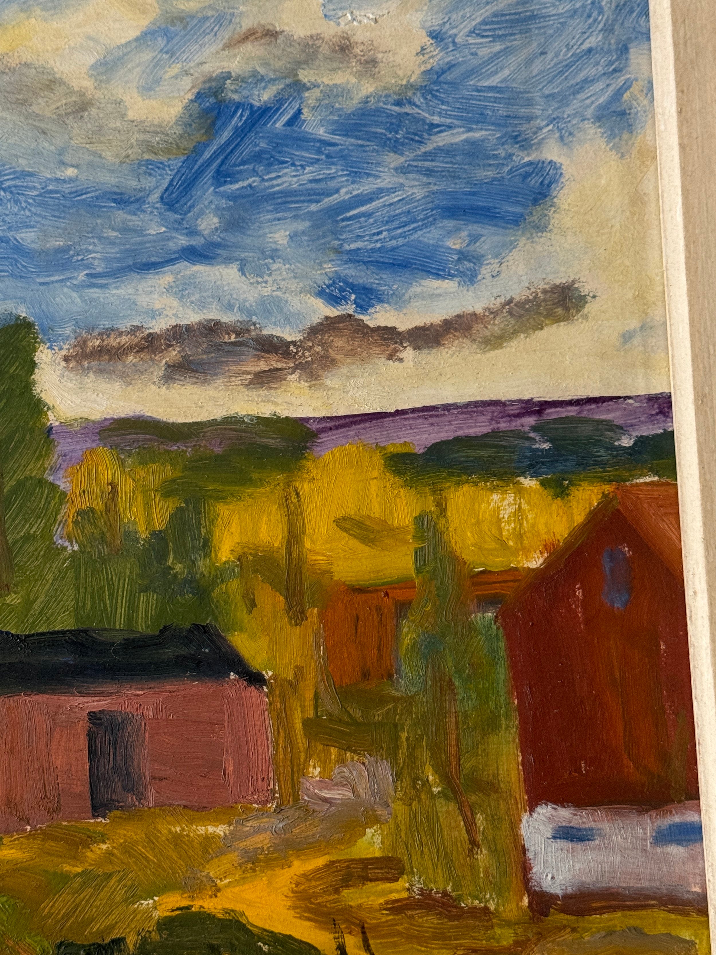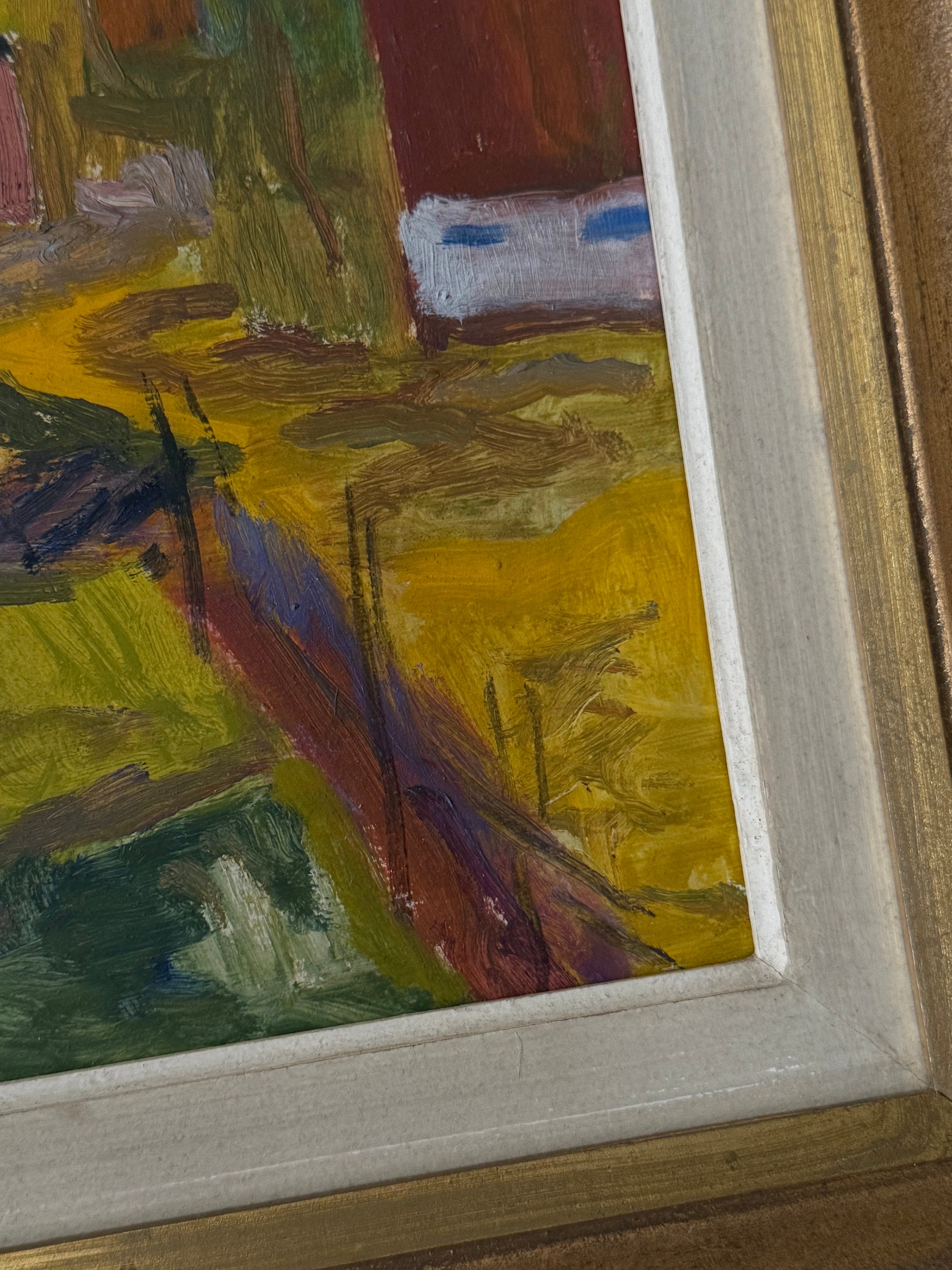 A personal favourite, this captivating oil on board from 1943 radiates the pastoral charm of a countryside scene, alive with bold, textured brushstrokes and a vivid, dynamic palette. Depicting rustic farm buildings nestled within lush, rolling fields and watched over by a moody, expressive sky, the composition creates a powerful sense of movement and life. The presence of two somewhat quirky horses grazing adds a layer of fun, lively tension, inviting the viewer into a rural world, with a twist. Encased in a warm gilt frame that enhances its timeless appeal, this piece is as relevant now as it was nearly 100 years ago.